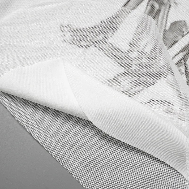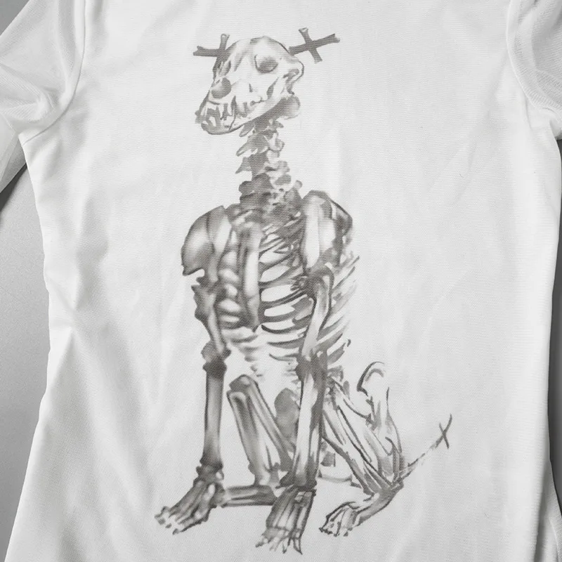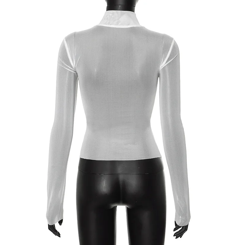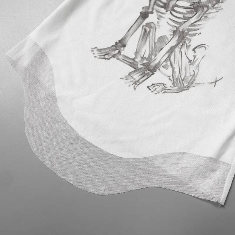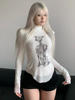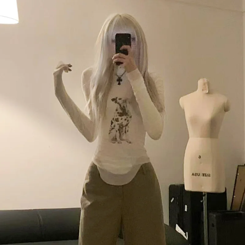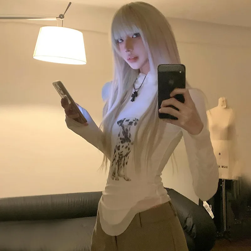 Y2K Sexy White Lace Mesh See Through Long Sleeve T-Shirt for Women Fashion Goth Dog Skull Print Half High Collar Slim Crop Tops