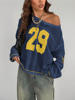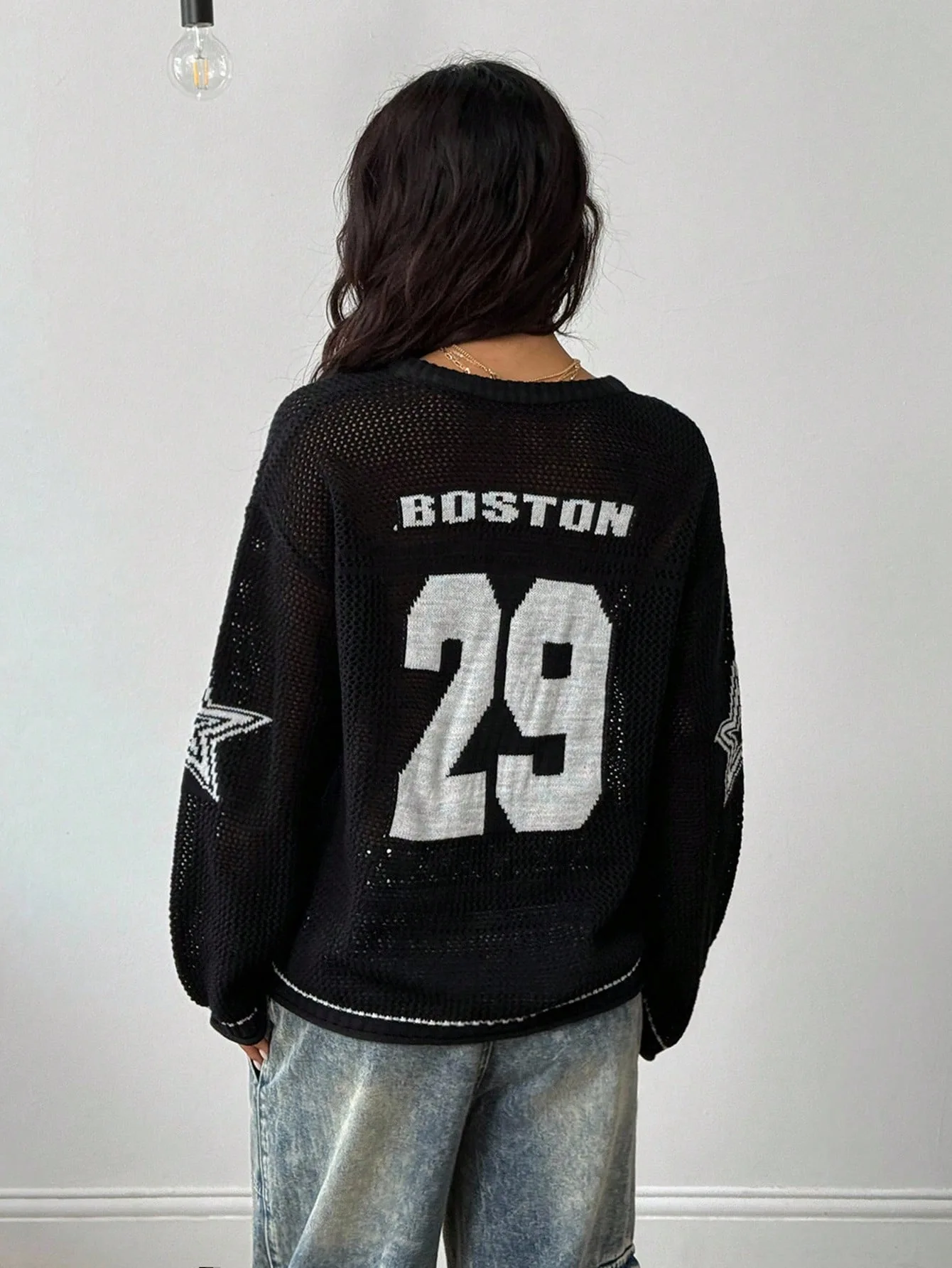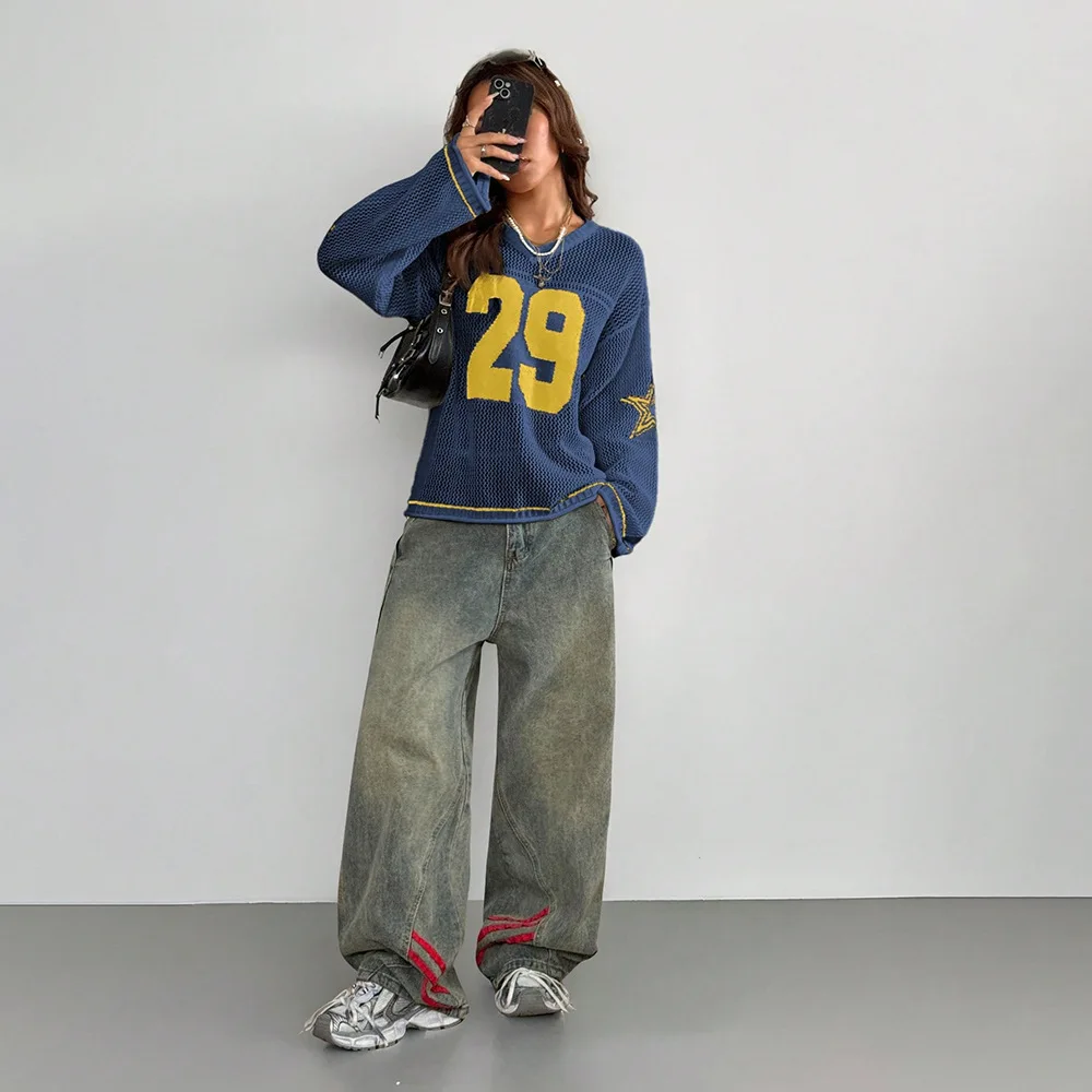 Y2K Style Sports Jersey Women’s Knitted Tops Fashionable Digital Printed Round Neck Long Sleeve Jumper 2025 Summer Street Trend