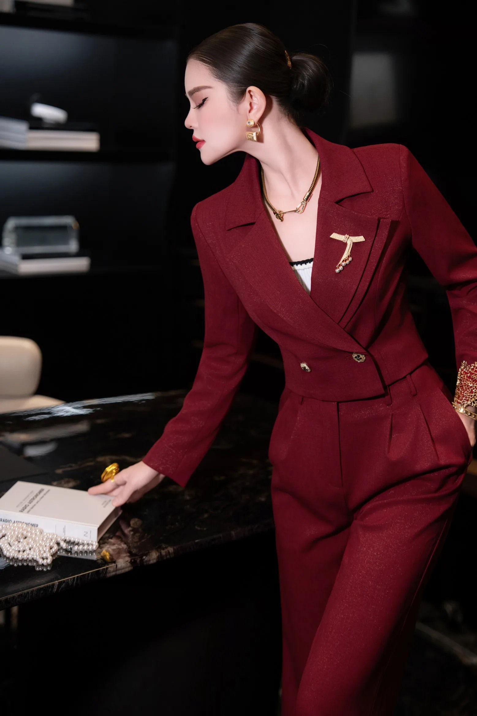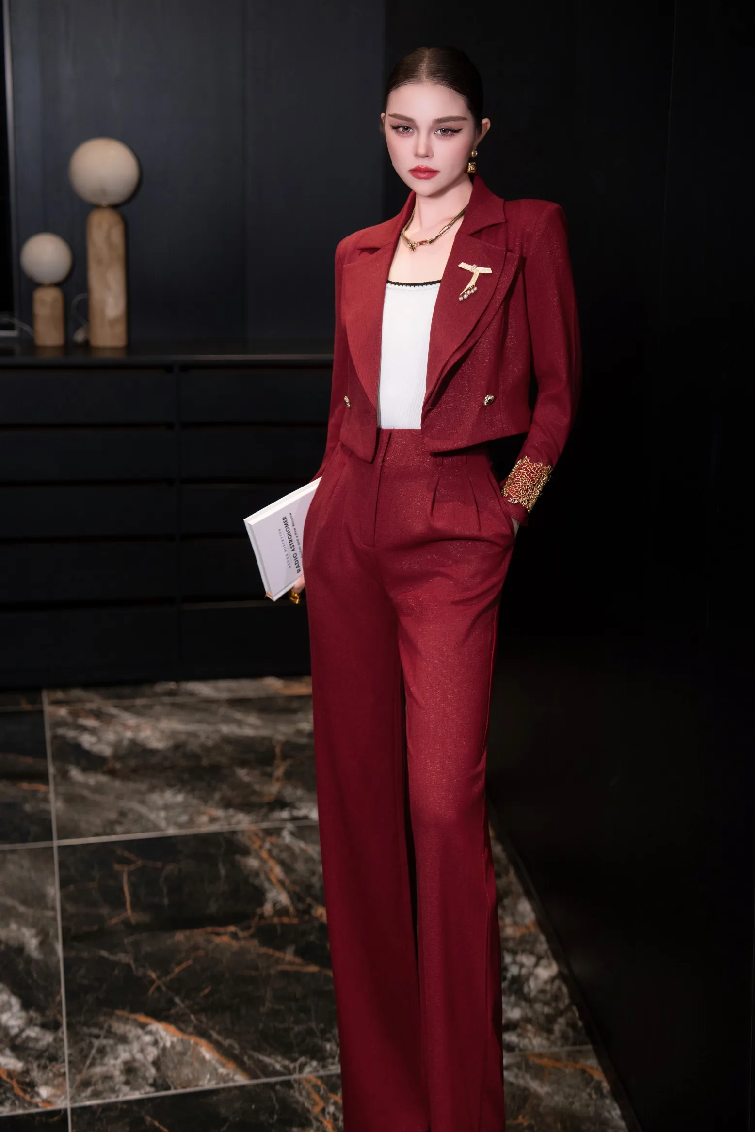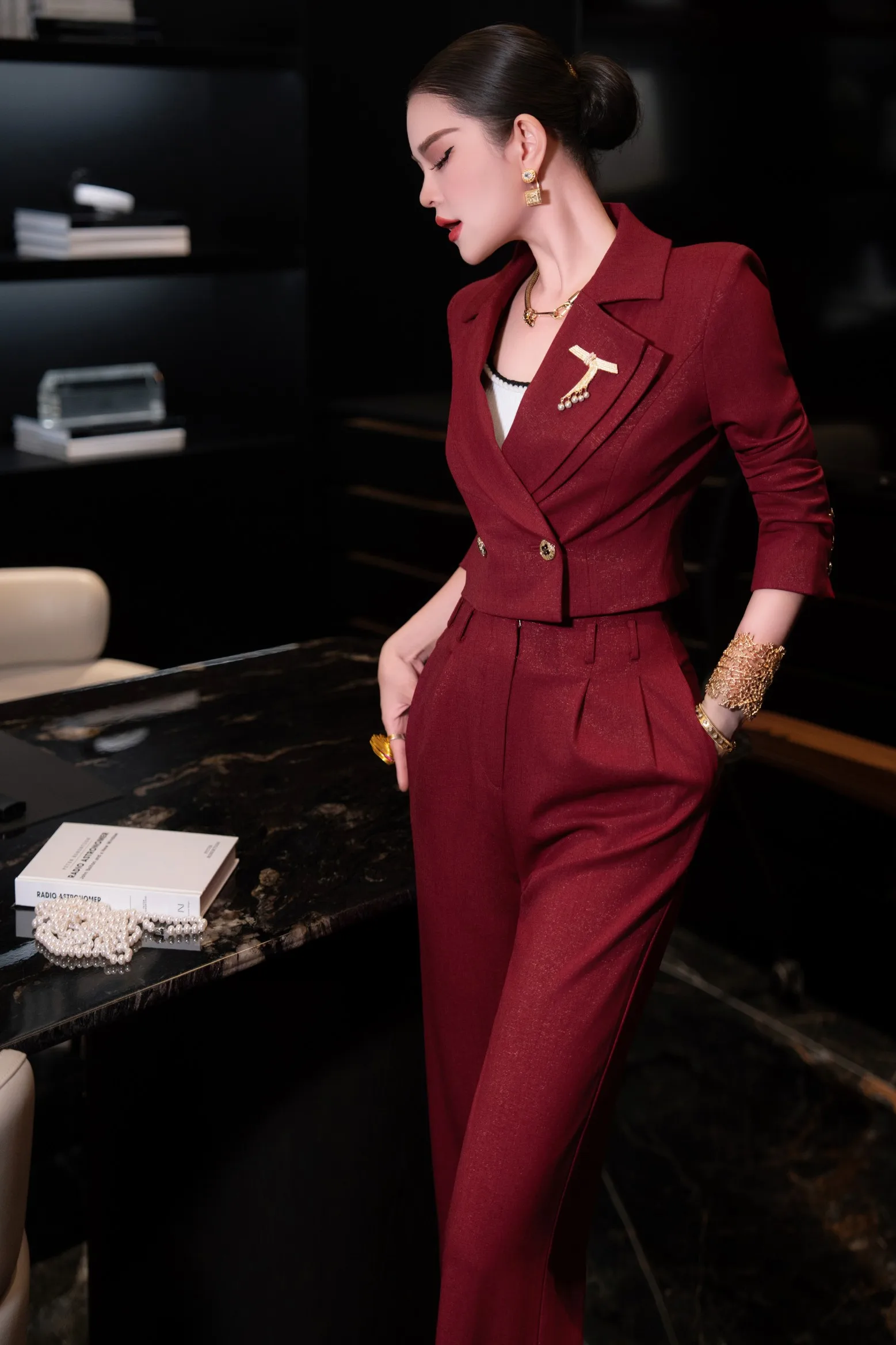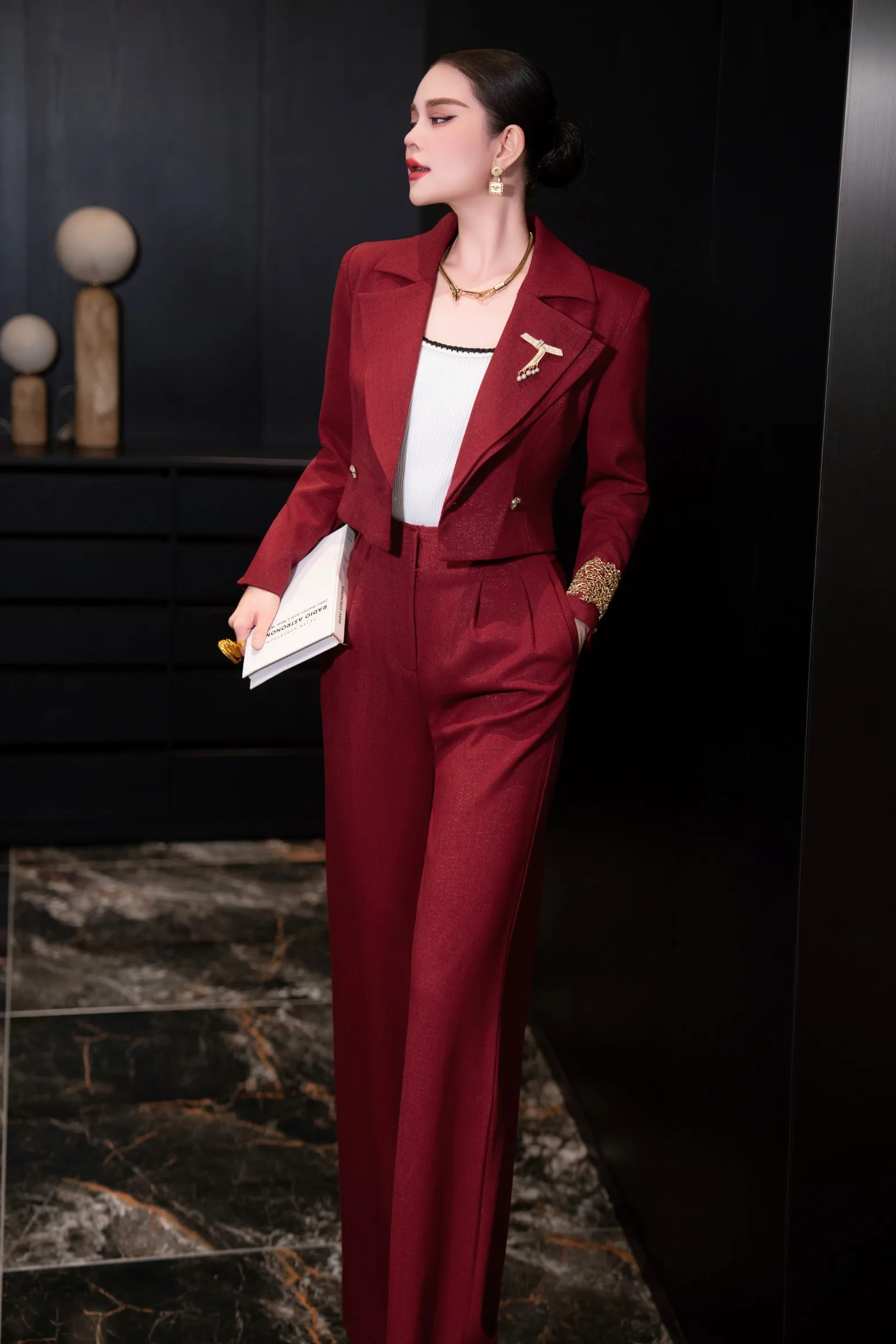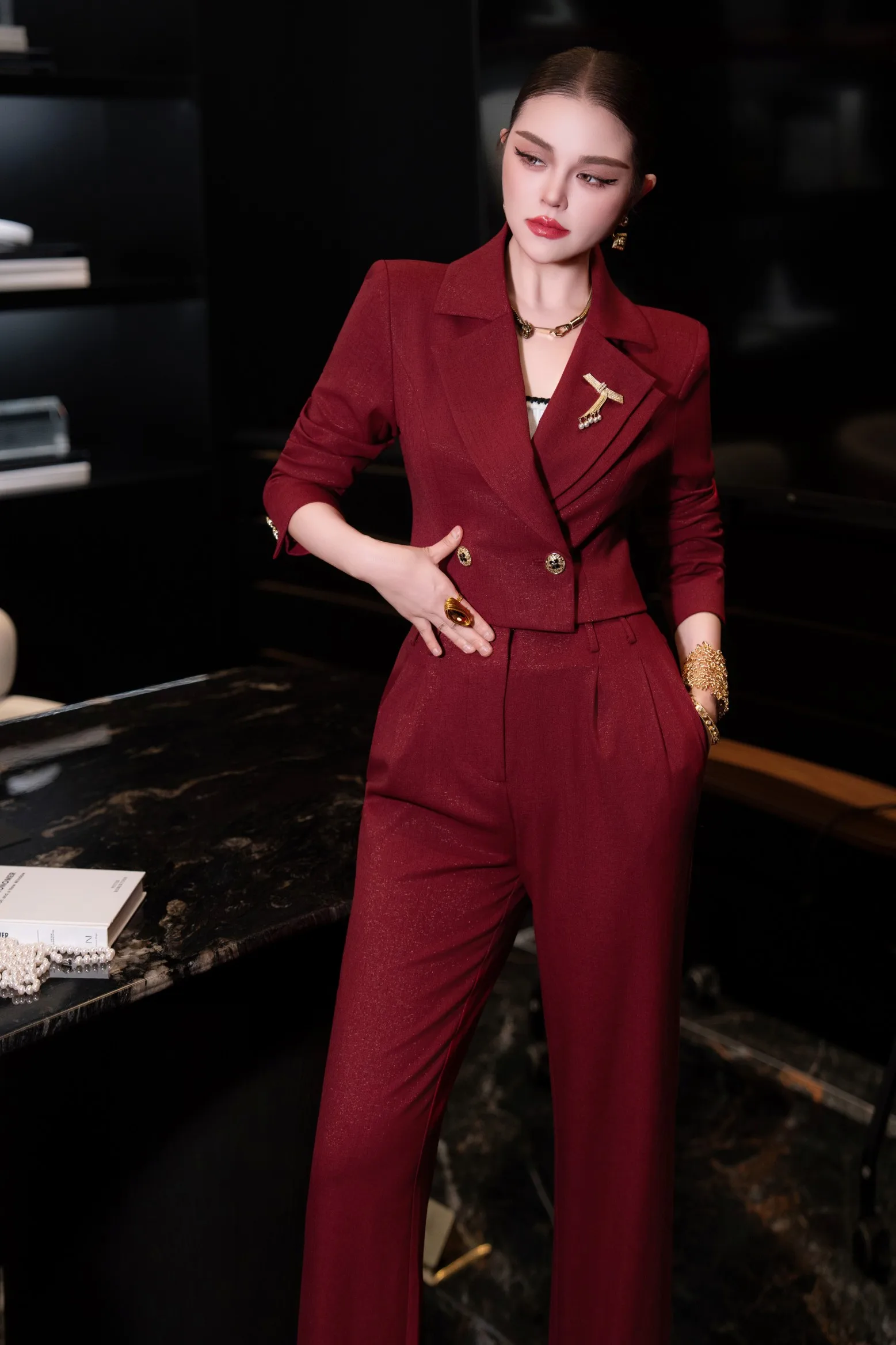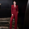 ZJYT Autumn Fashion Women’s Short Blazer Suit Pant Sets 2 Piece Matching Set Elegant Office Lady Work Outfit Red Trousers Suit