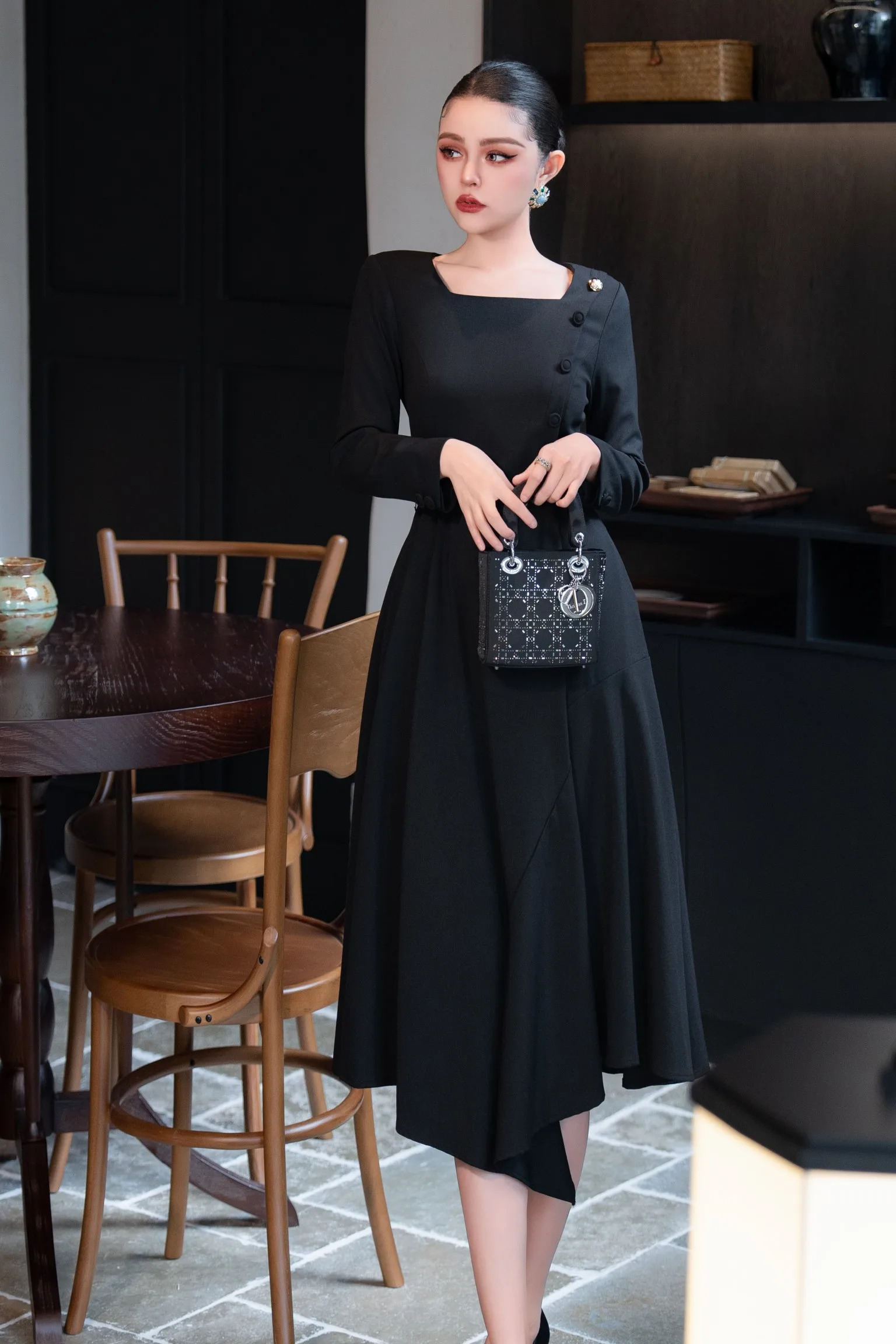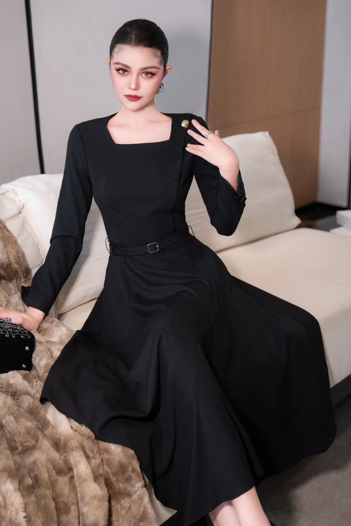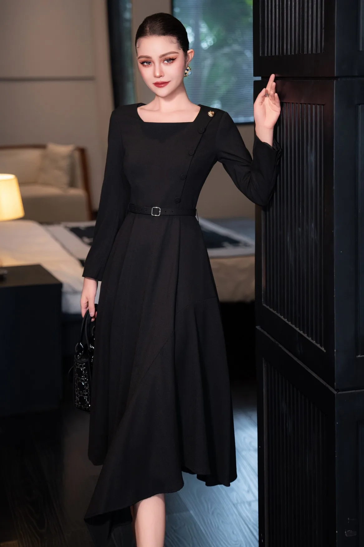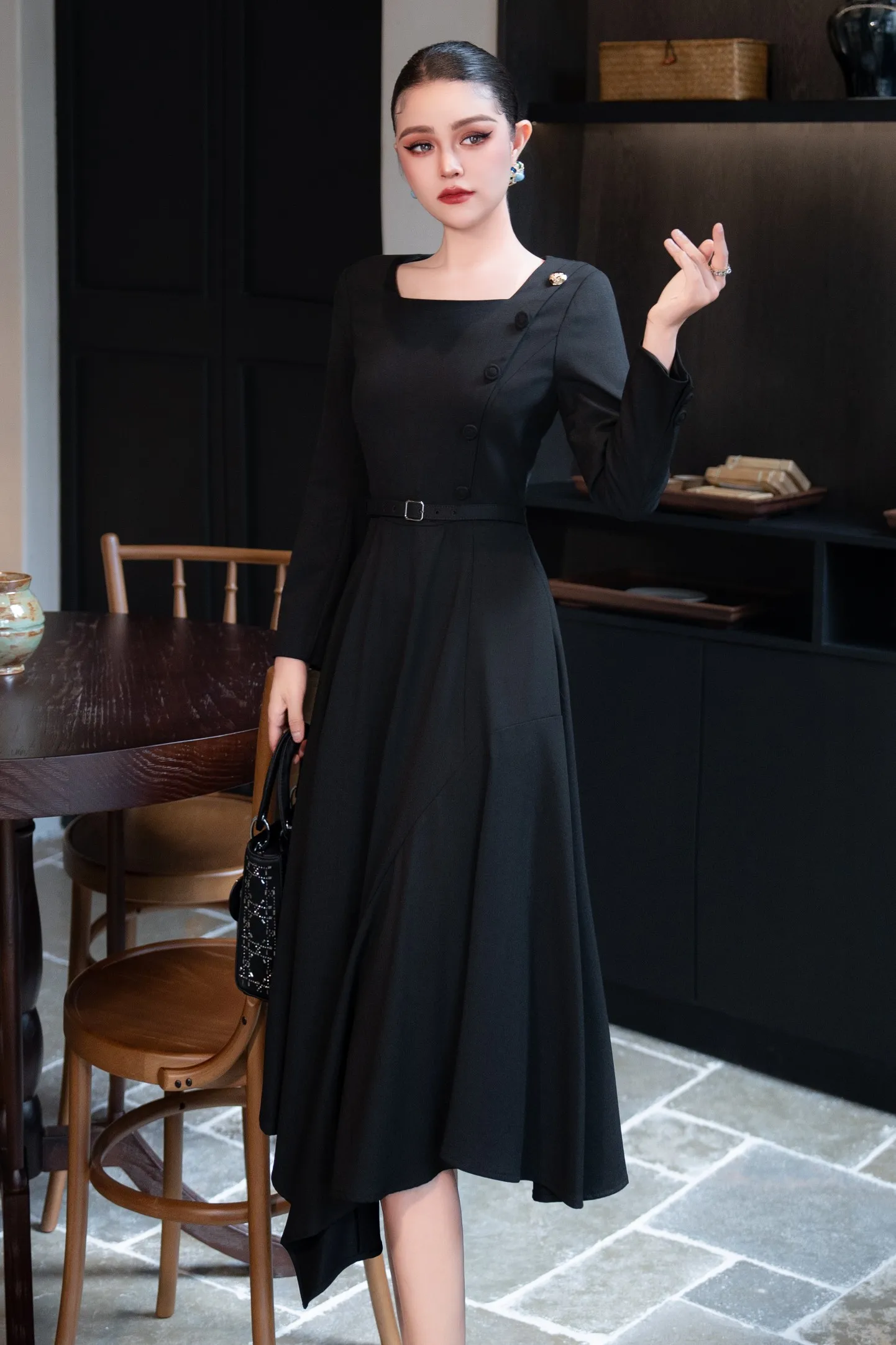 ZJYT Autumn New 2025 Designer Women’s Long Sleeve Midi Black Dress Elegant Square Collar Casual Holiday Dresses Female Vestidos