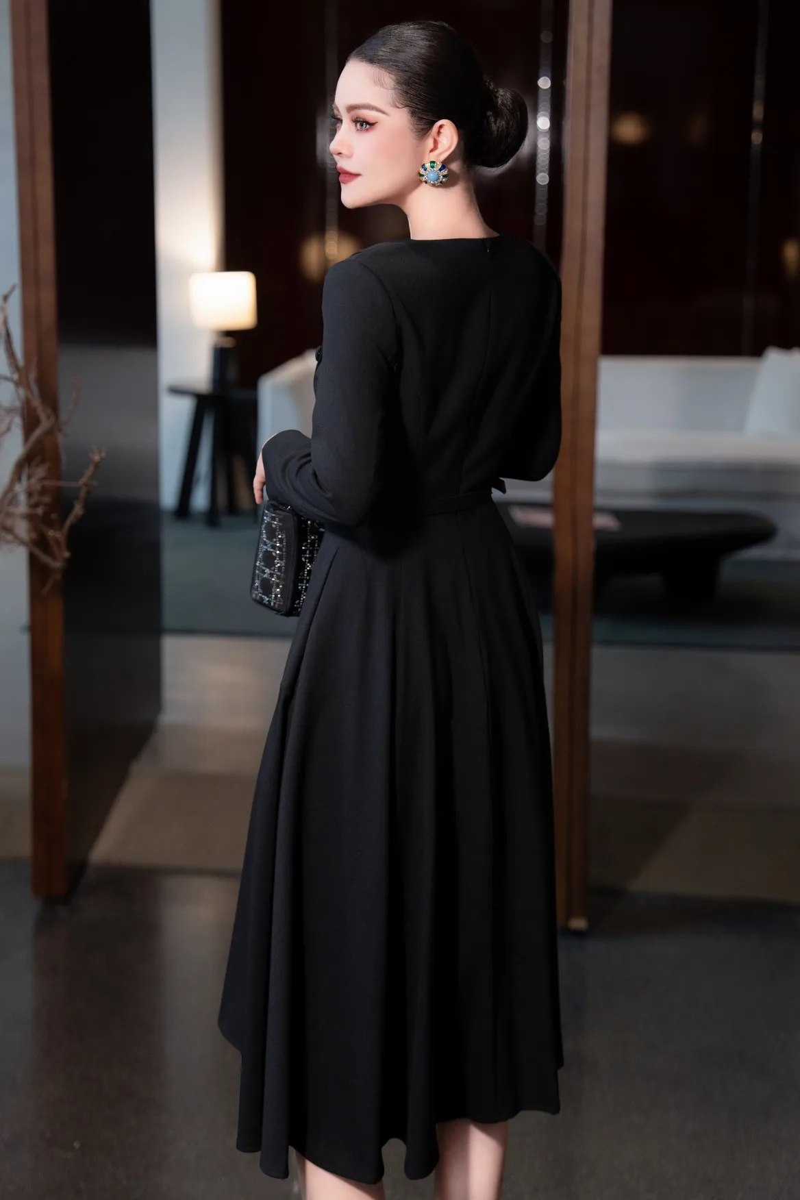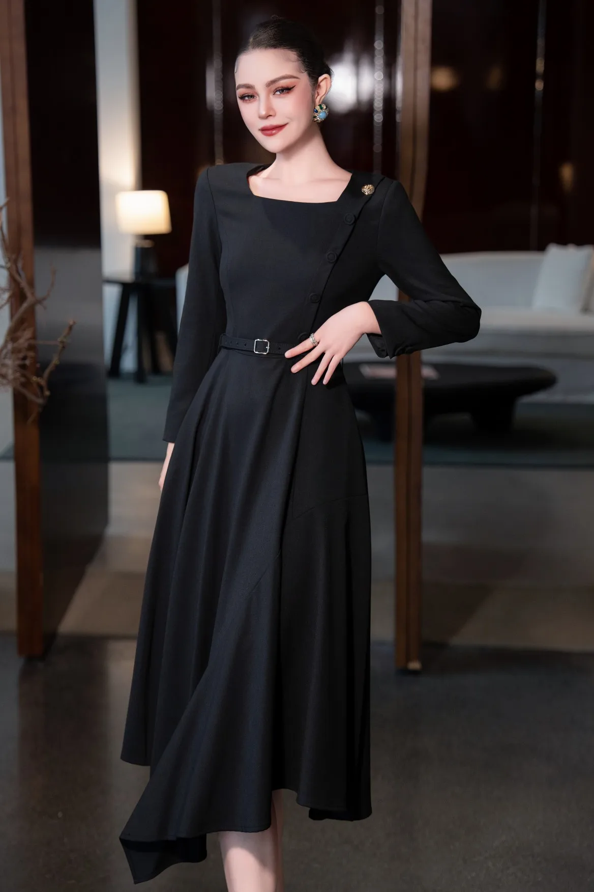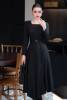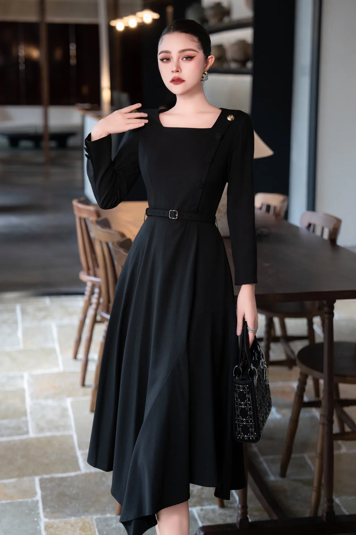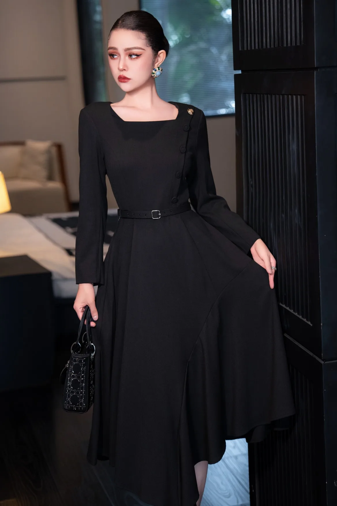 ZJYT Autumn New 2025 Designer Women’s Long Sleeve Midi Black Dress Elegant Square Collar Casual Holiday Dresses Female Vestidos