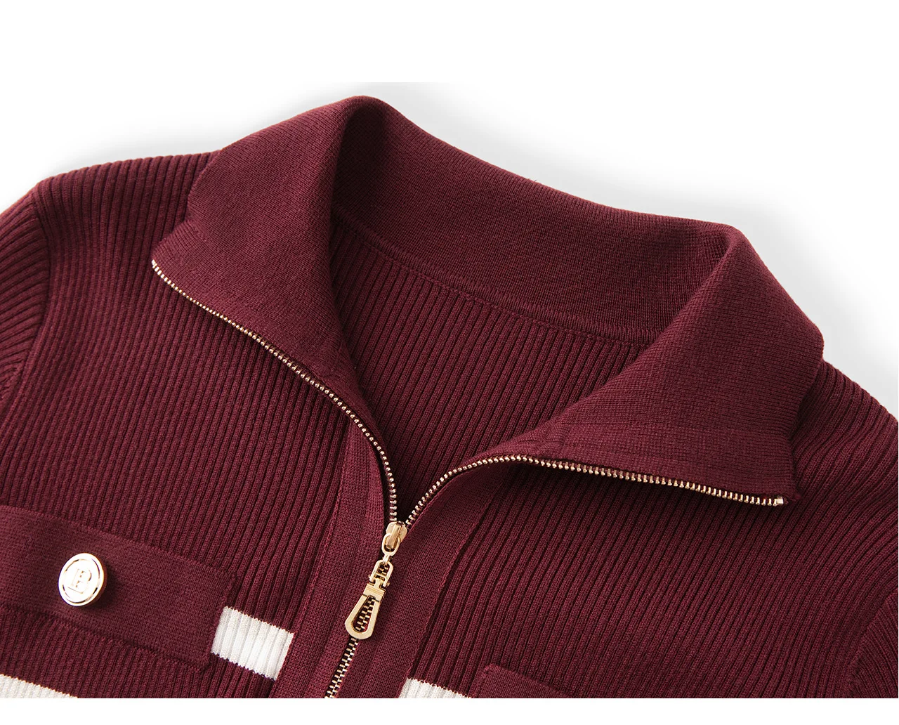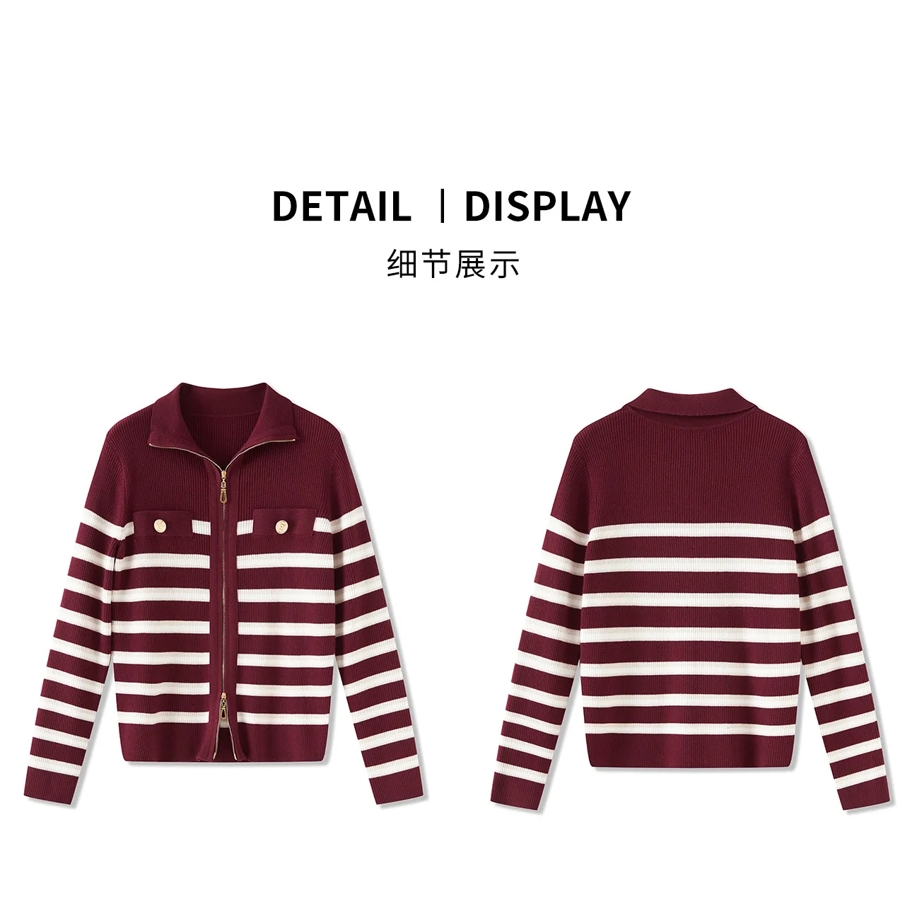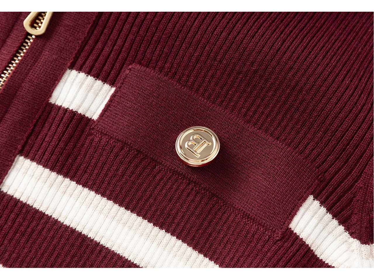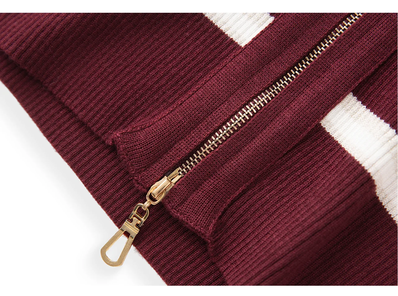 ZJYT Autumn New 2025 Fashion Women’s Striped Knitted Sweaters Long Sleeve Turn Down Collar Zip Up Tops Jacket Casual Jersey Red