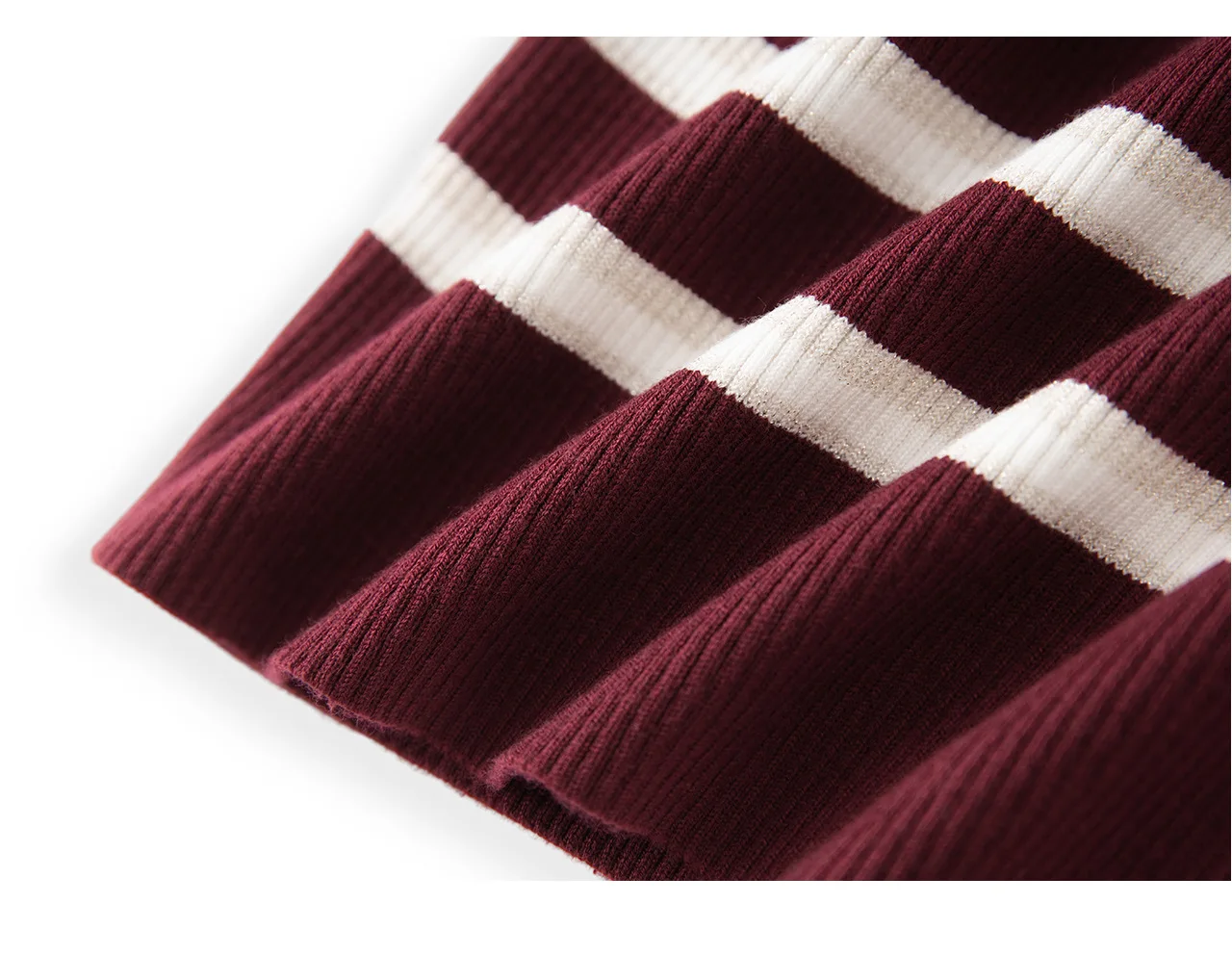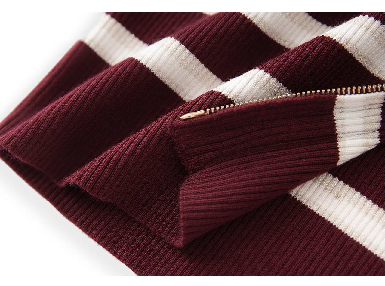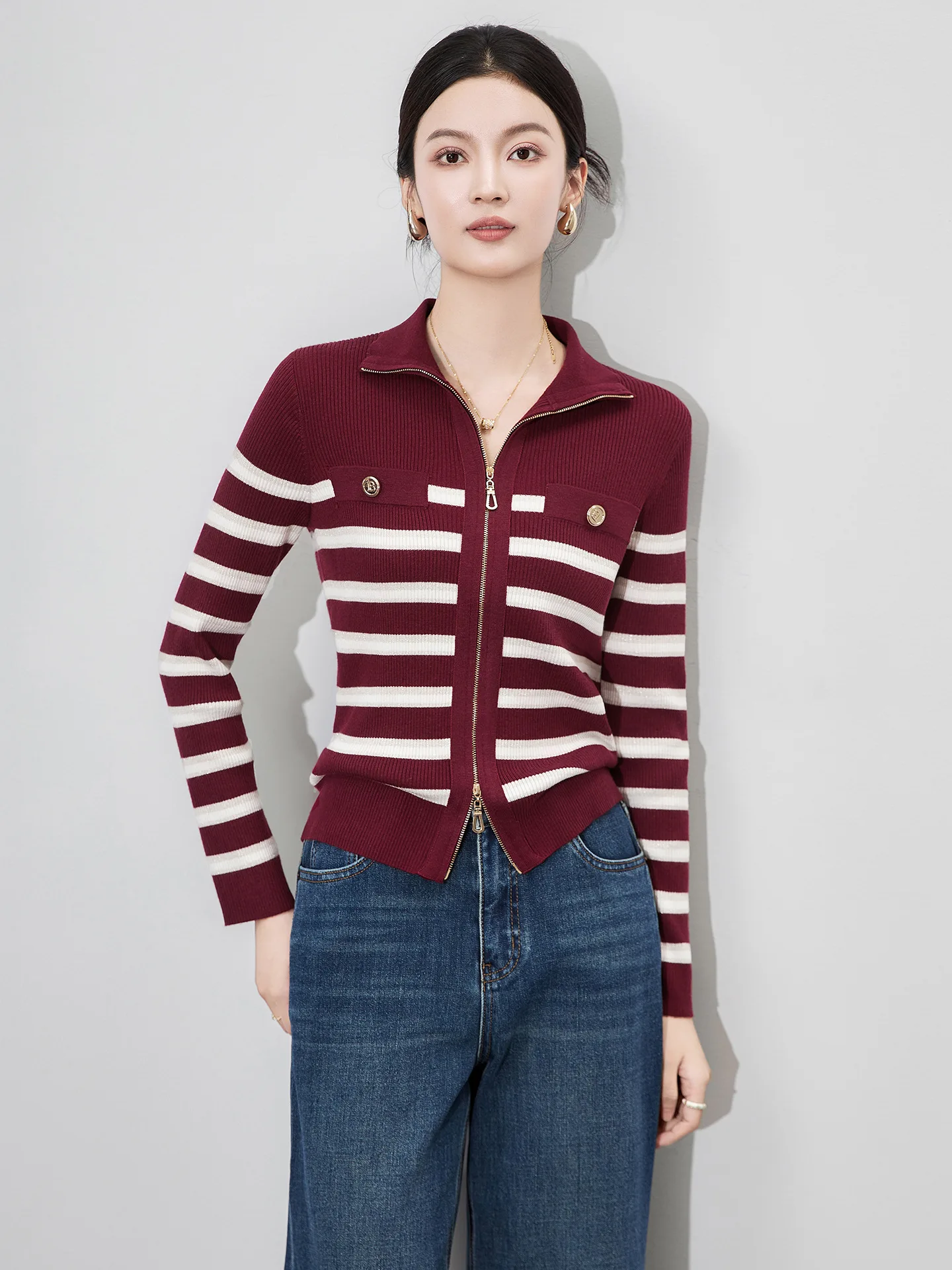 ZJYT Autumn New 2025 Fashion Women’s Striped Knitted Sweaters Long Sleeve Turn Down Collar Zip Up Tops Jacket Casual Jersey Red