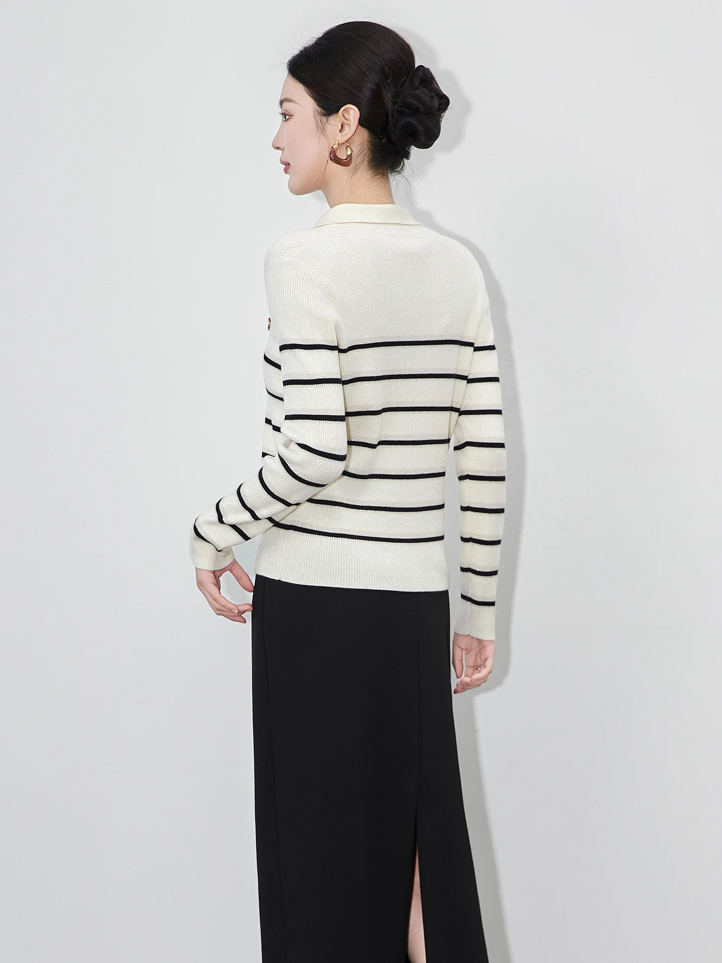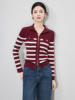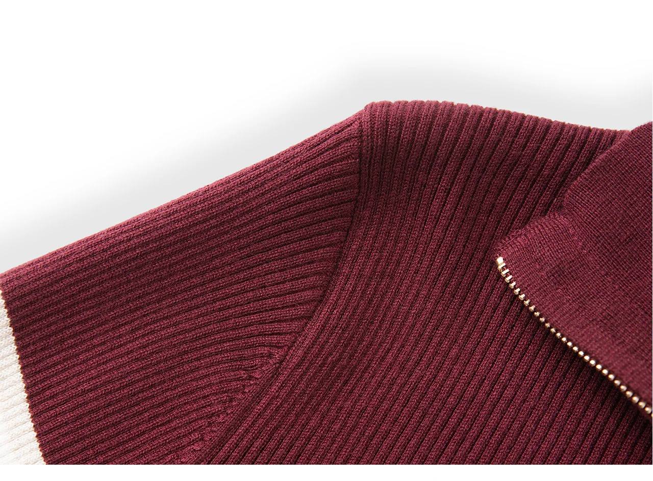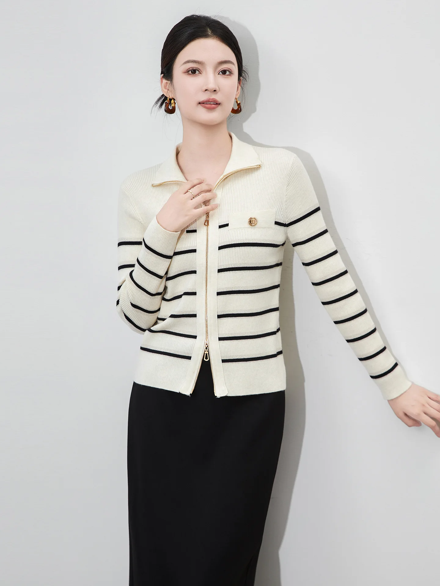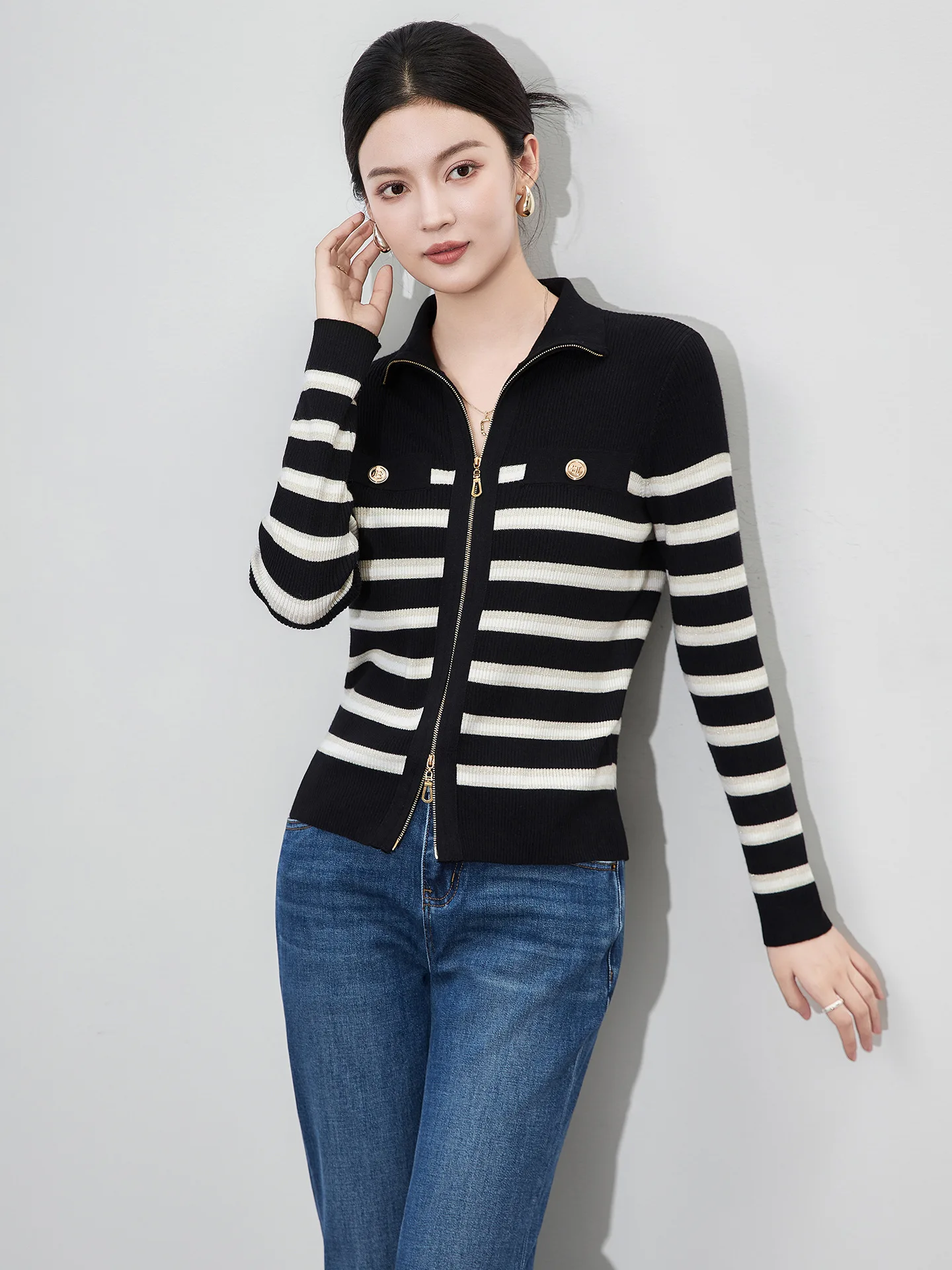 ZJYT Autumn New 2025 Fashion Women’s Striped Knitted Sweaters Long Sleeve Turn Down Collar Zip Up Tops Jacket Casual Jersey Red