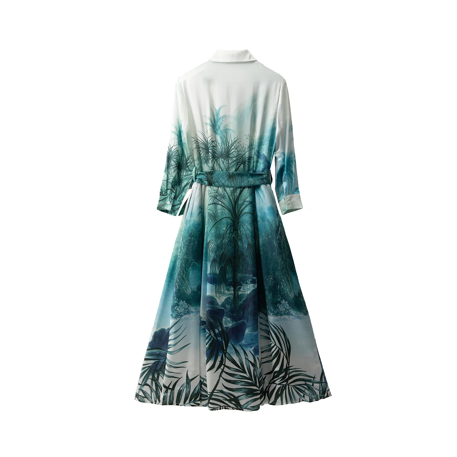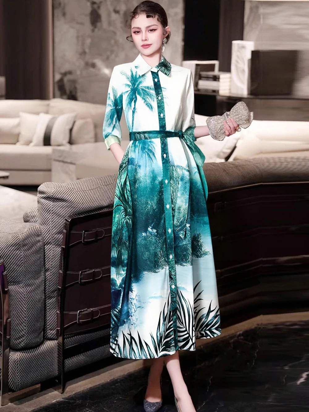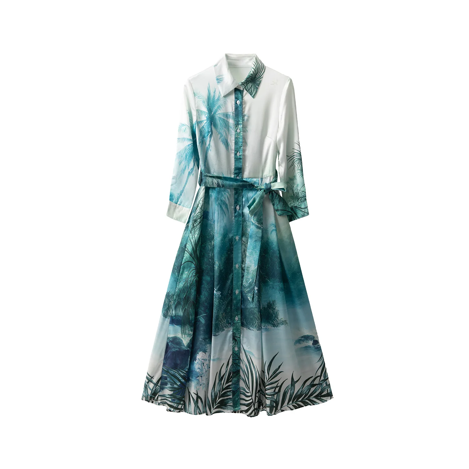 ZJYT Autumn New Runway Fashion Print Midi Shirt Dresses for Women 2025 Single Breasted Lace Up Casual Holiday Dress Female