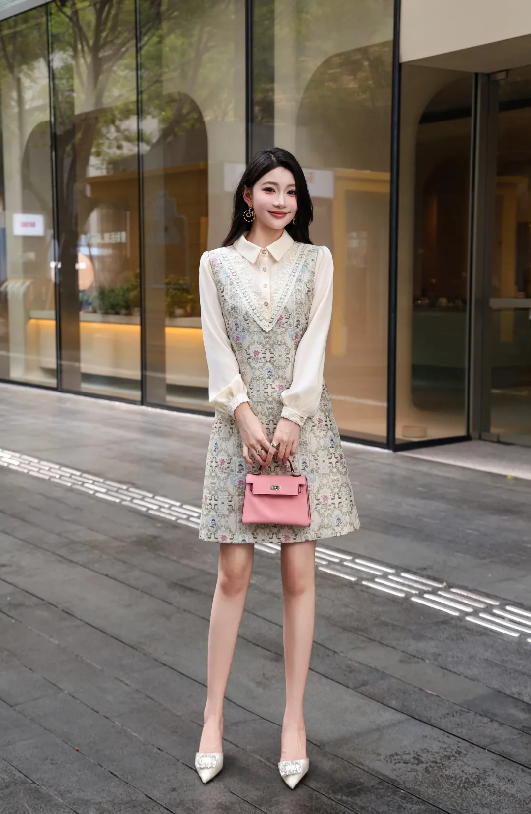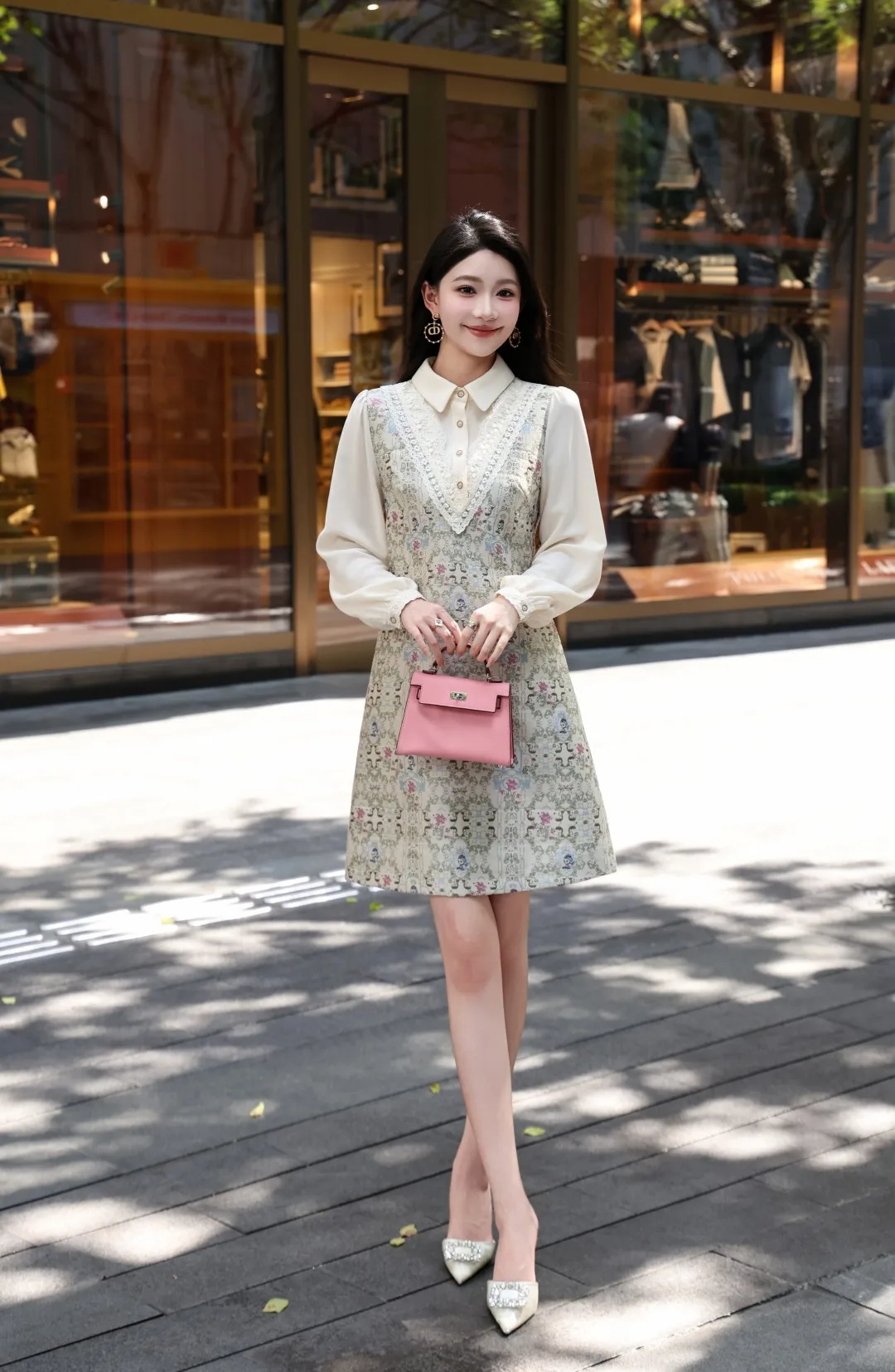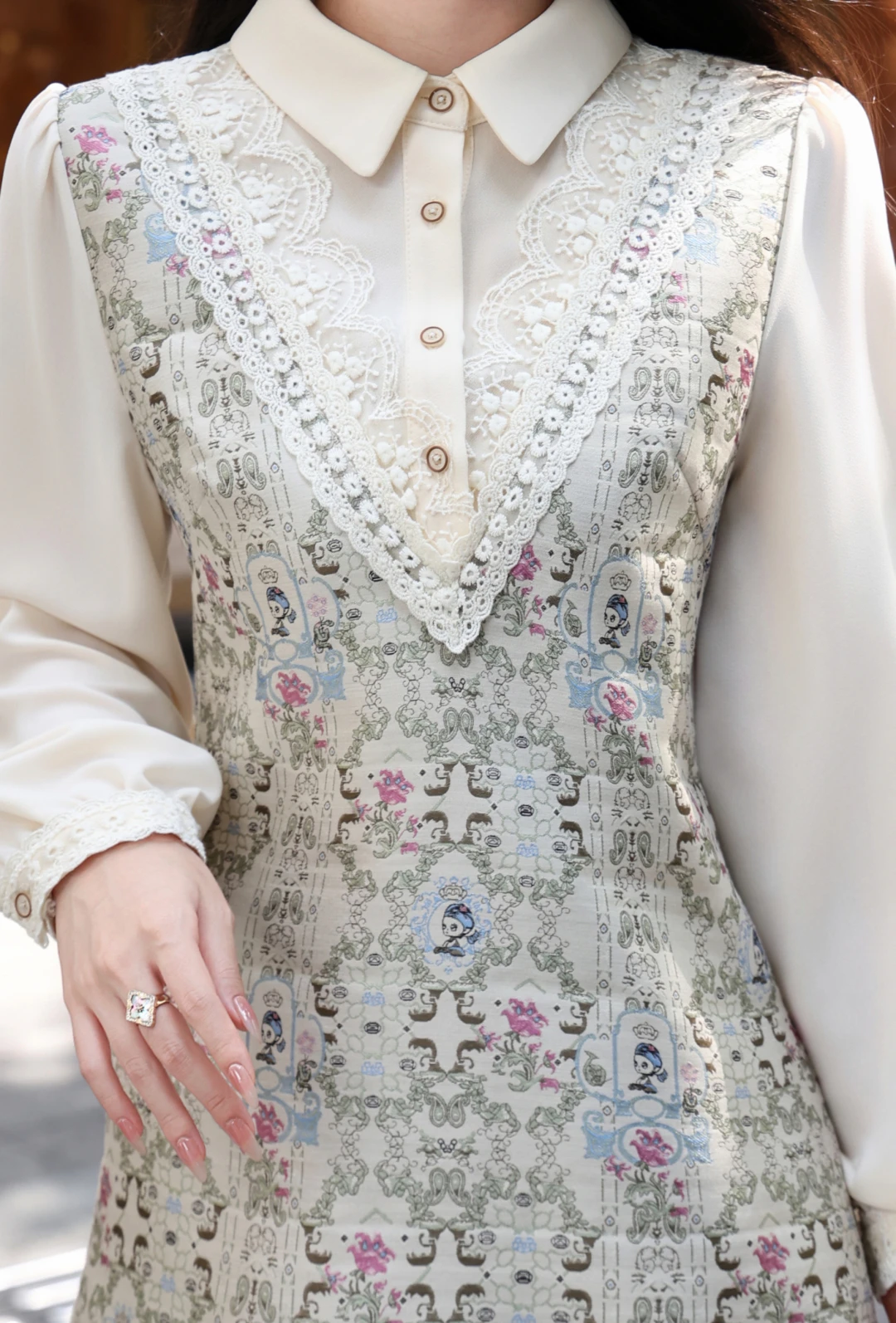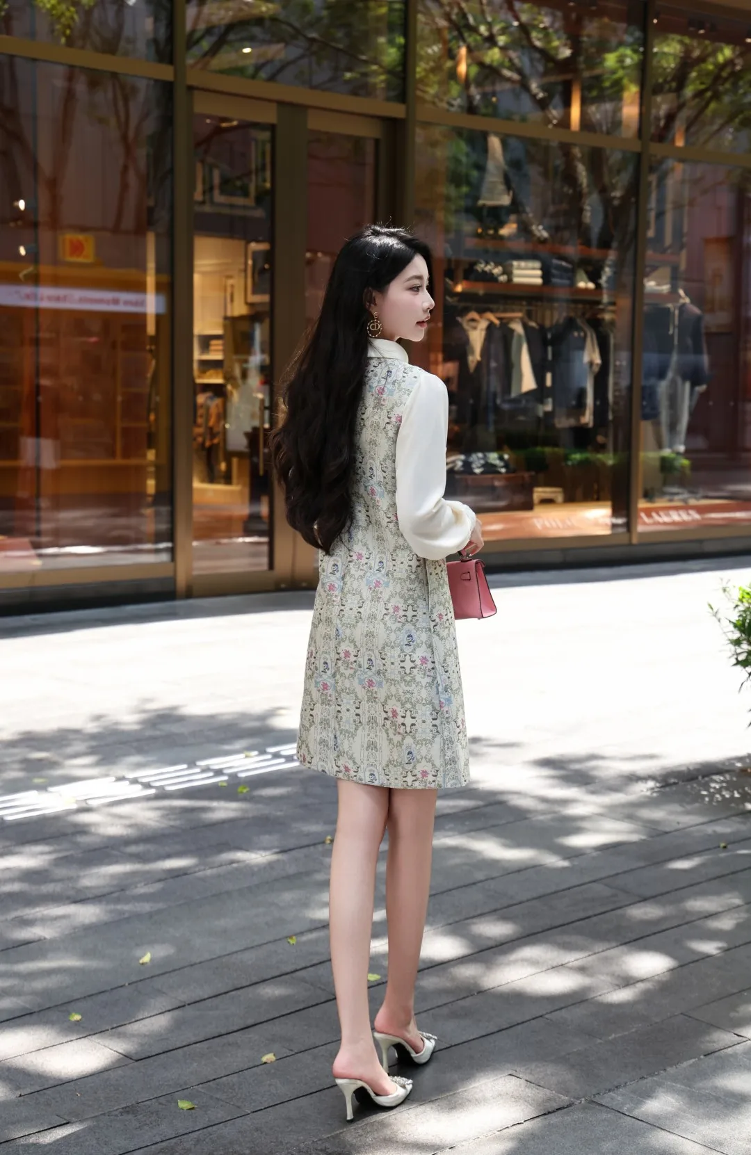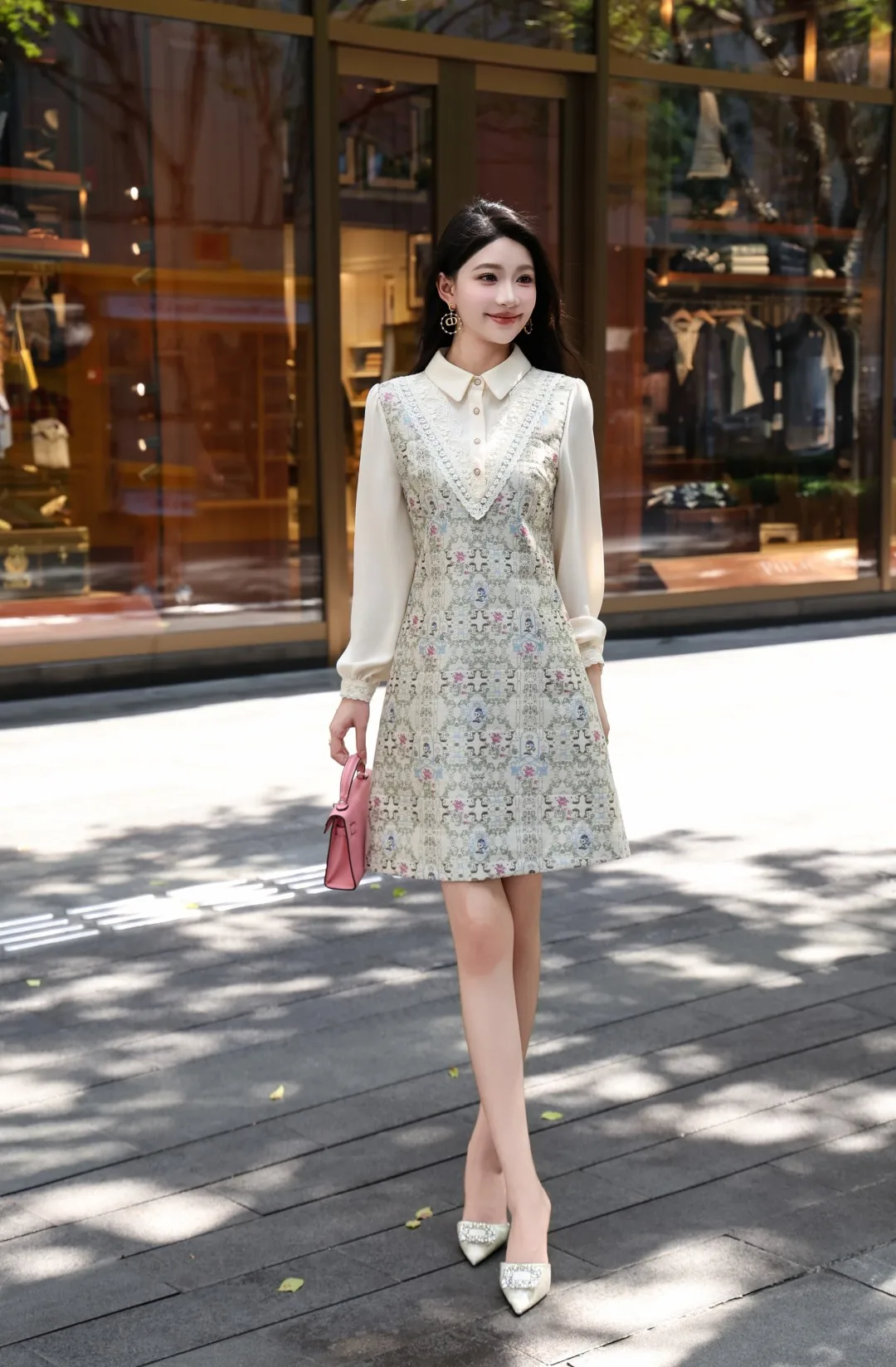 ZJYT Autumn New Women Long Sleeve Floral Jacquard Dress Vintage Turn Down Collar Casual Knee Length Dress Vestidos Female 2025