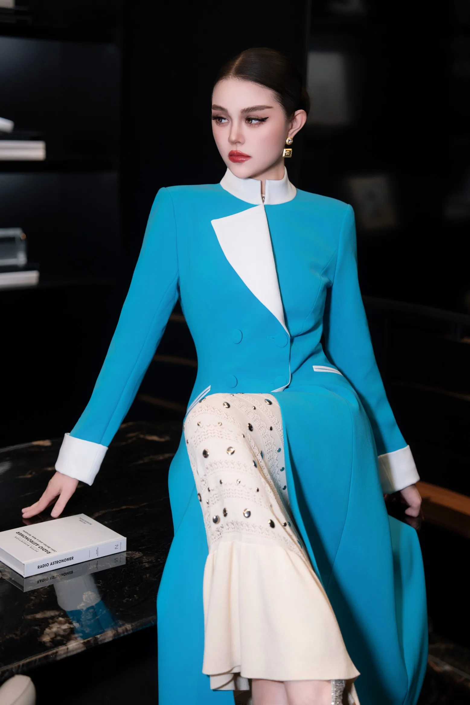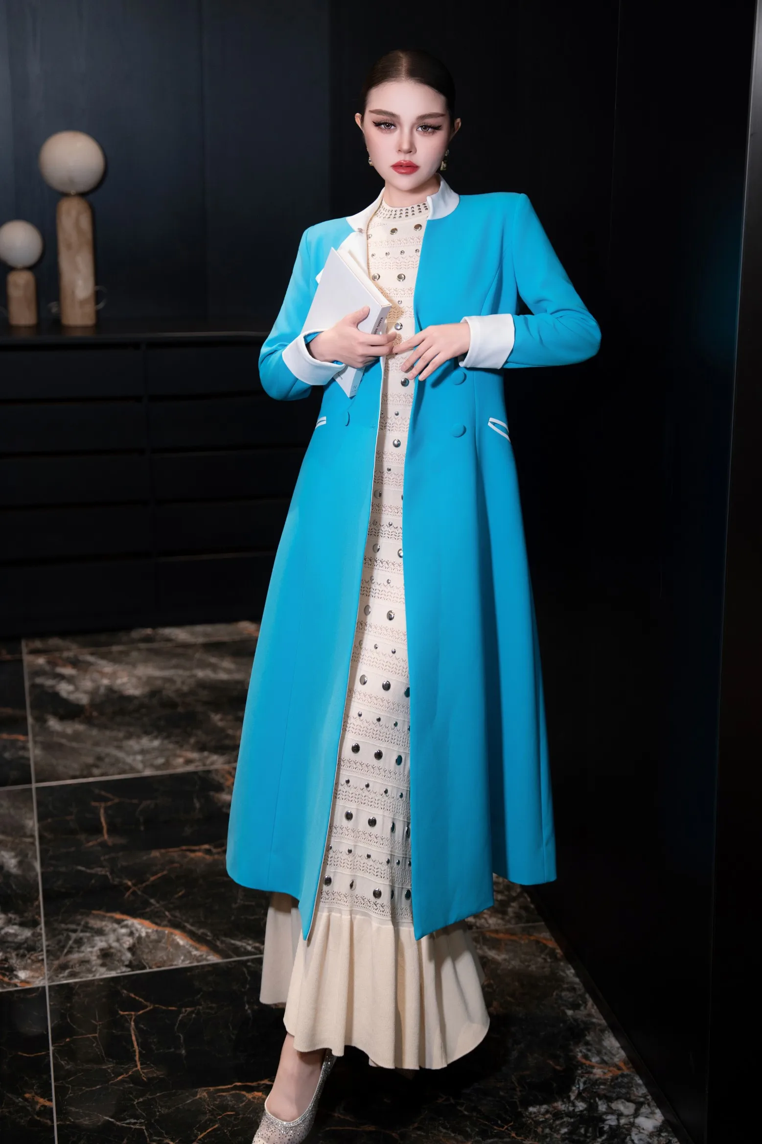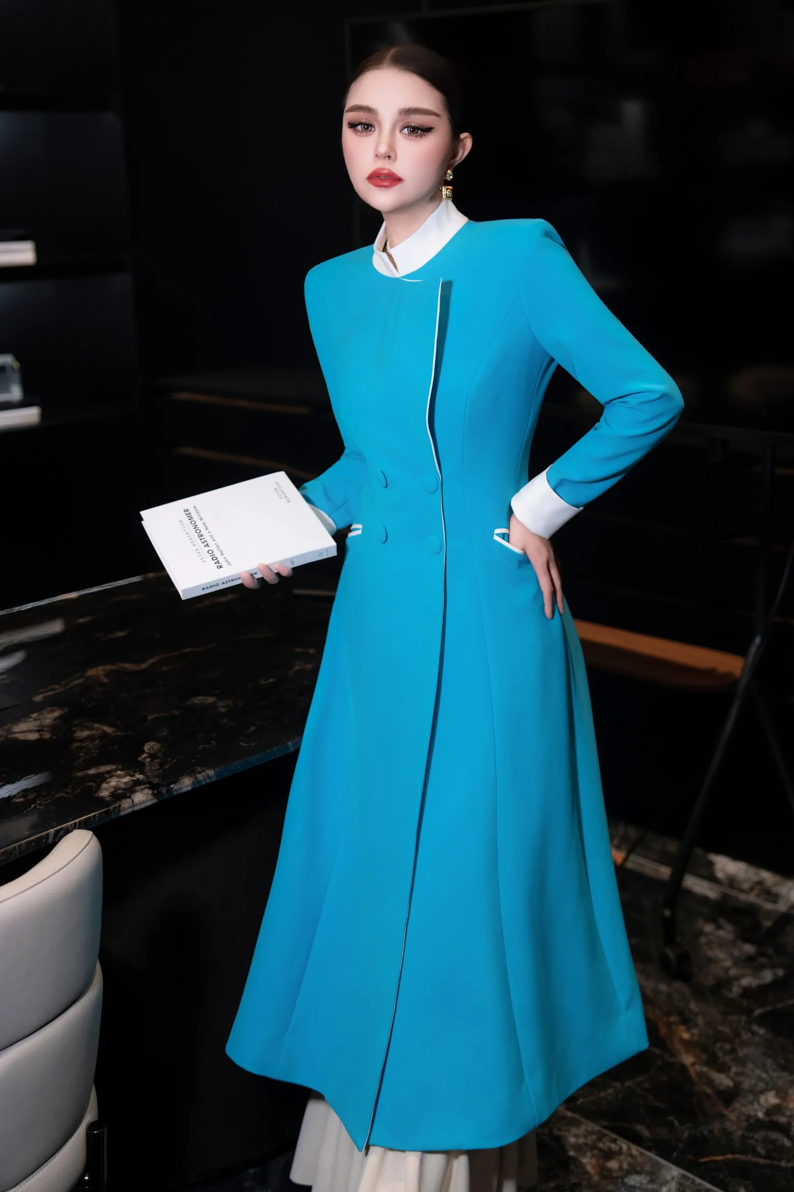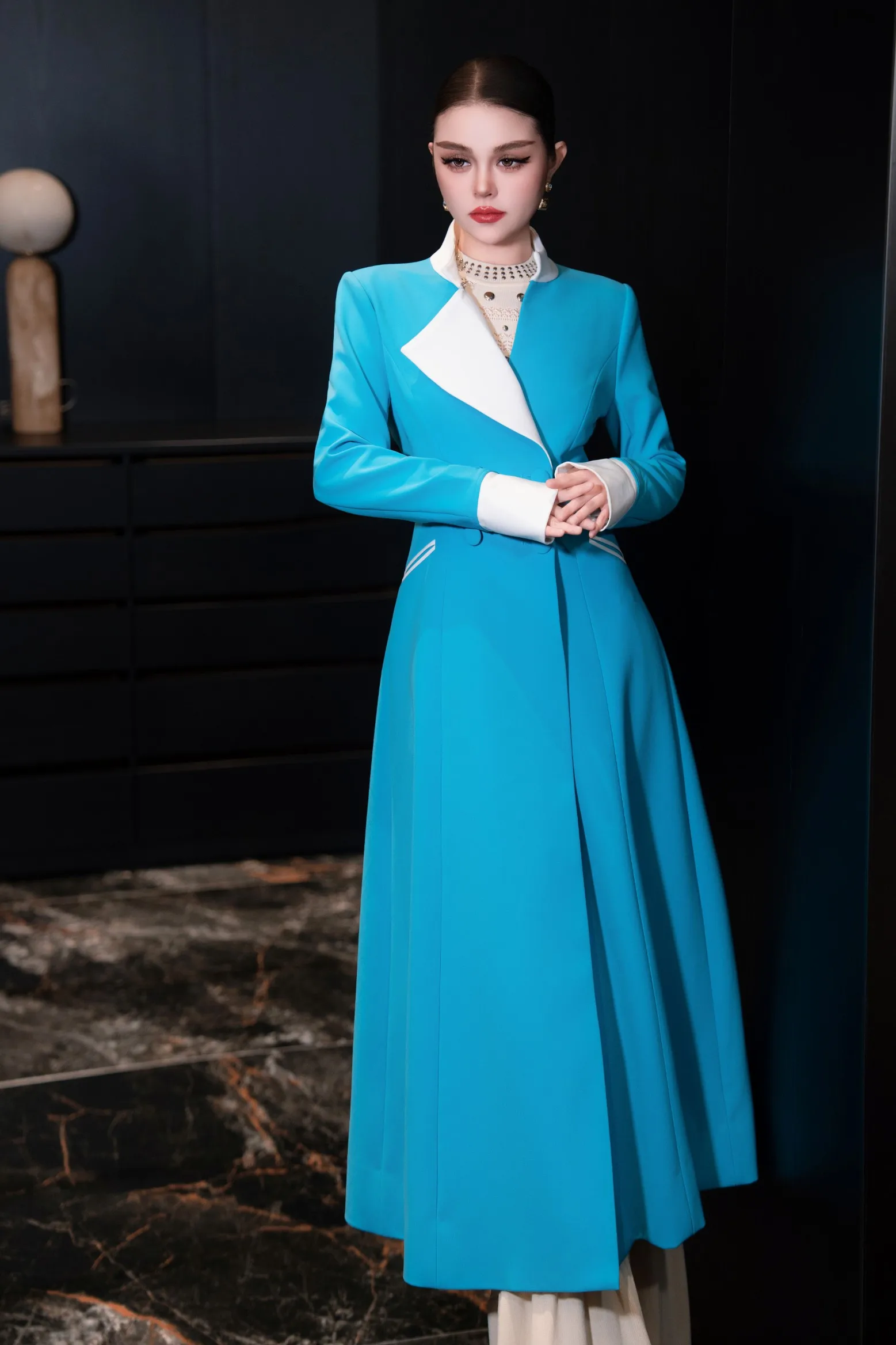 ZJYT Autumn Winter Elegant Long Trench for Women Hit Color Double Breasted Jacket Coat Plus Size Overcoat Female Outerwears Blue