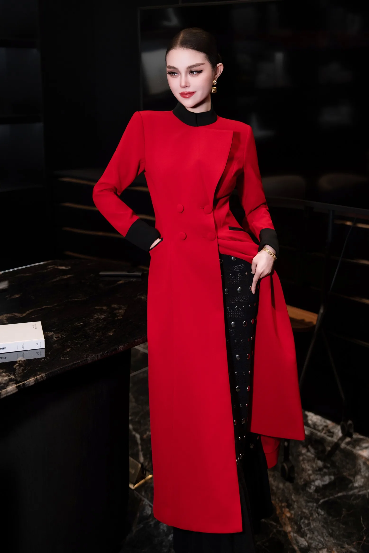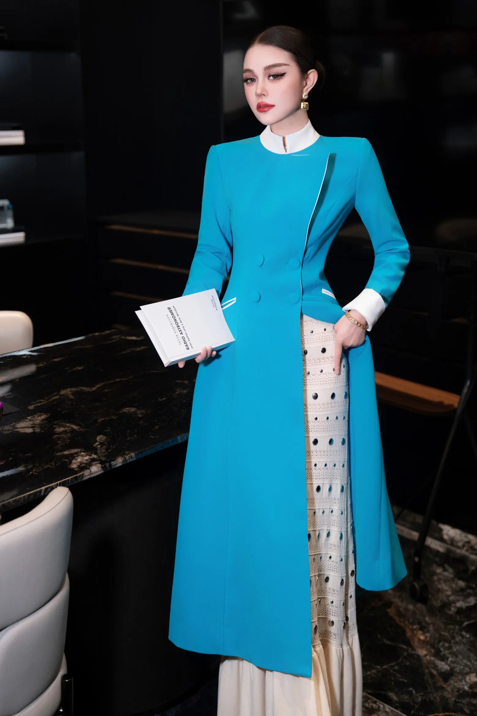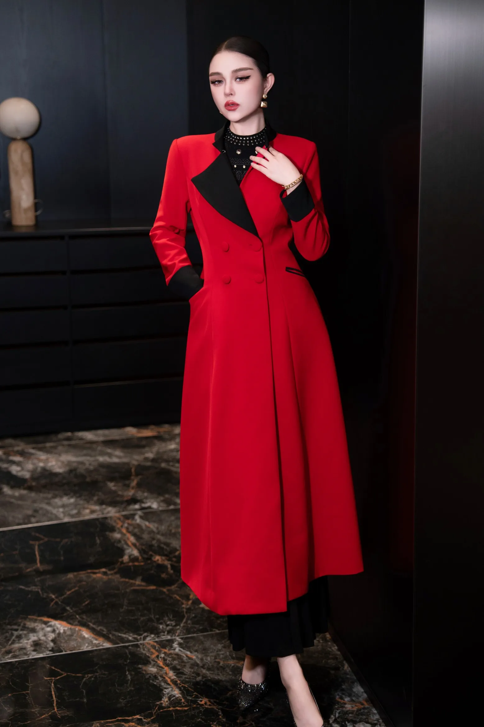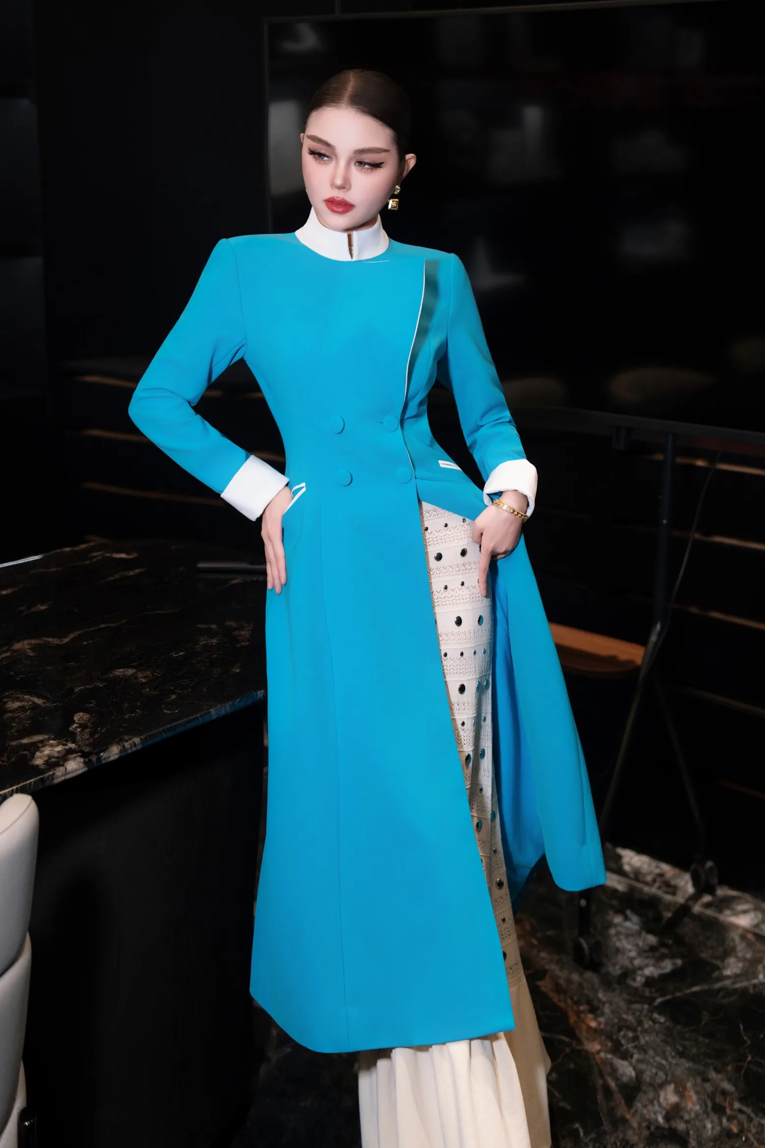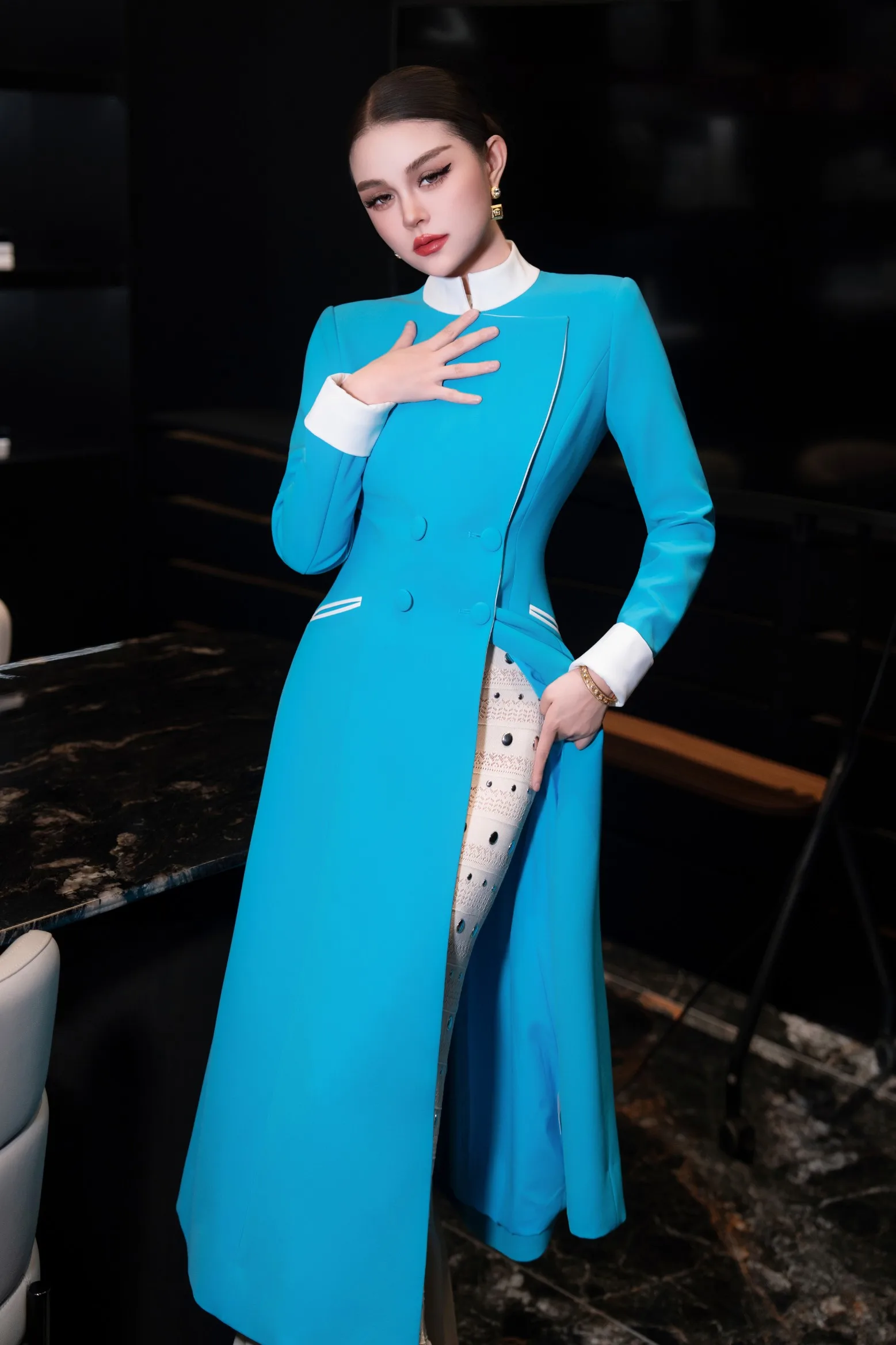 ZJYT Autumn Winter Elegant Long Trench for Women Hit Color Double Breasted Jacket Coat Plus Size Overcoat Female Outerwears Blue