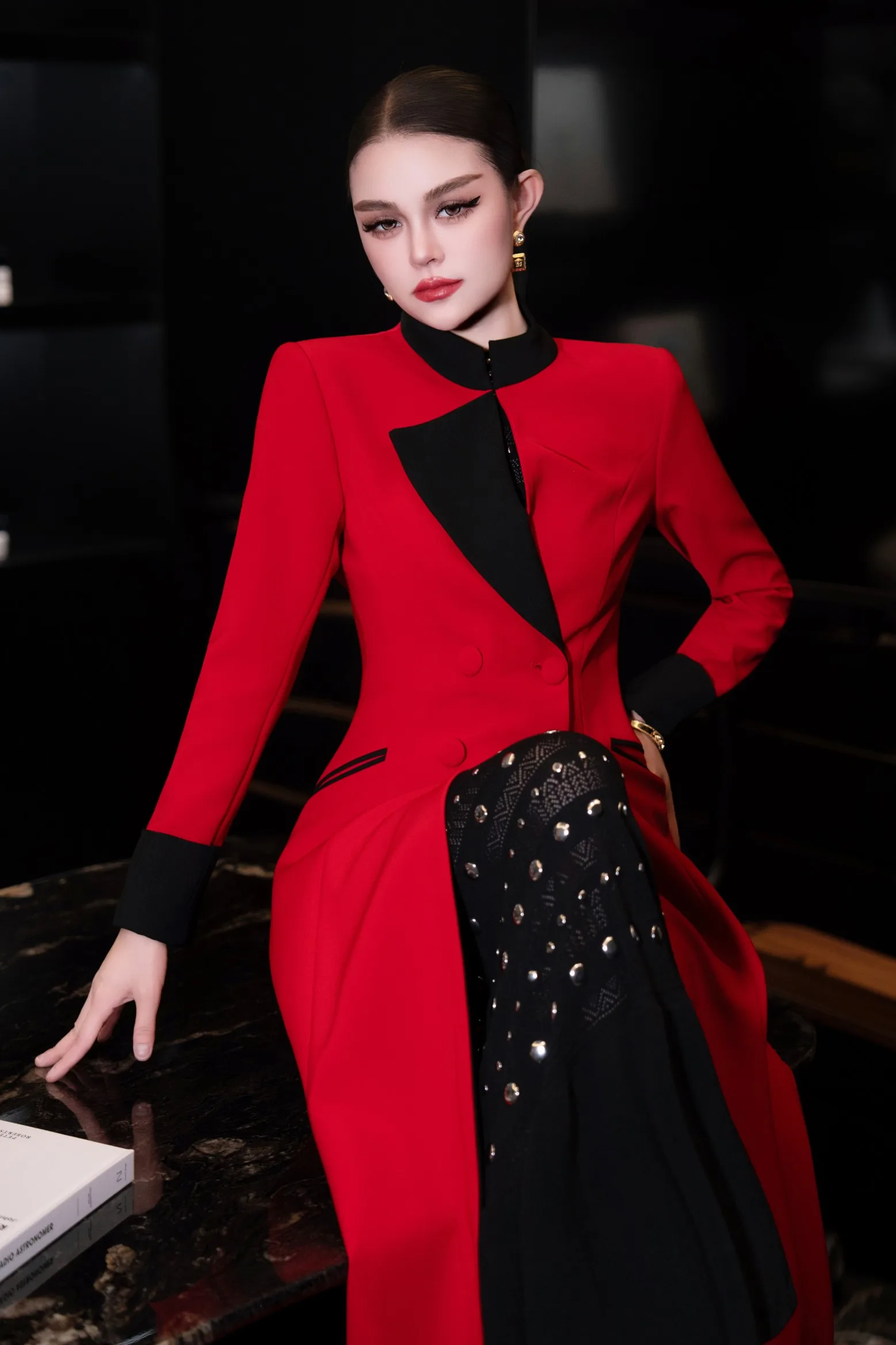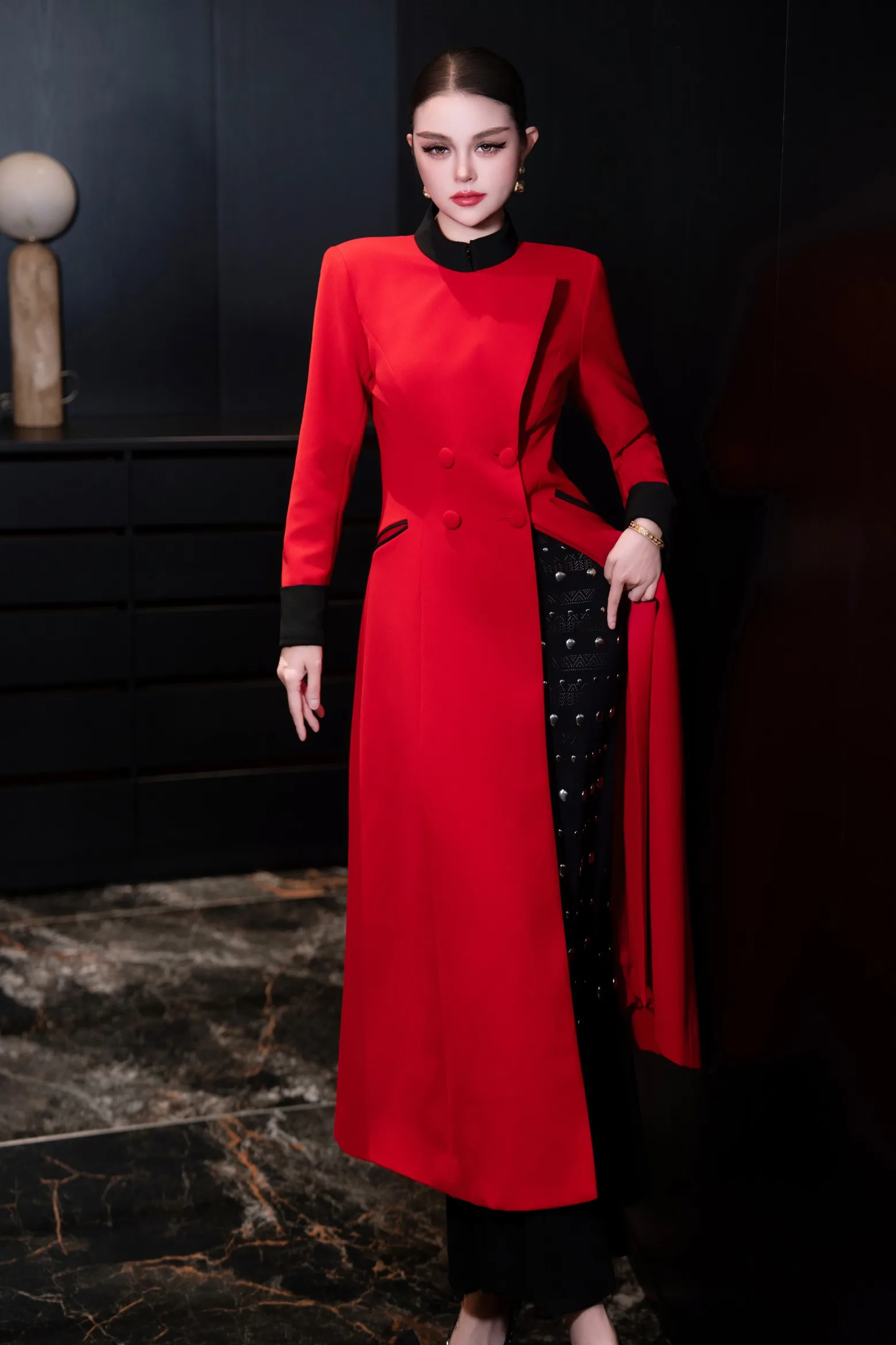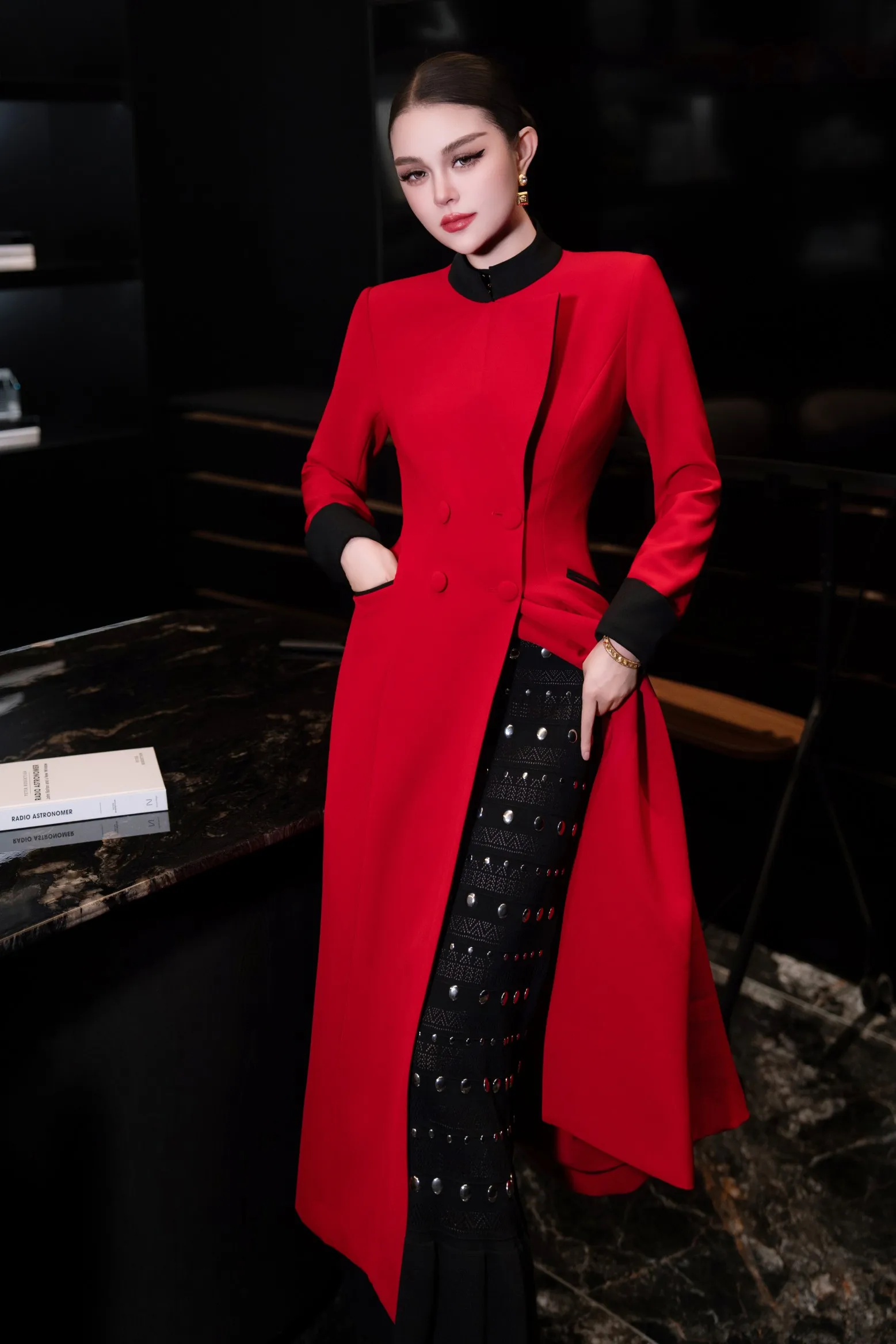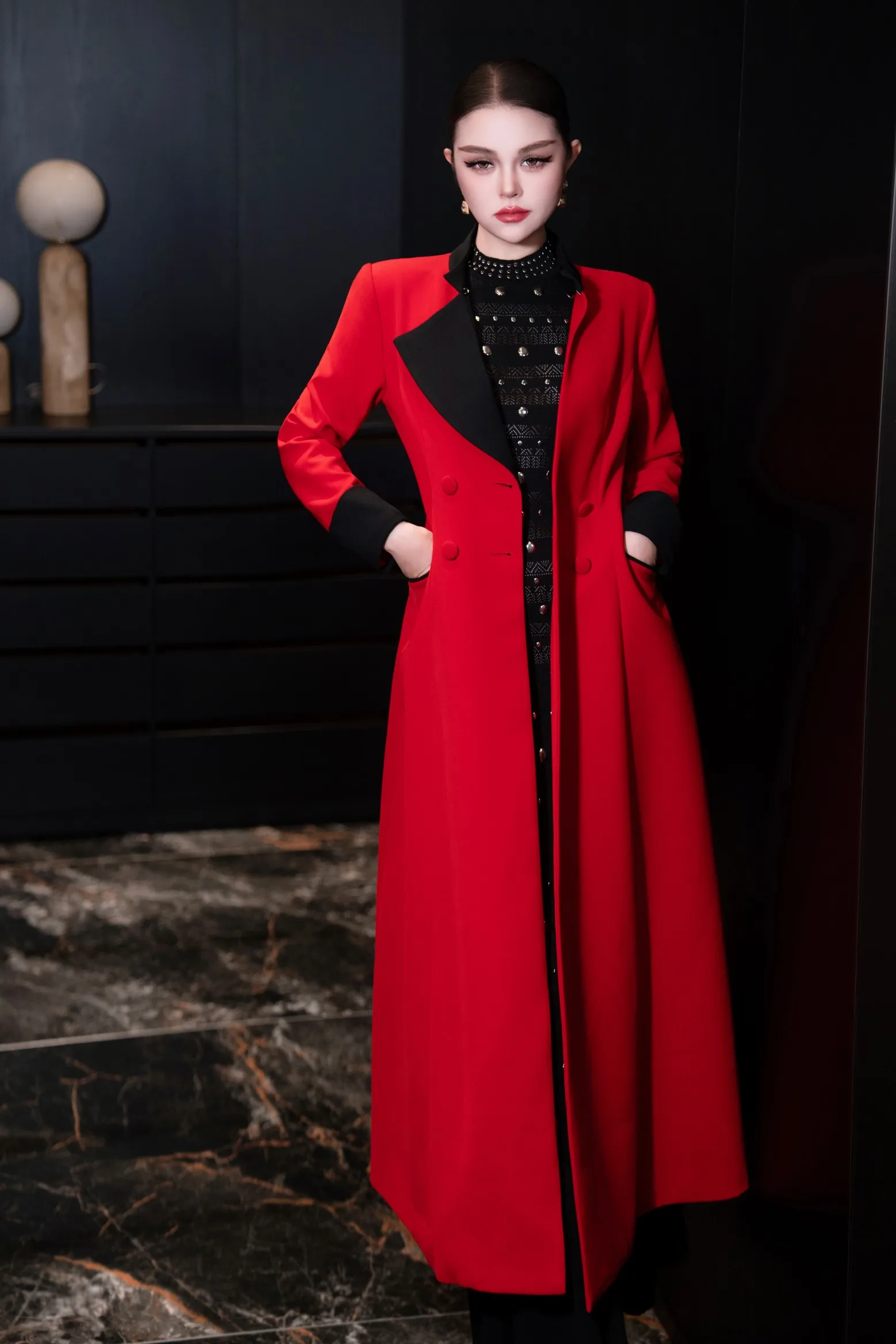 ZJYT Autumn Winter Elegant Long Trench for Women Hit Color Double Breasted Jacket Coat Plus Size Overcoat Female Outerwears Blue