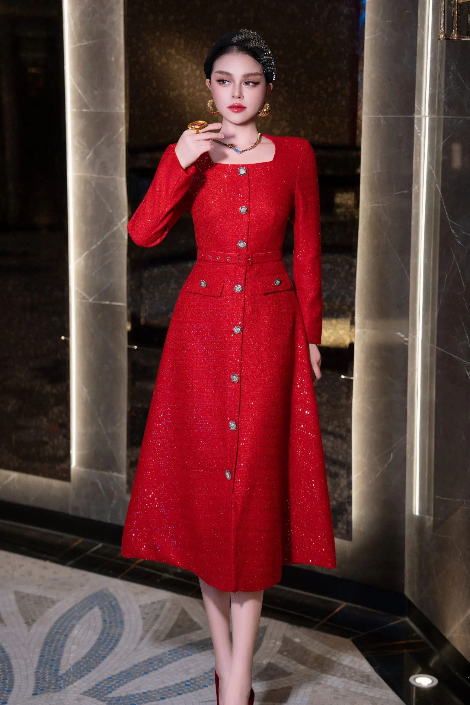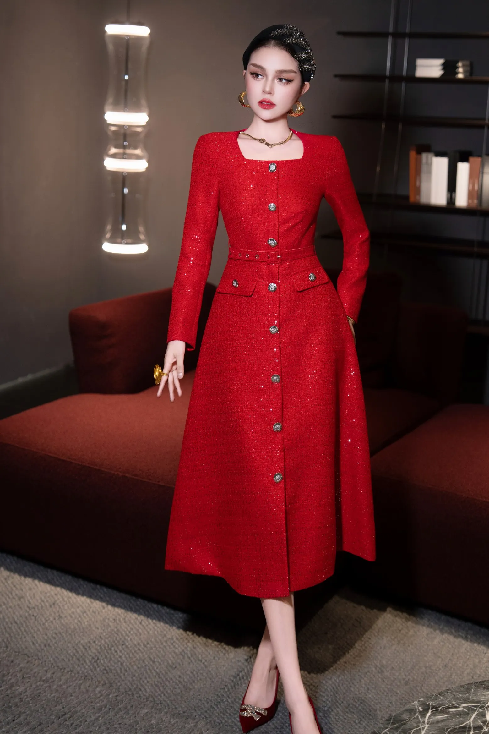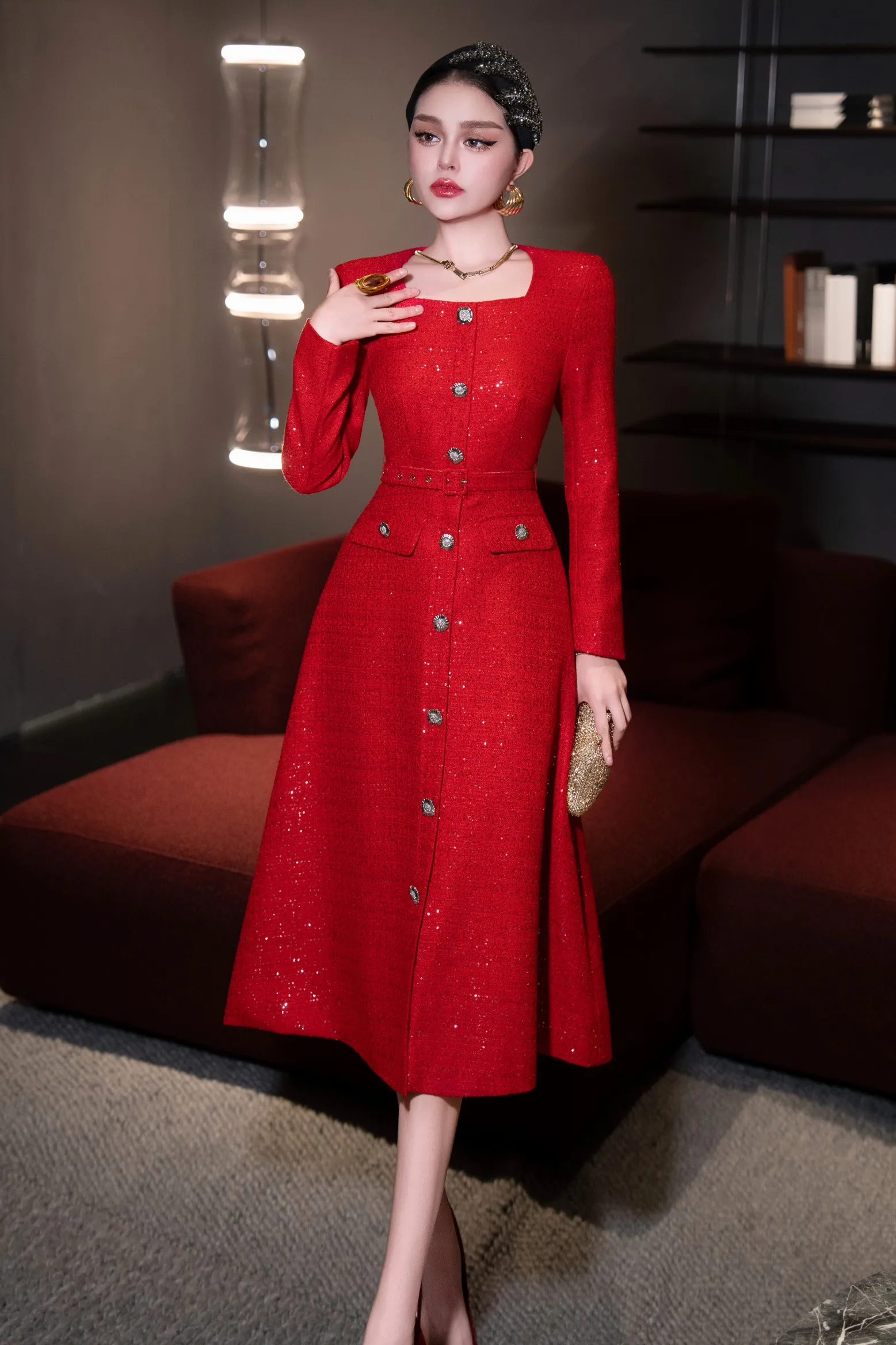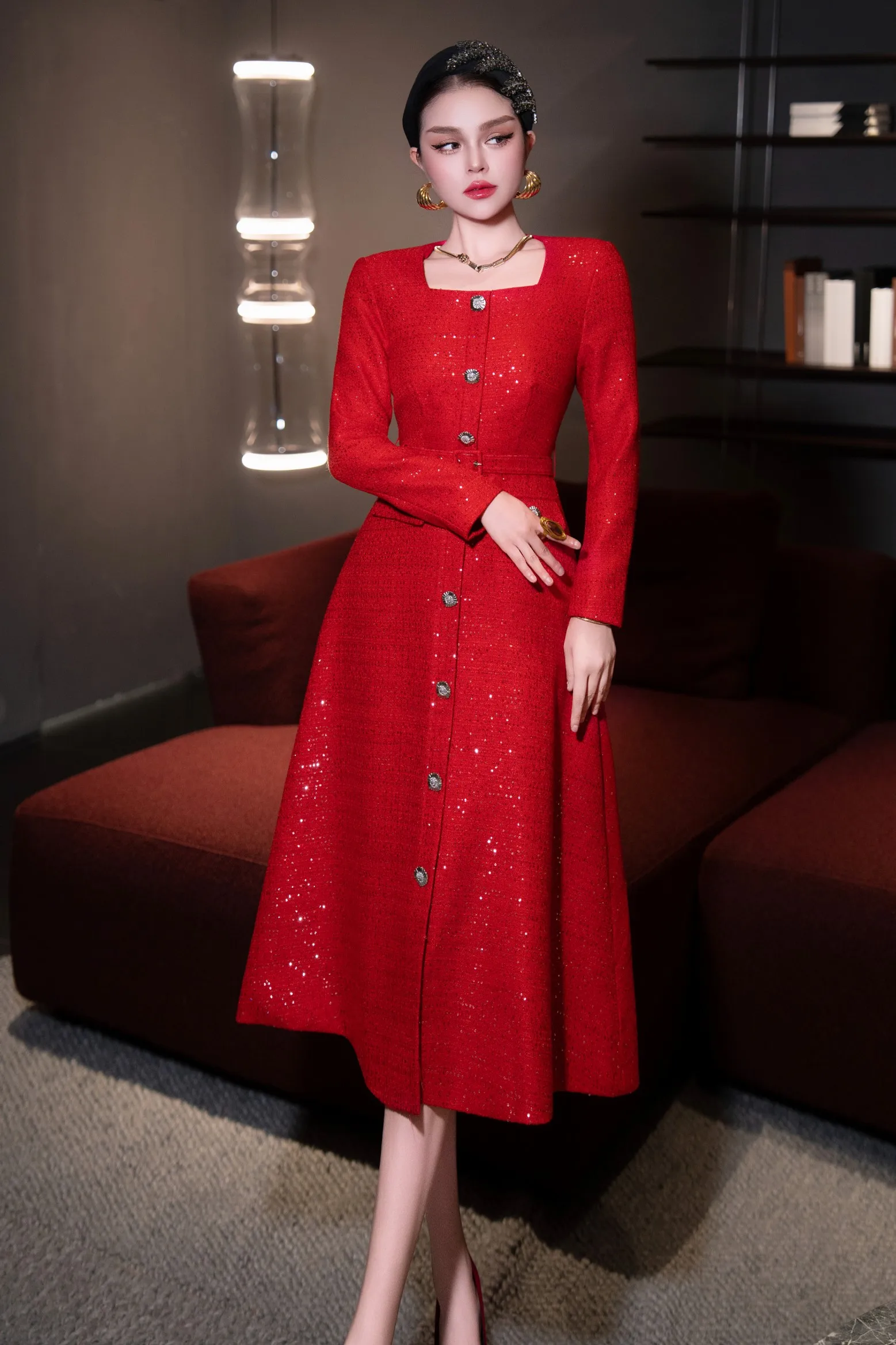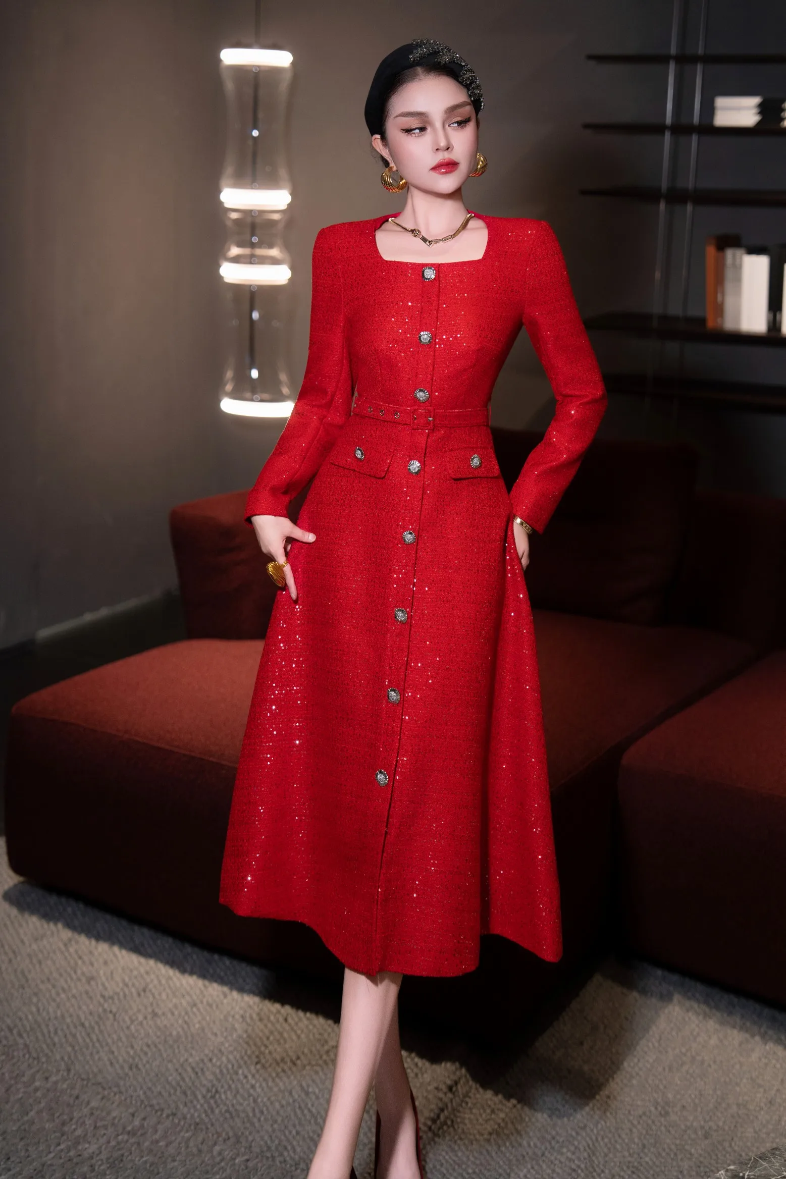 ZJYT Autumn Winter Long Sleeve Sequined Tweed Dresses for Women Elegant Square Collar Midi Red Party Dress Ladies Vestidos 2025