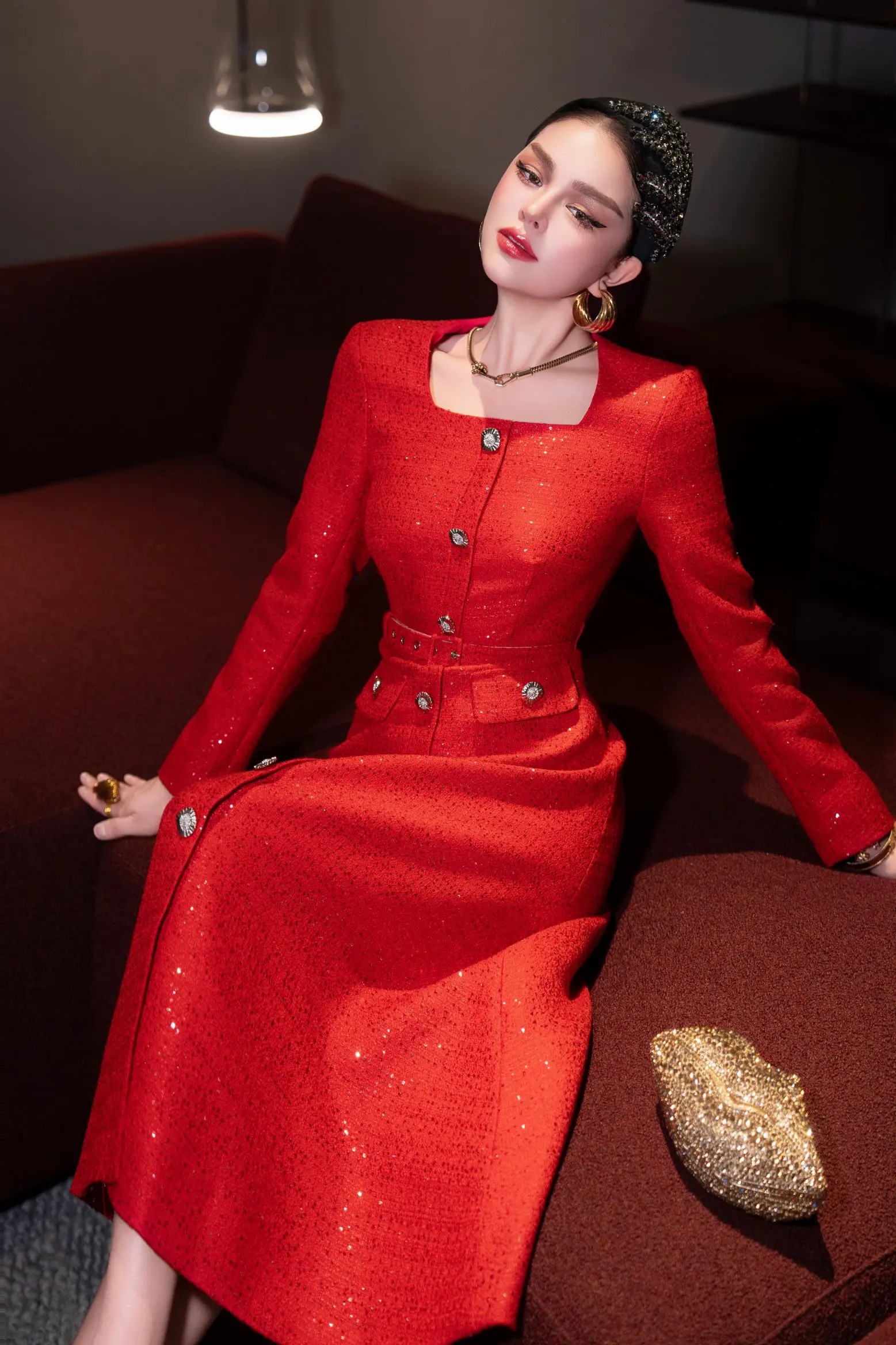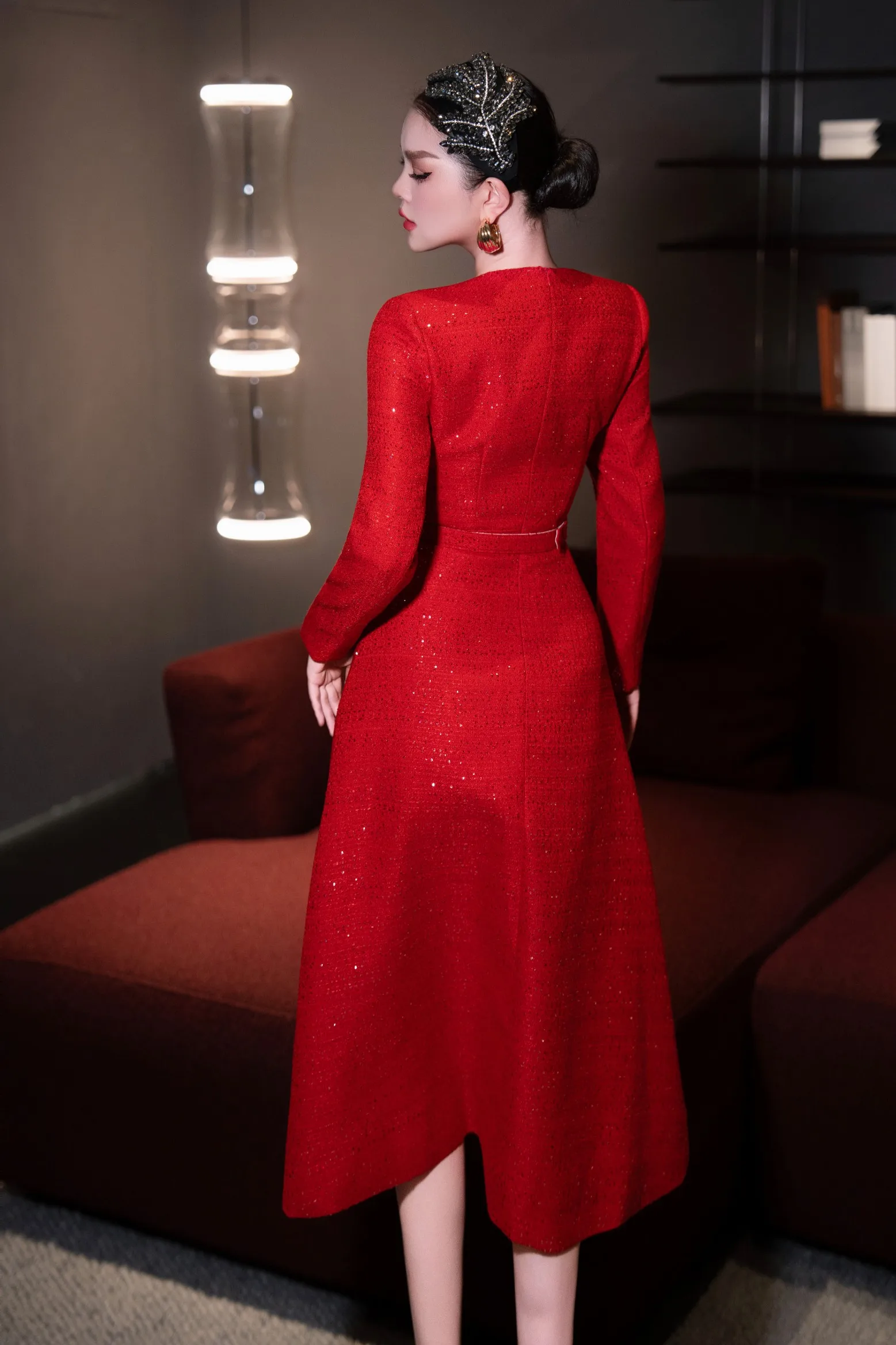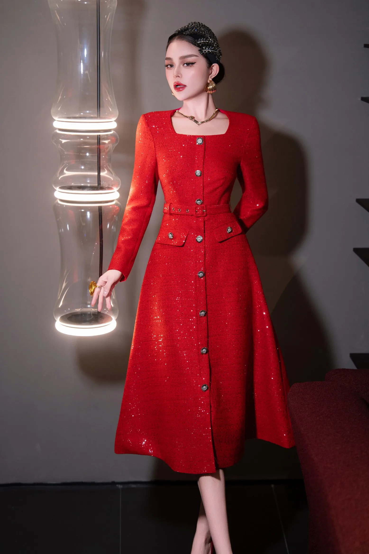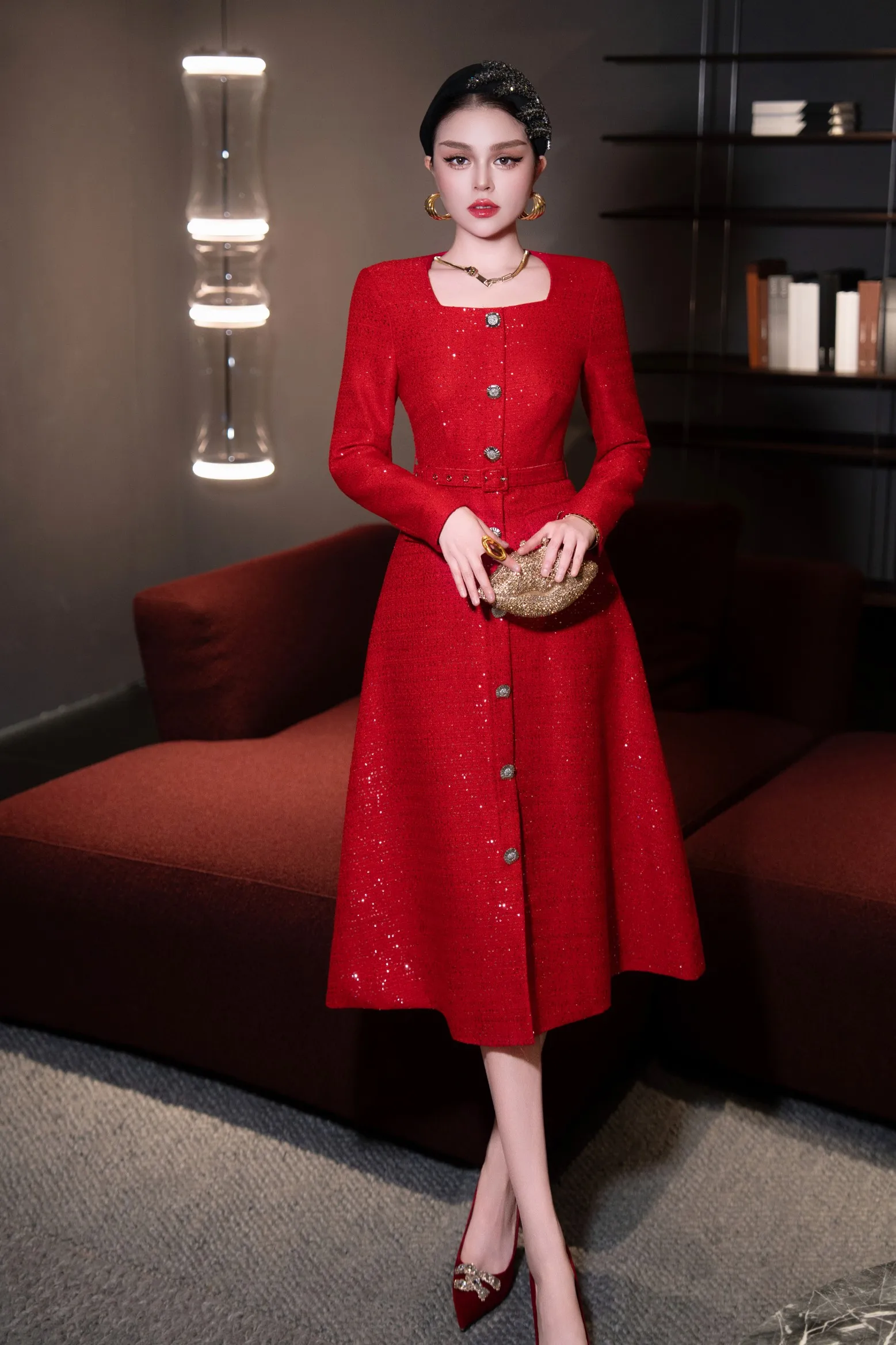 ZJYT Autumn Winter Long Sleeve Sequined Tweed Dresses for Women Elegant Square Collar Midi Red Party Dress Ladies Vestidos 2025