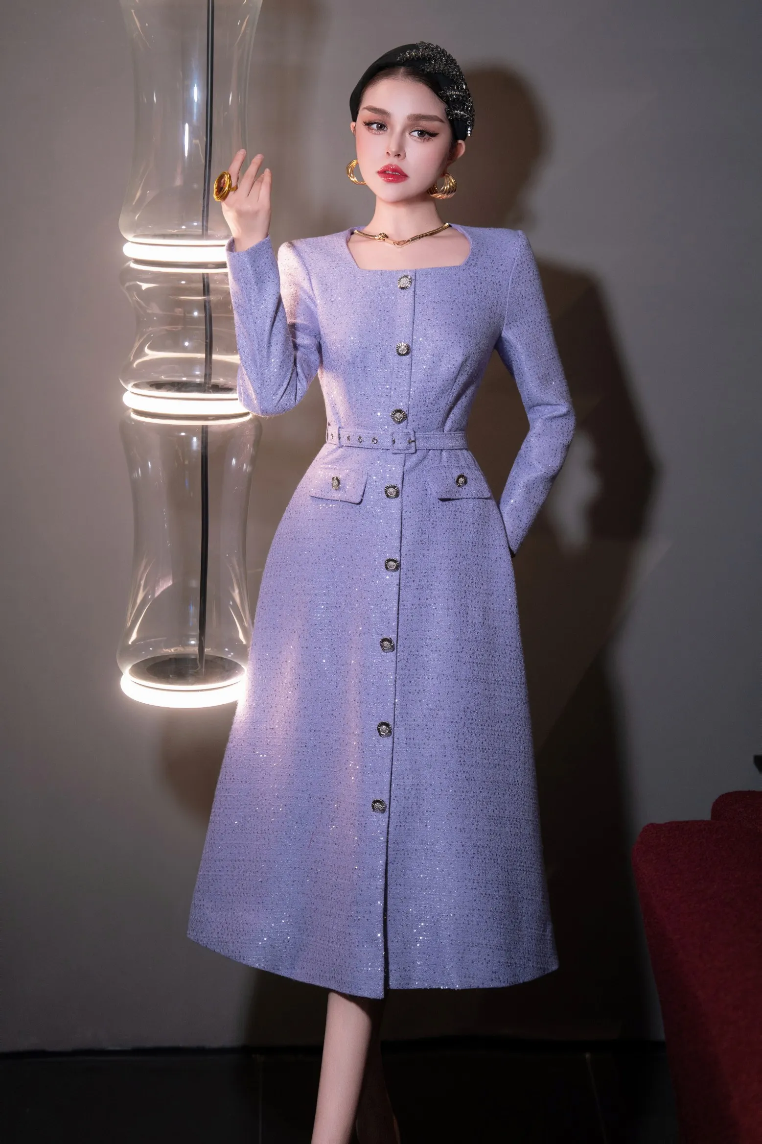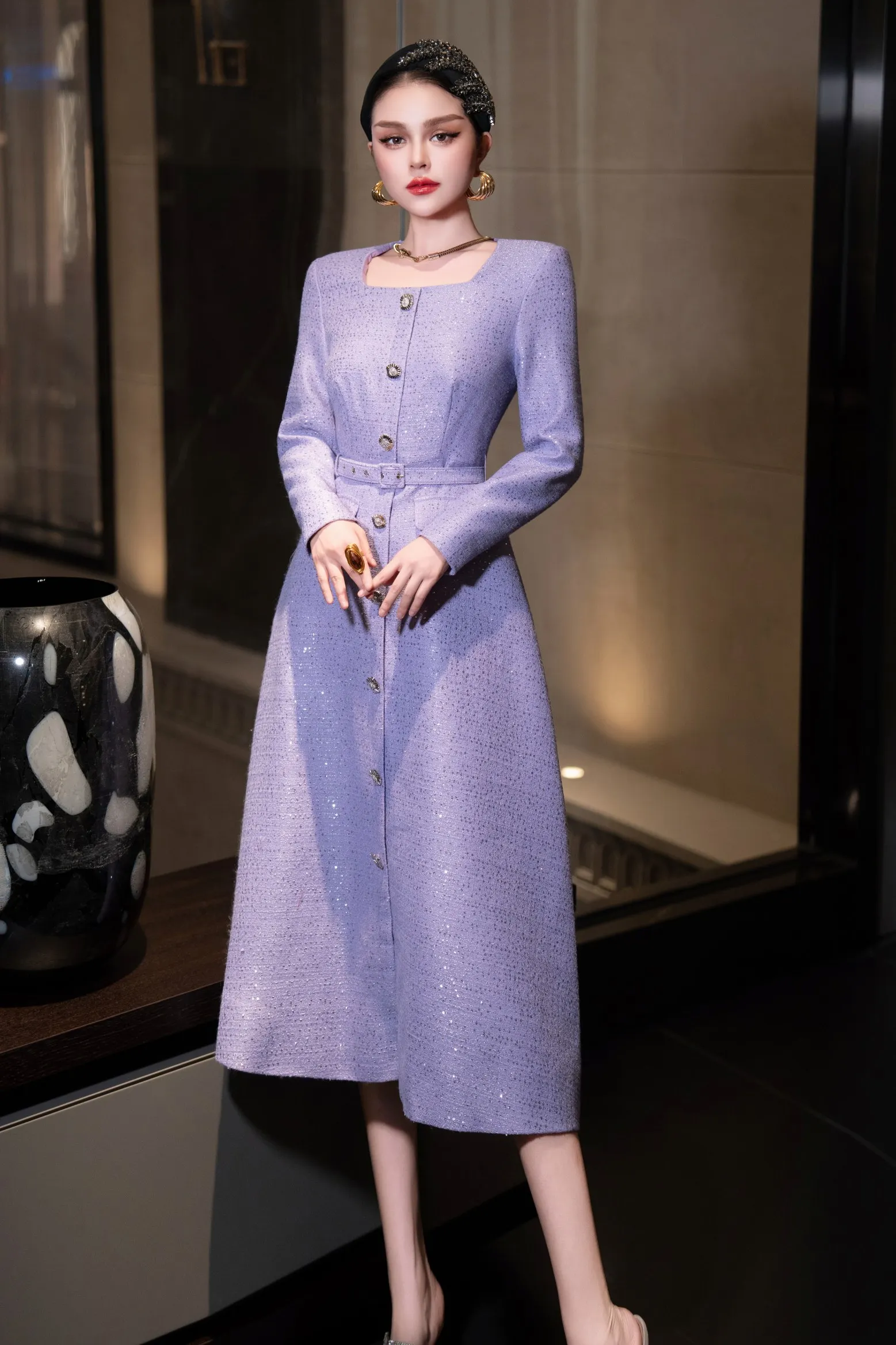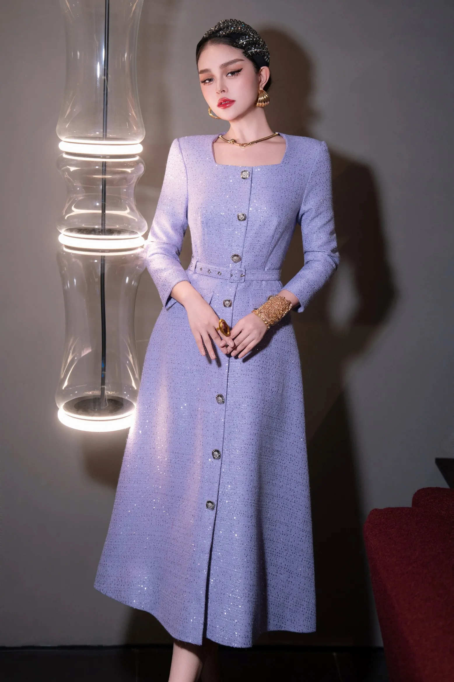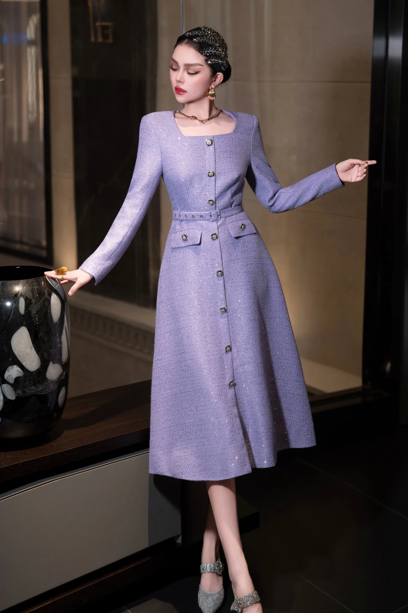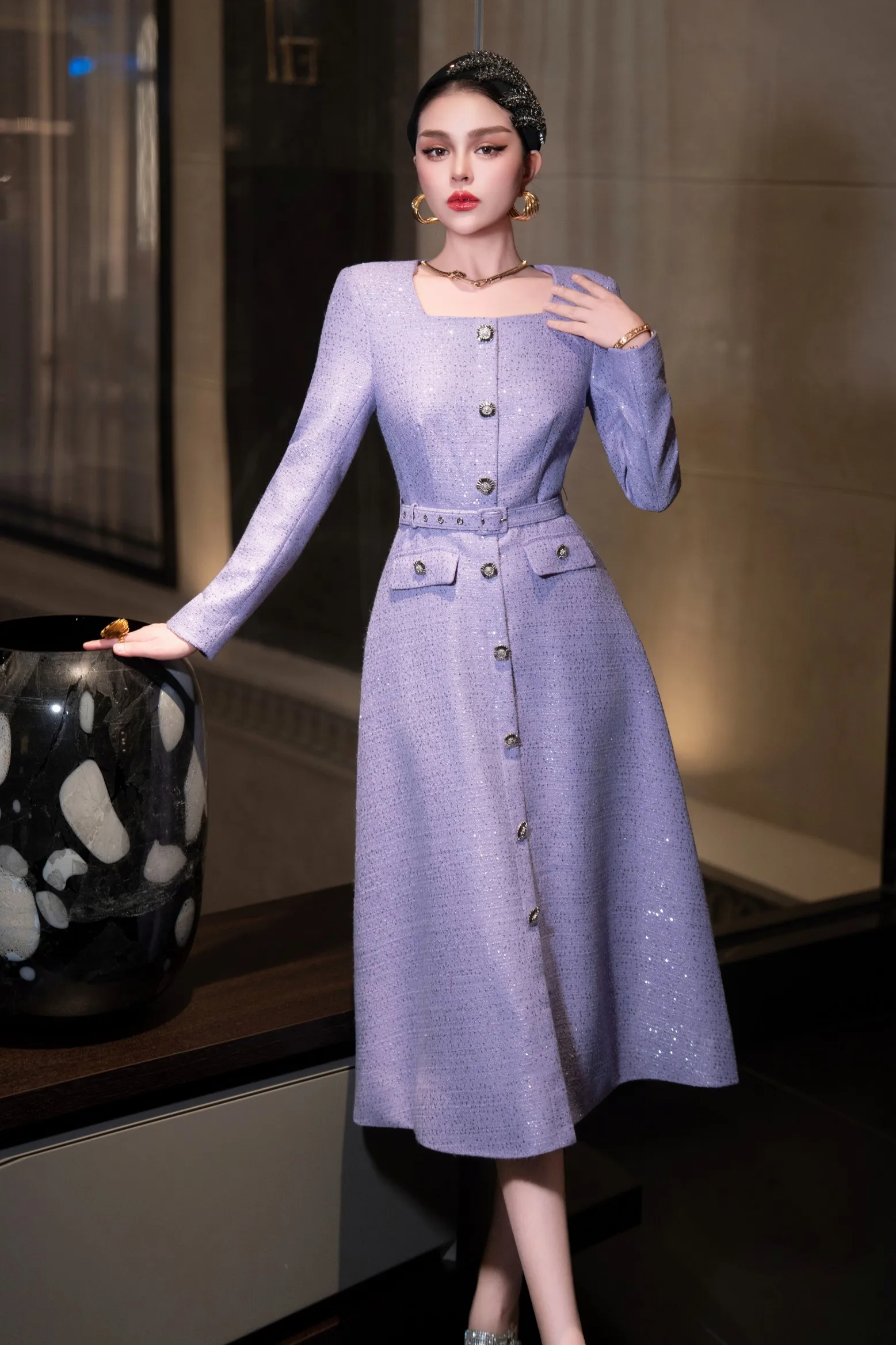 ZJYT Autumn Winter Long Sleeve Sequined Tweed Dresses for Women Elegant Square Collar Midi Red Party Dress Ladies Vestidos 2025