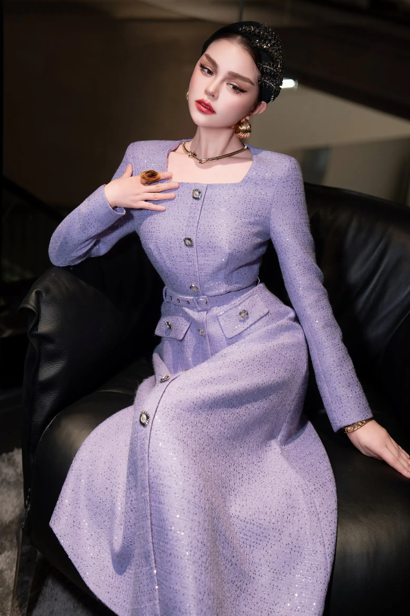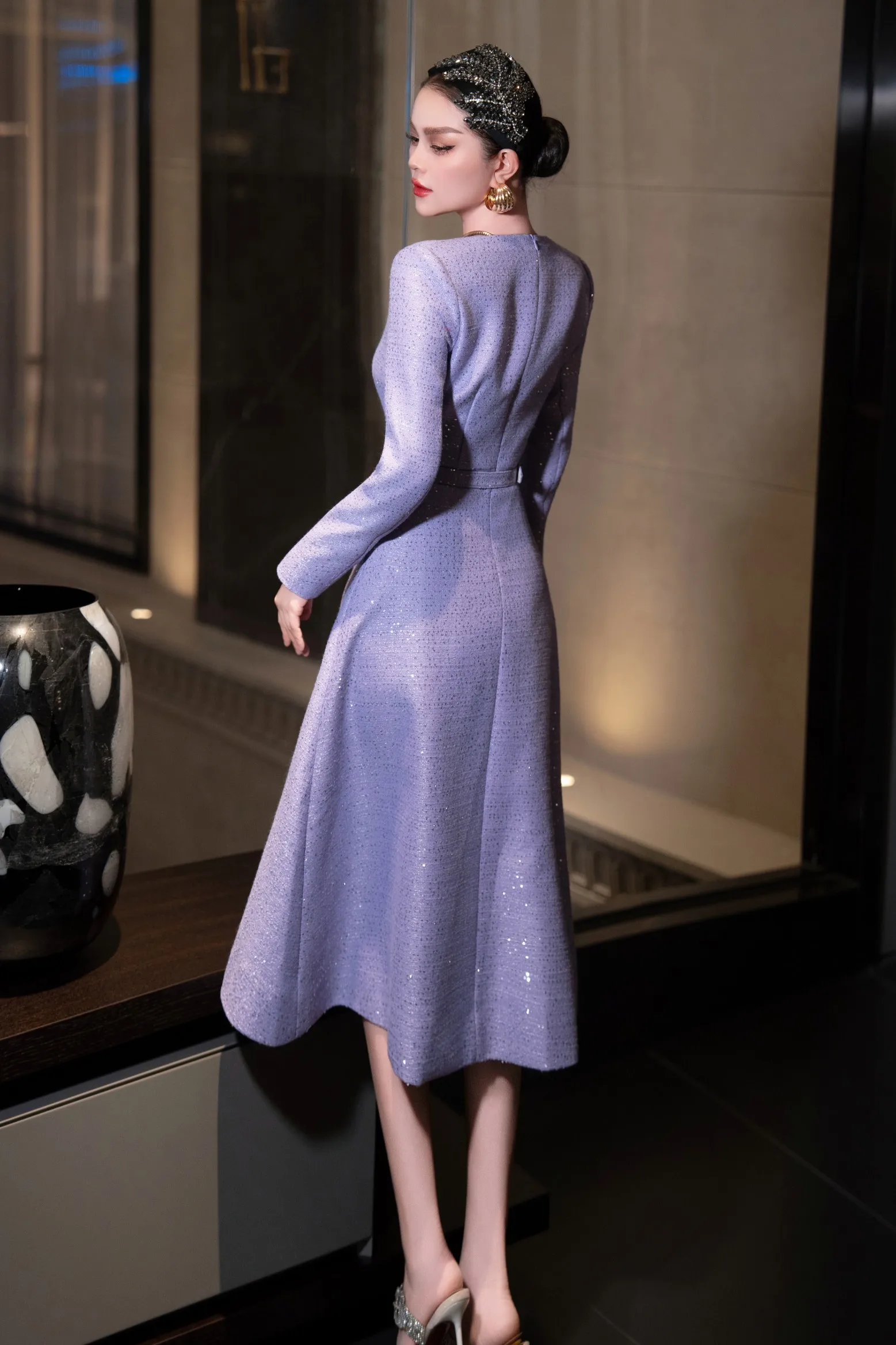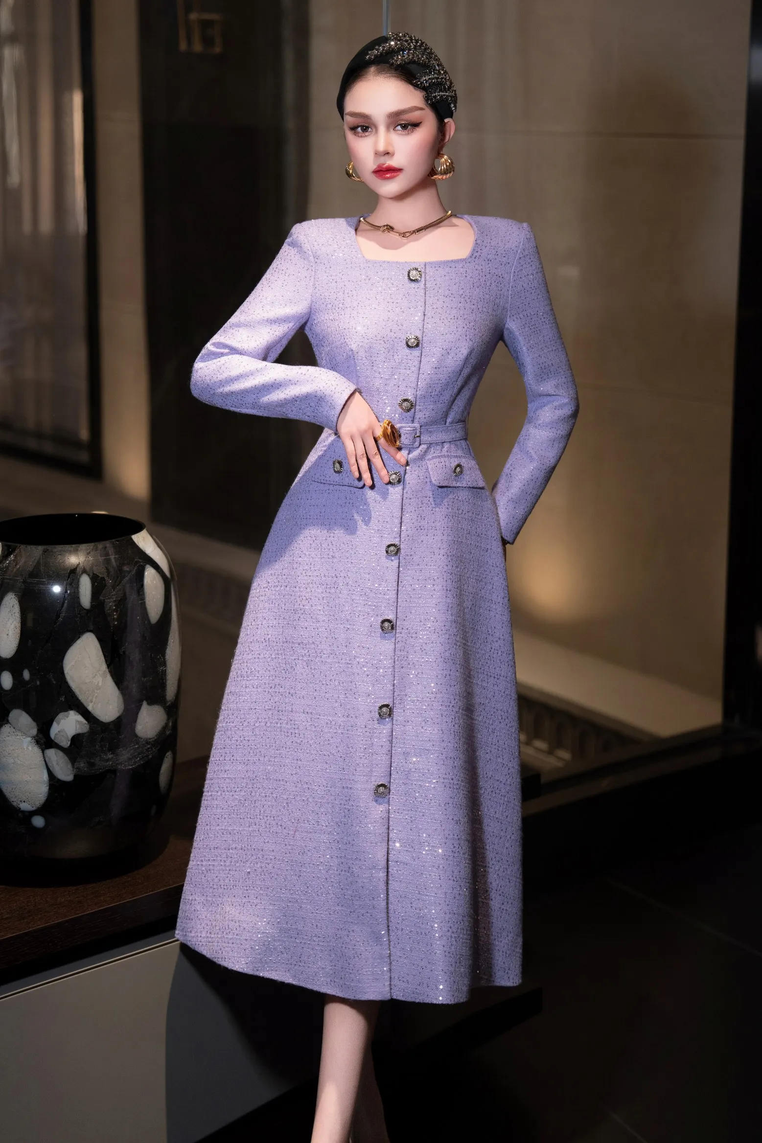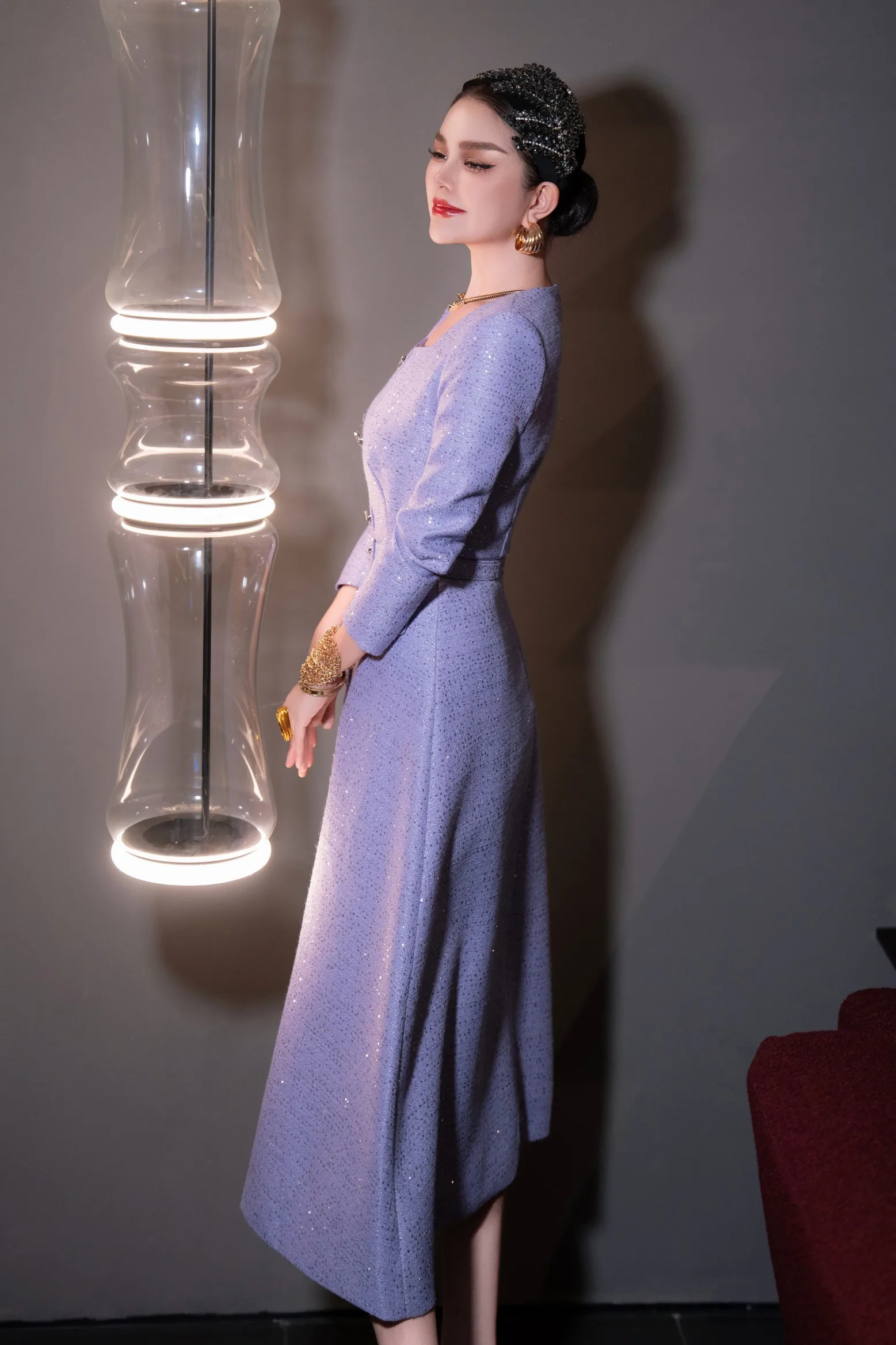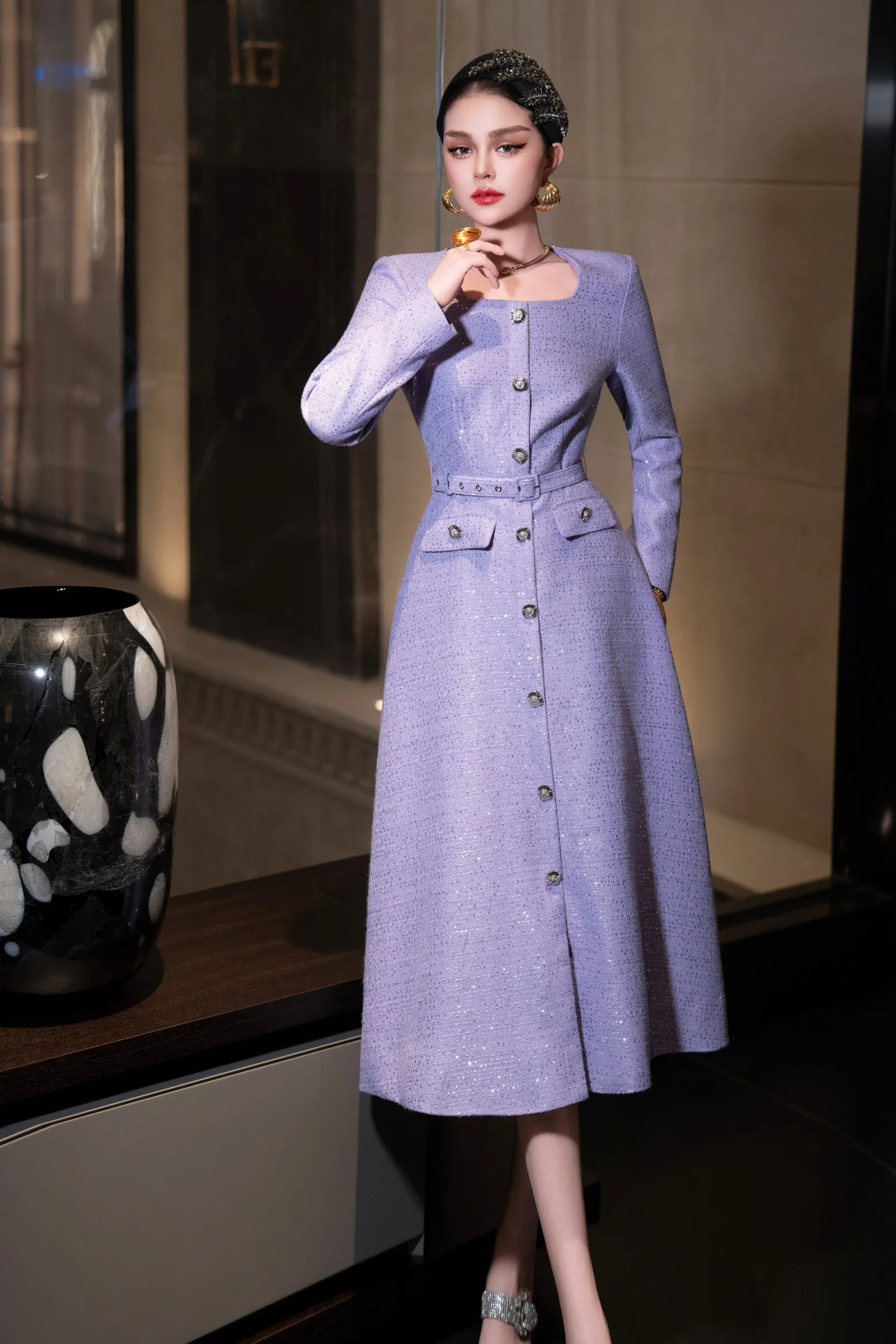 ZJYT Autumn Winter Long Sleeve Sequined Tweed Dresses for Women Elegant Square Collar Midi Red Party Dress Ladies Vestidos 2025