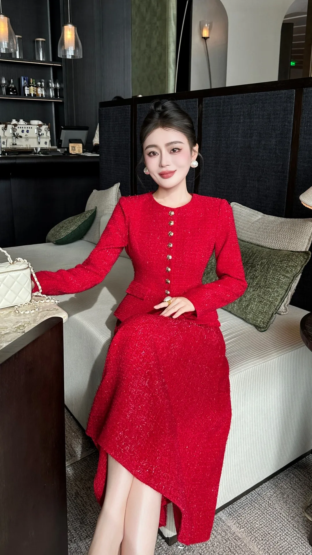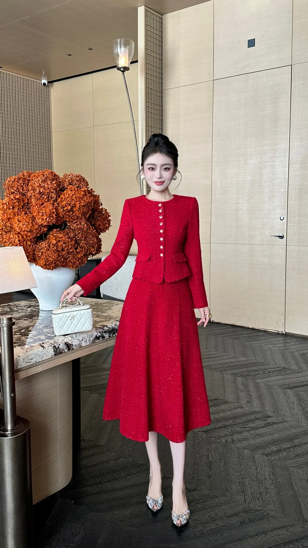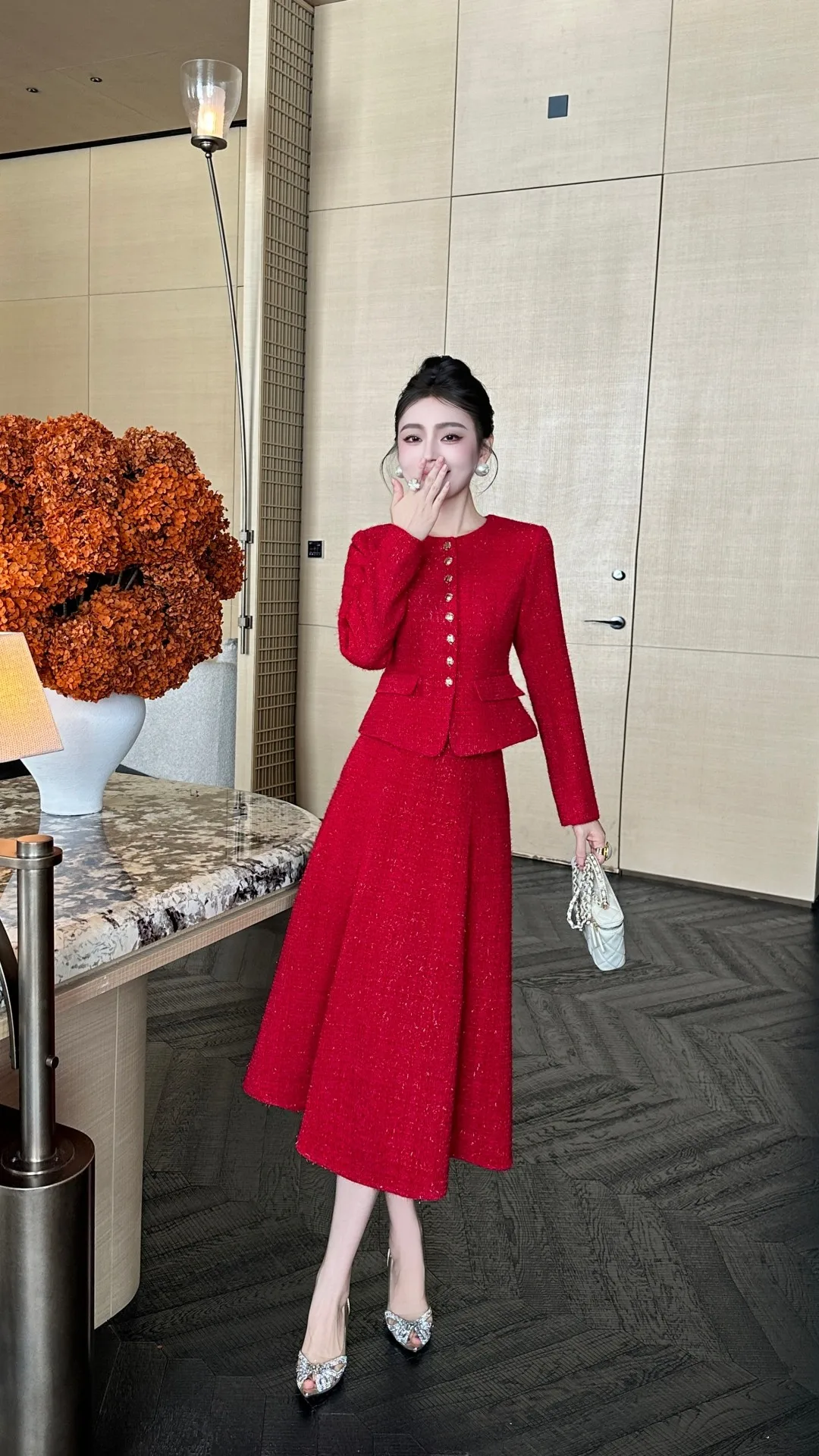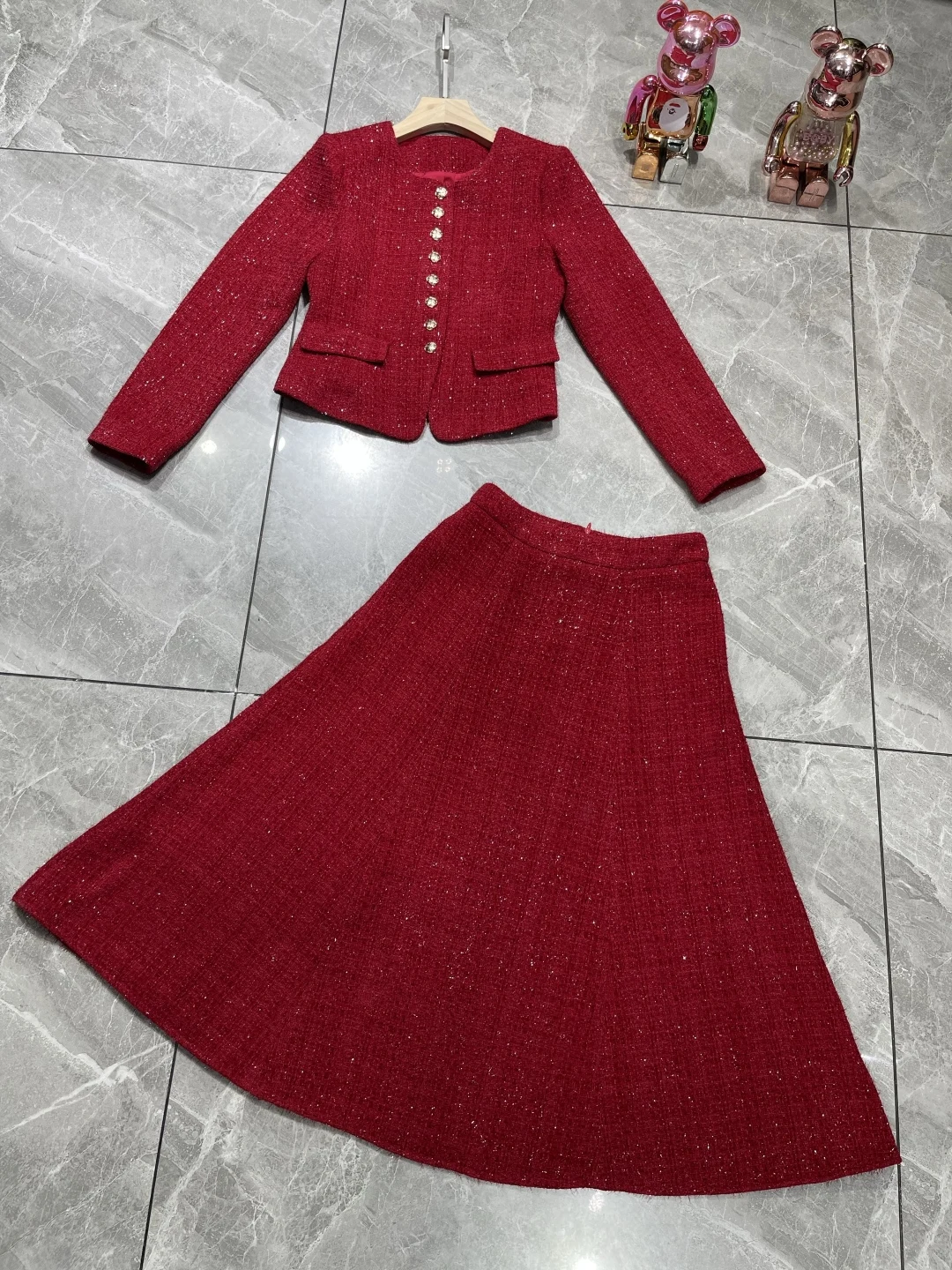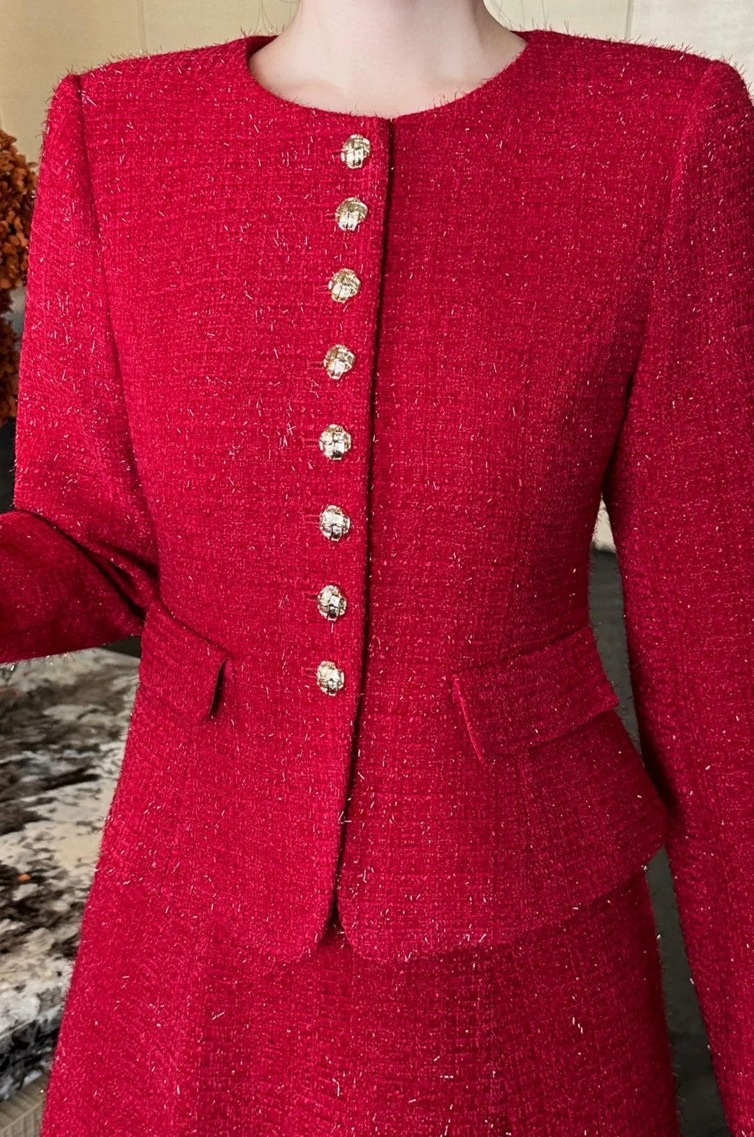 ZJYT Autumn Winter New Women Tweed Woolen Jacket and Skirt Suit 2 Piece Matching Sets Fashion Long Sleeve Red Black Party Outfit