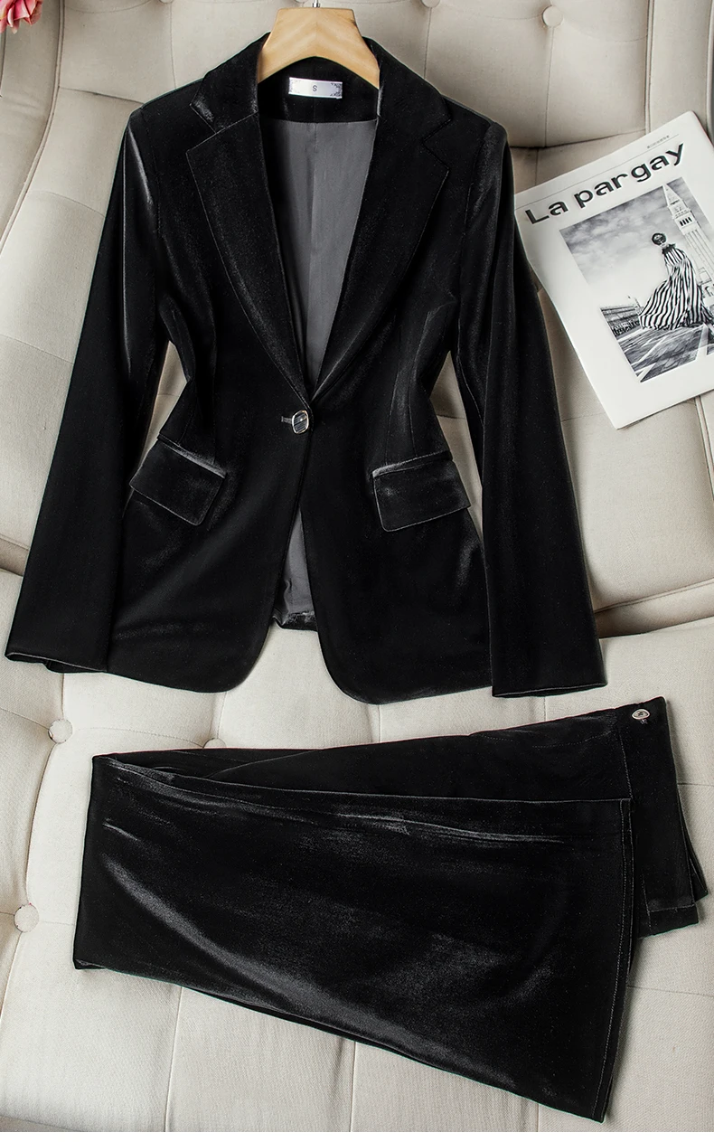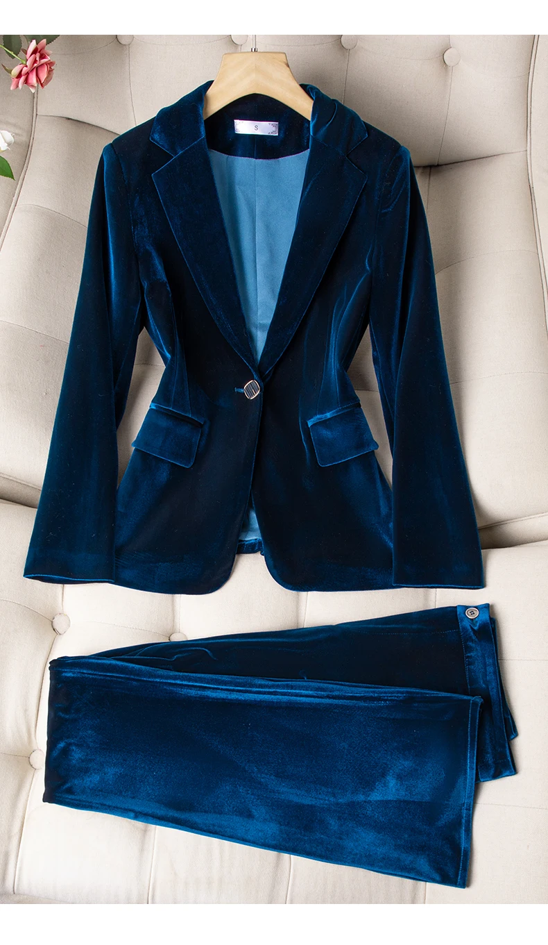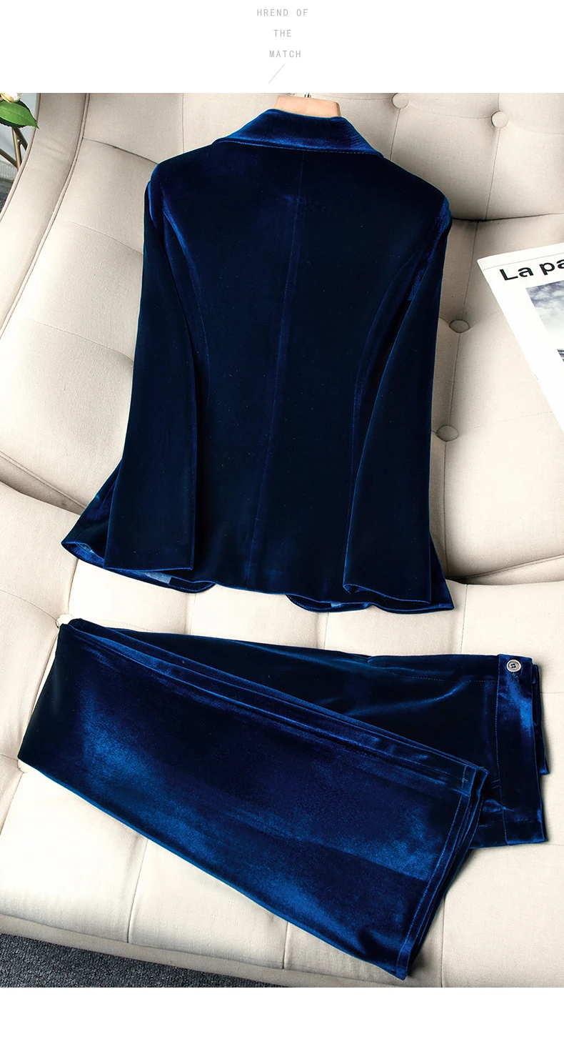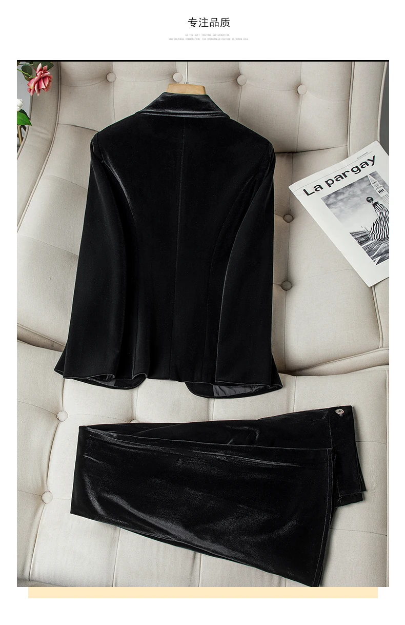 ZJYT Autumn Winter Velvet Jacket Pant Sets Two Pieces Womens Outfit Elegant Ladies One Button Blazer Suit Trousers Office Work