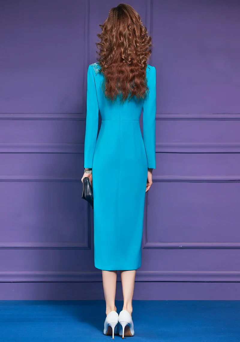 ZJYT Autumn Winter Women Beading Blazer Pencil Dress for Women Office Work Wear 2025 New Long Sleeve Formal Party Dresses Blue