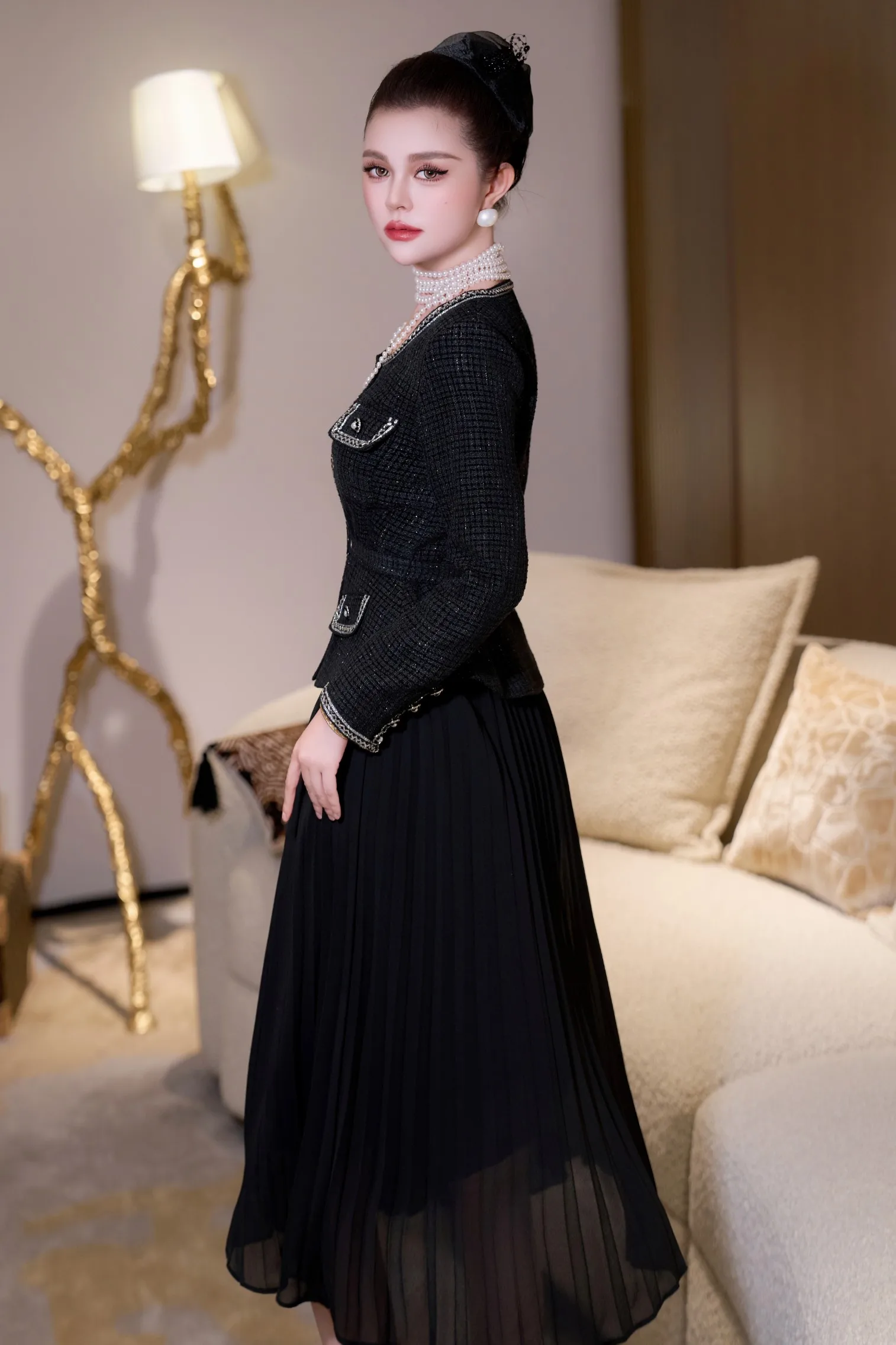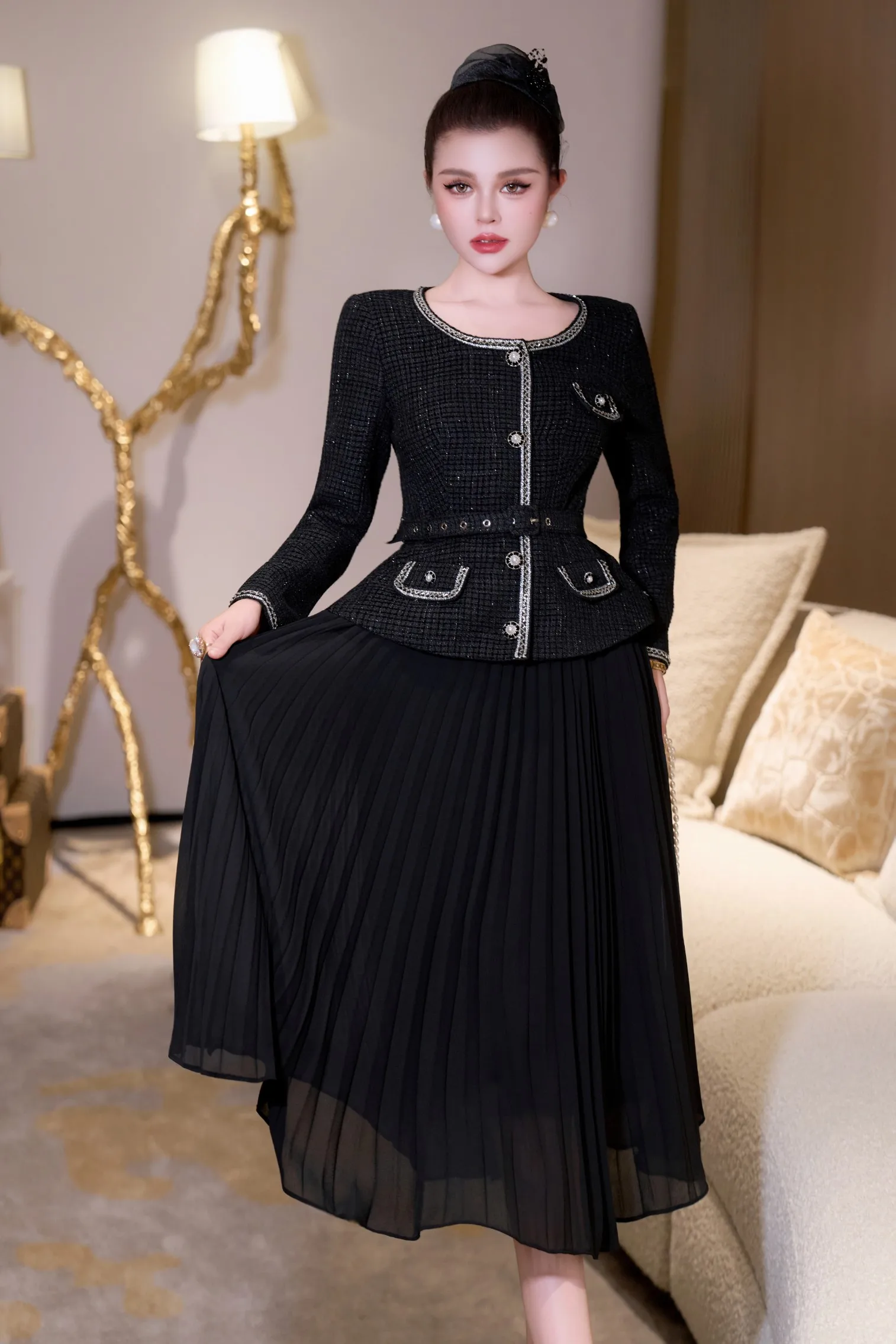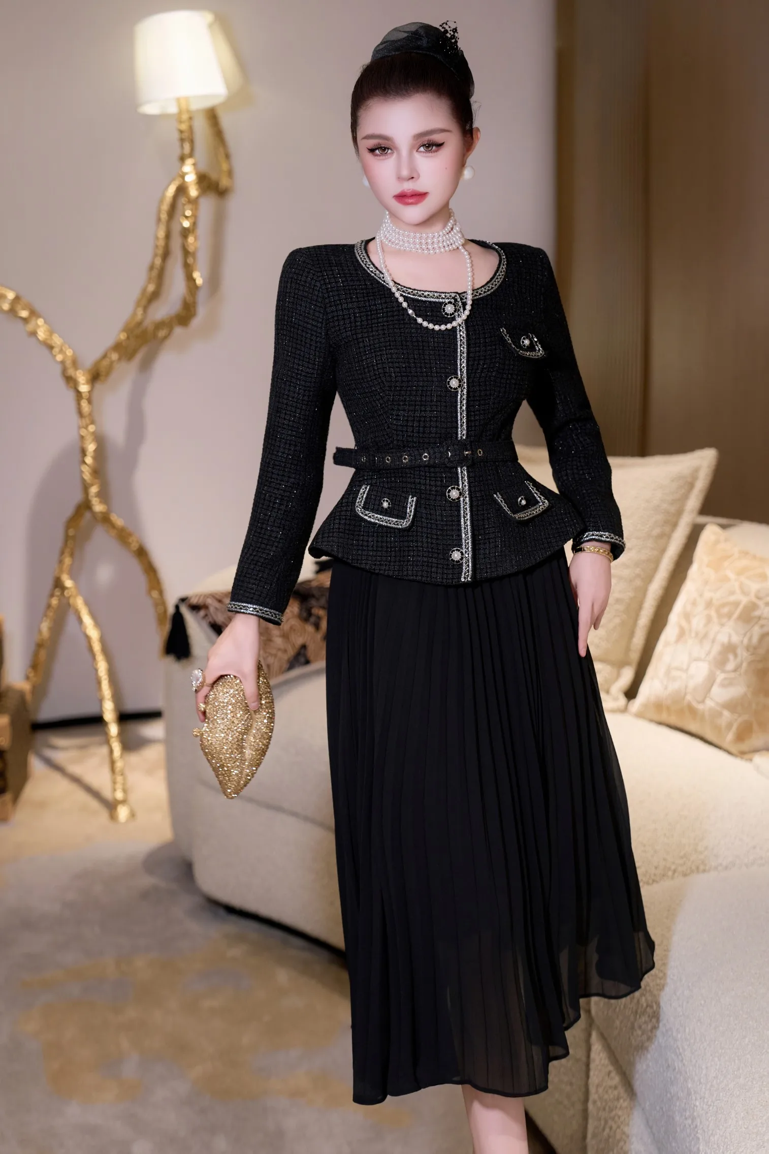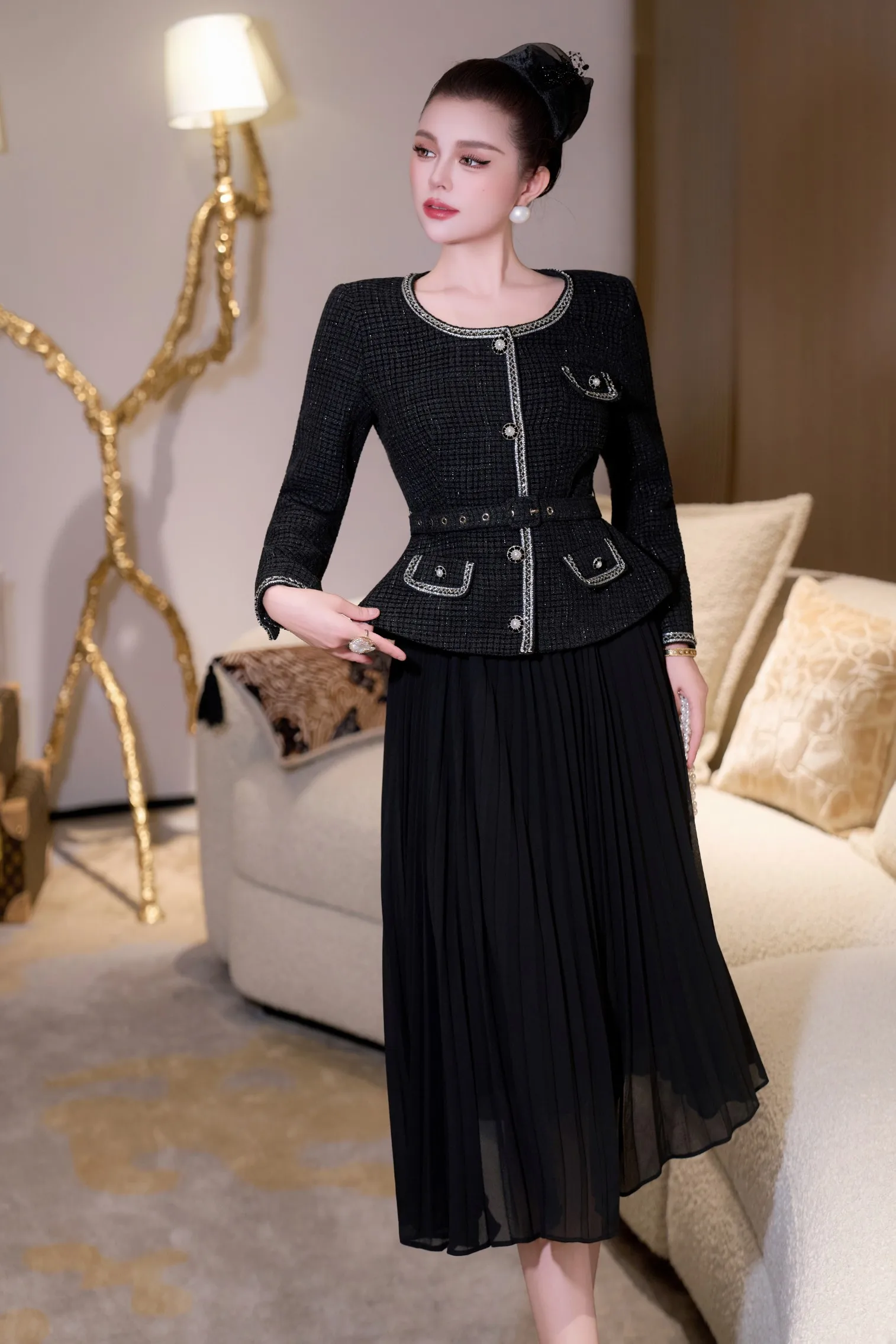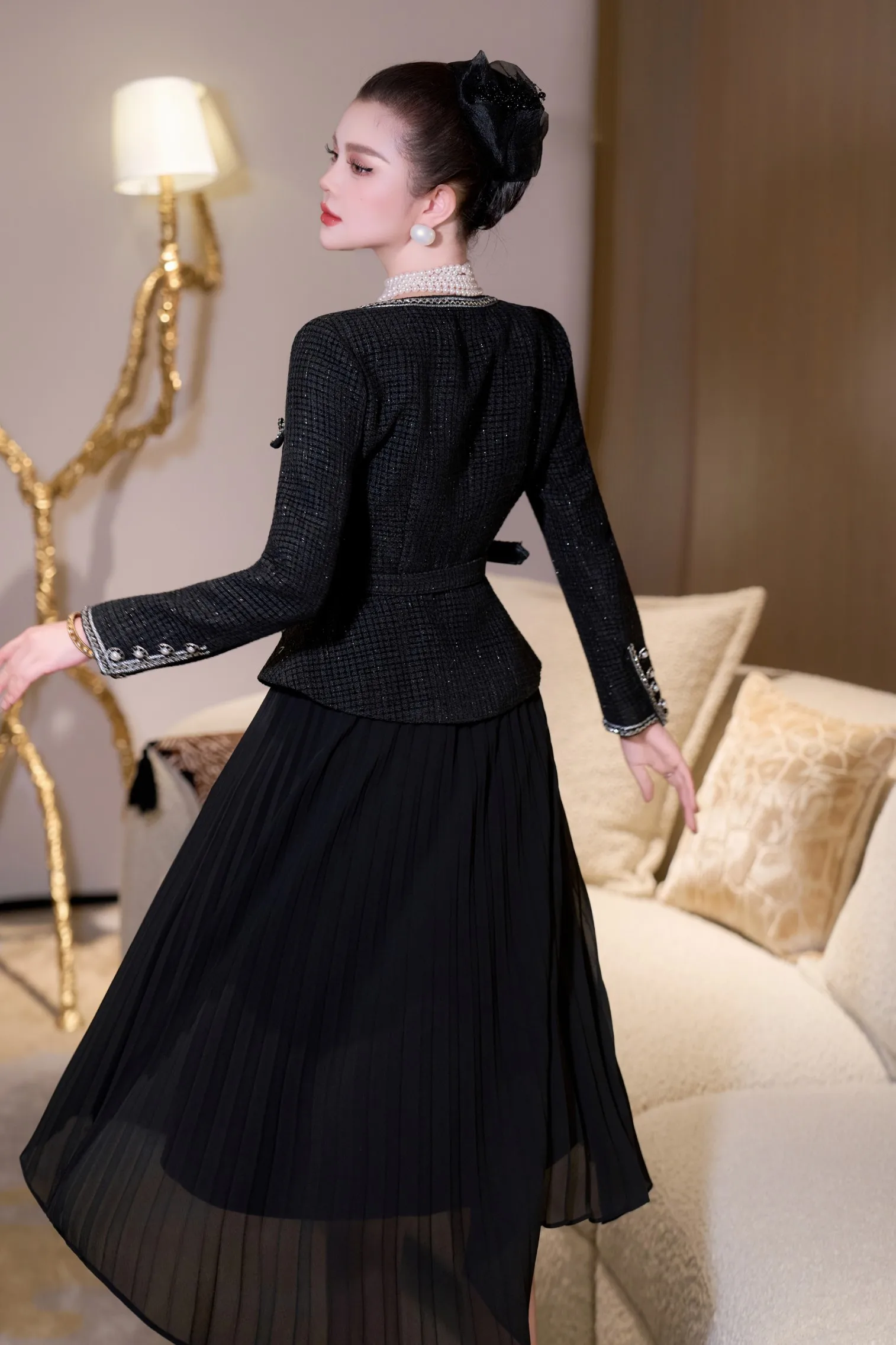 ZJYT Designer Beading Tweed Patchwork Midi Dresses for Women Autumn New 2025 Long Sleeve Pleated Office Party Black Dress Female
