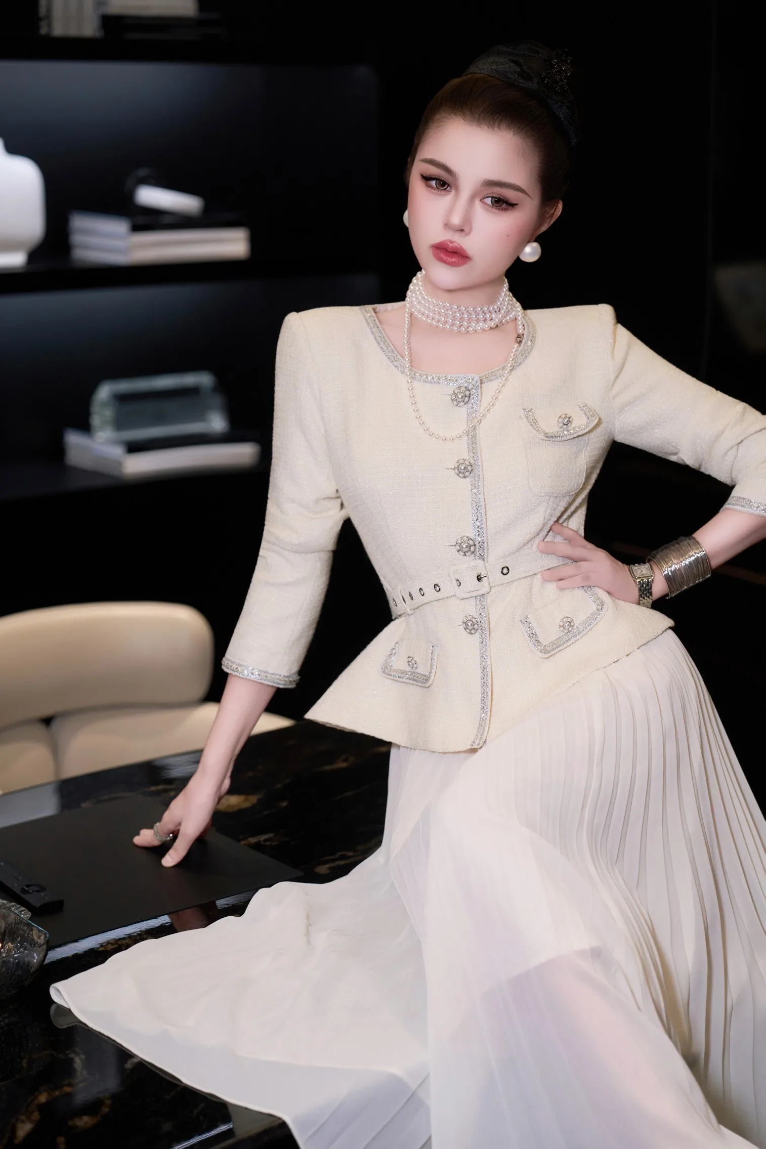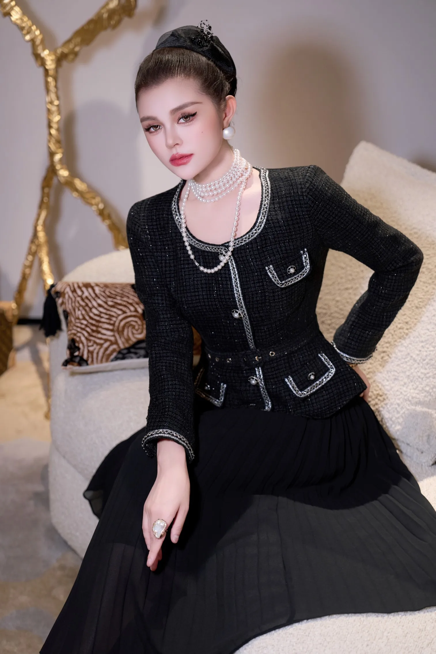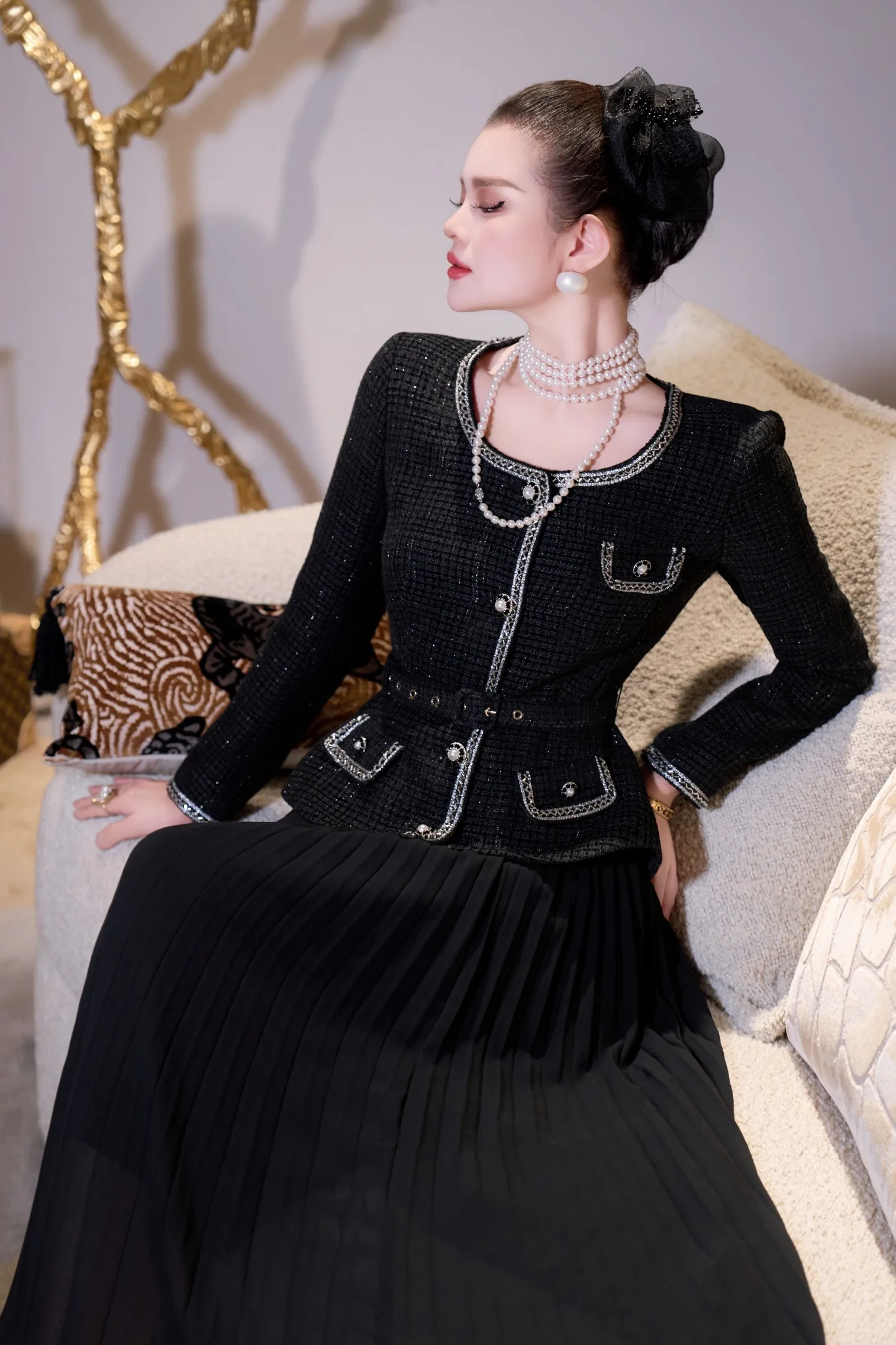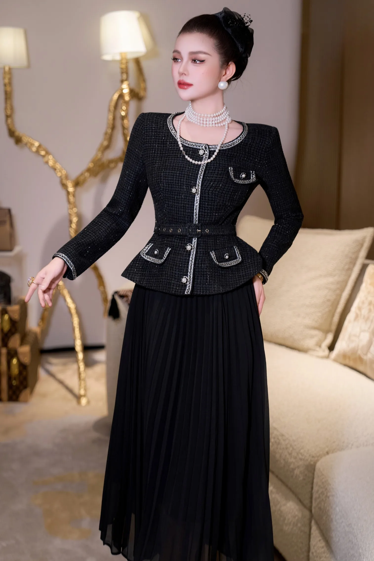 ZJYT Designer Beading Tweed Patchwork Midi Dresses for Women Autumn New 2025 Long Sleeve Pleated Office Party Black Dress Female