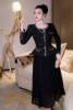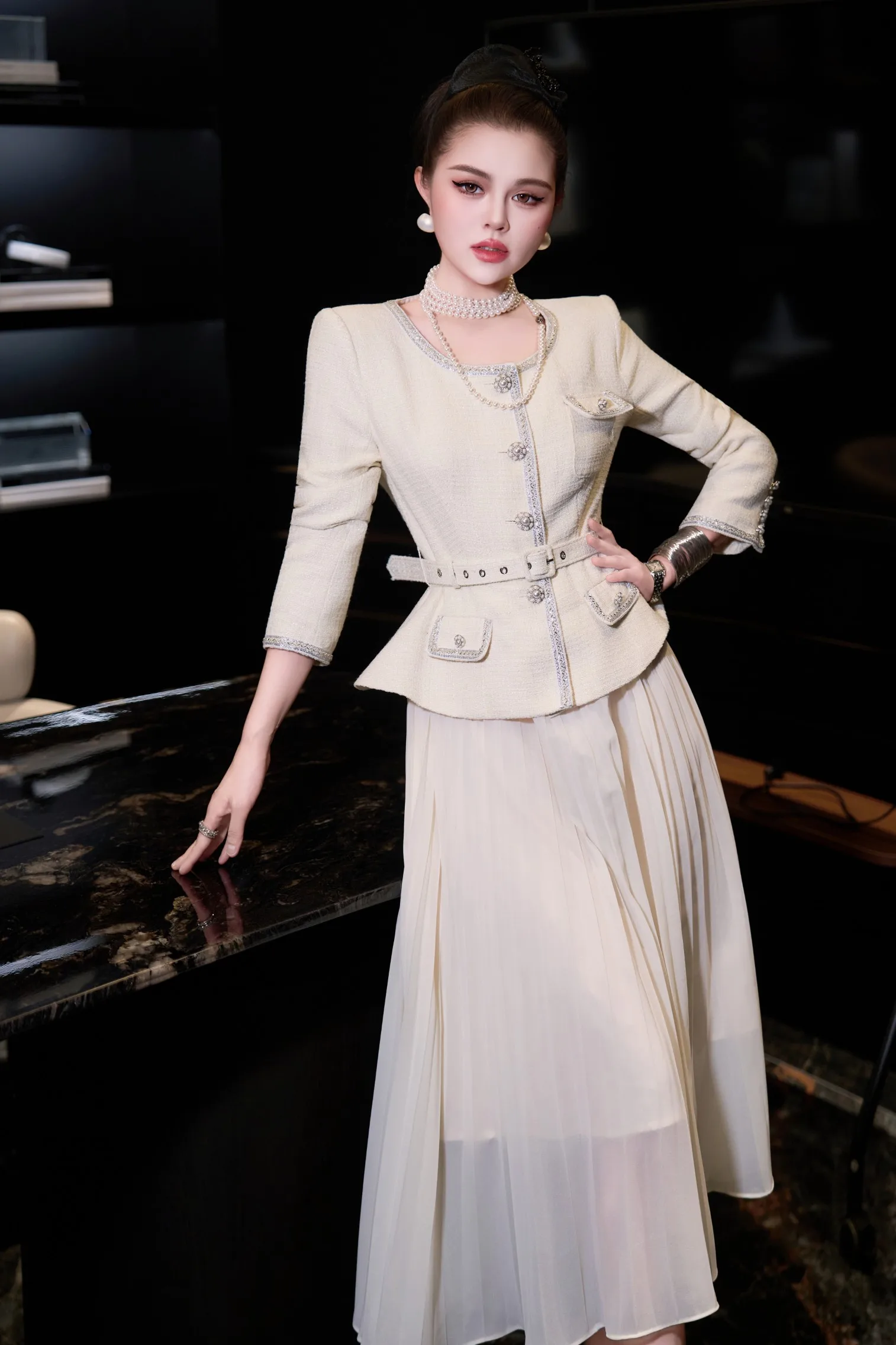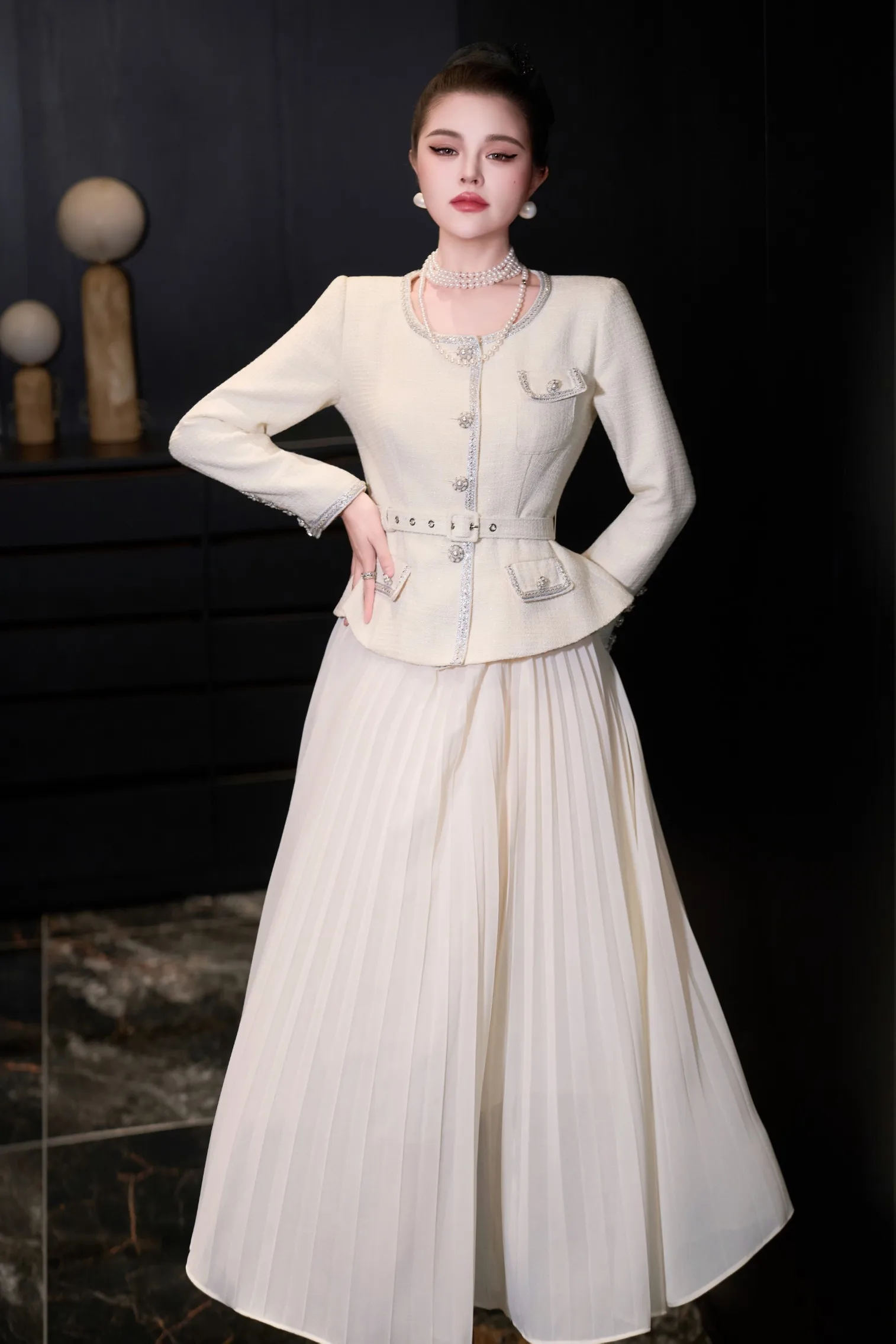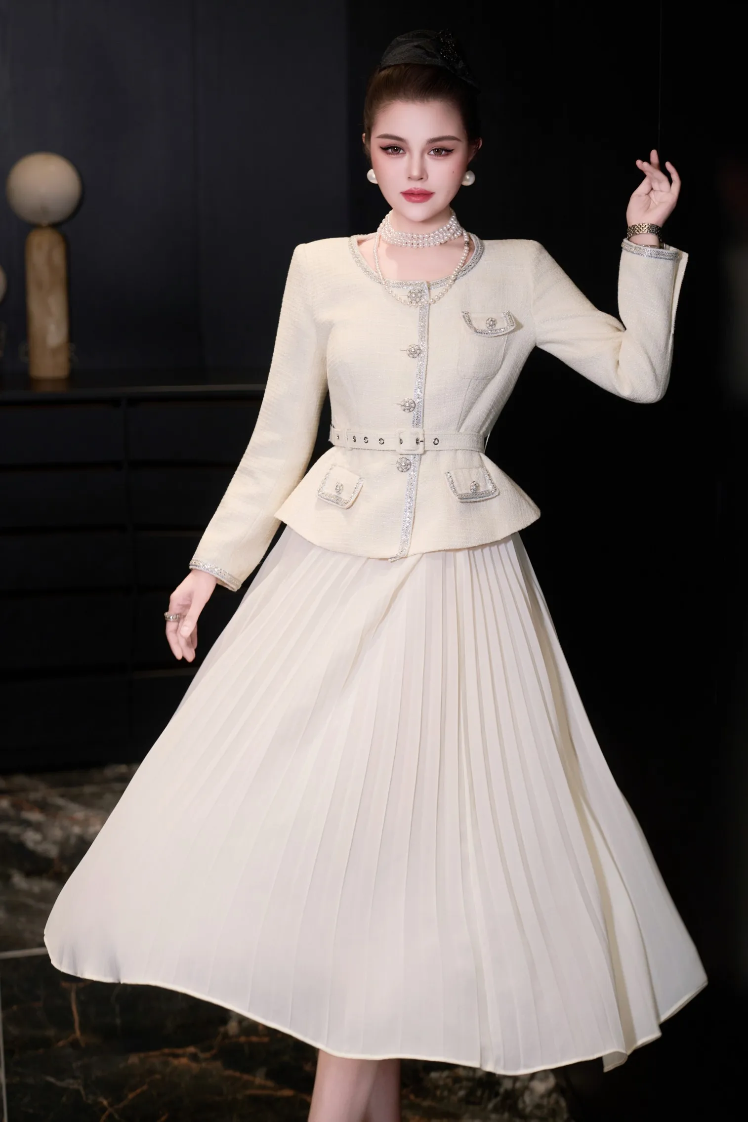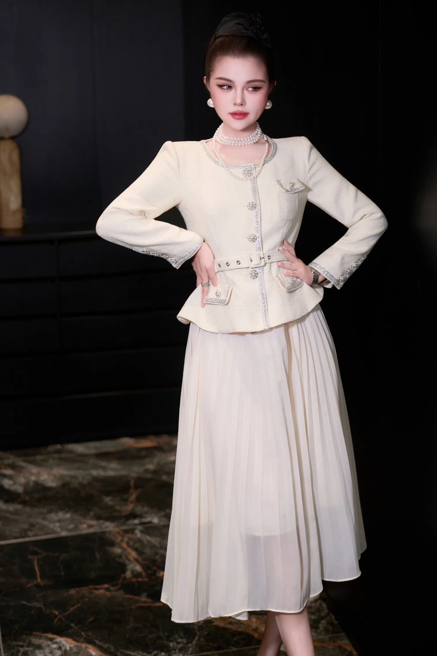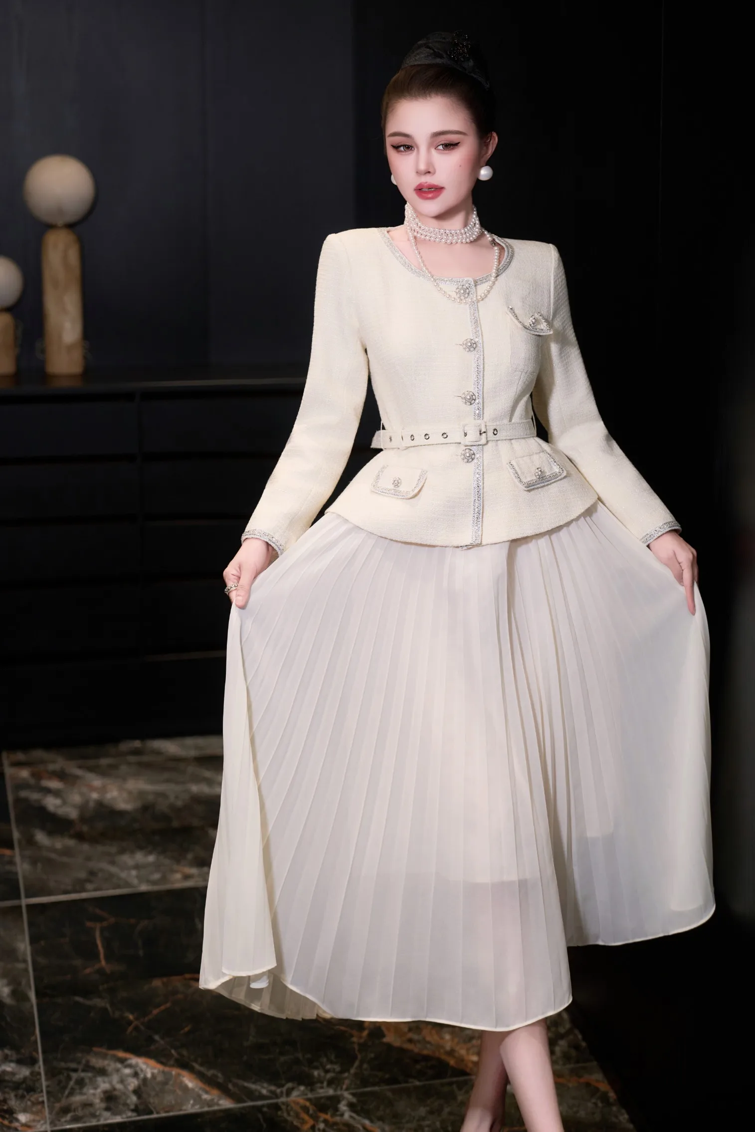 ZJYT Designer Beading Tweed Patchwork Midi Dresses for Women Autumn New 2025 Long Sleeve Pleated Office Party Black Dress Female