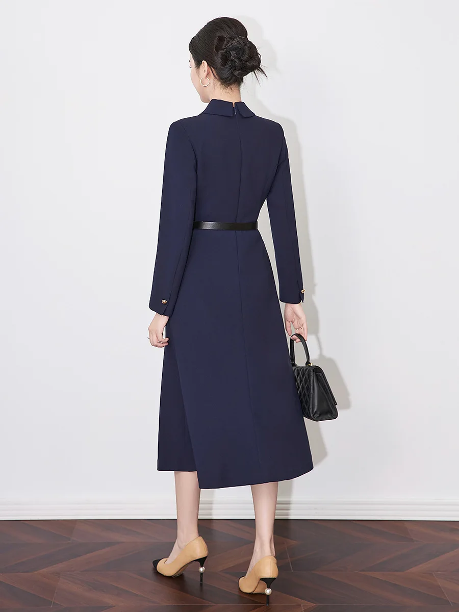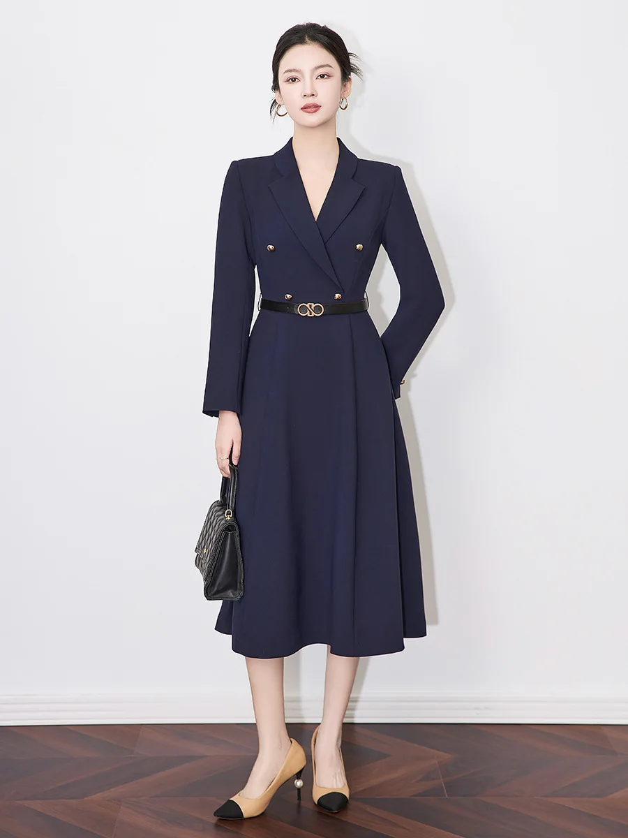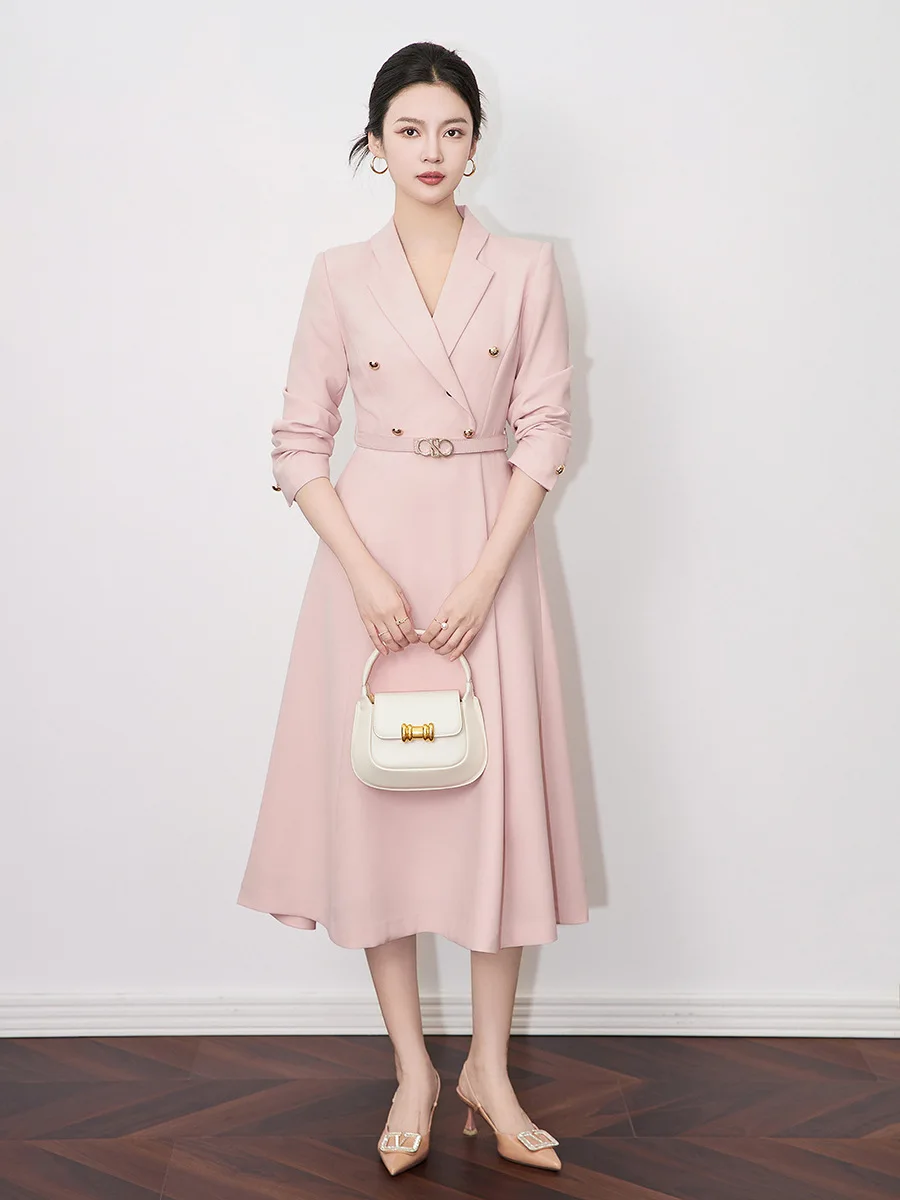 ZJYT Elegant Chic Ladies Spring Office Blazer Dresses Long Sleeve Women Fashion Notched Solid Blue Pink Midi Dress with Belt