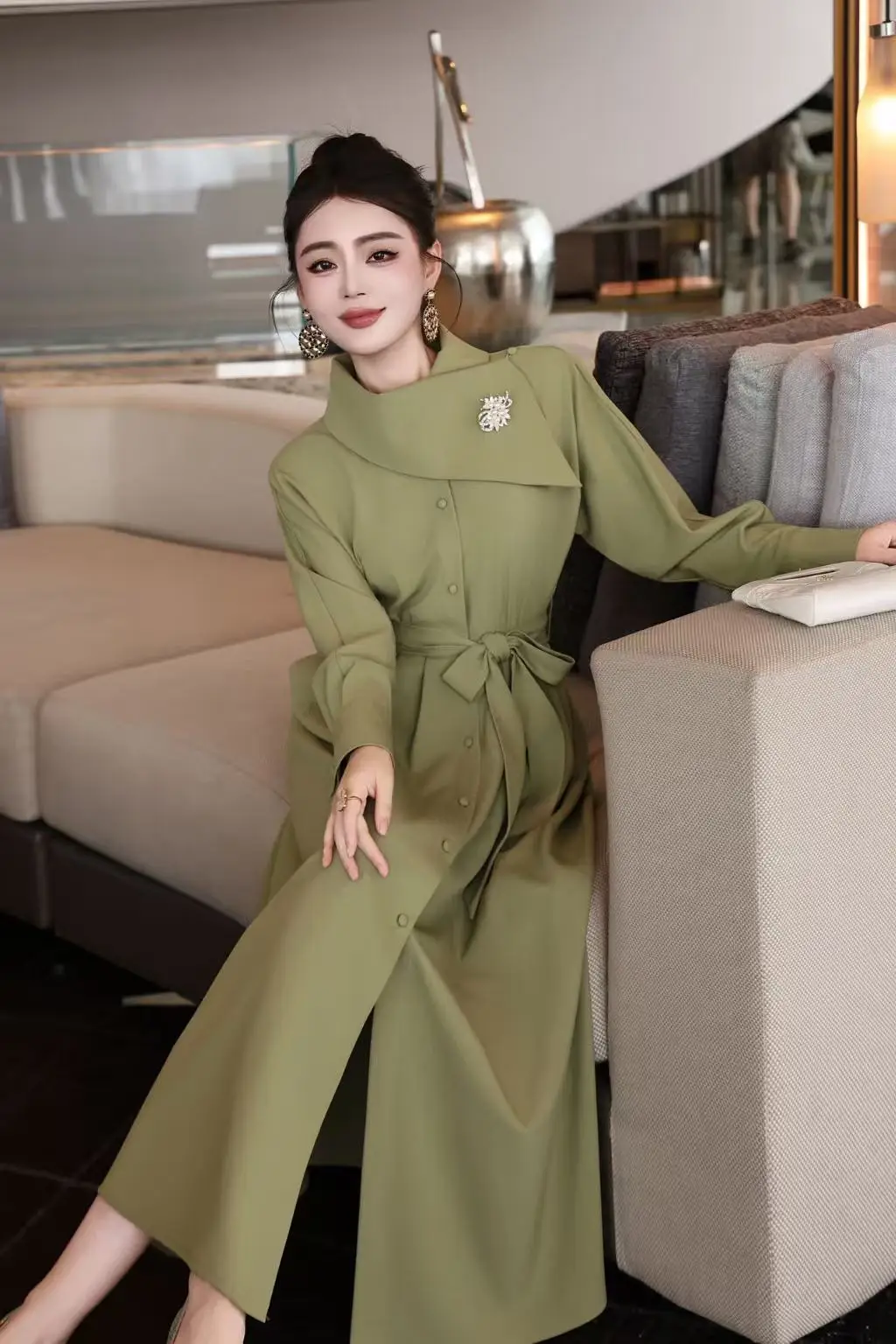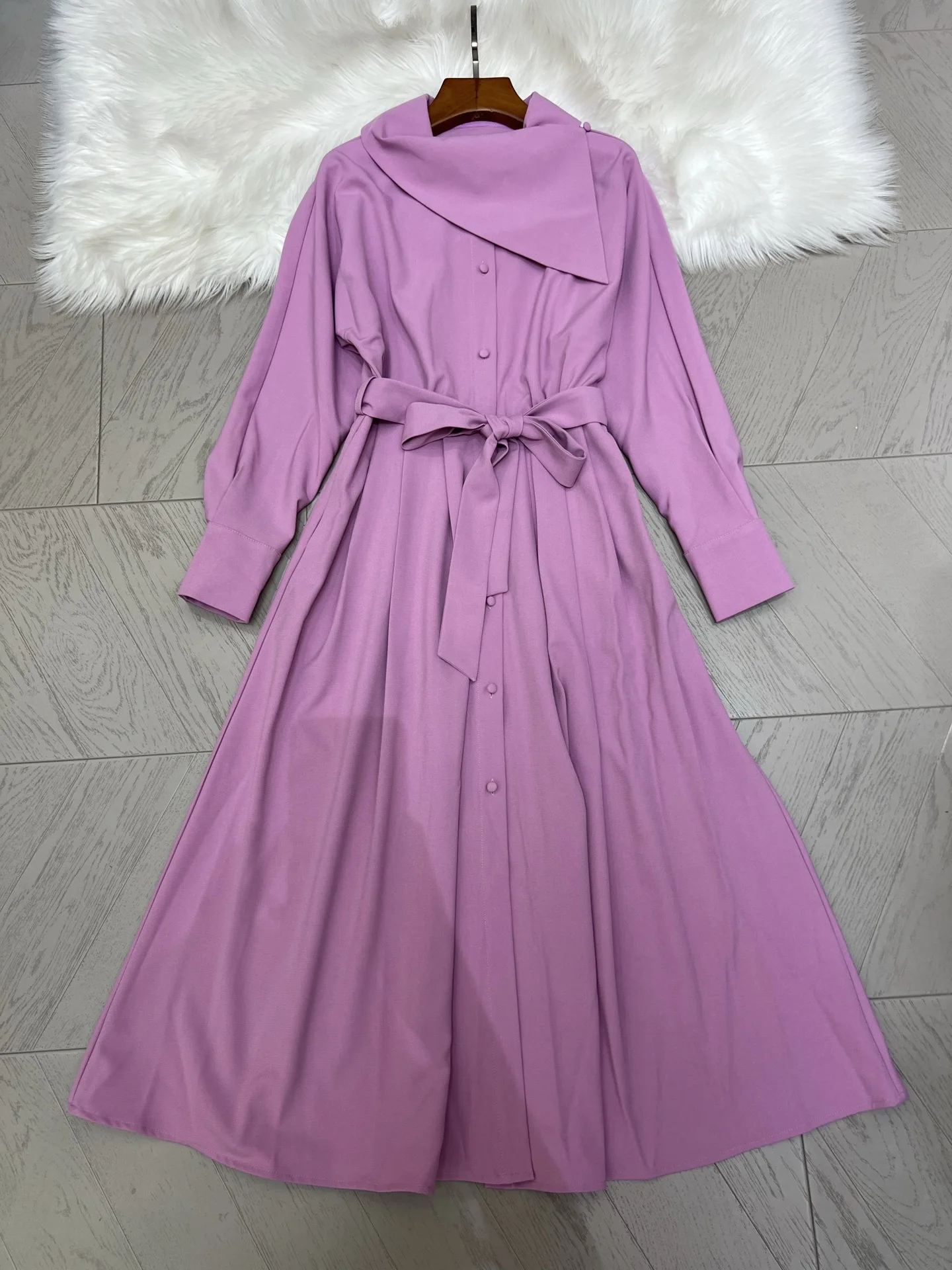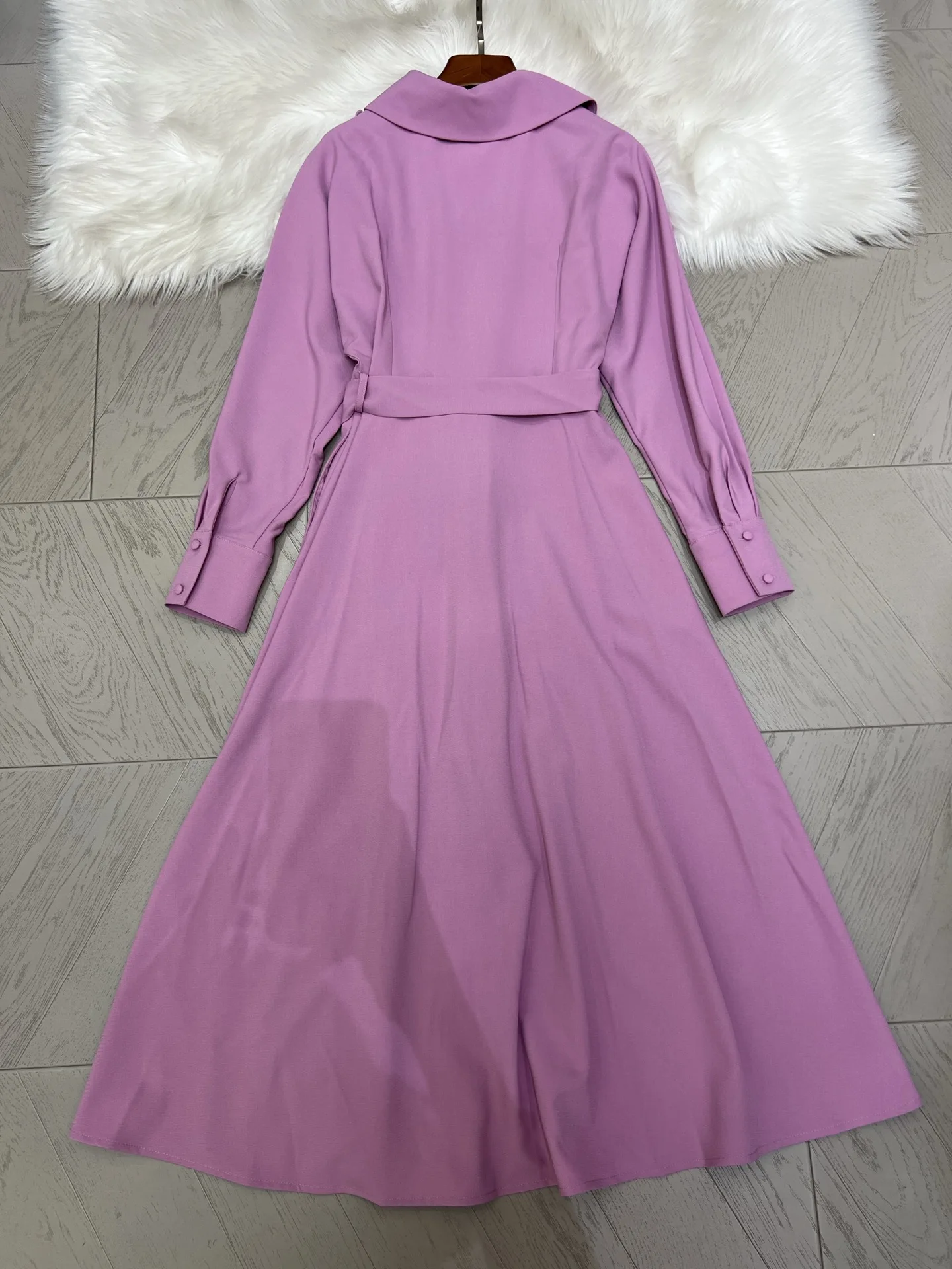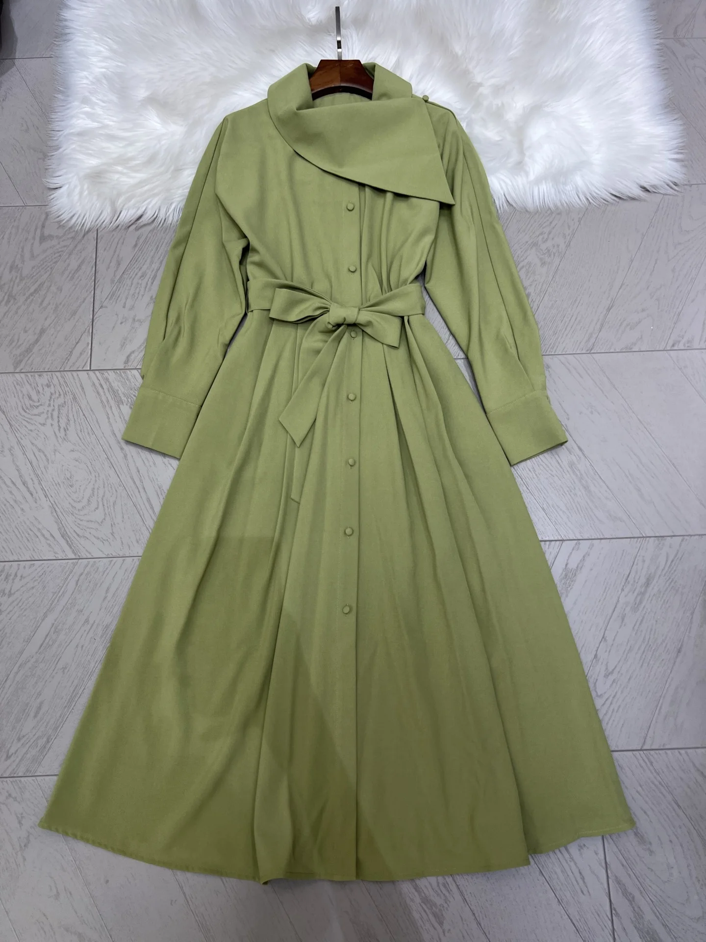 ZJYT Elegant Designer Autumn Midi Dresses for Women 2025 Long Sleeve Lace Up Single Breasted Casual Office Lady Dress Vestidos