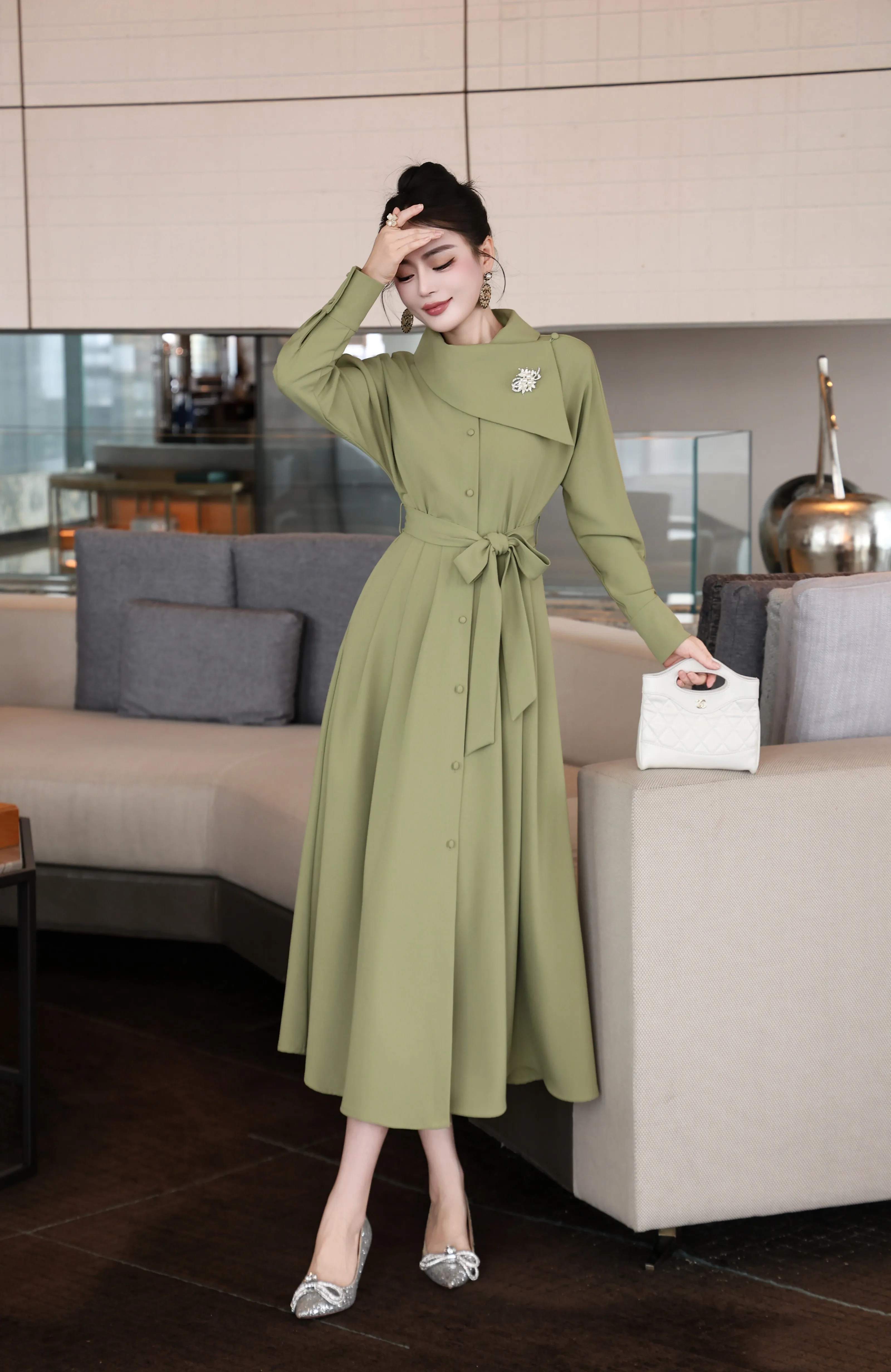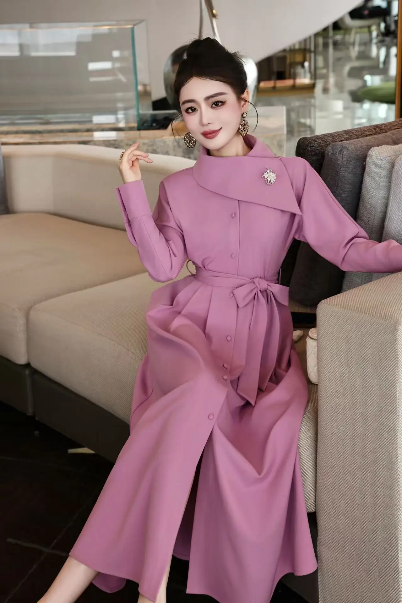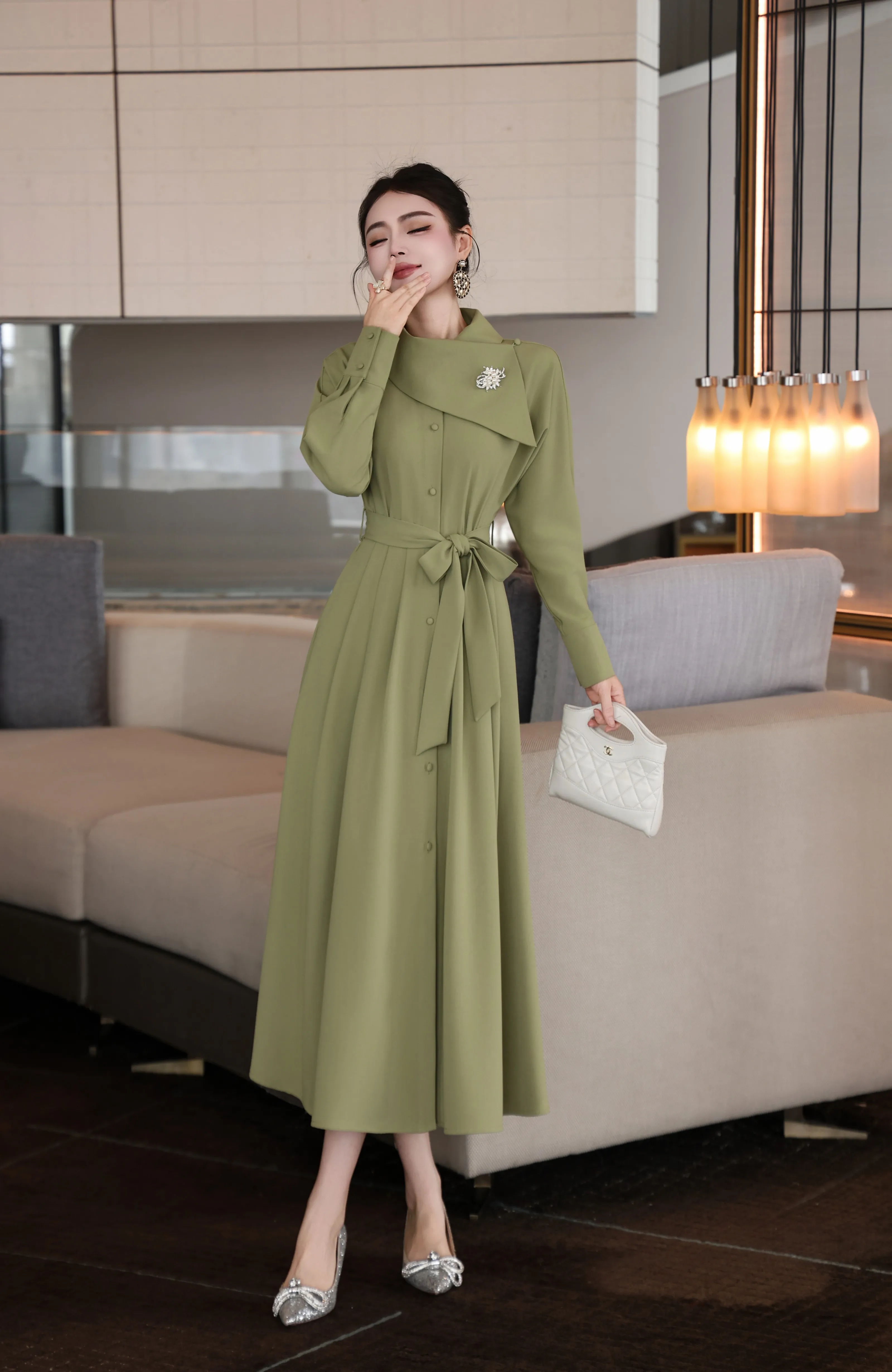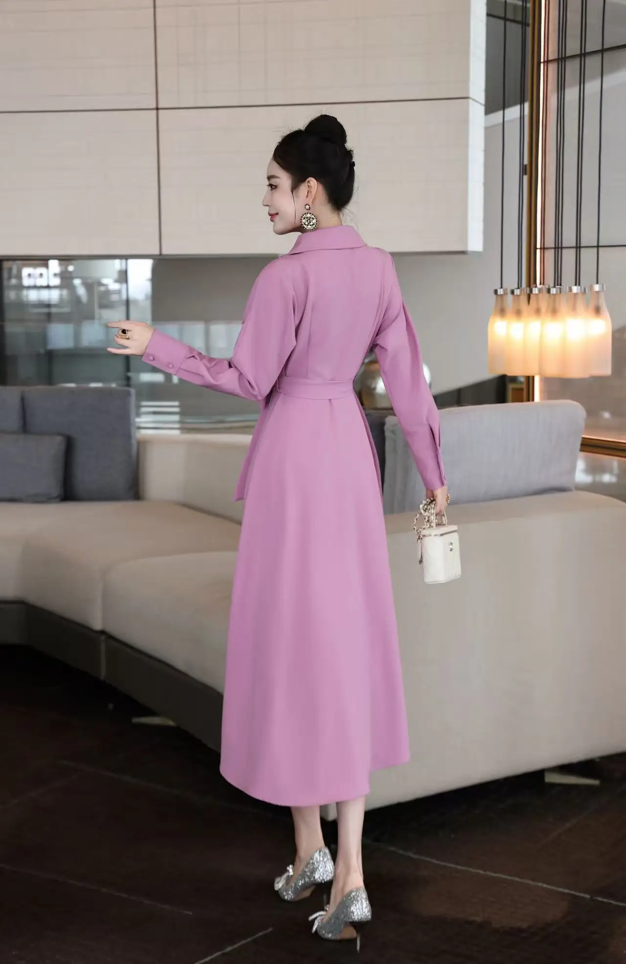 ZJYT Elegant Designer Autumn Midi Dresses for Women 2025 Long Sleeve Lace Up Single Breasted Casual Office Lady Dress Vestidos