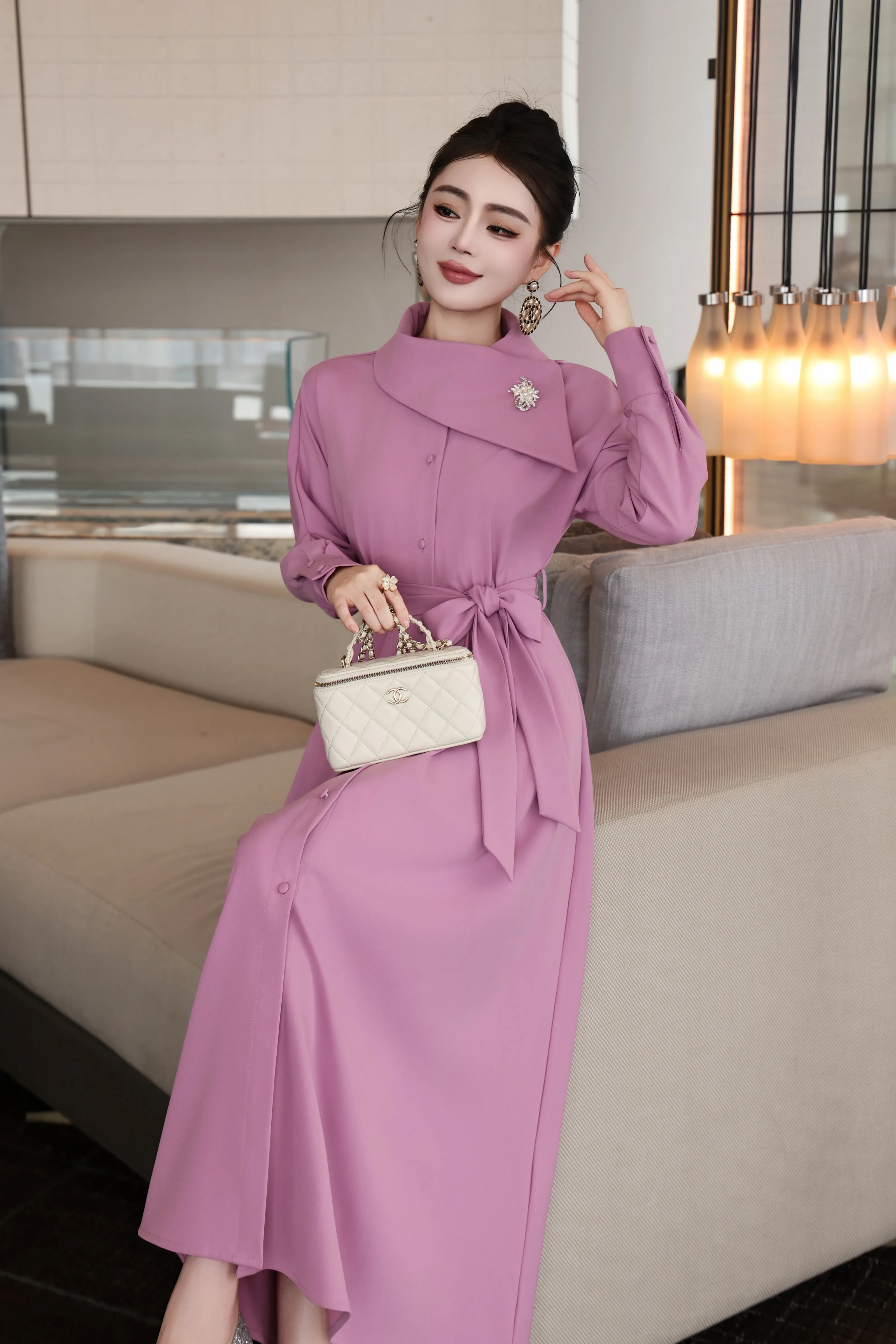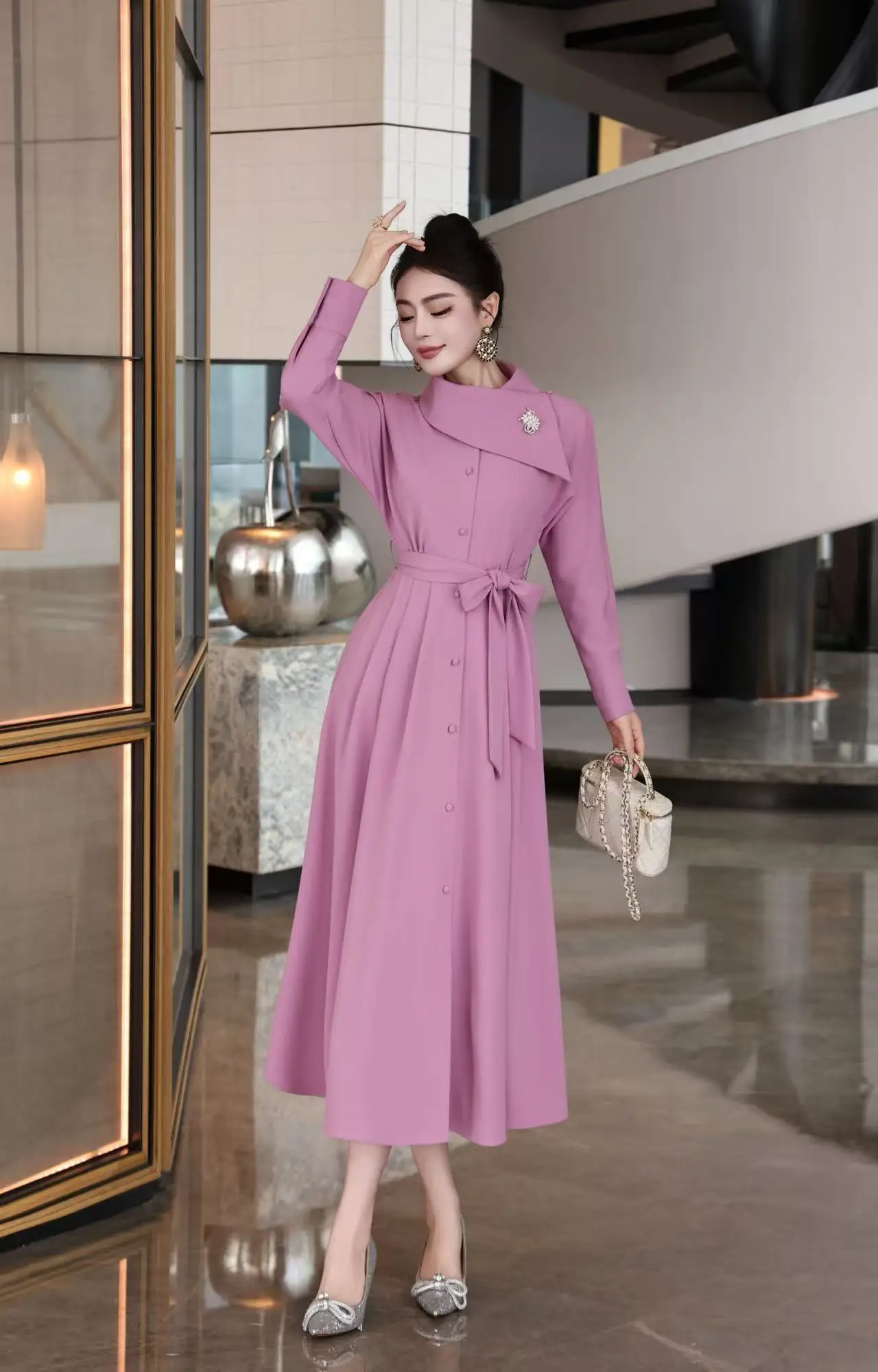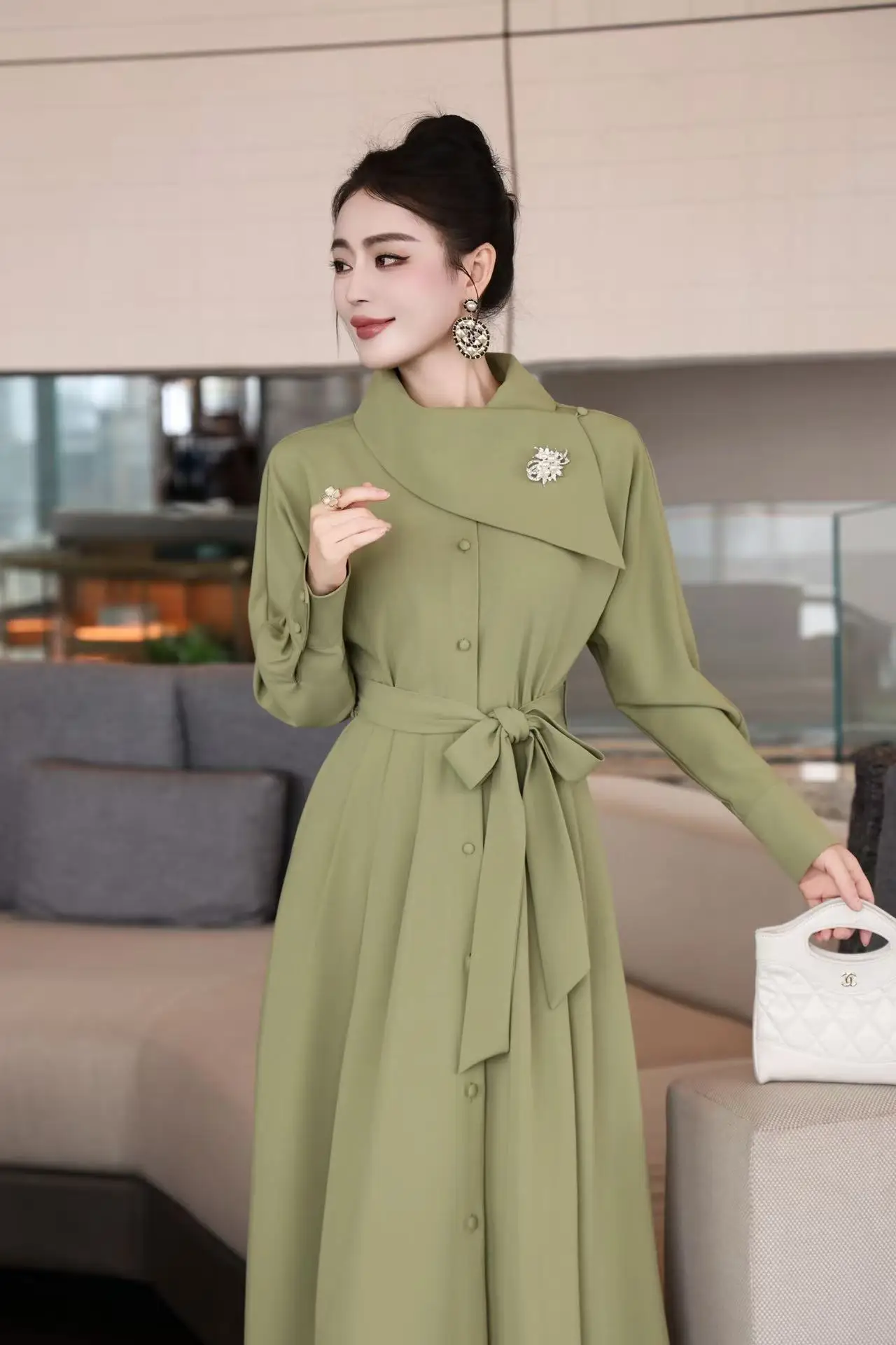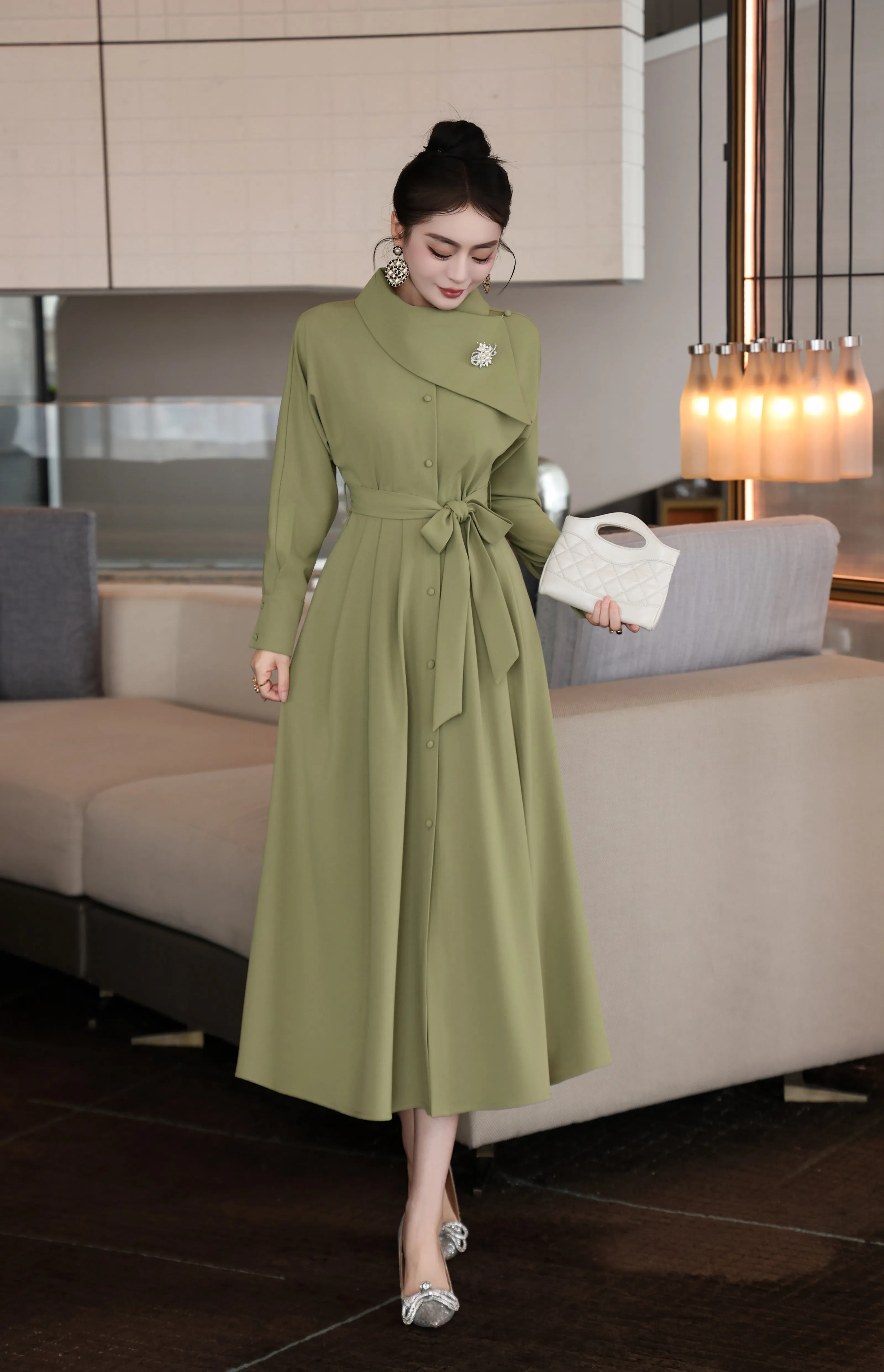 ZJYT Elegant Designer Autumn Midi Dresses for Women 2025 Long Sleeve Lace Up Single Breasted Casual Office Lady Dress Vestidos