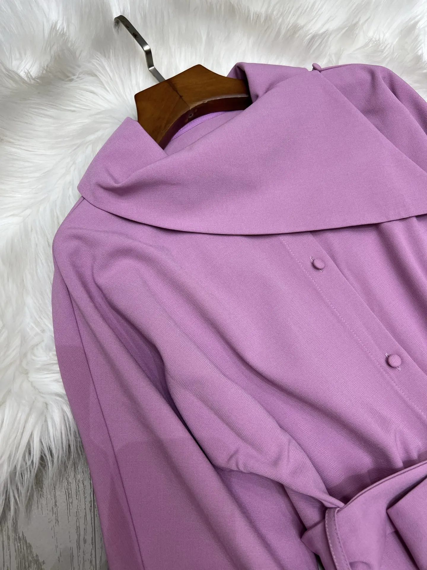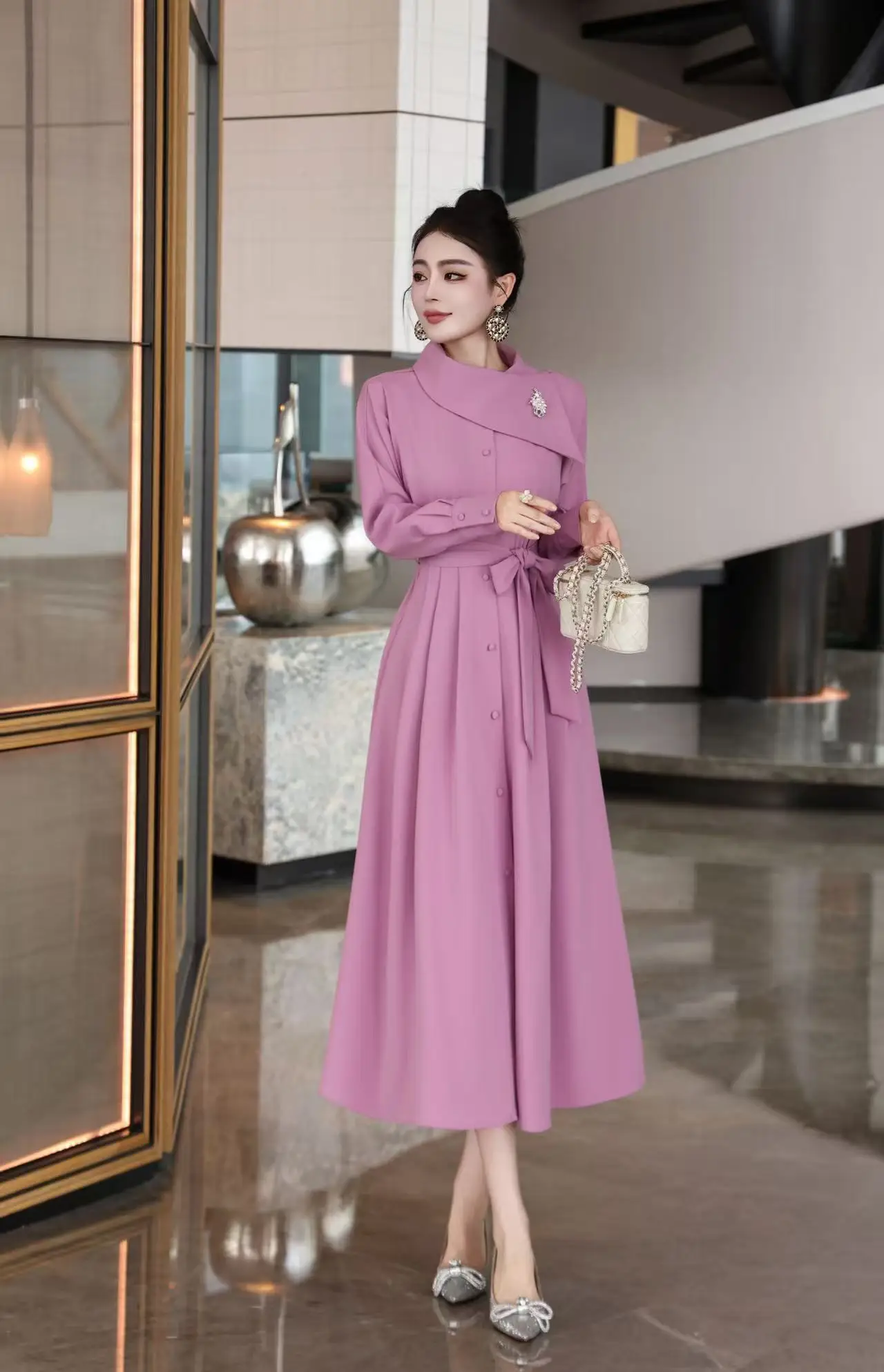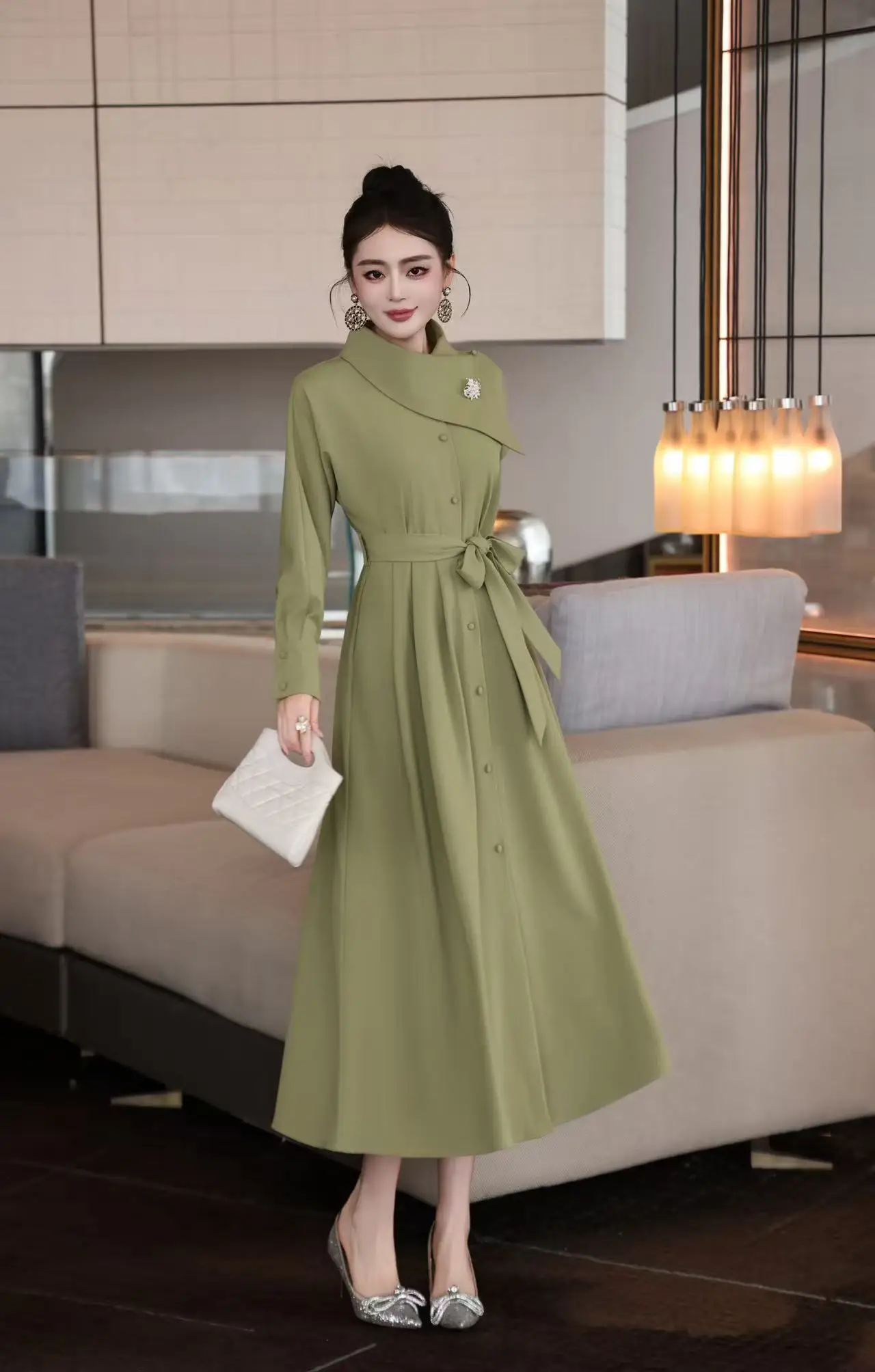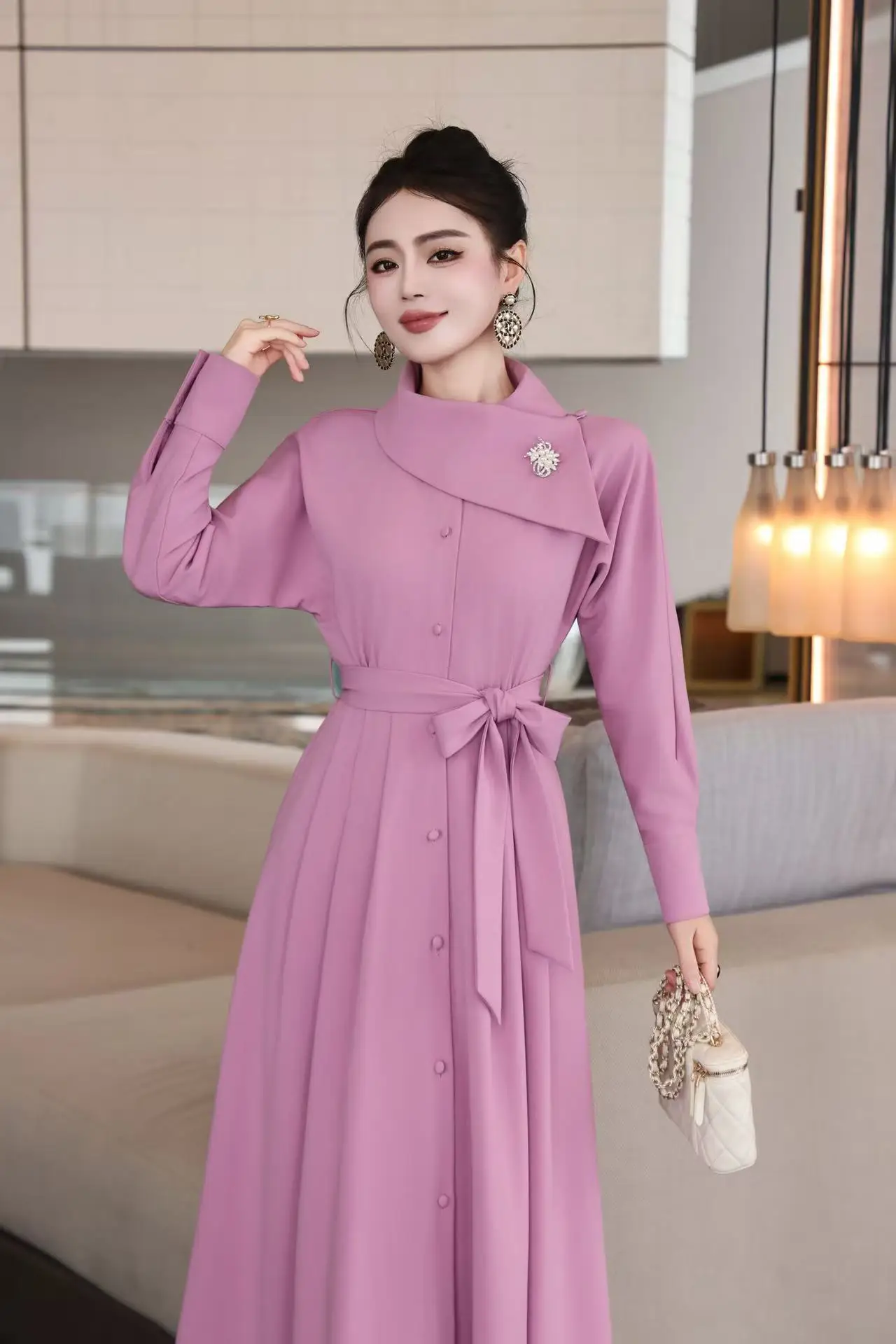 ZJYT Elegant Designer Autumn Midi Dresses for Women 2025 Long Sleeve Lace Up Single Breasted Casual Office Lady Dress Vestidos