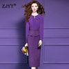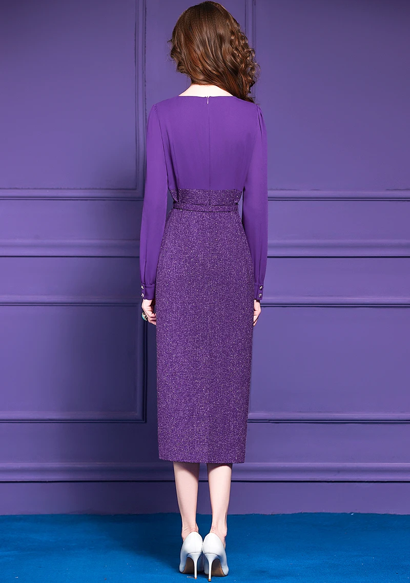 ZJYT Elegant Designer Purple Patchwork One Piece Tweed Woolen Dress Women Autumn New Fashion Long Sleeve Midi Office Party Dress
