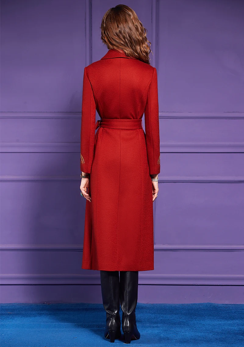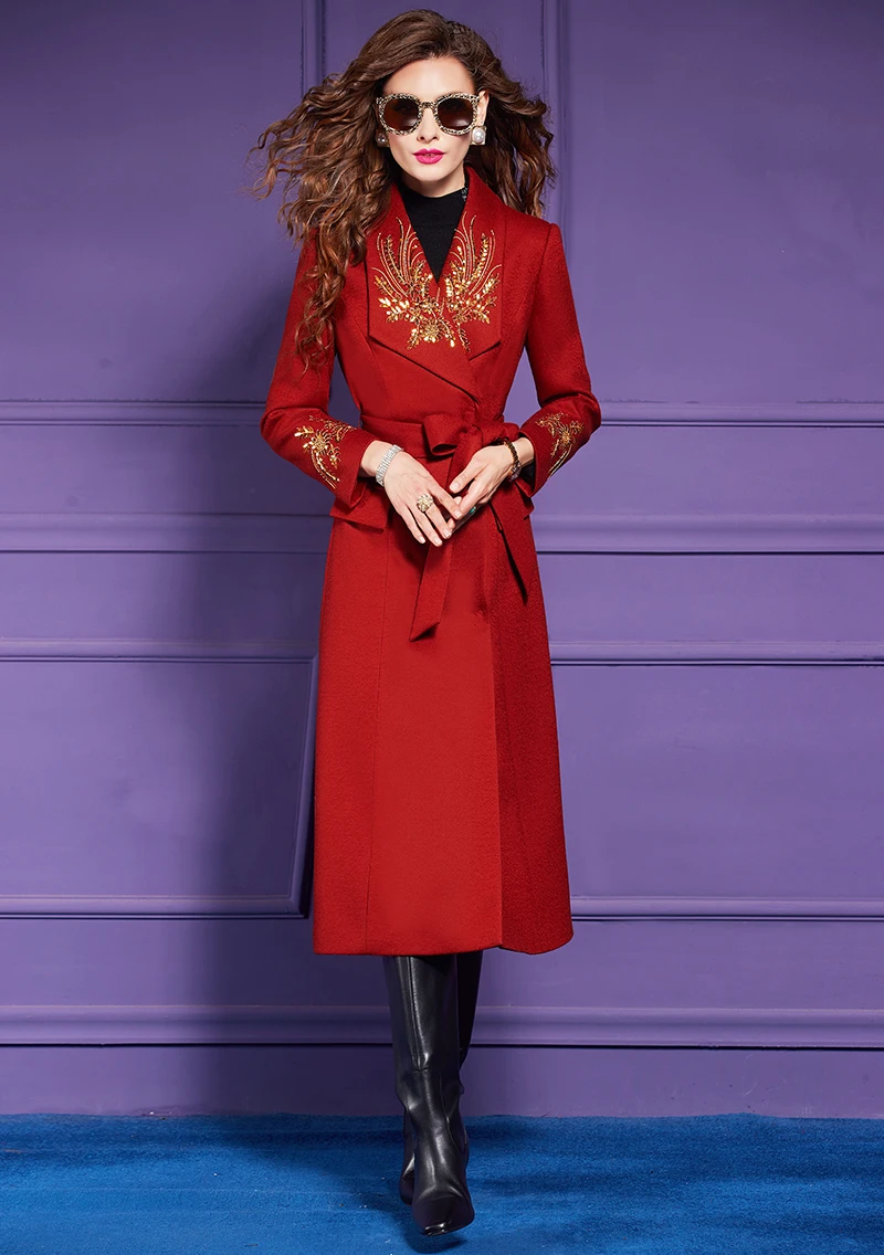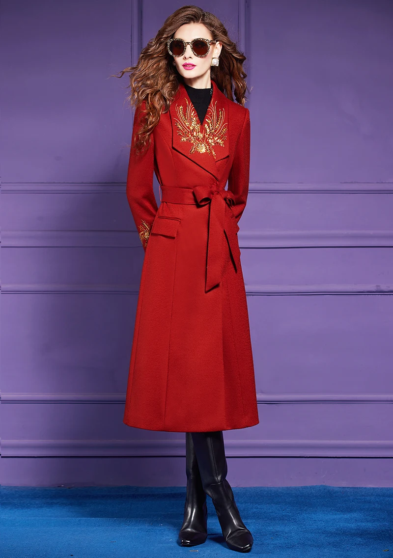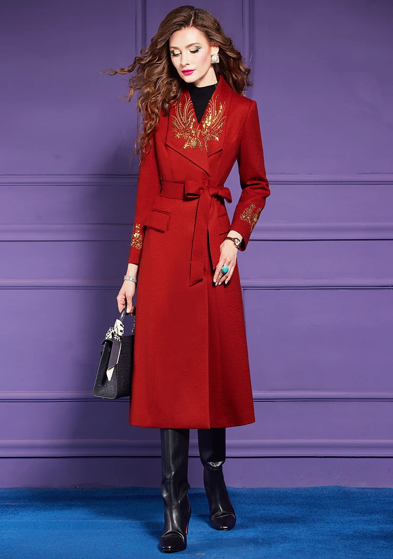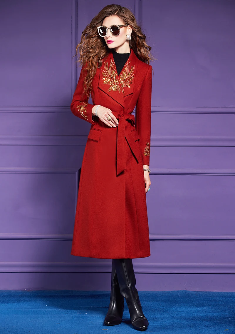 ZJYT Elegant Embroidery Long Tweed Woolen Jacket Women Autumn Winter Wool Blends Coats 2024 Red Overcoat Thick Outerwears Female