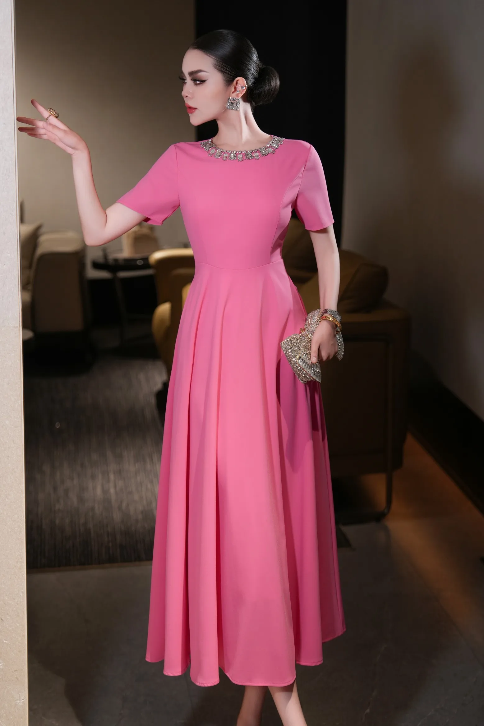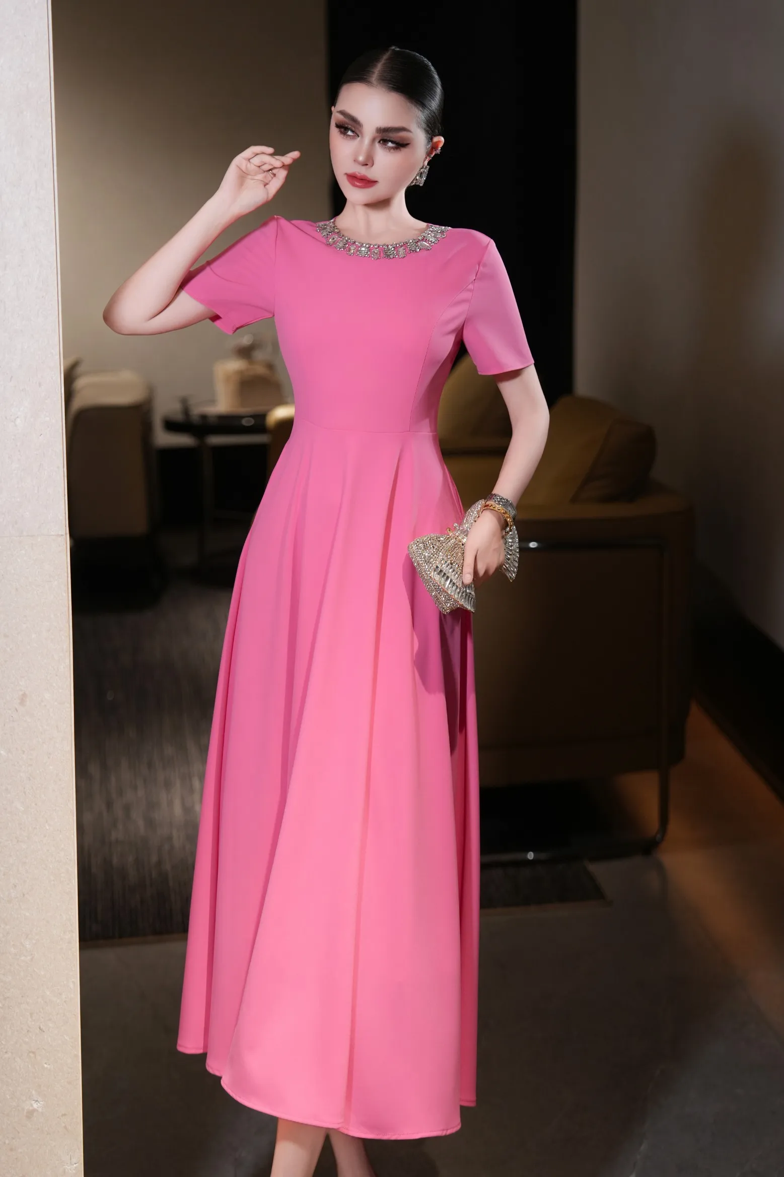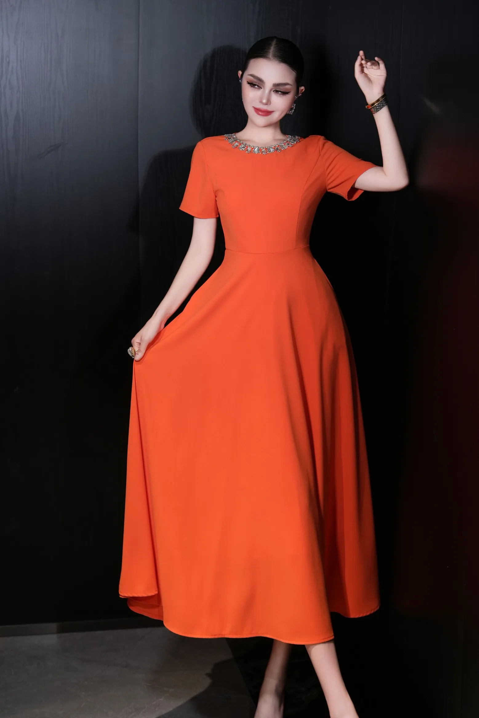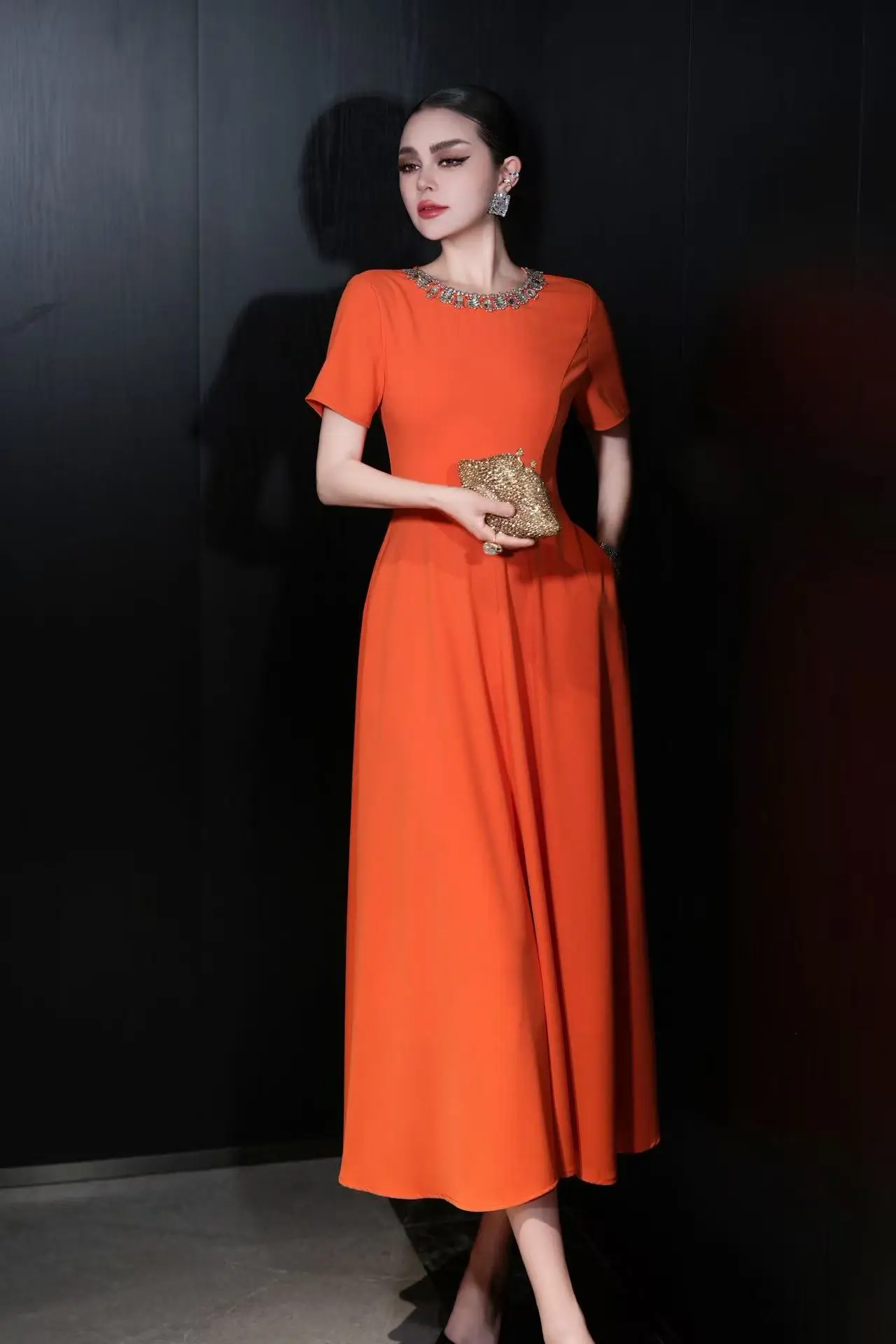 ZJYT Elegant Luxury Diamonds Long Dresses for Women Summer Short Sleeve Solid Simple Fashion Evening Party Dress Orange Pink