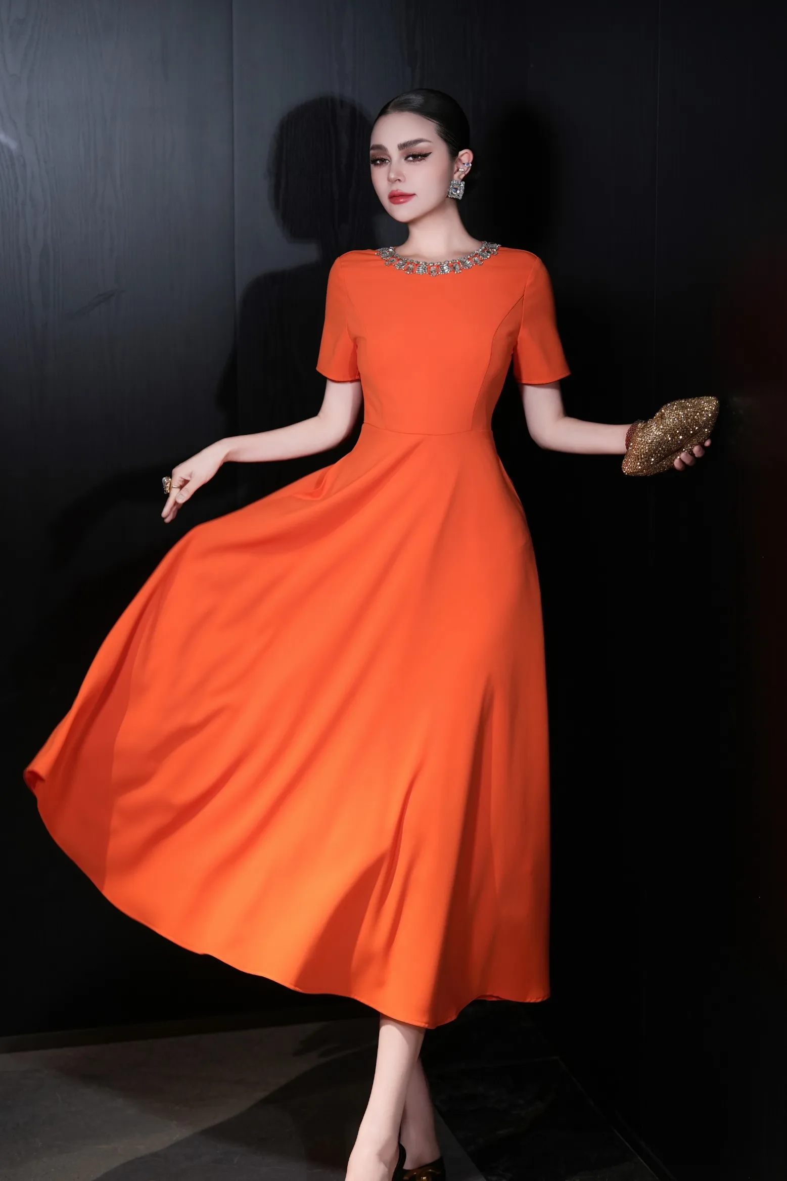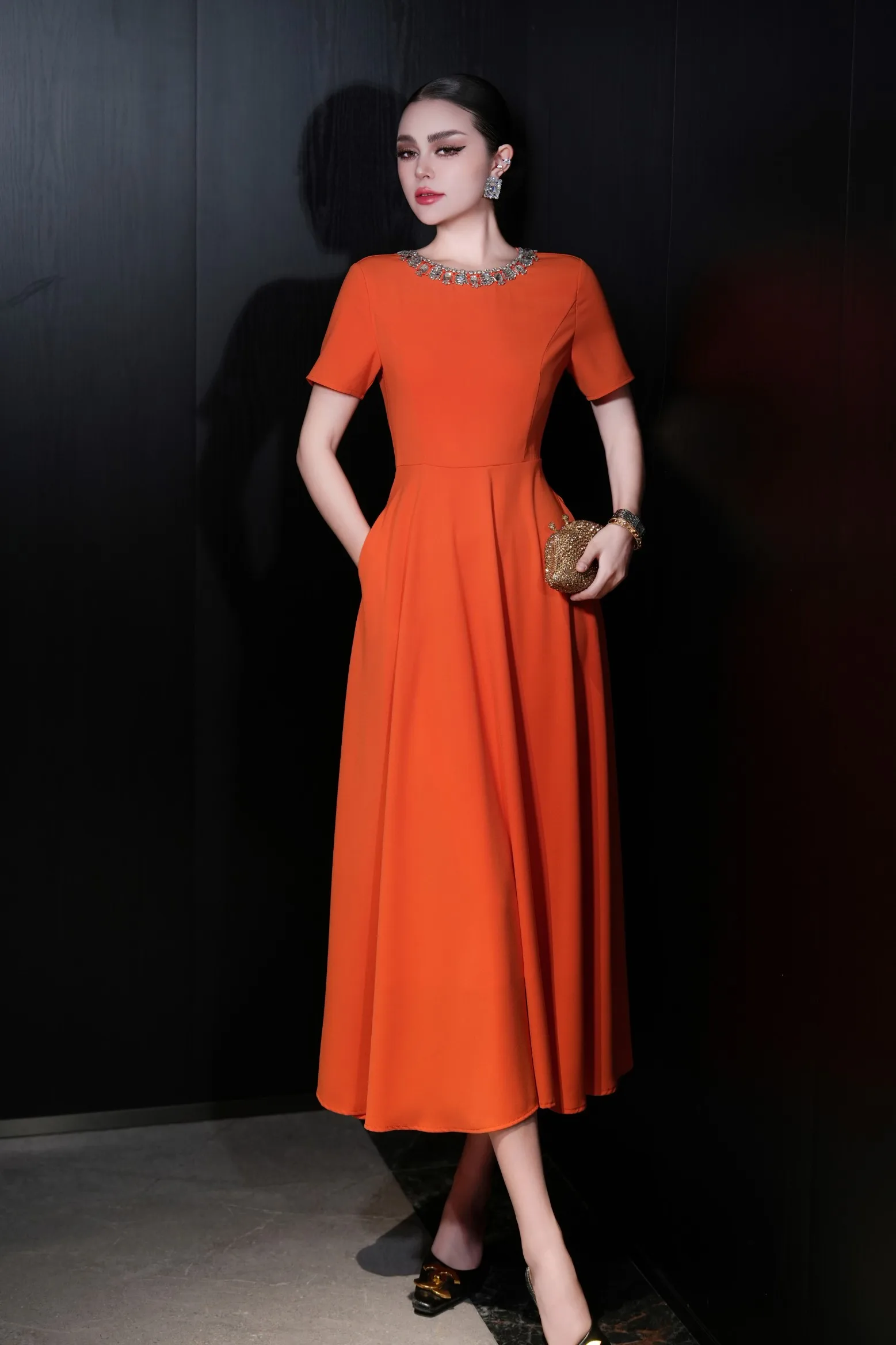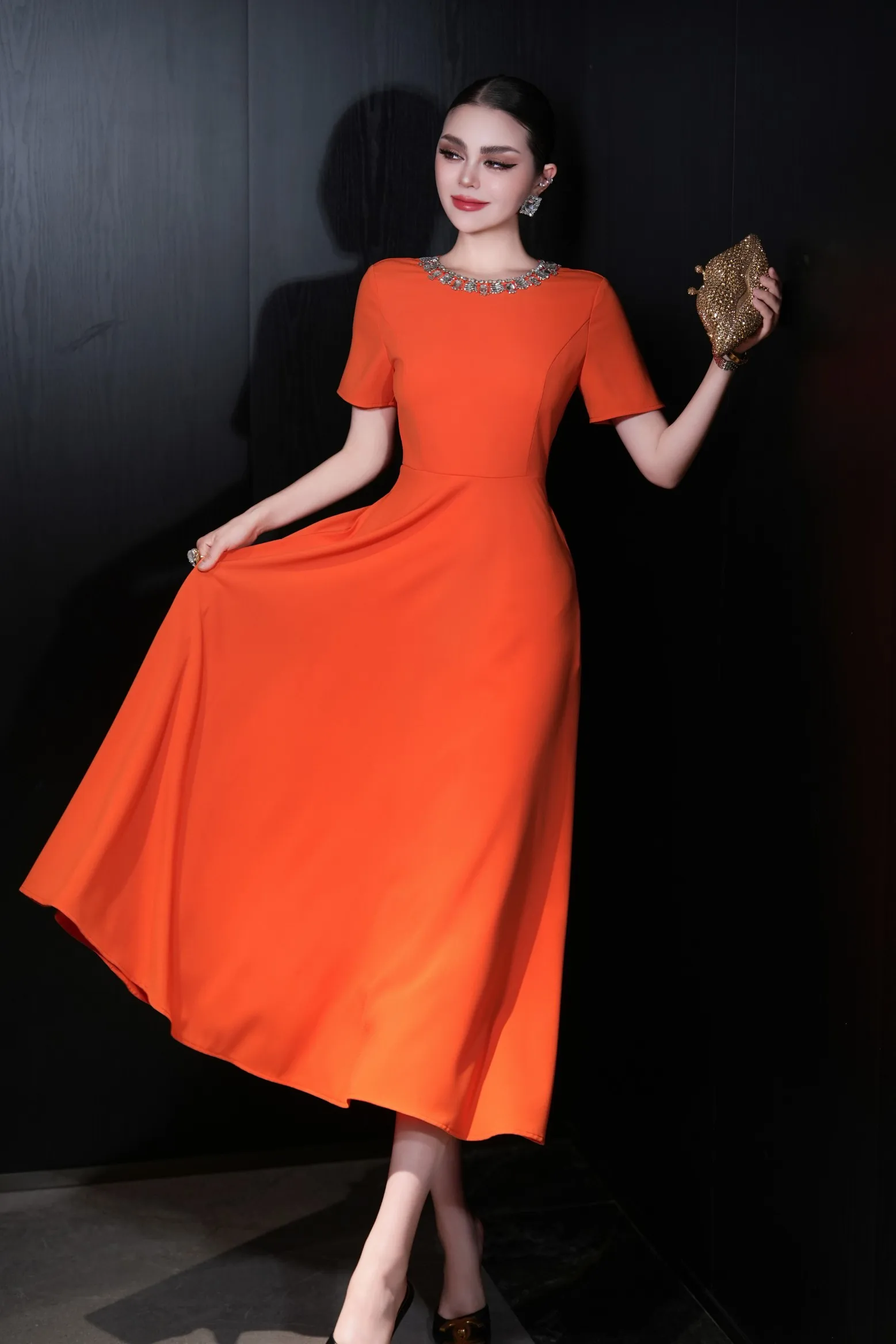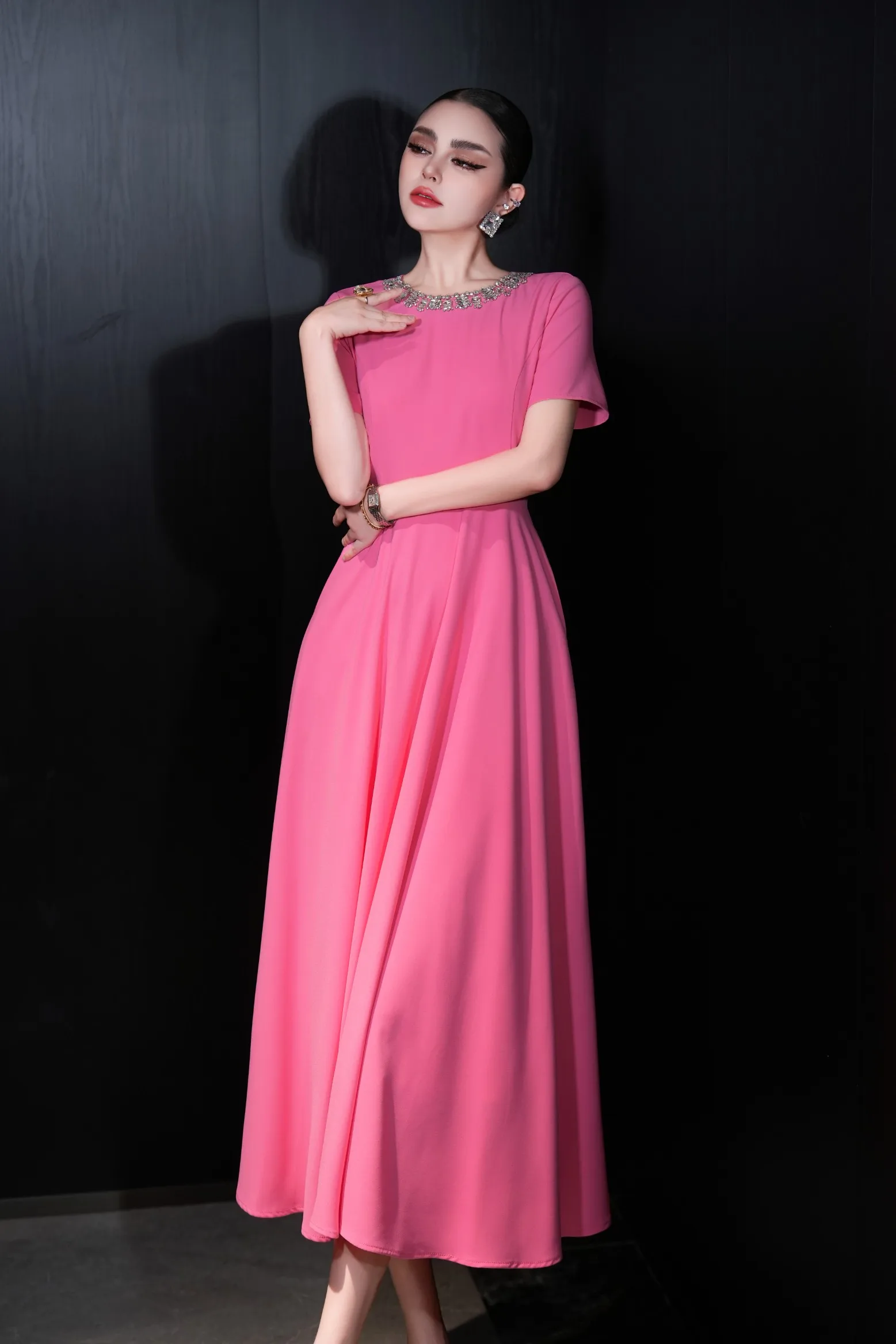ZJYT Elegant Luxury Diamonds Long Dresses for Women Summer Short Sleeve Solid Simple Fashion Evening Party Dress Orange Pink
