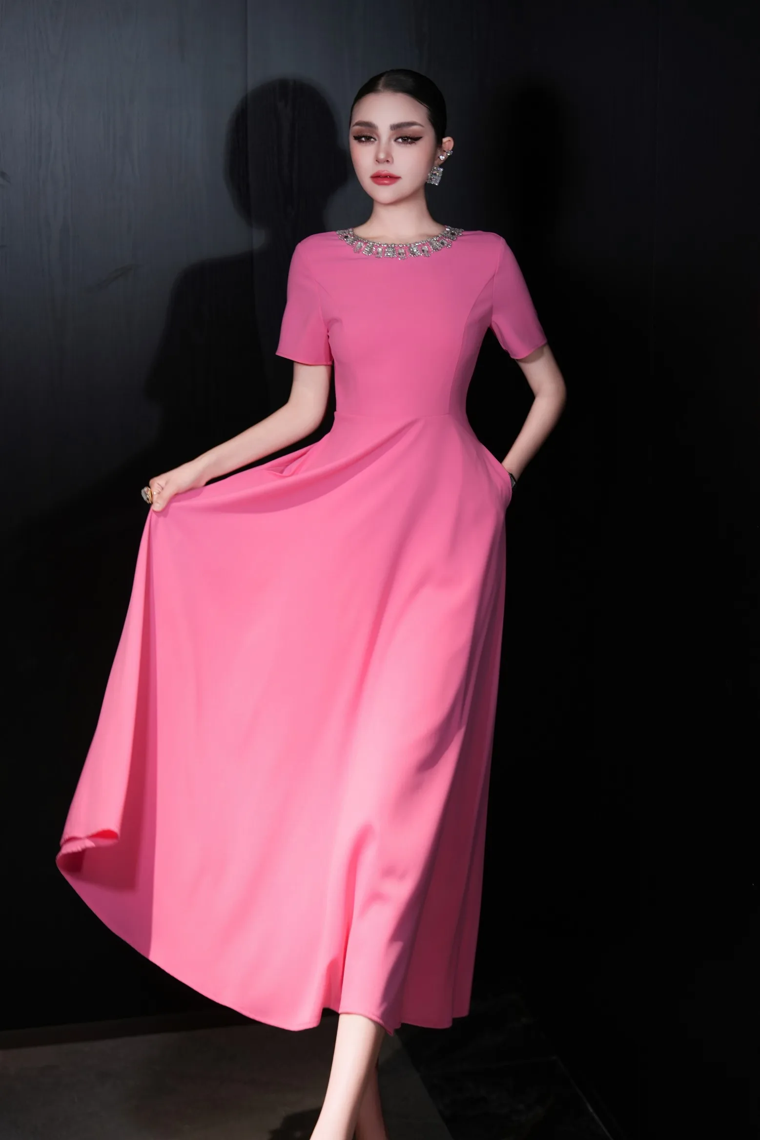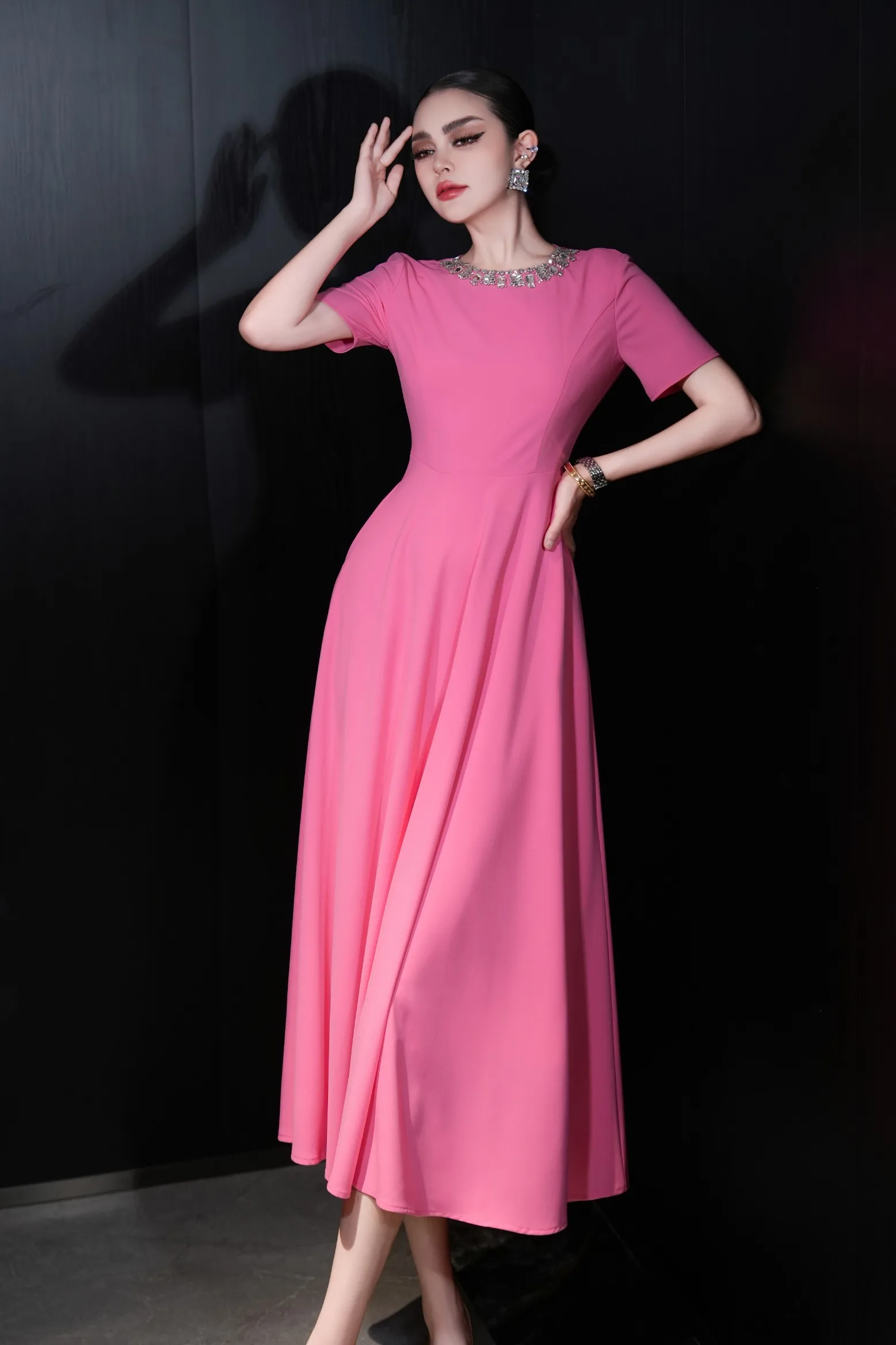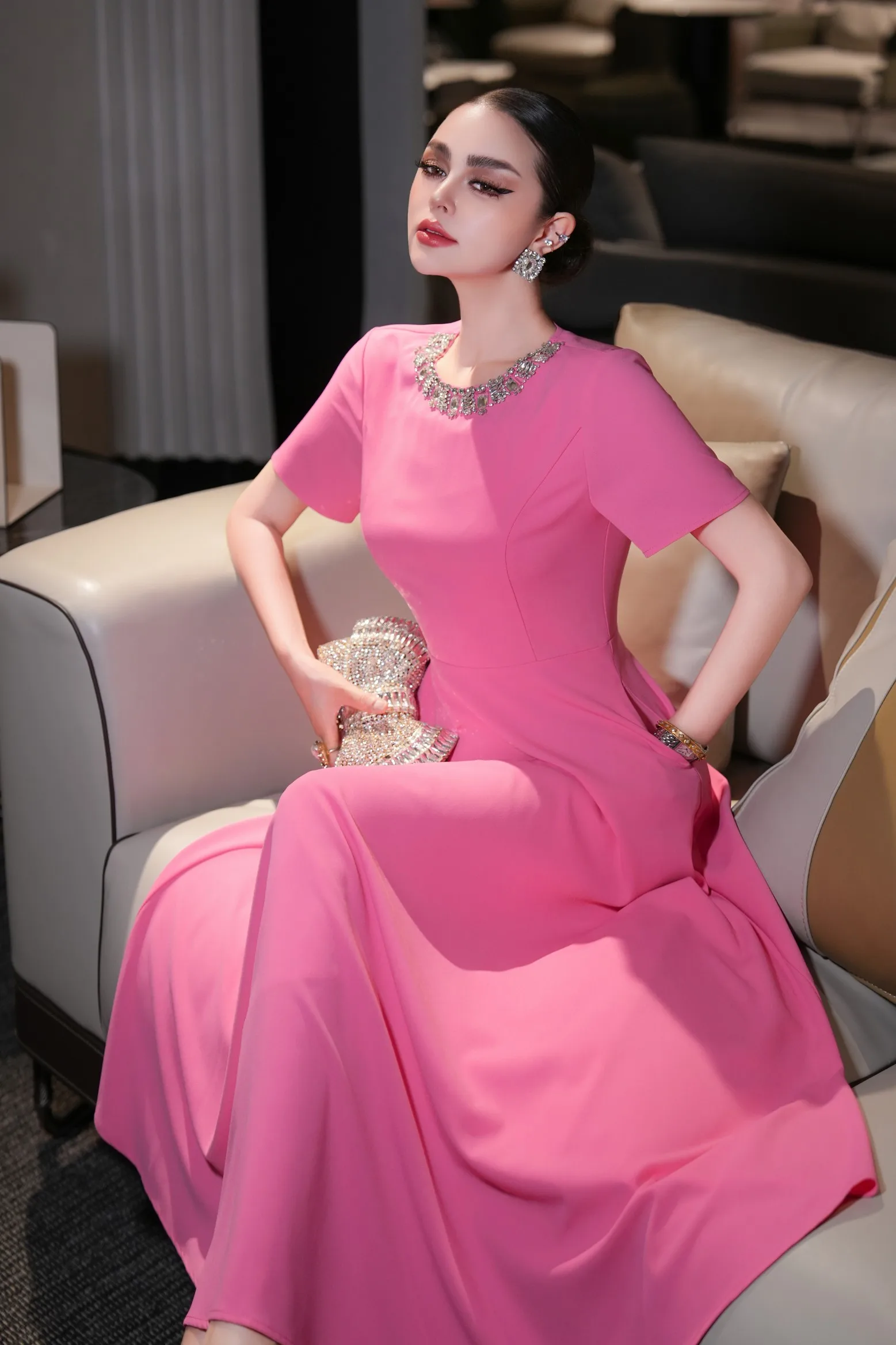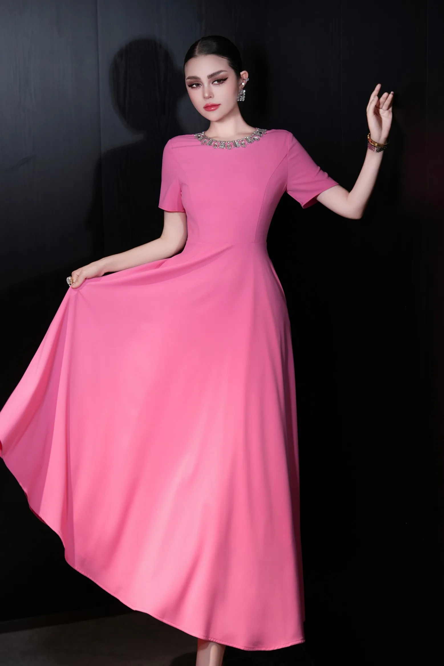 ZJYT Elegant Luxury Diamonds Long Dresses for Women Summer Short Sleeve Solid Simple Fashion Evening Party Dress Orange Pink