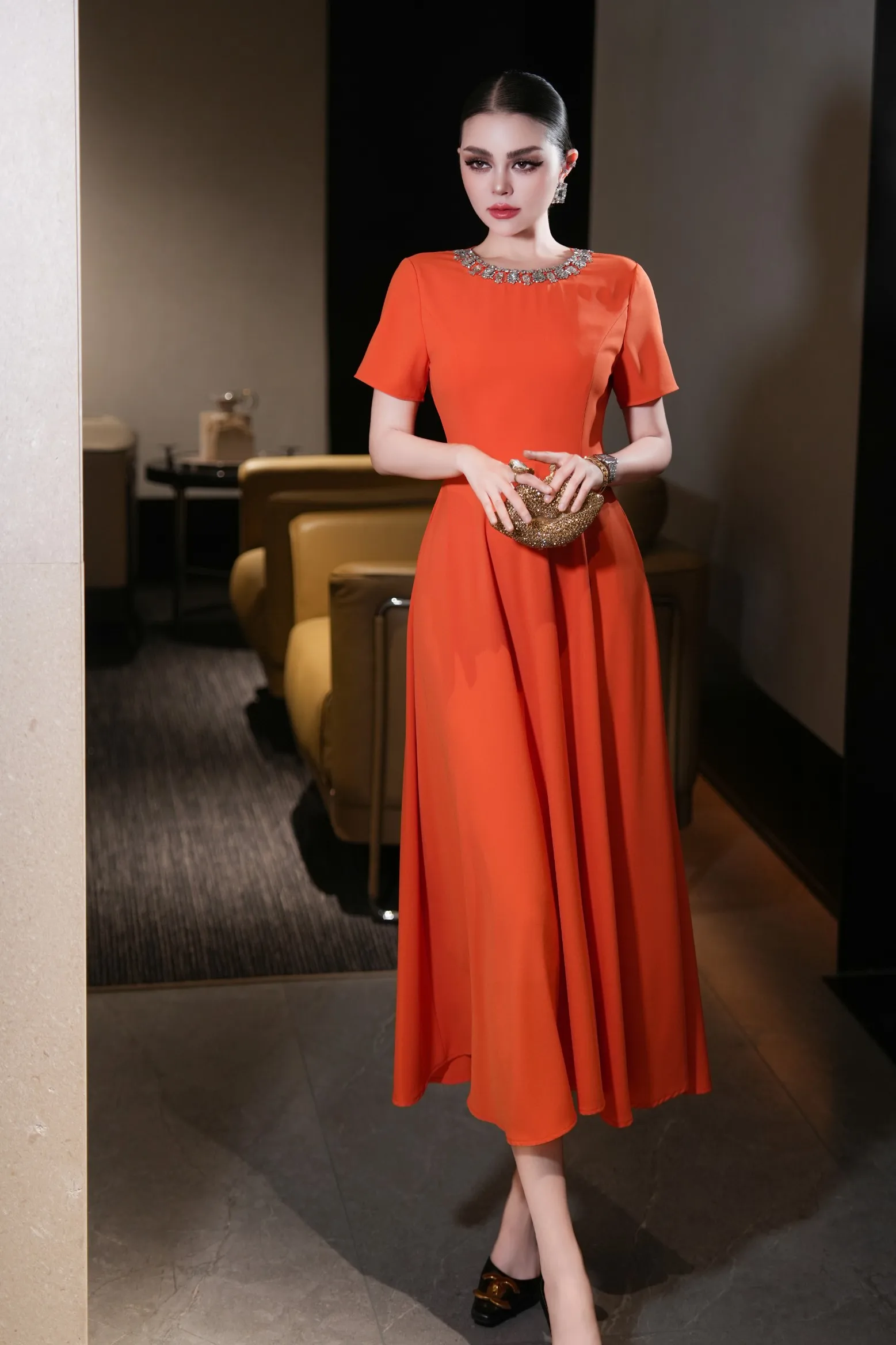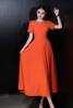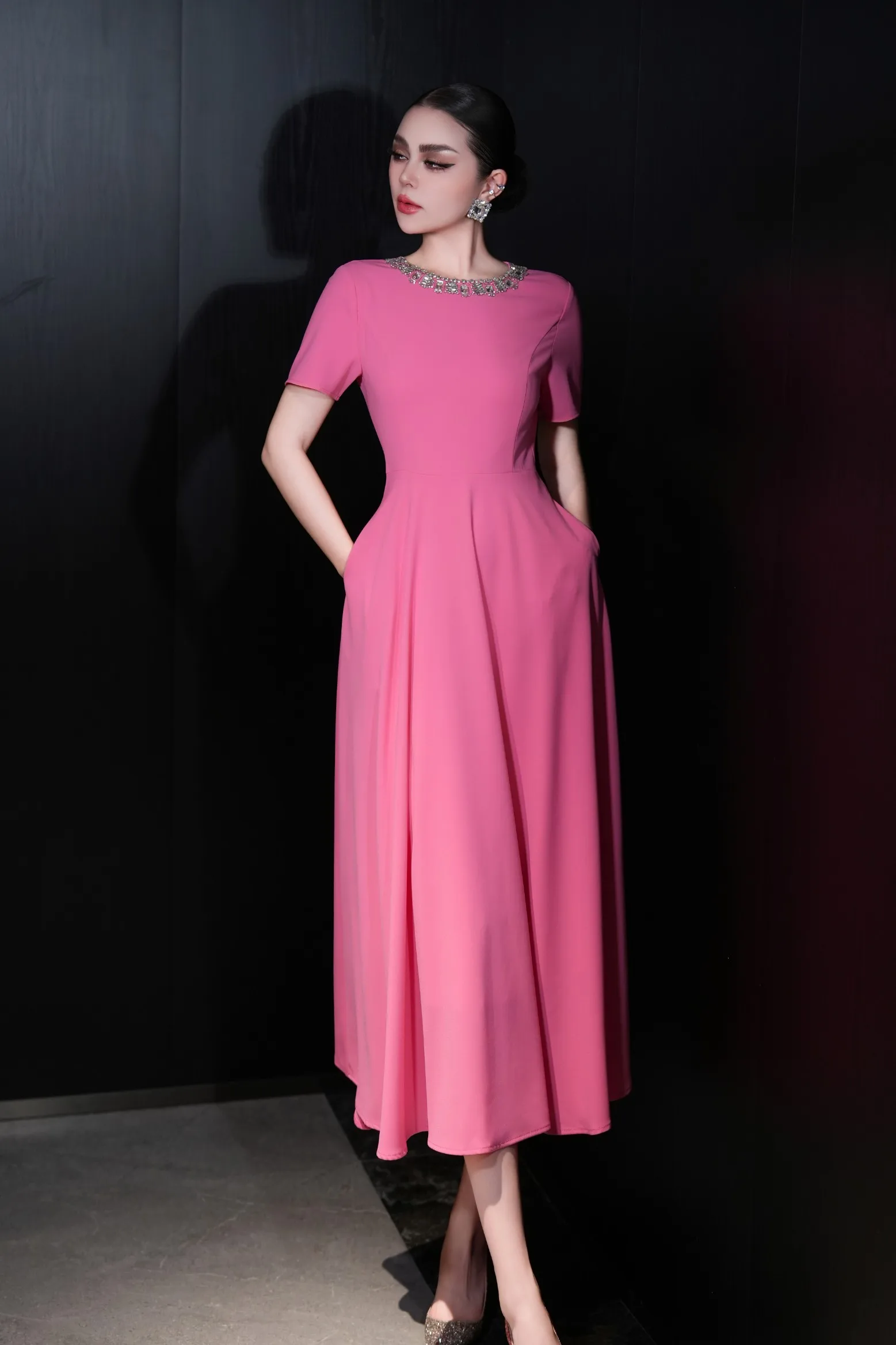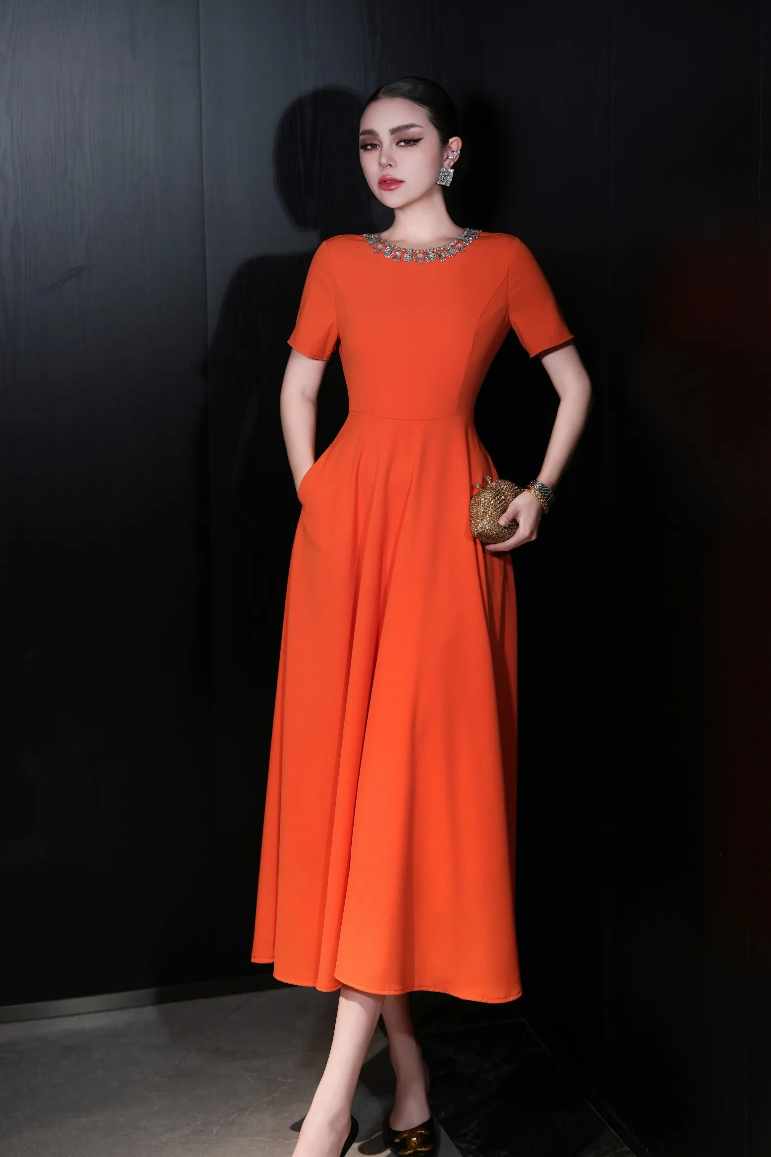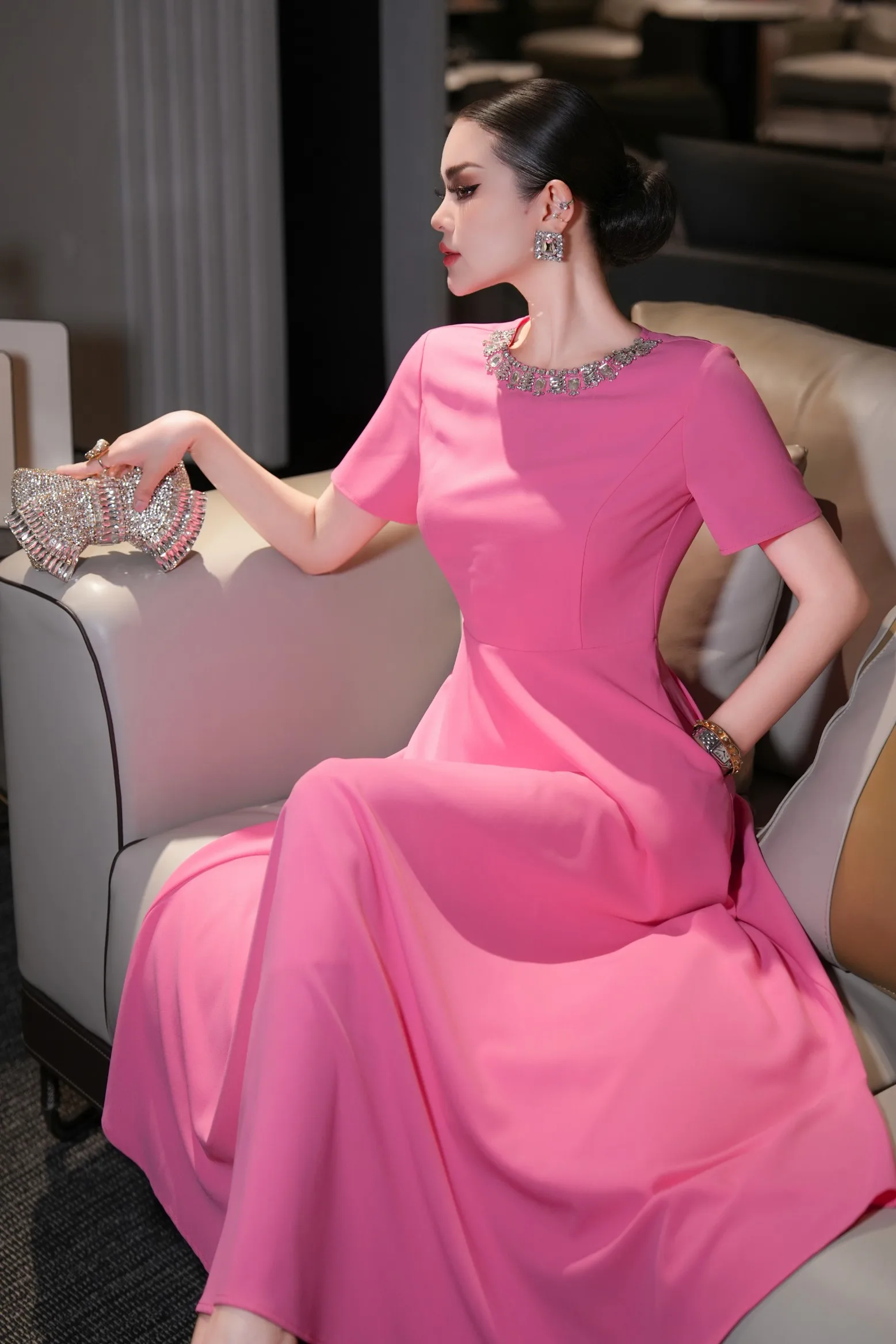 ZJYT Elegant Luxury Diamonds Long Dresses for Women Summer Short Sleeve Solid Simple Fashion Evening Party Dress Orange Pink