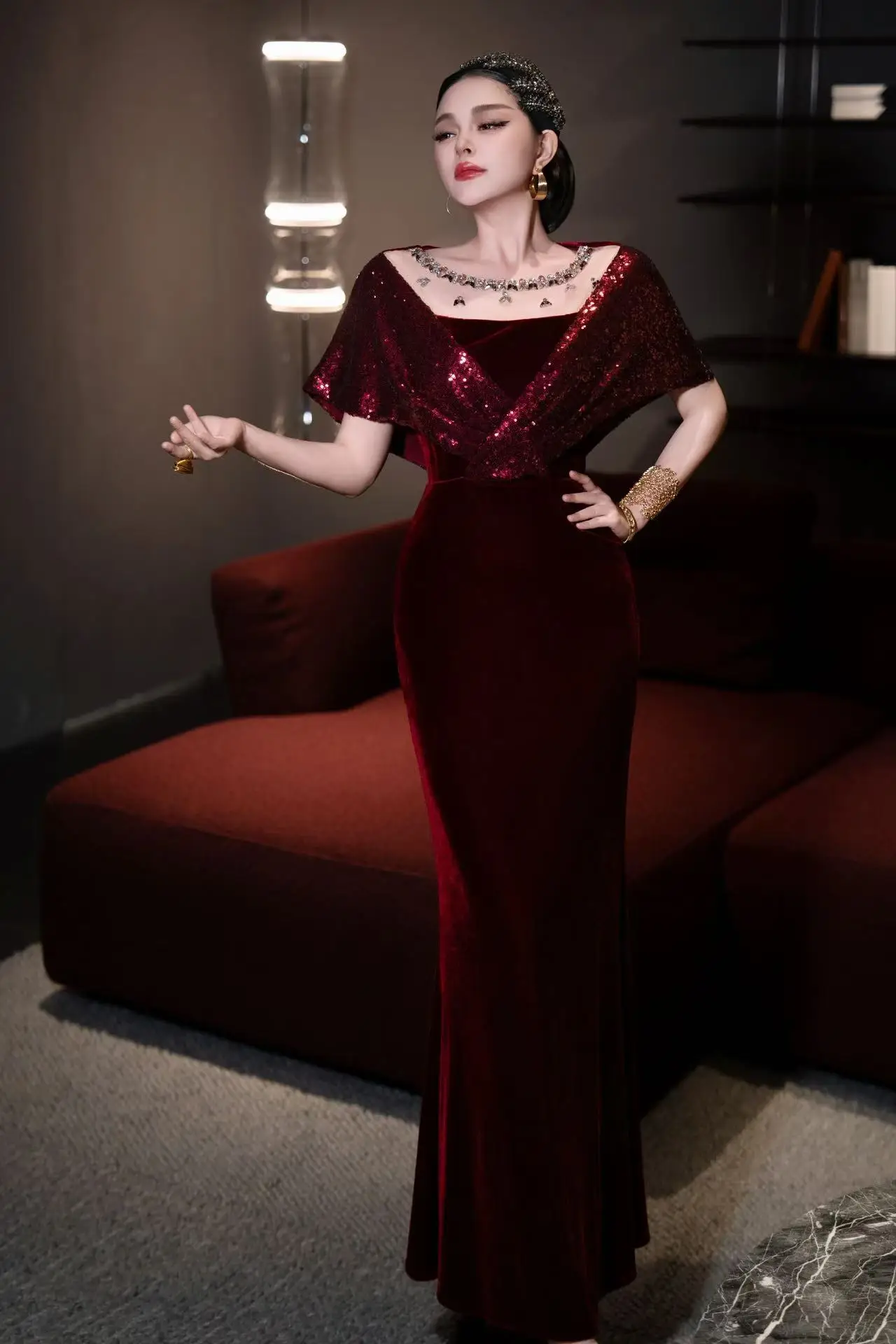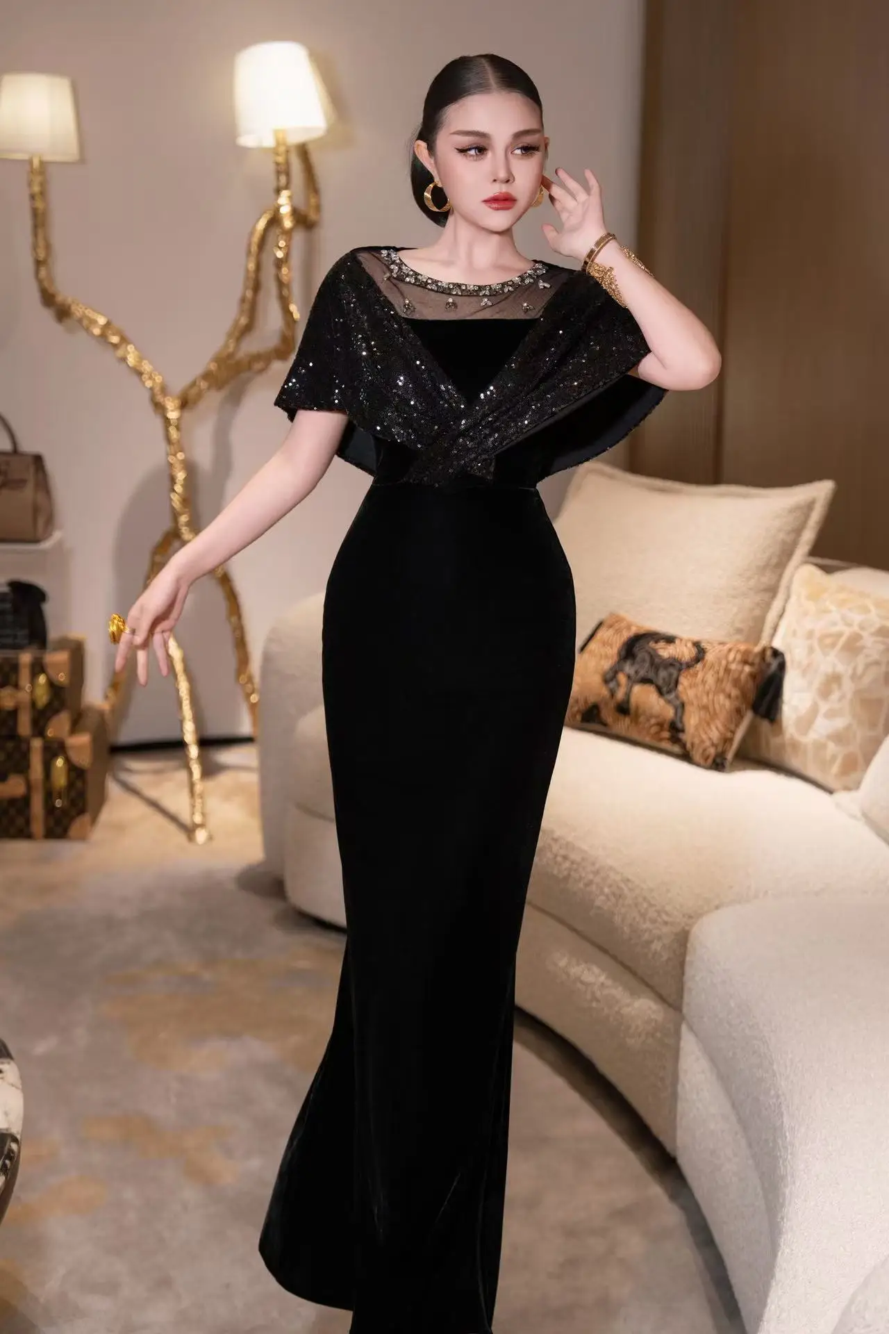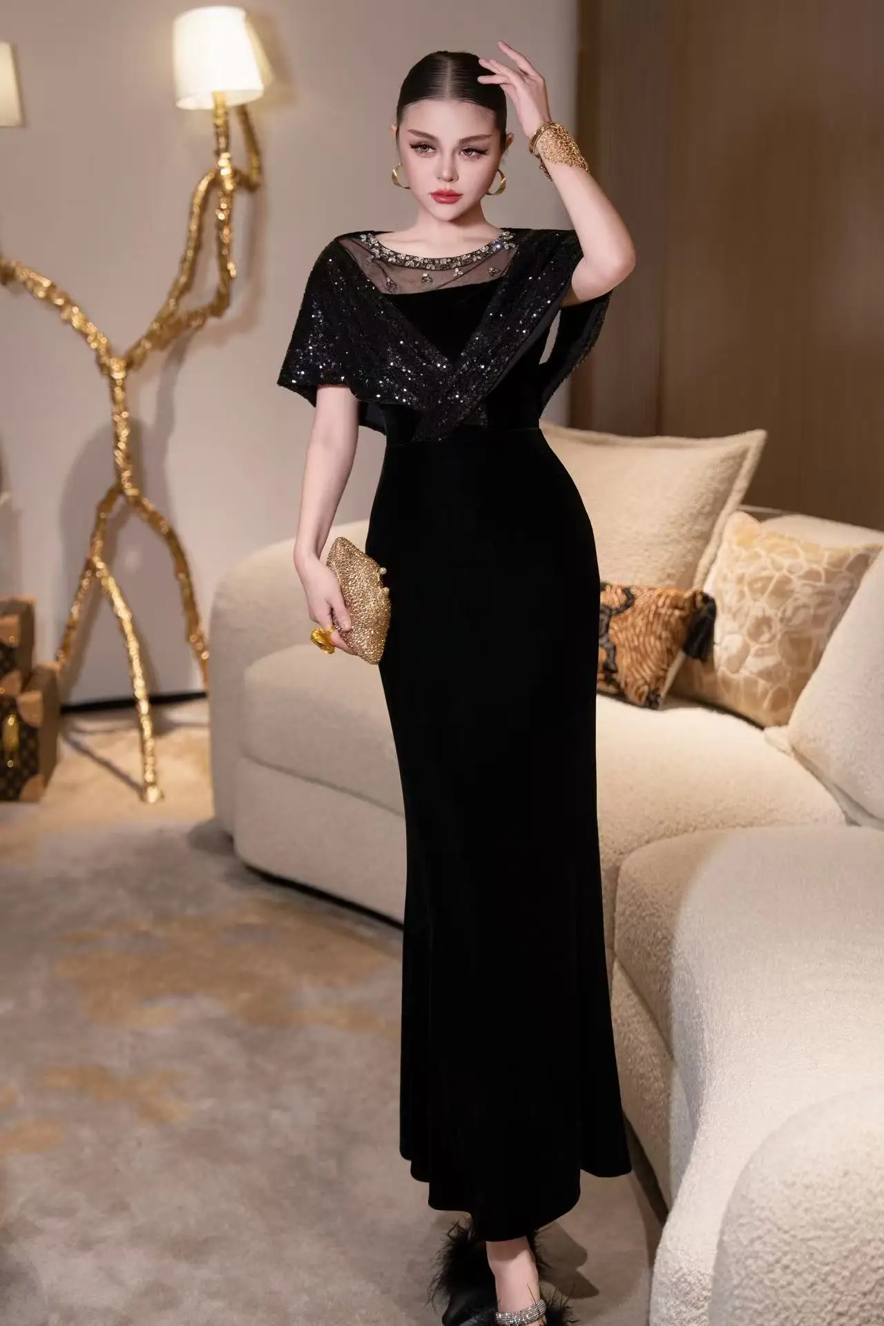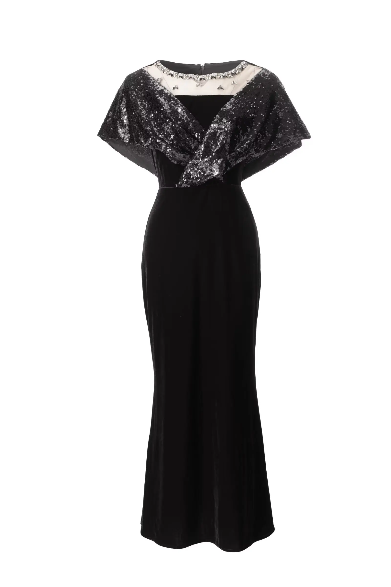 ZJYT Elegant Luxury Long Evening Party Gown Sequined Diamonds Velvet Mermaid Dress Women Mesh Patchwork Wedding Special Occasion