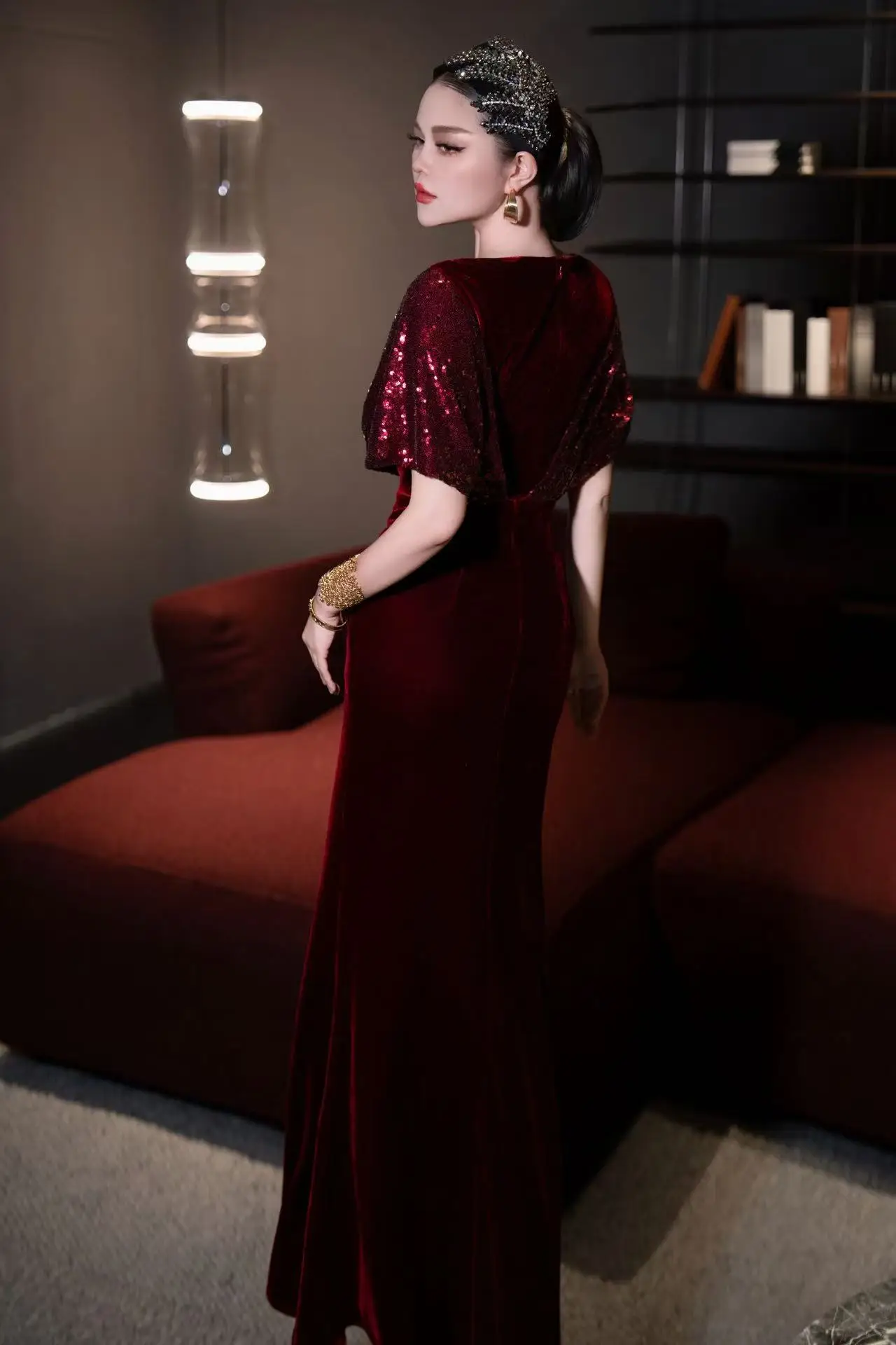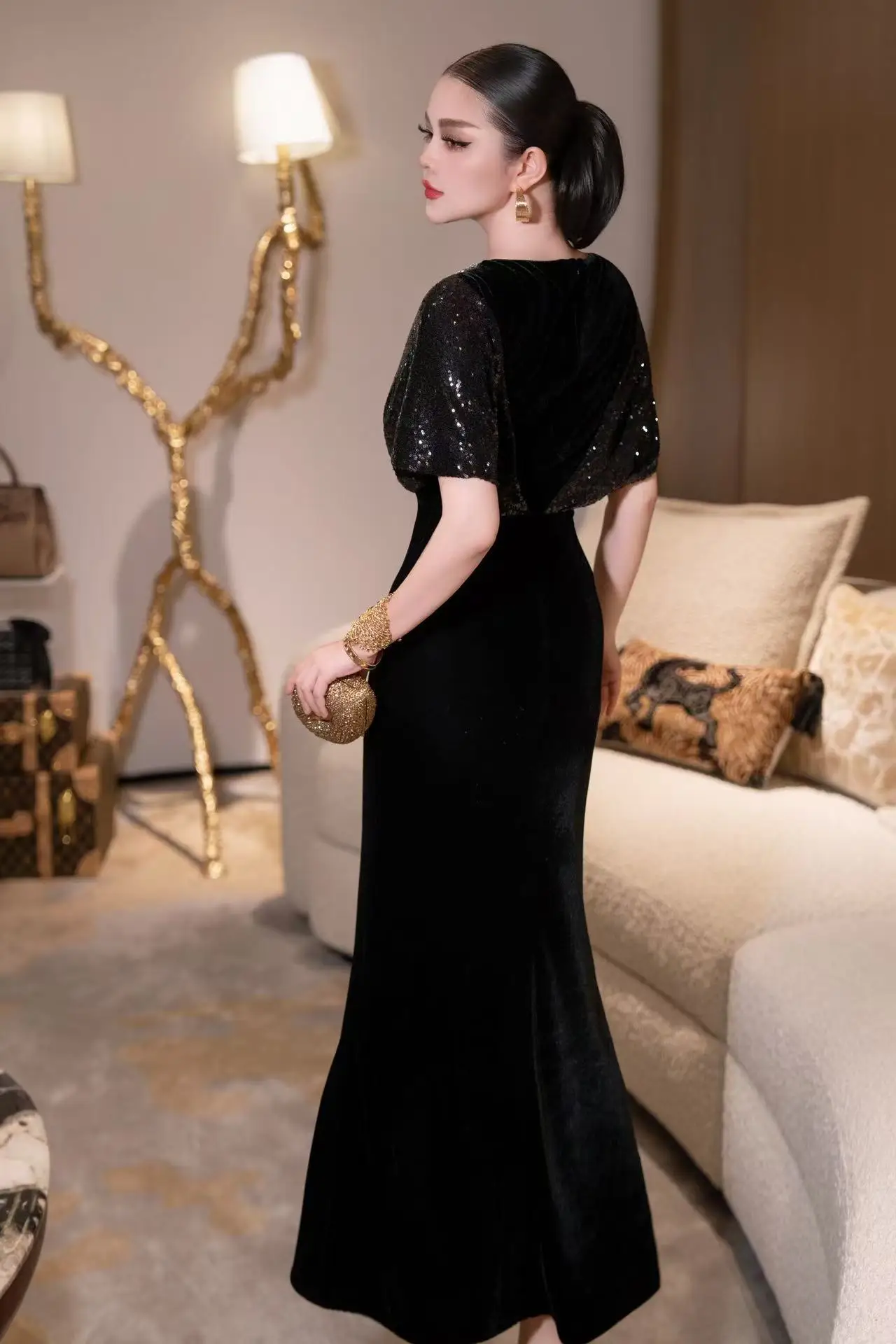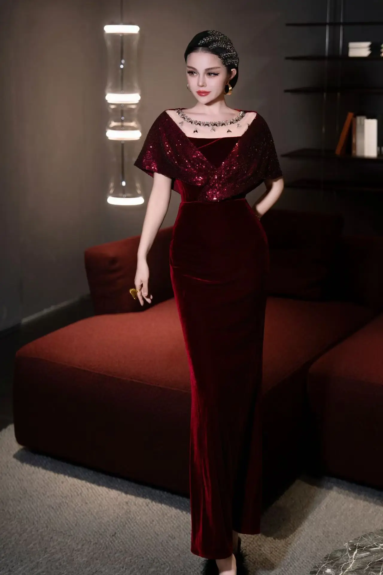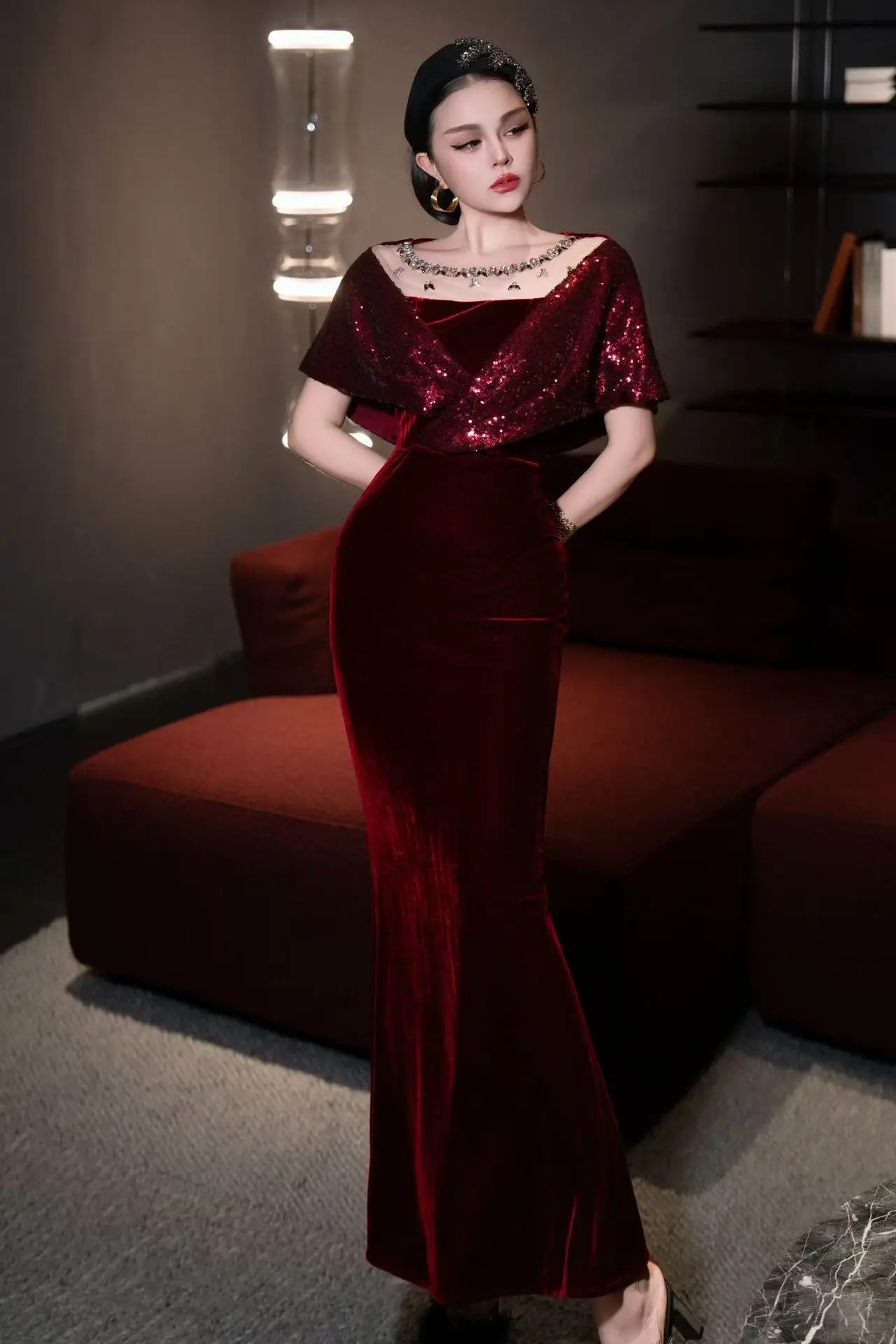 ZJYT Elegant Luxury Long Evening Party Gown Sequined Diamonds Velvet Mermaid Dress Women Mesh Patchwork Wedding Special Occasion