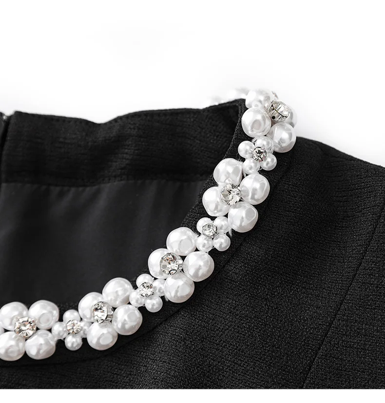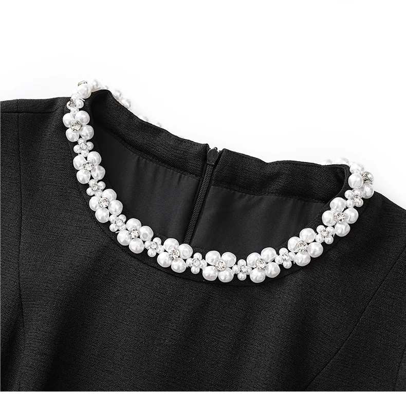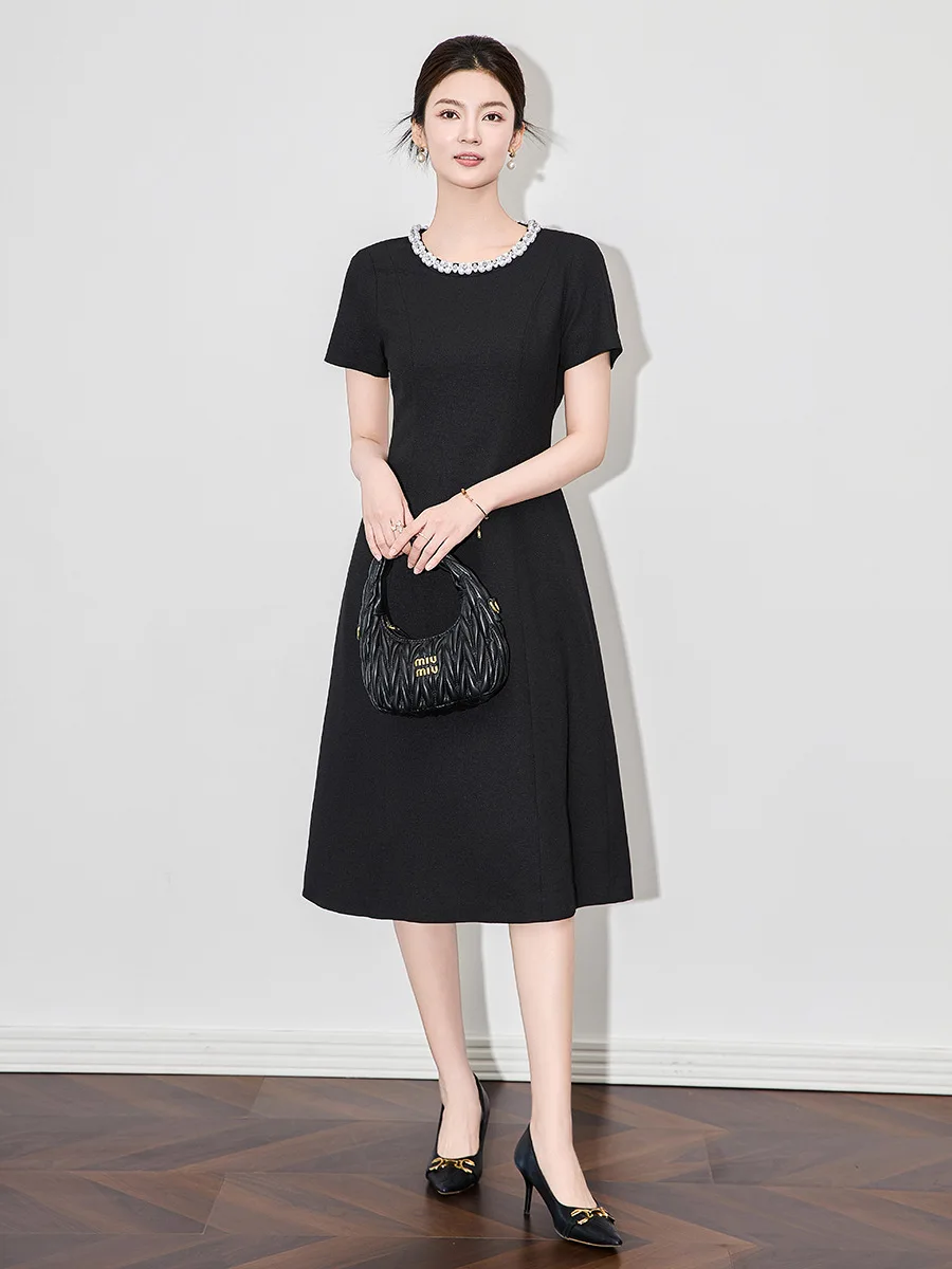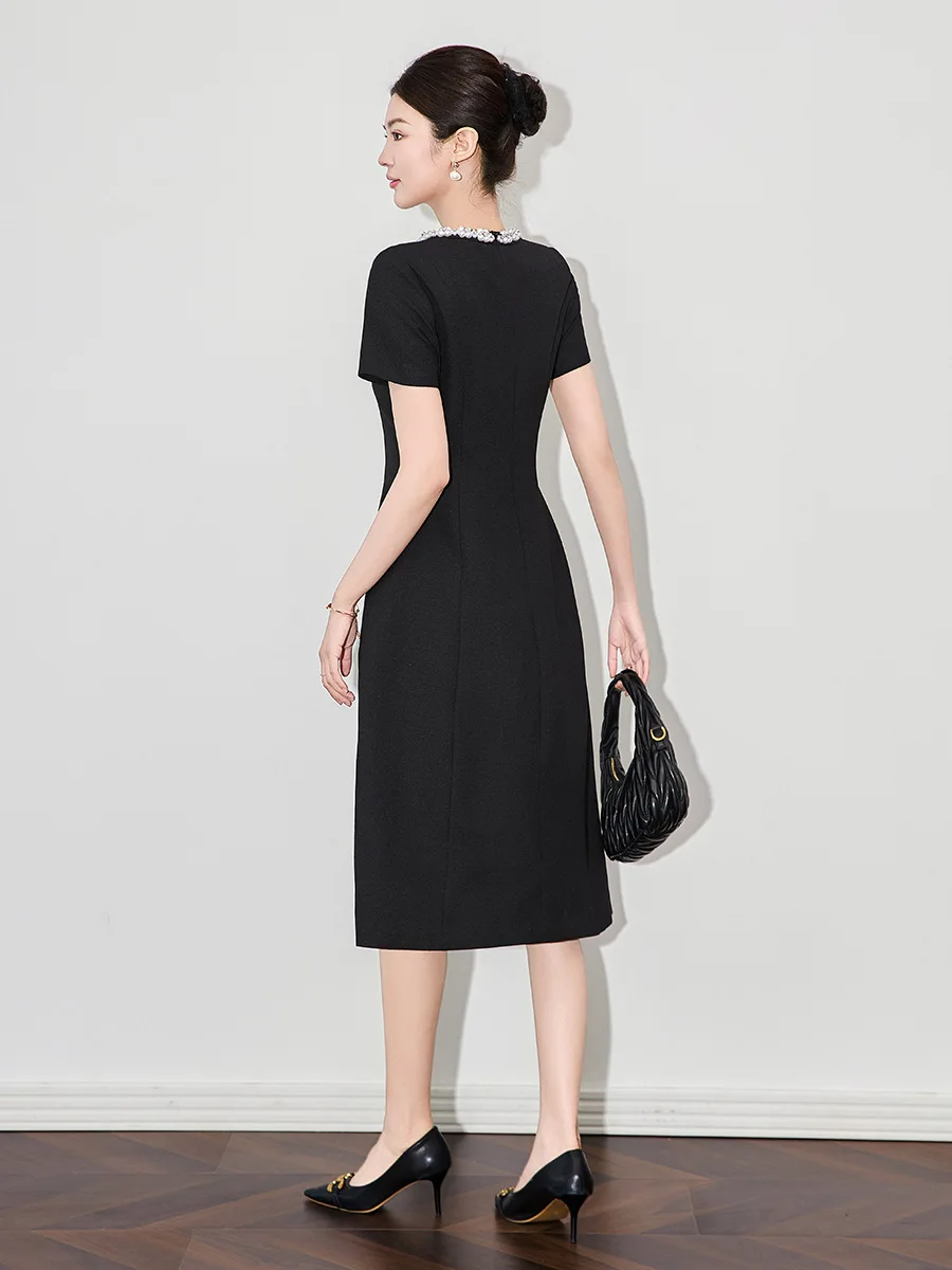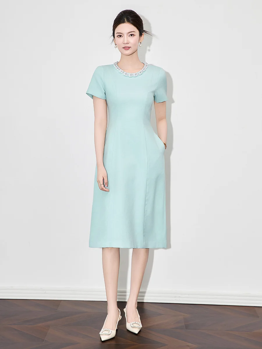 ZJYT Elegant O Neck Beading Simple Dresses for Women Summer Short Sleeve Solid Green Black Office Lady Work Dress Midi Vestidos