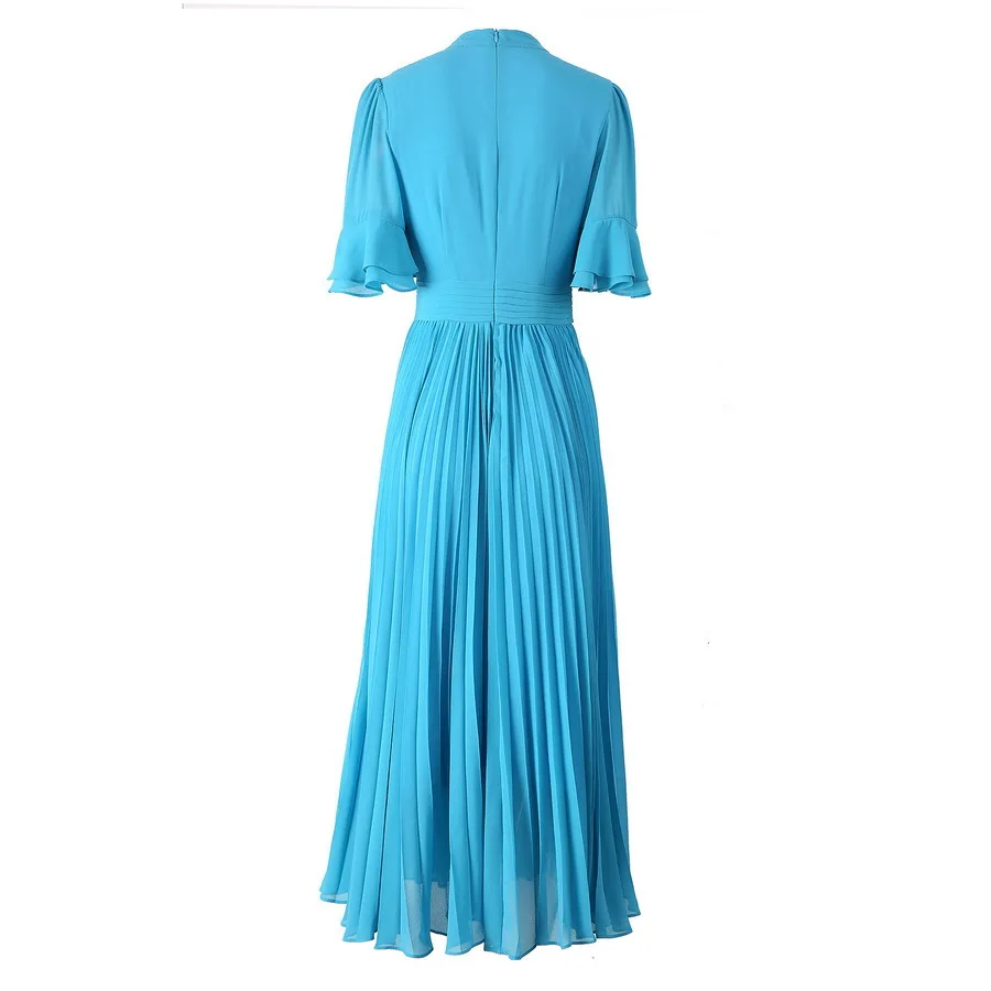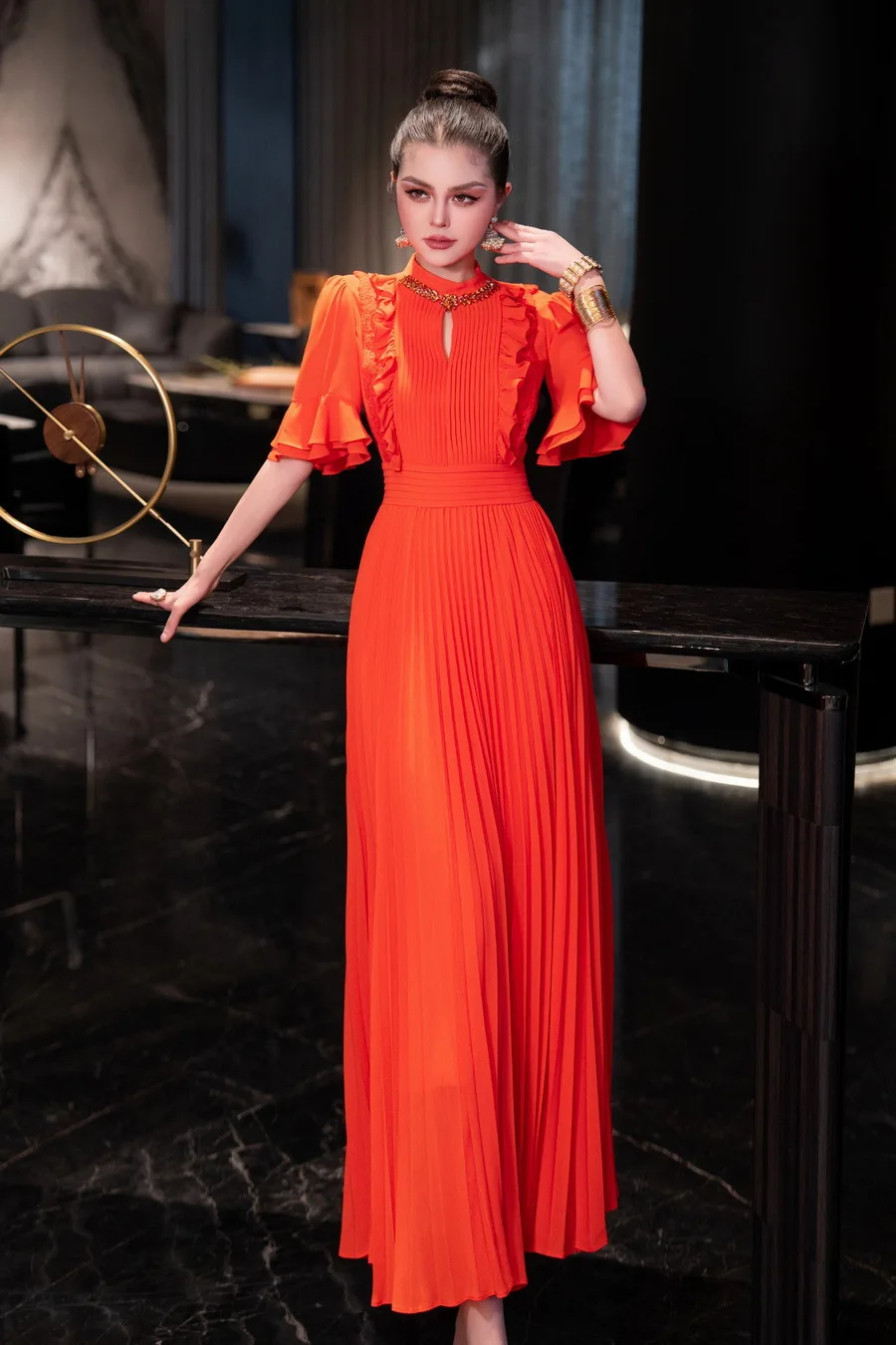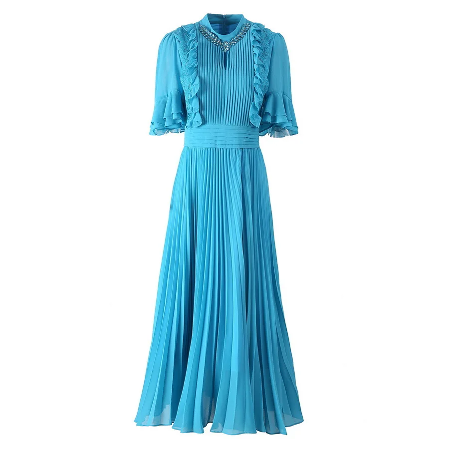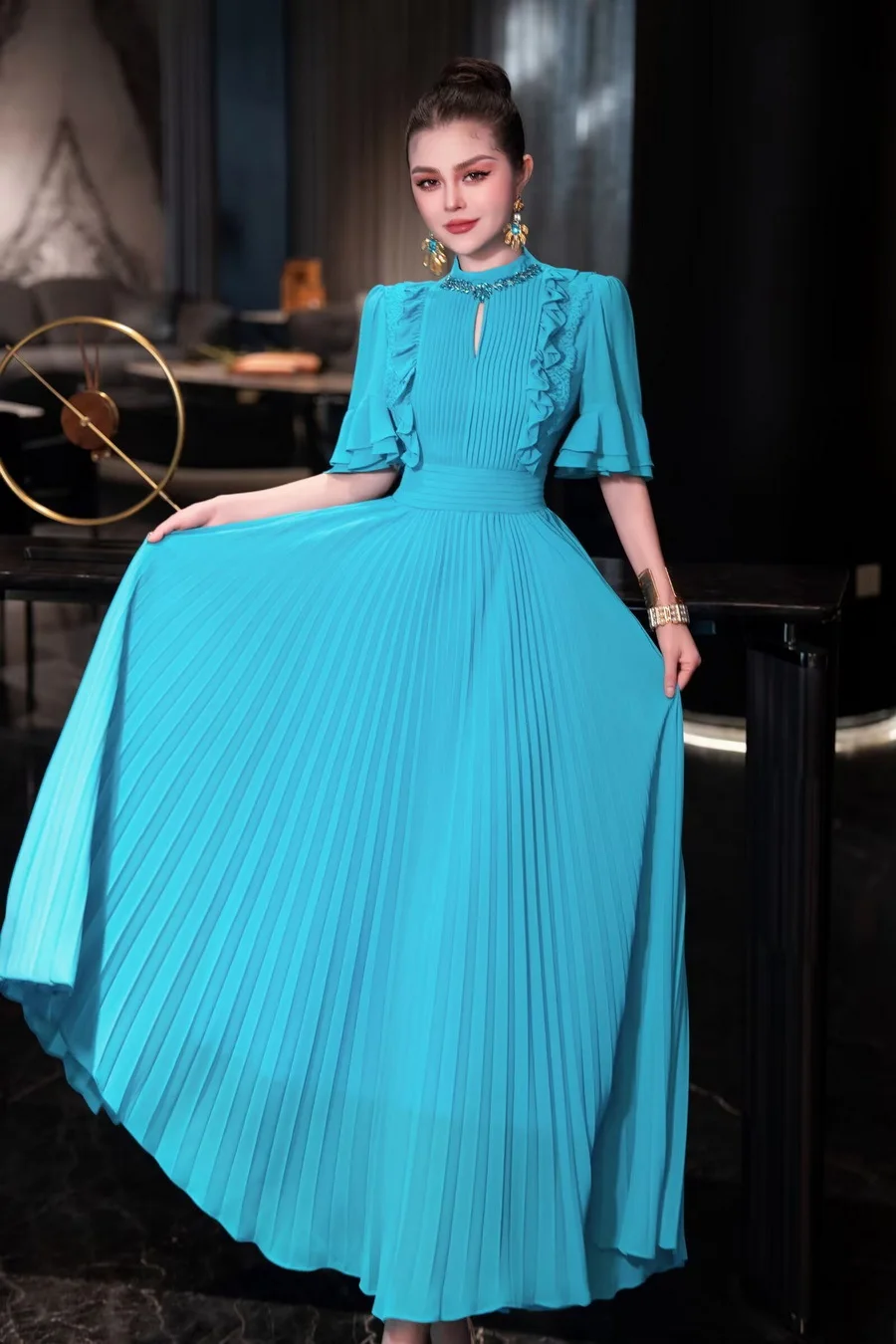 ZJYT Elegant Summer Pleated Long Maxi Chiffon Dresses for Women Stand Collar Rinestone Flare Sleeve Evening Party Gown Vestidos