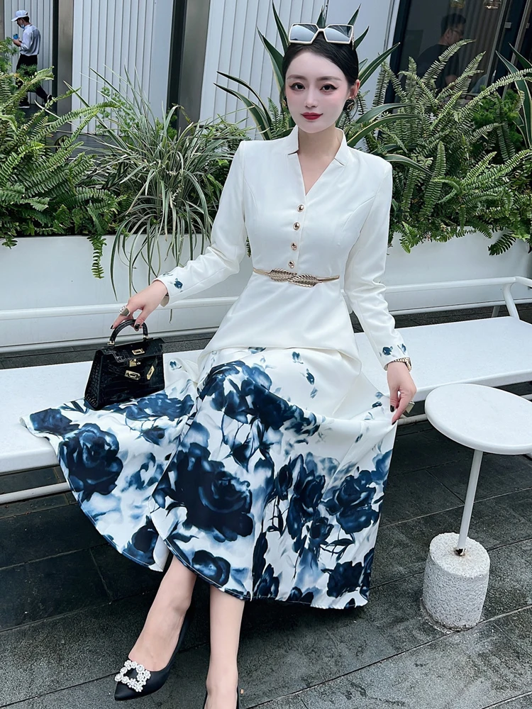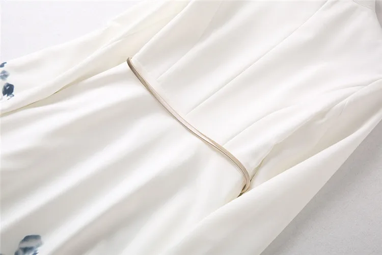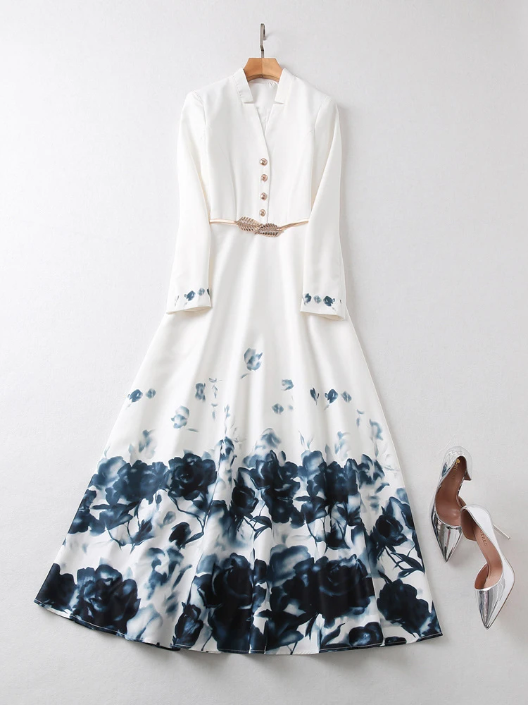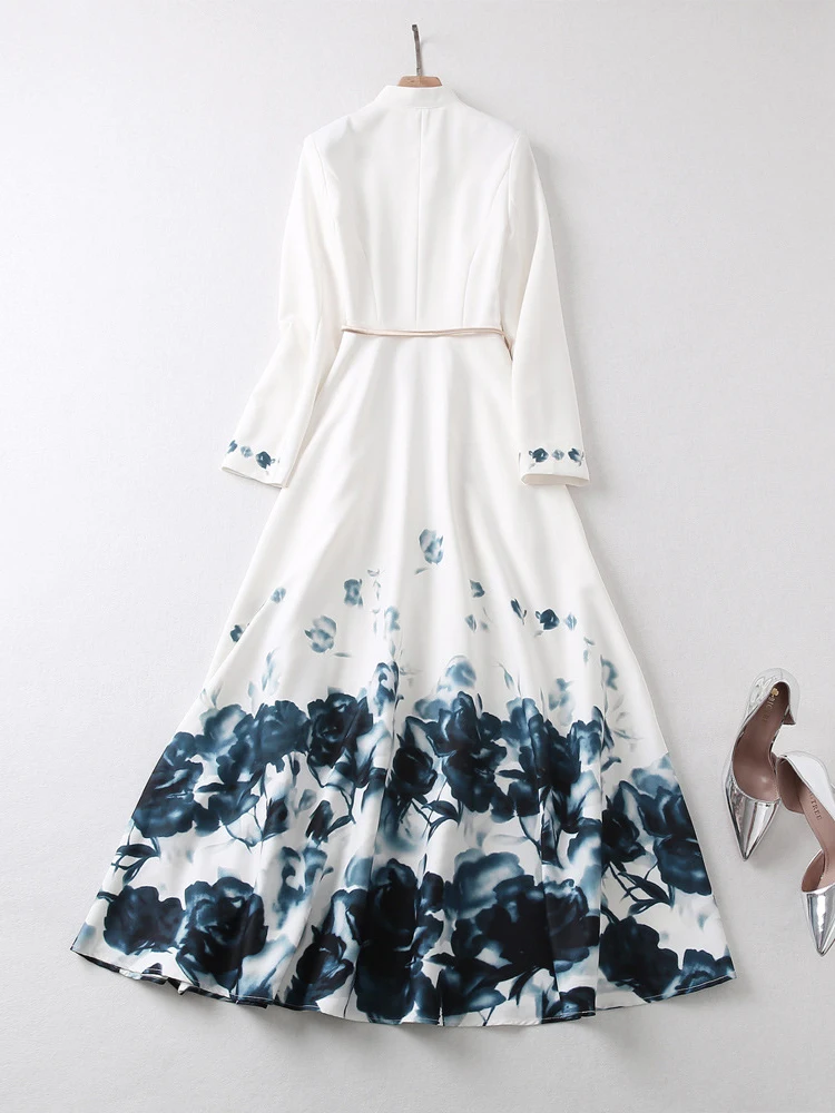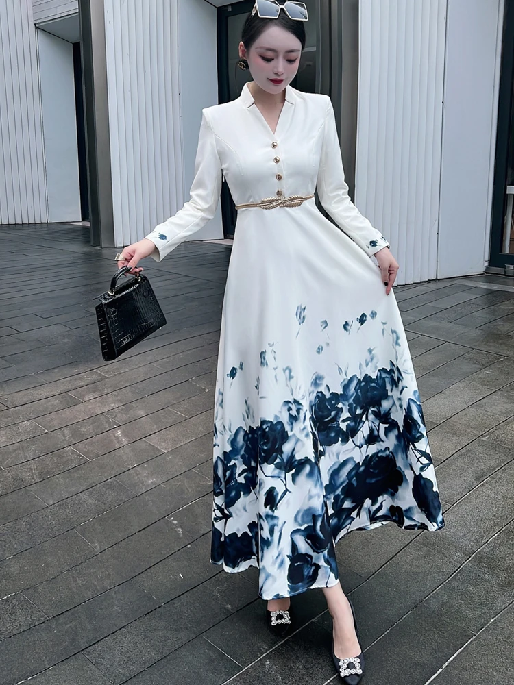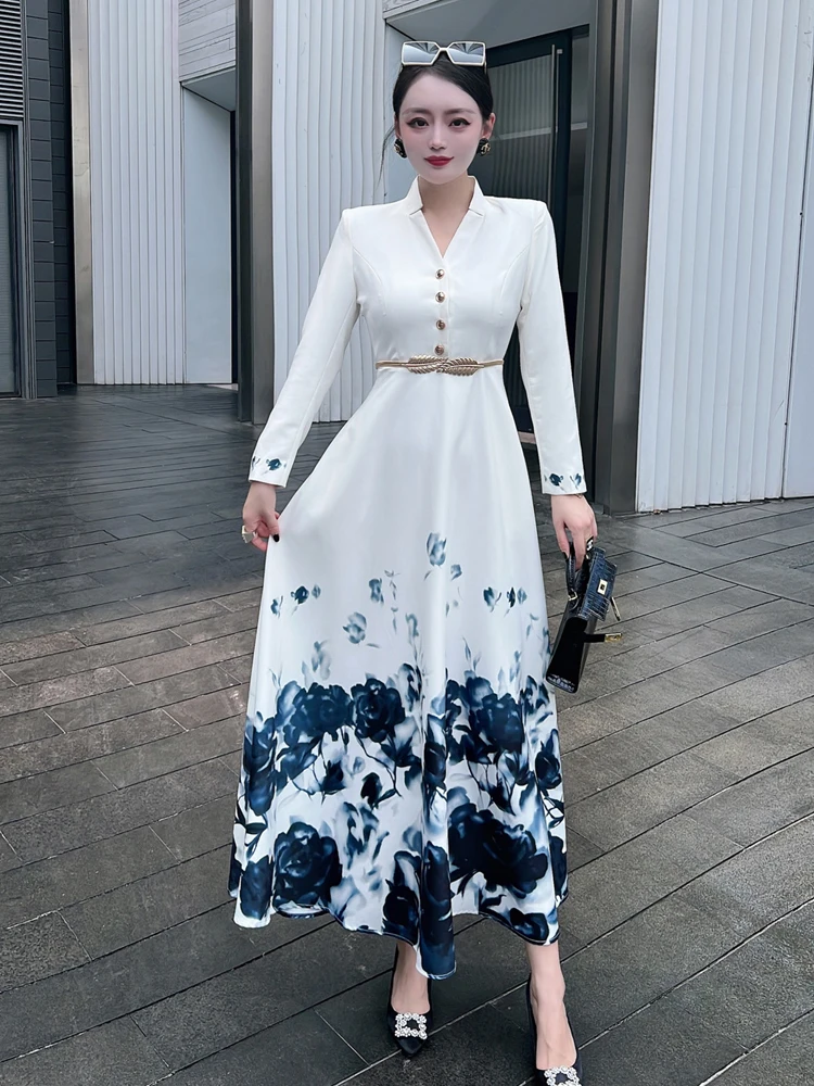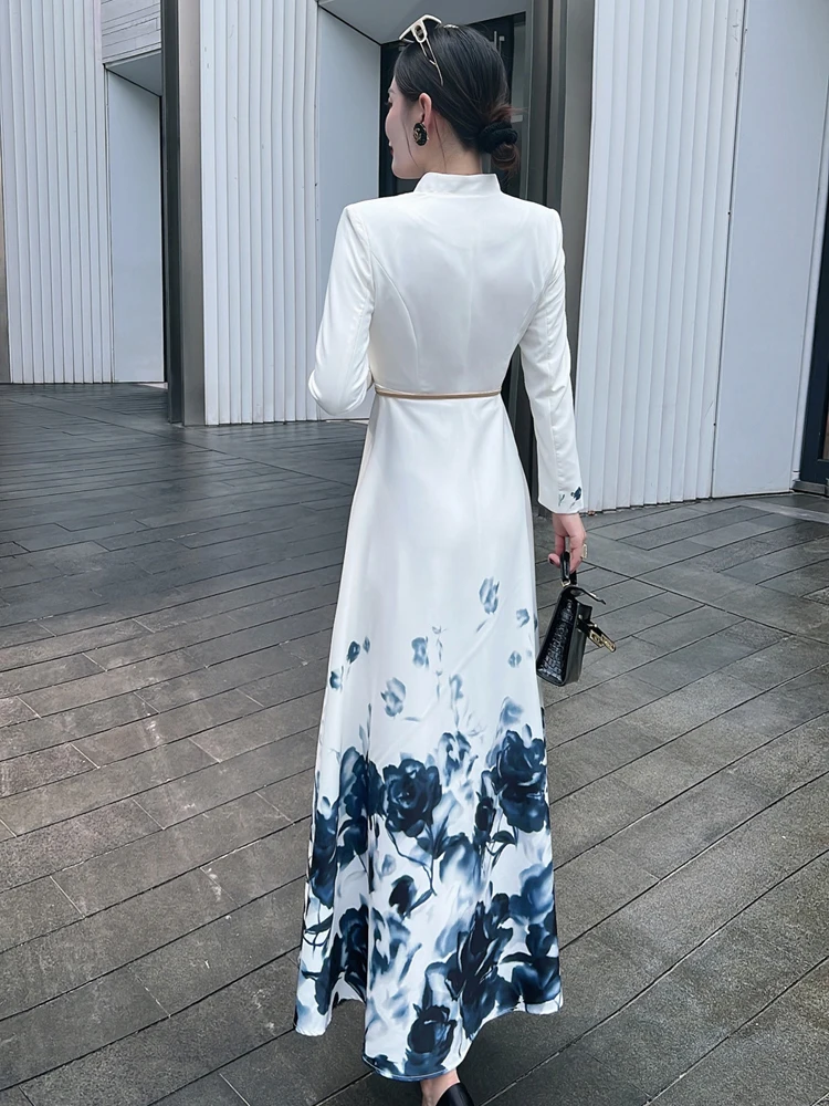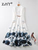 ZJYT Fashion Runway Designer Floral Print Long Maxi Dress for Women 2025 Autumn Elegant Full Sleeve White Party Dress Vestidos