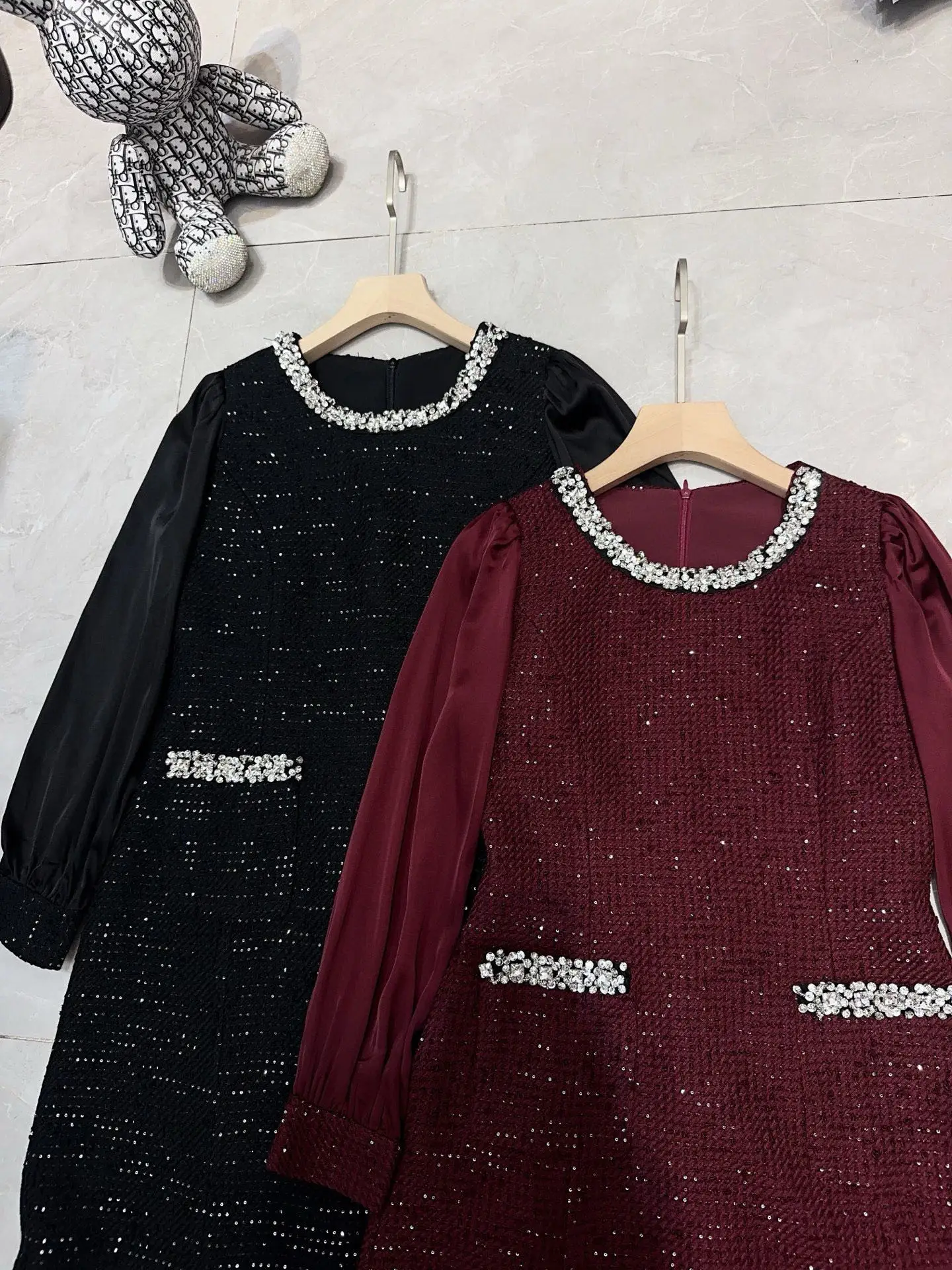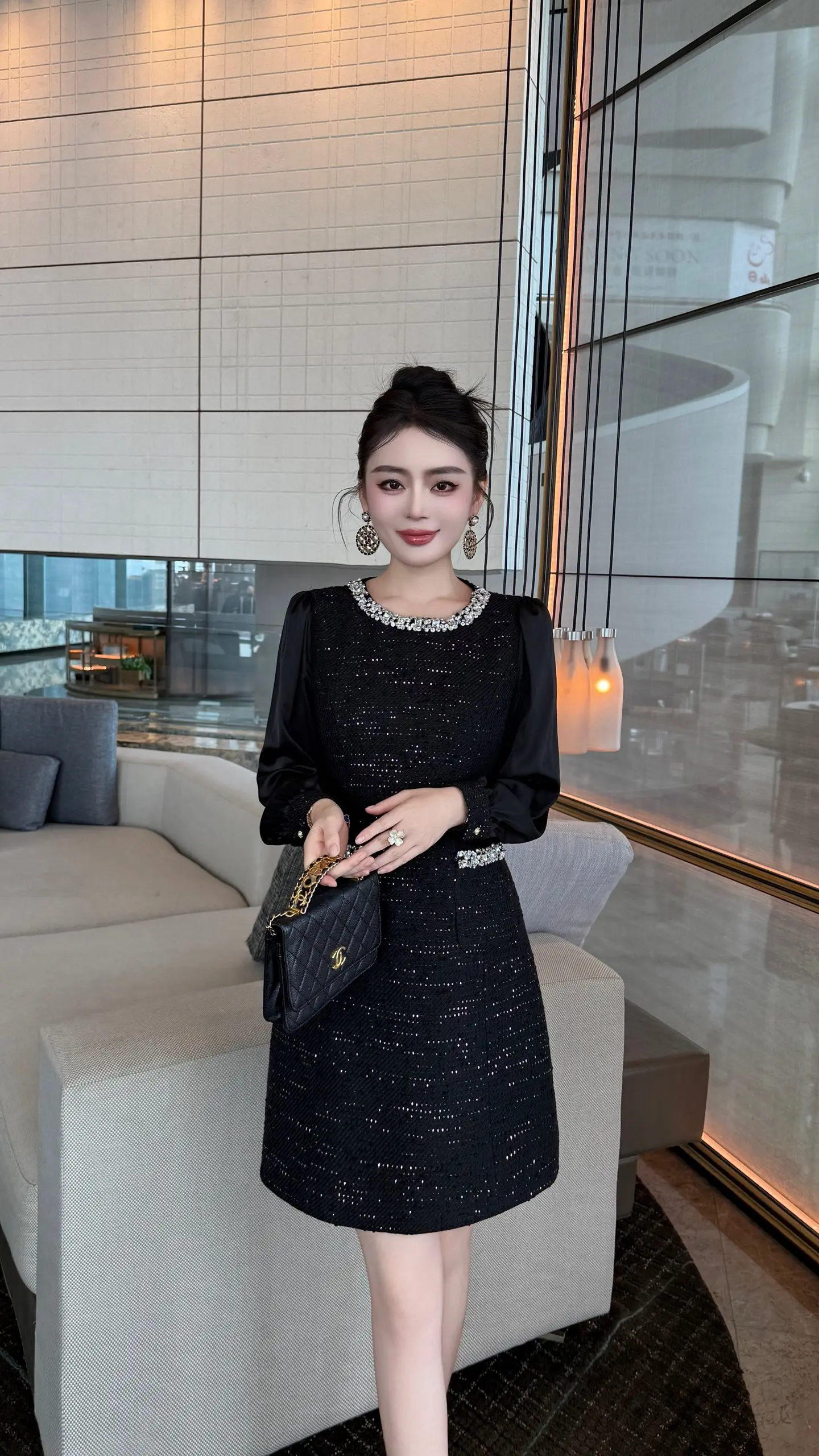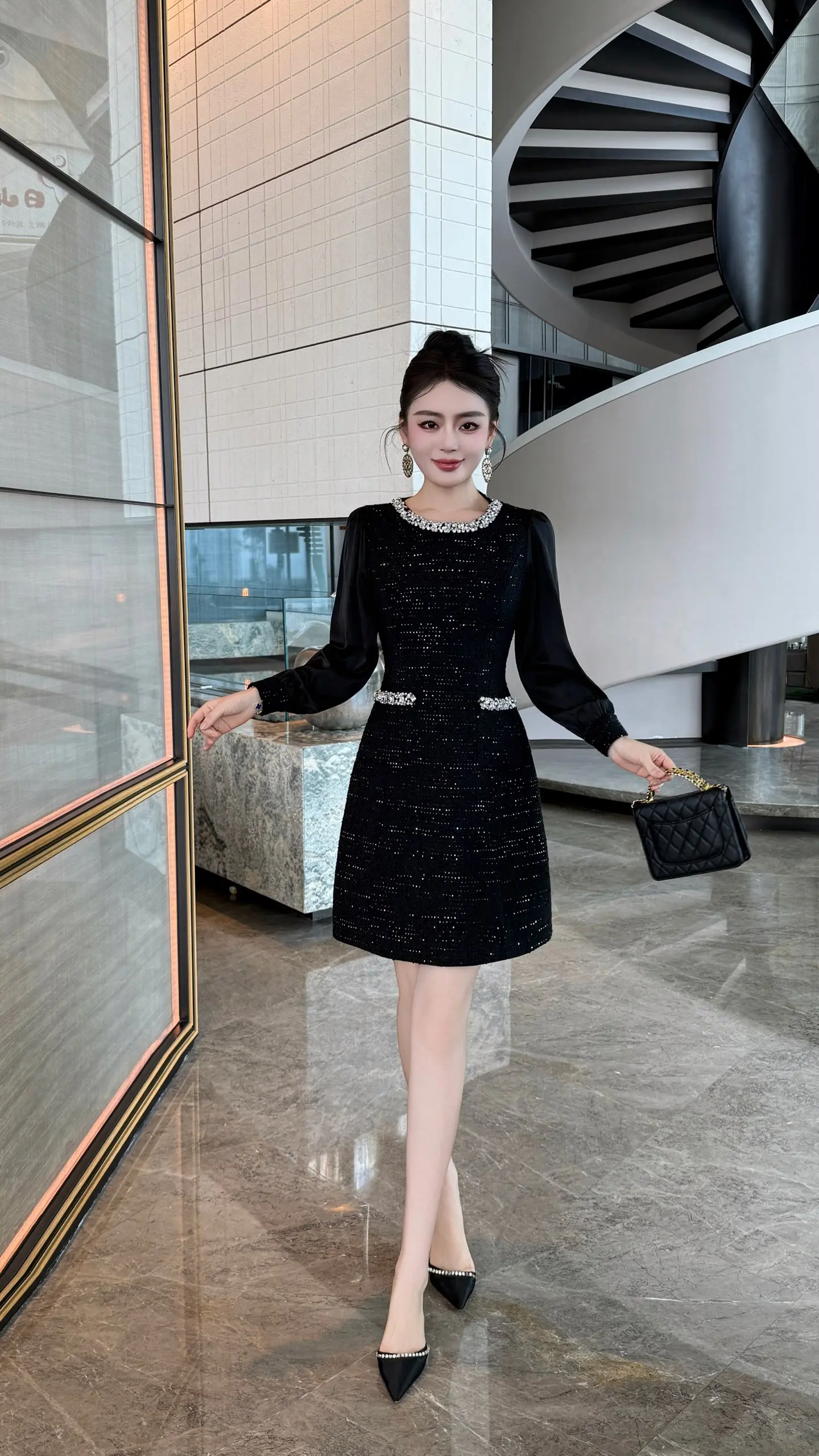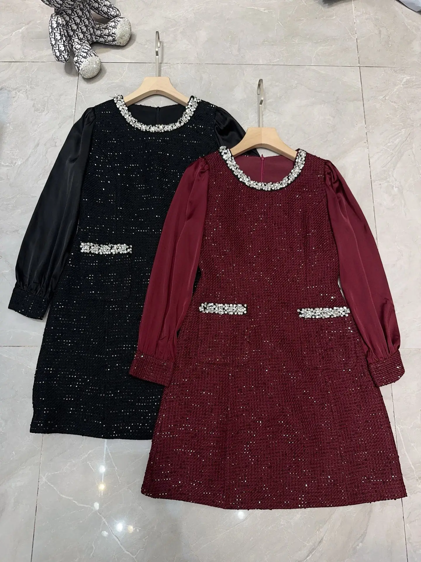 ZJYT Luxury Diamonds Tweed Dresses Women Autumn 2025 Fashion Long Sleeve Vintage Above Knee Casual Party Dress Female Clothes