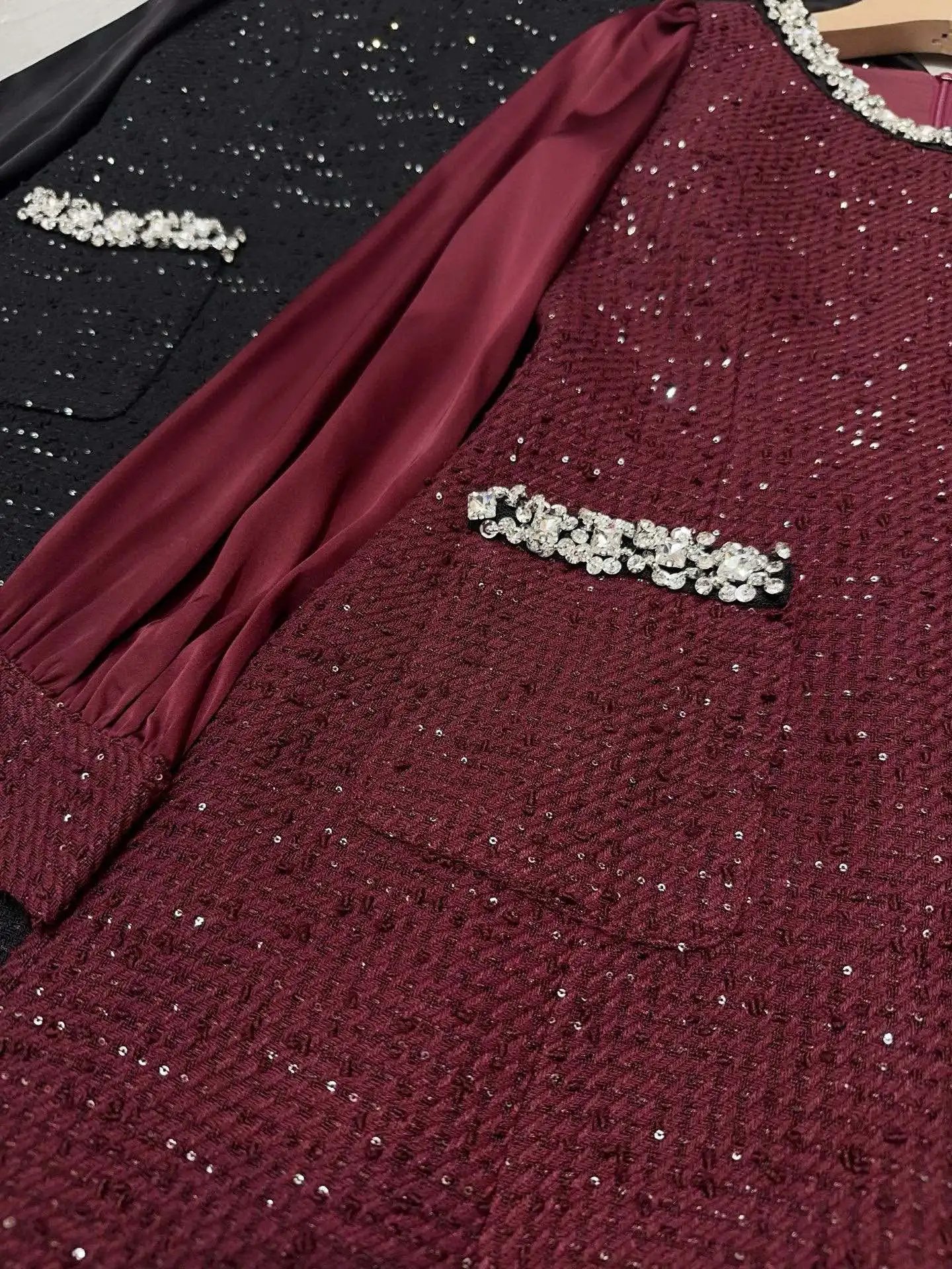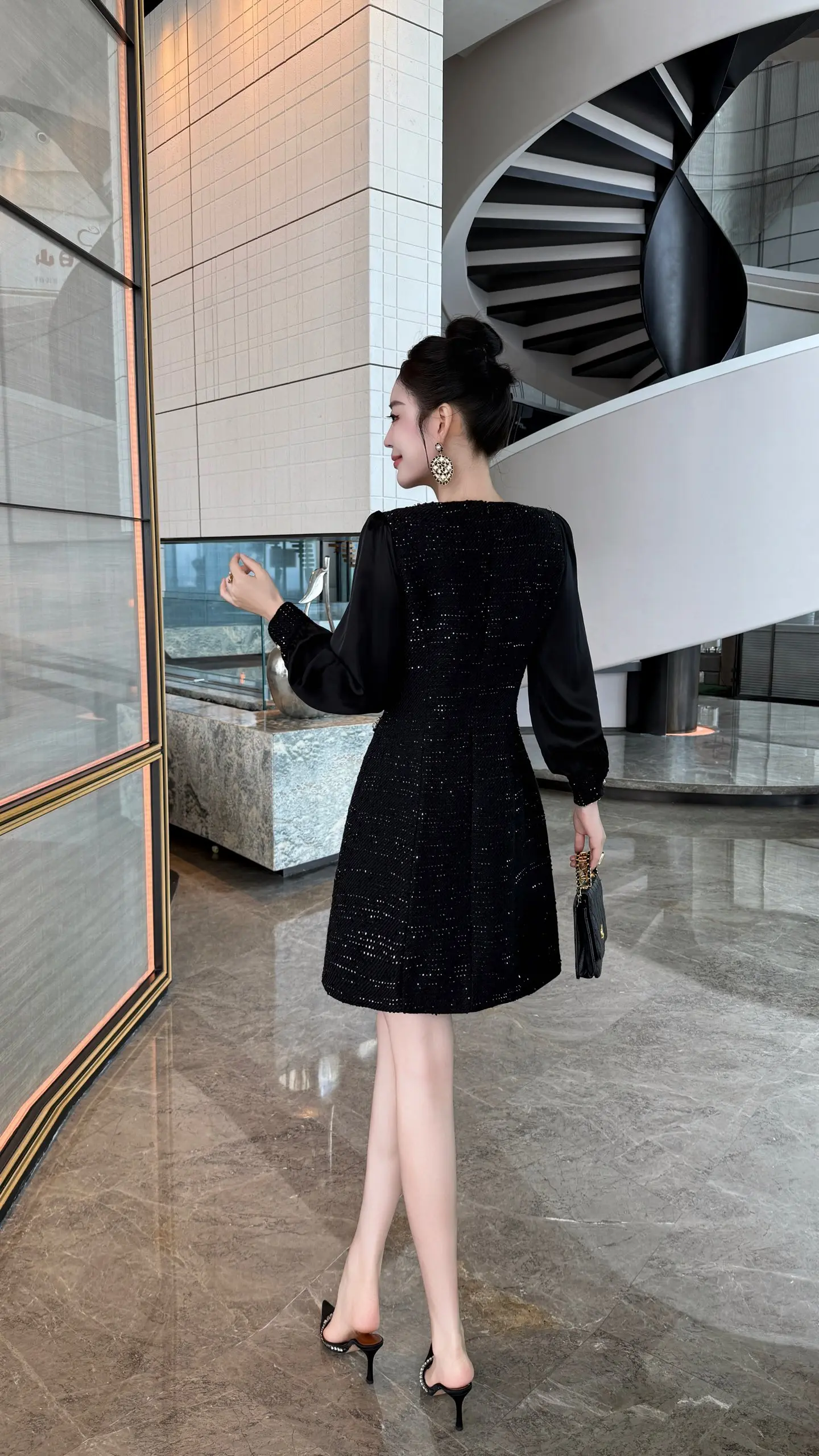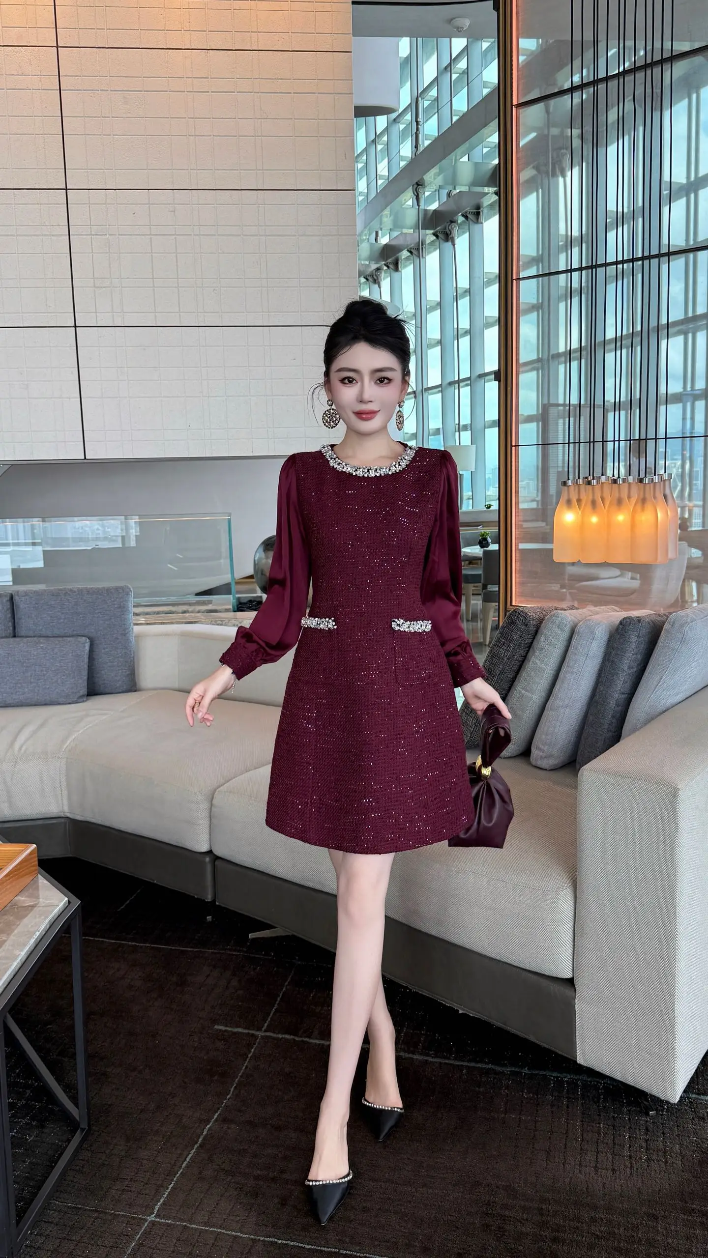 ZJYT Luxury Diamonds Tweed Dresses Women Autumn 2025 Fashion Long Sleeve Vintage Above Knee Casual Party Dress Female Clothes