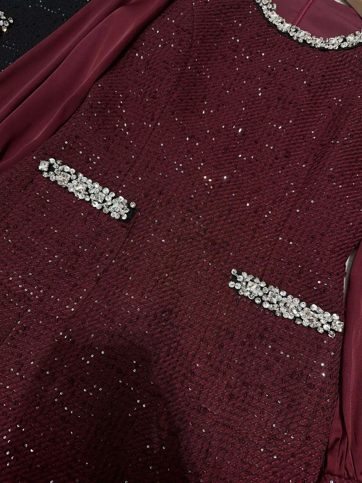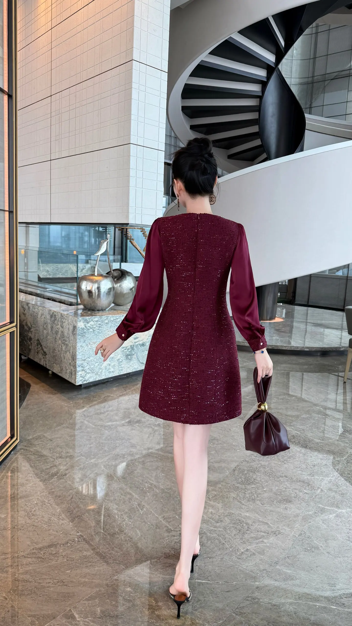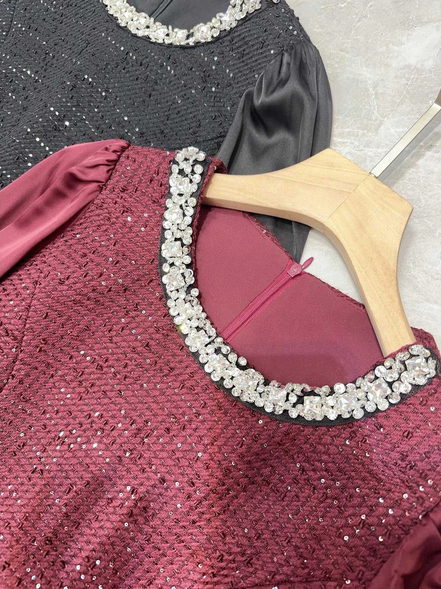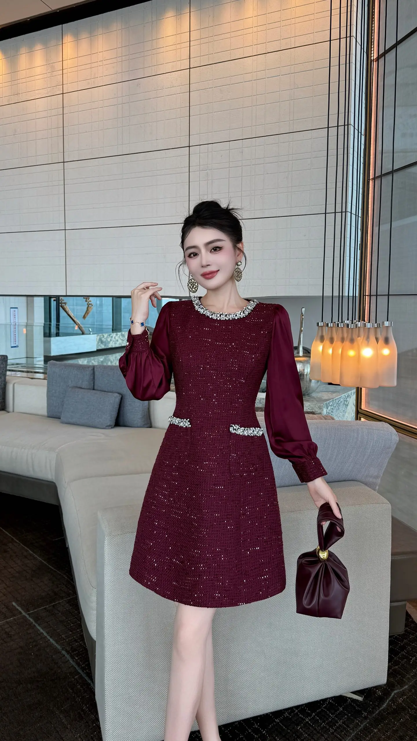 ZJYT Luxury Diamonds Tweed Dresses Women Autumn 2025 Fashion Long Sleeve Vintage Above Knee Casual Party Dress Female Clothes