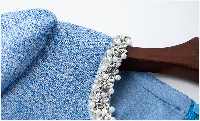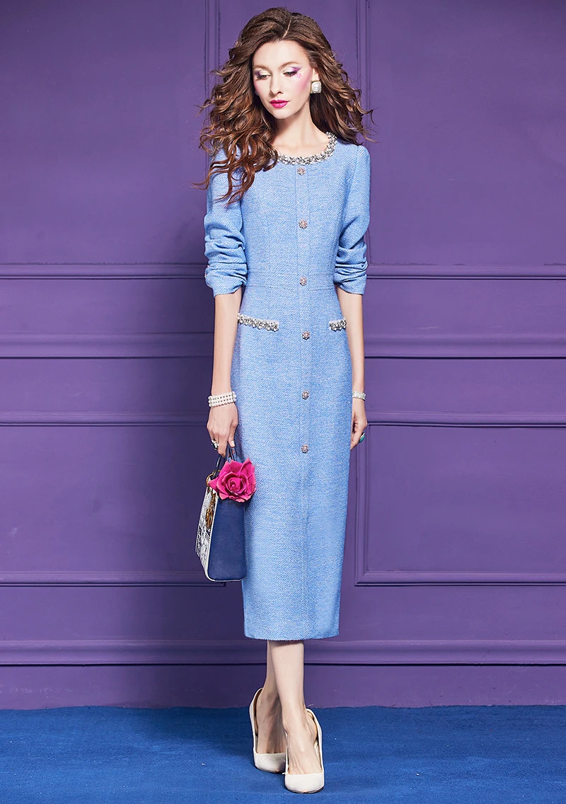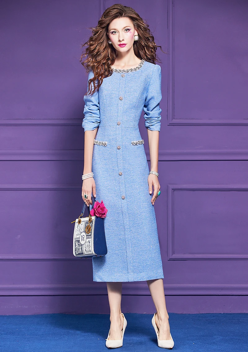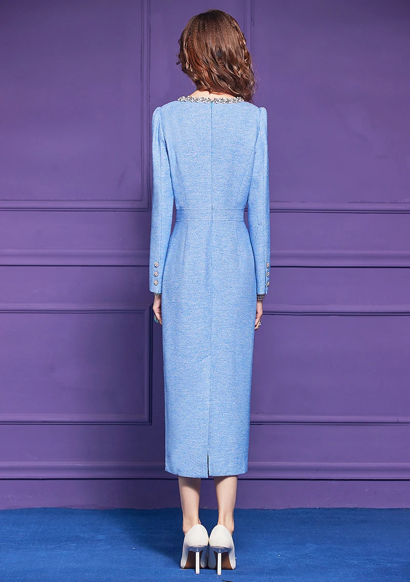ZJYT Luxury Elegant Beading Midi Tweed Woolen Dresses for Women 2025 New Autumn Winter Long Sleeve Party Office Lady Dress Blue
