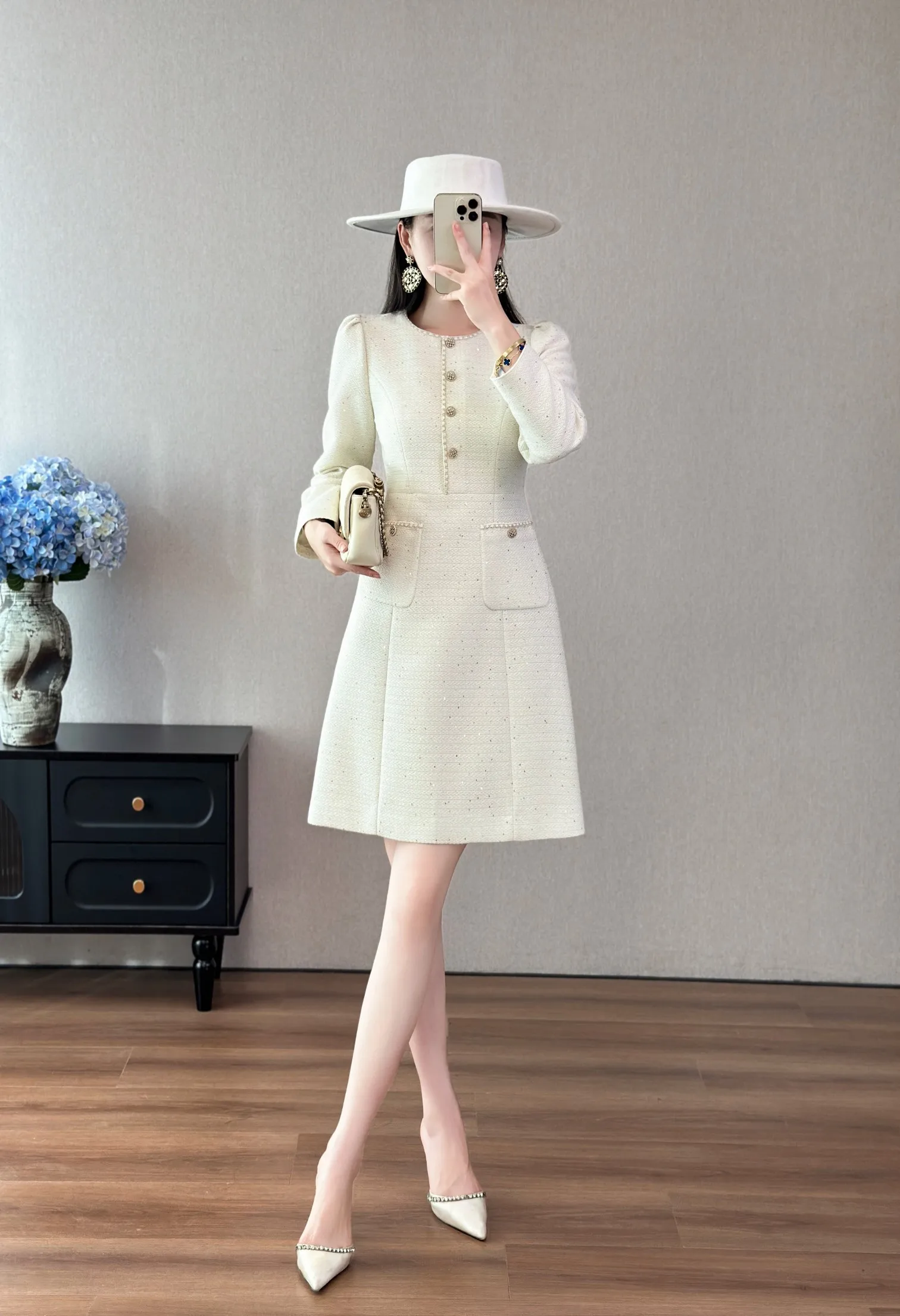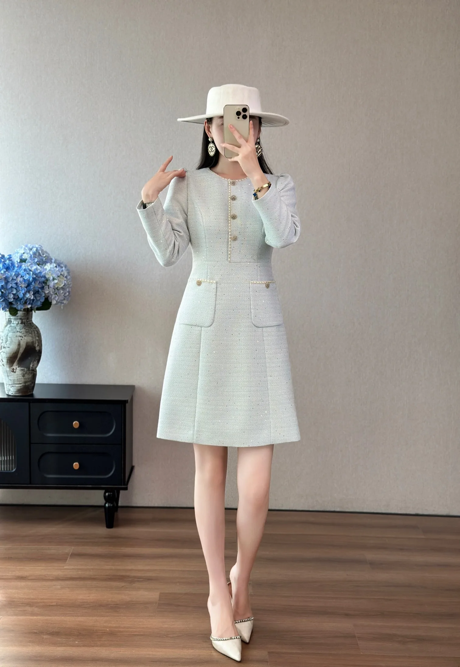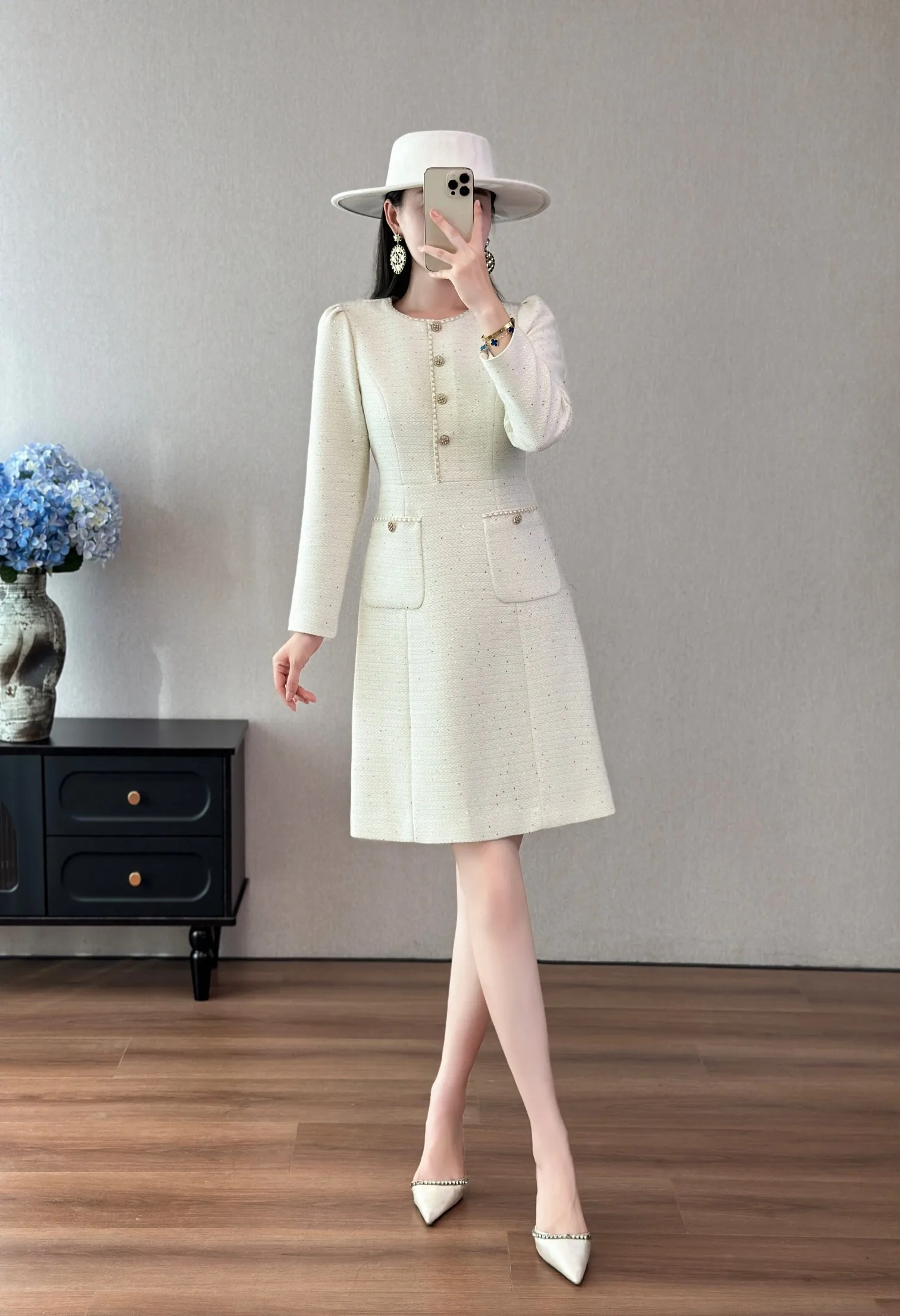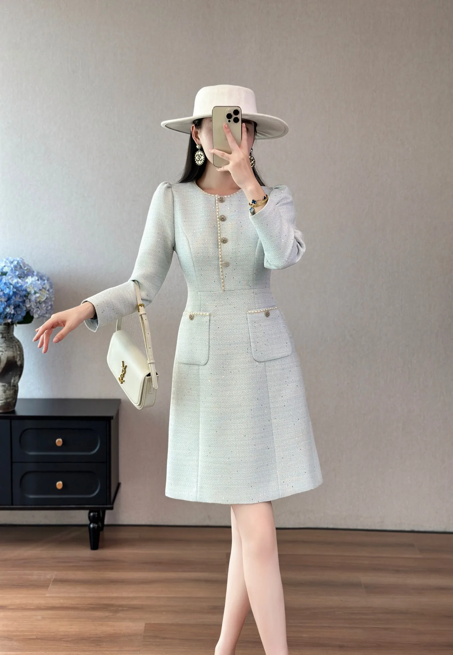 ZJYT New Autumn Women’s Long Sleeve Tweed Woolen Dress Elegant Fashion Sequined Buttons Simple Office Lady Dress Female Clothes