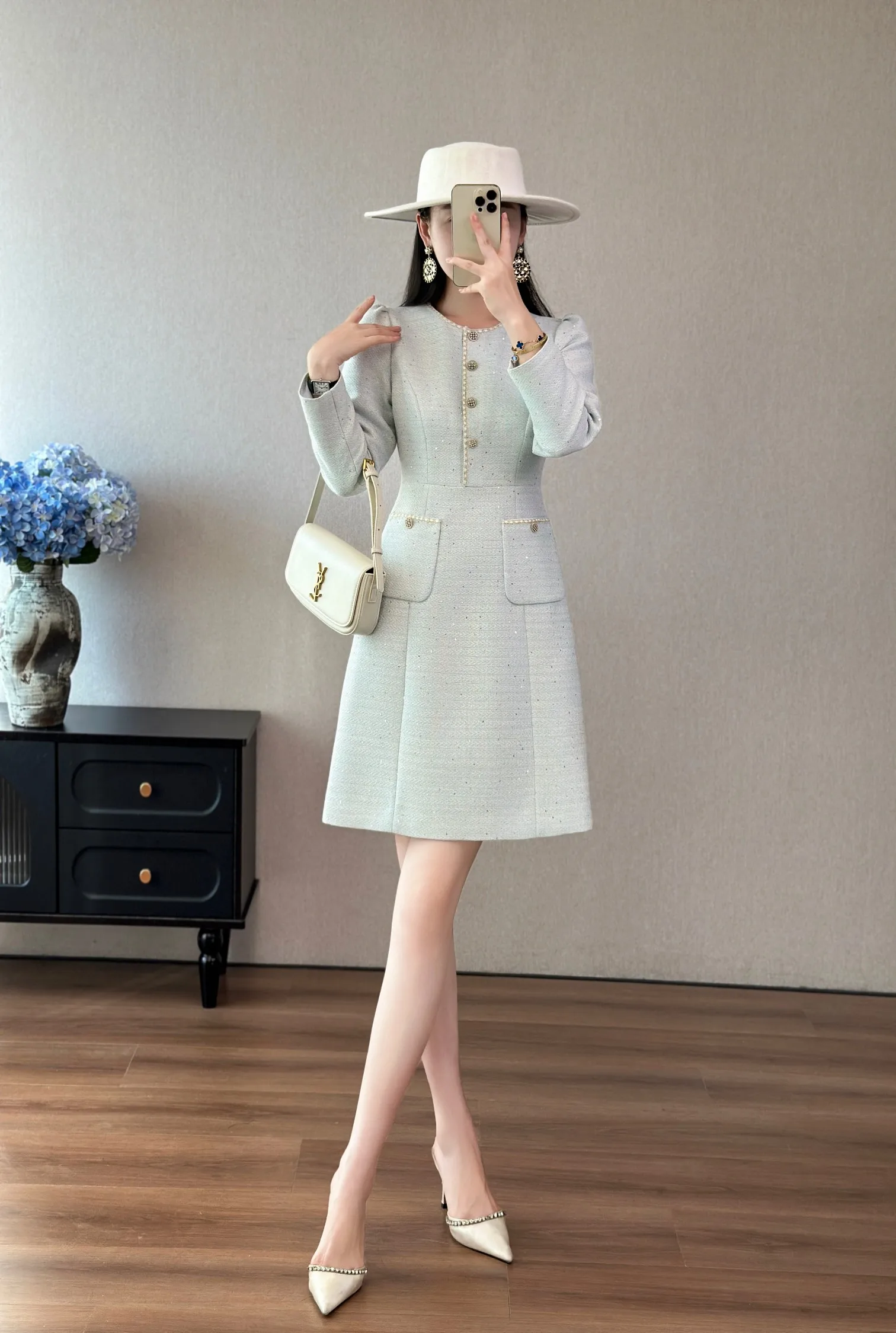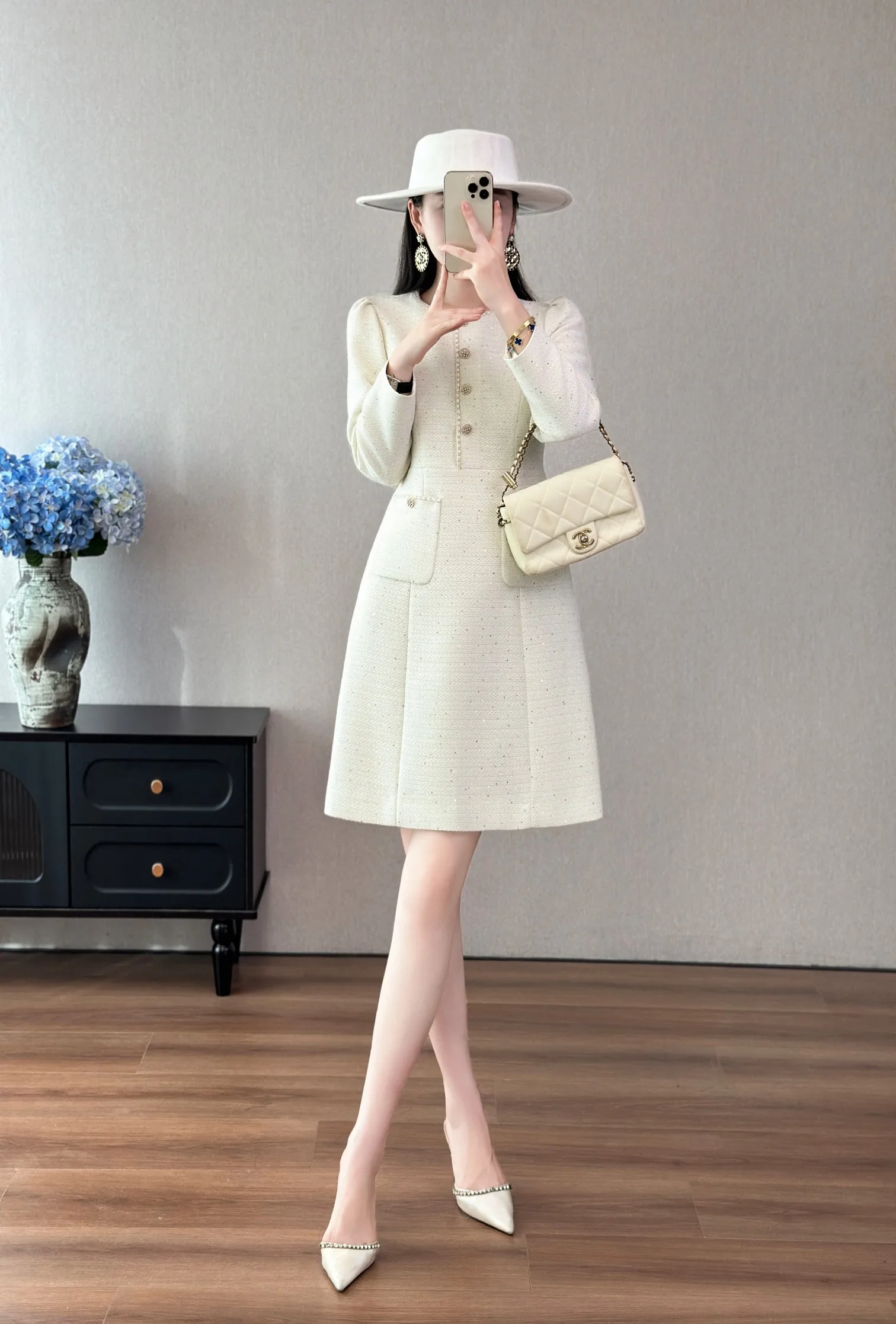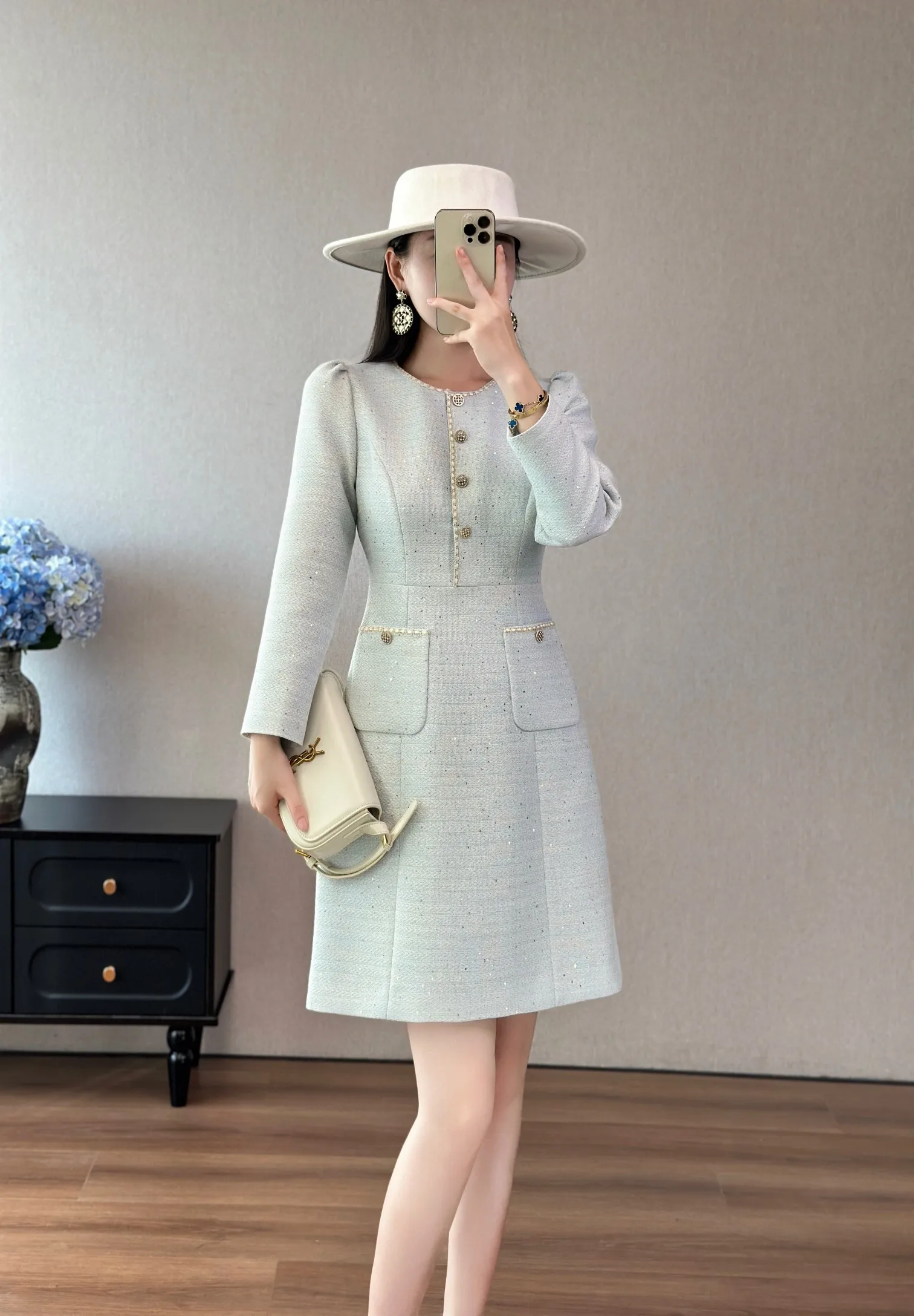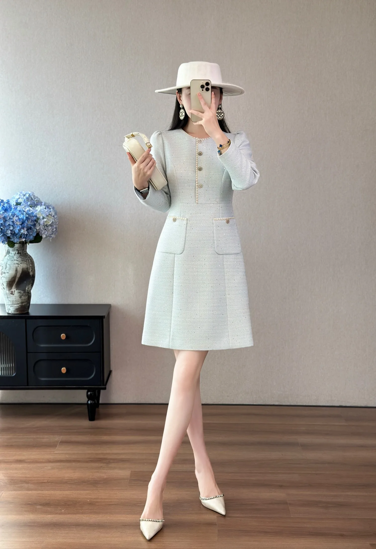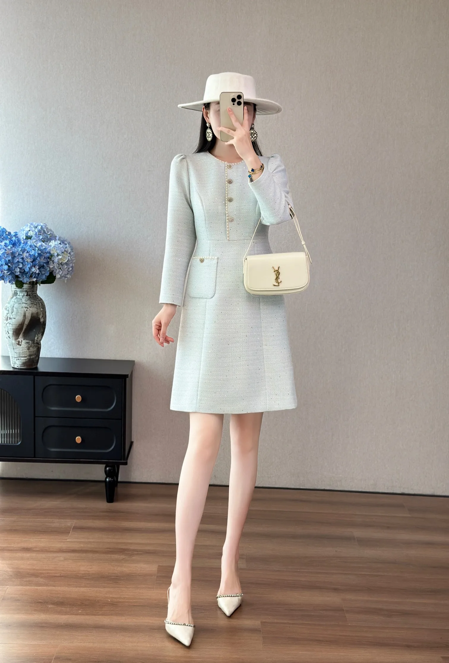 ZJYT New Autumn Women’s Long Sleeve Tweed Woolen Dress Elegant Fashion Sequined Buttons Simple Office Lady Dress Female Clothes