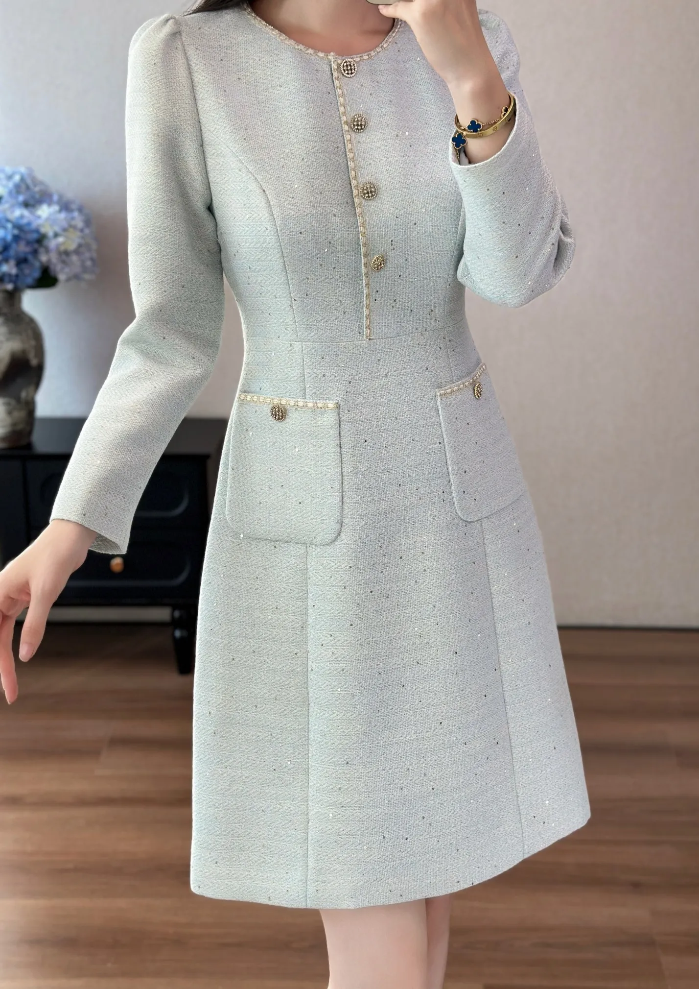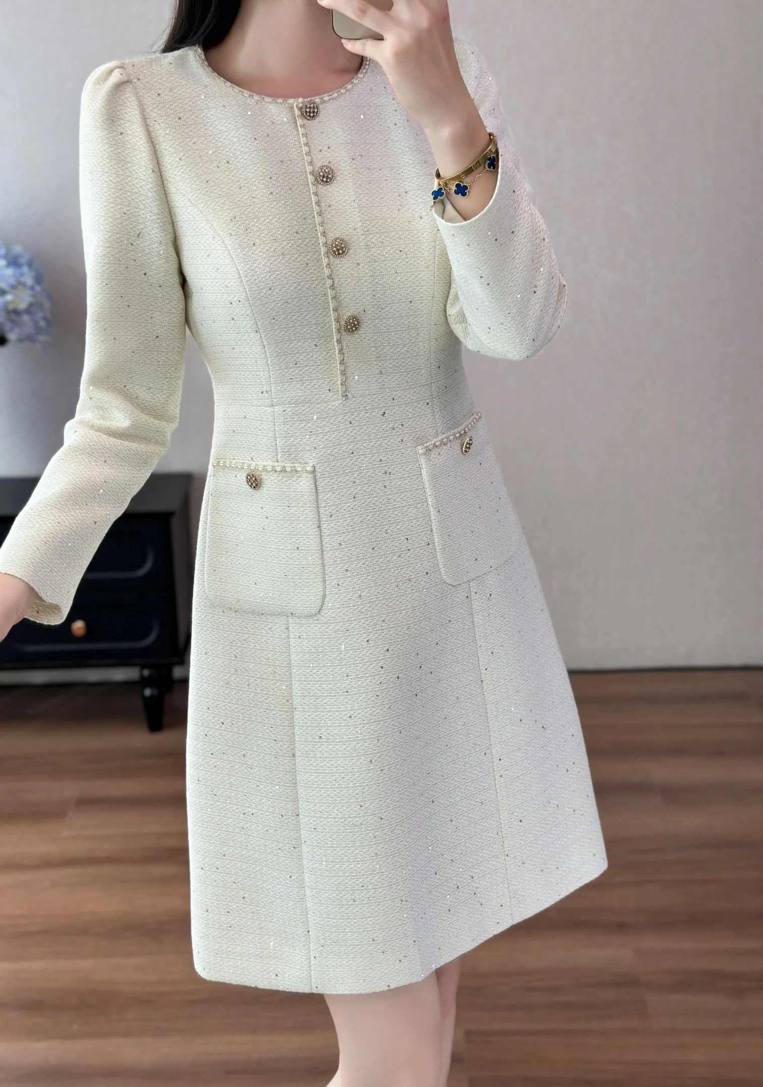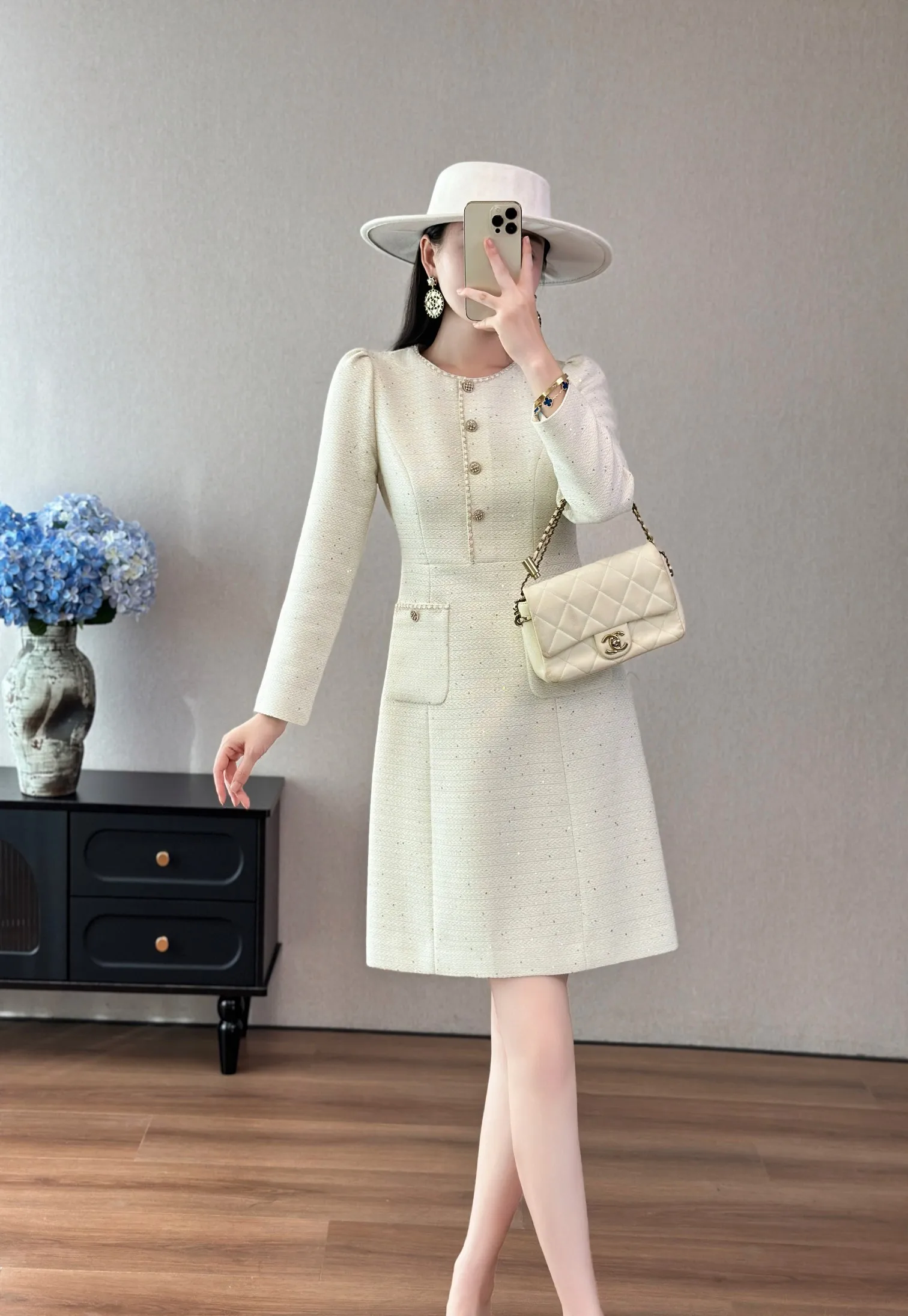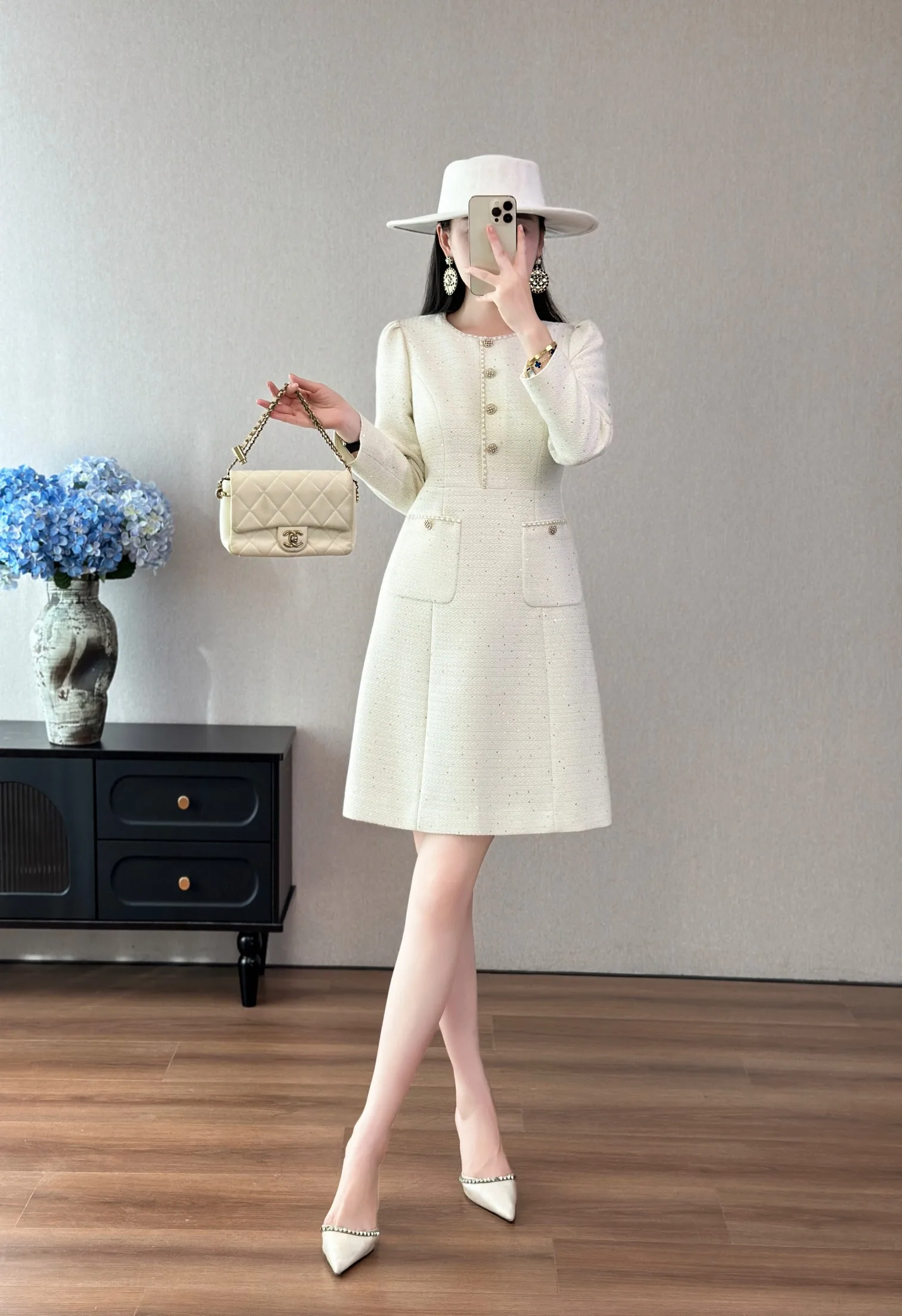 ZJYT New Autumn Women’s Long Sleeve Tweed Woolen Dress Elegant Fashion Sequined Buttons Simple Office Lady Dress Female Clothes