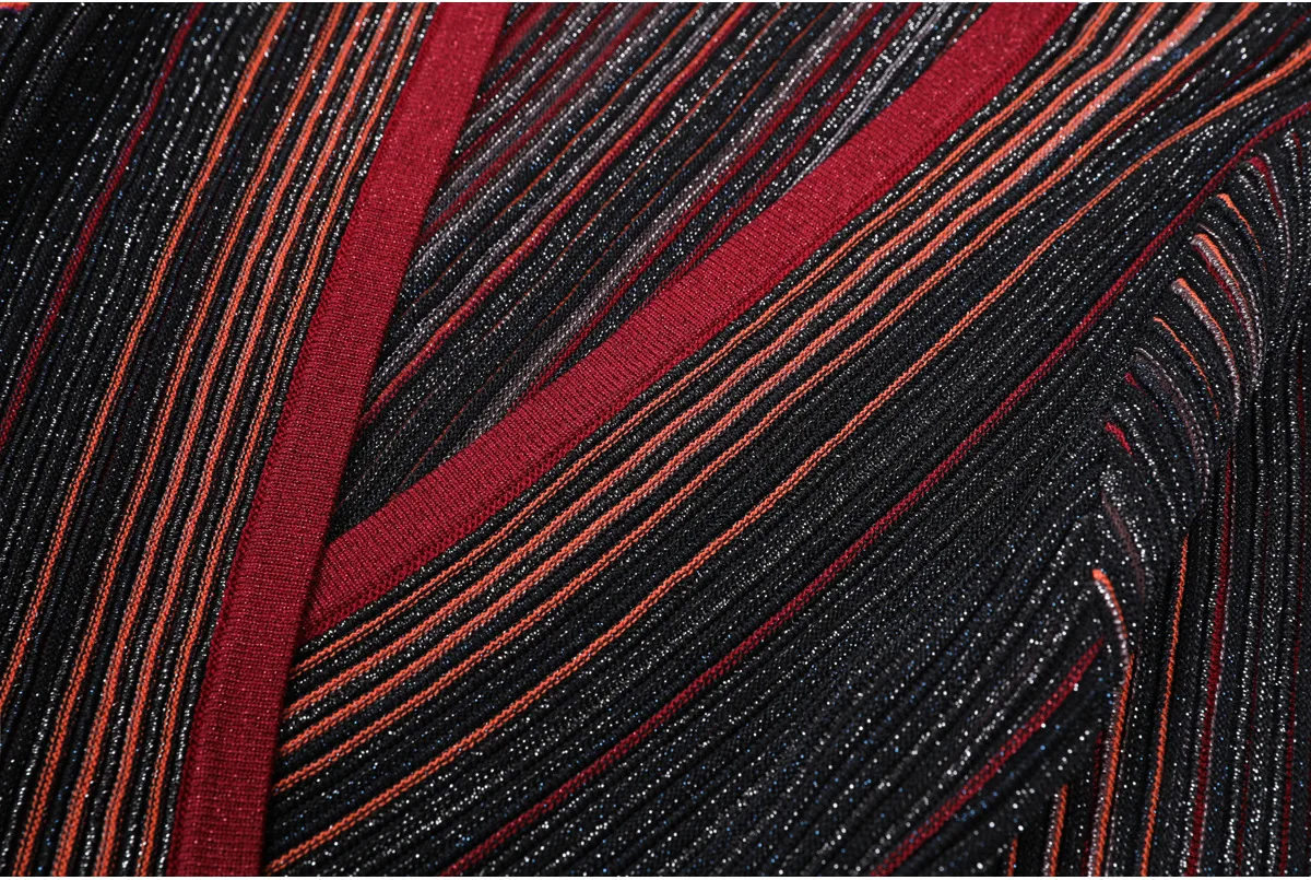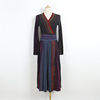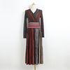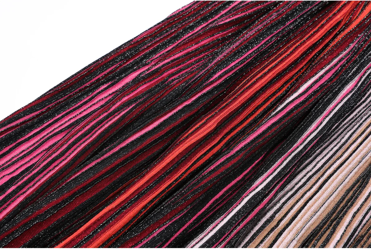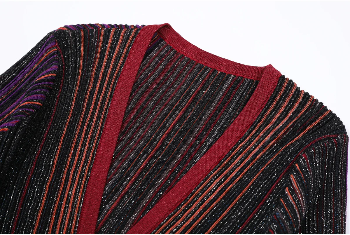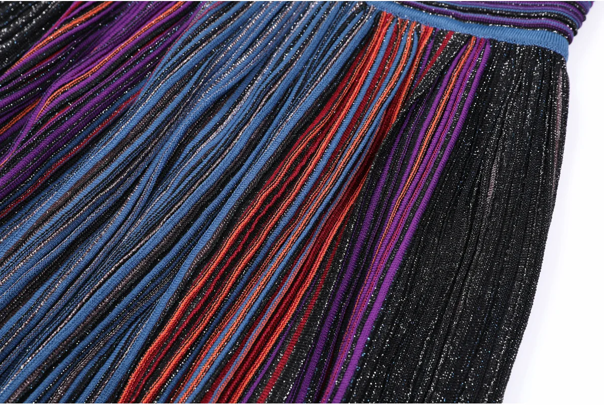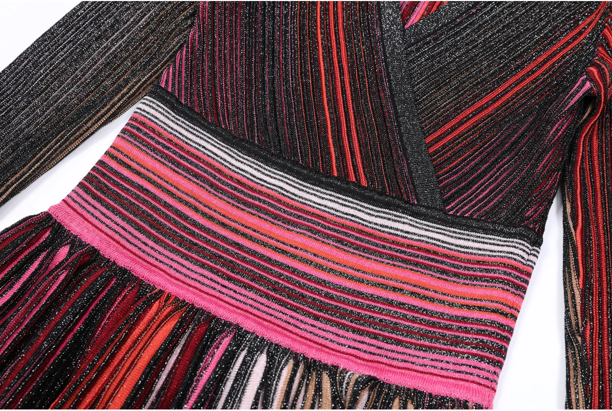 ZJYT New Elegant Women’s Rainbow Striped Knitting Dresses Sweaters Autumn Winter Long Sleeve V Neck Pleated Vintage Midi Dress