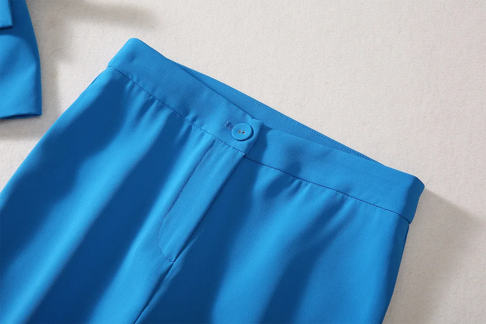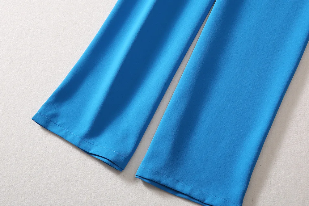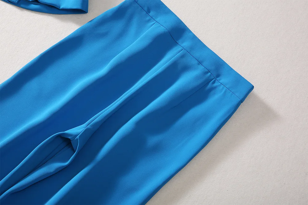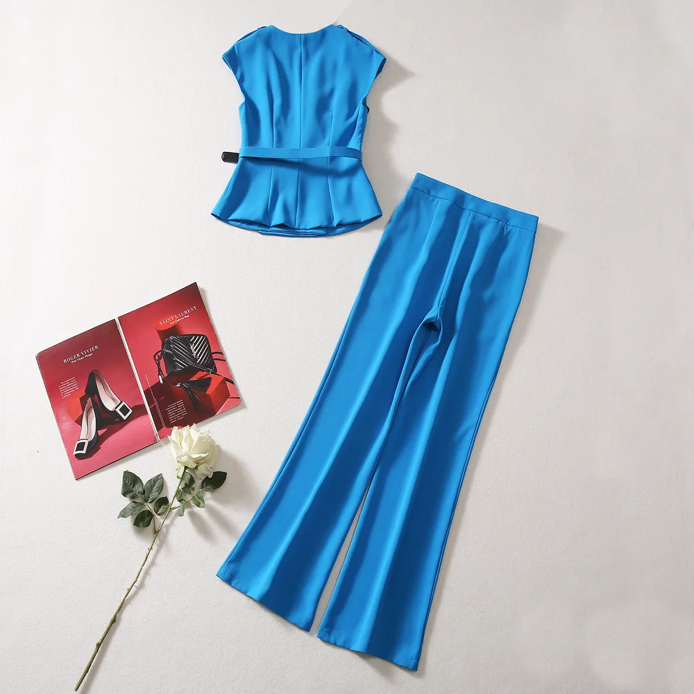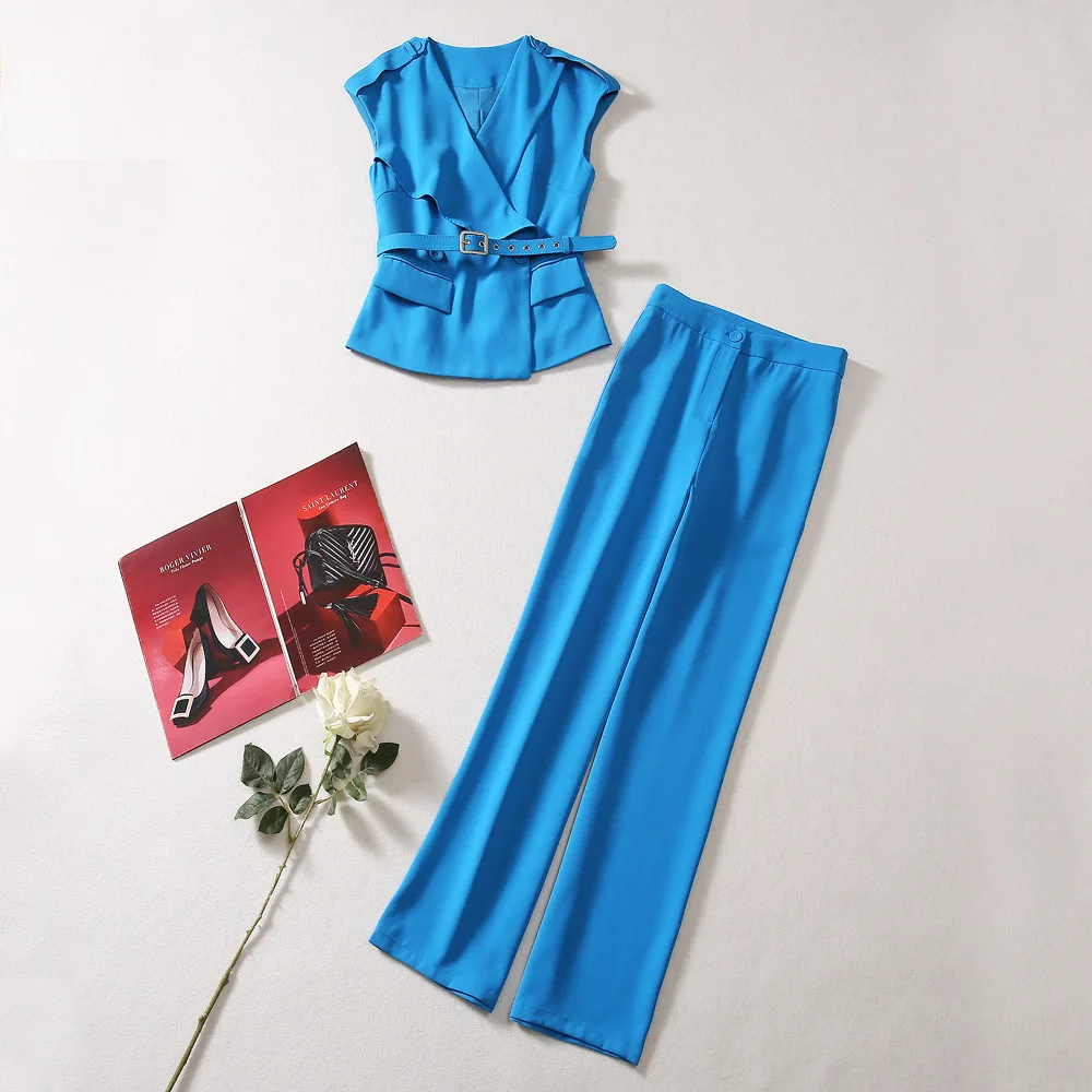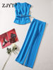 ZJYT Runway 2025 Fashion Summer V Neck Top Pant Sets Two Pieces Womens Outfit Elegant Conjuntos Femininos Trousers Suit Blue