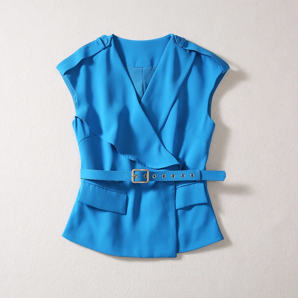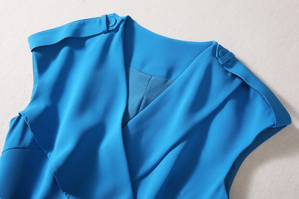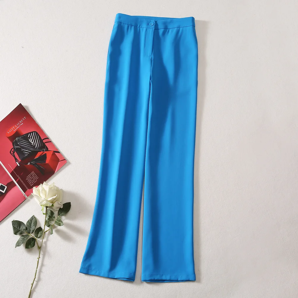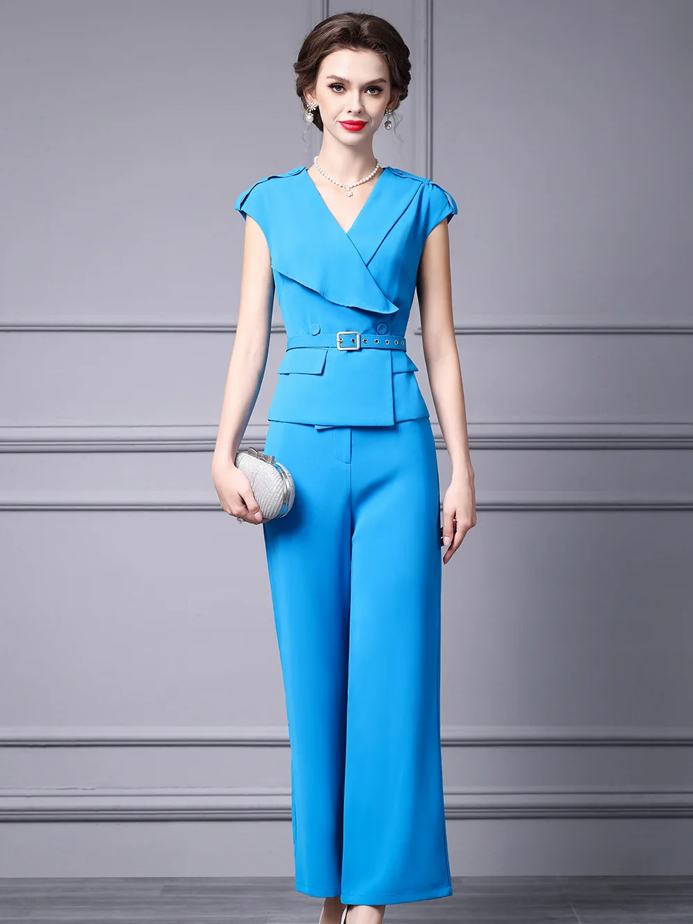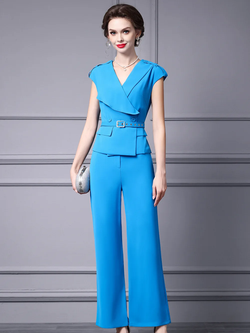 ZJYT Runway 2025 Fashion Summer V Neck Top Pant Sets Two Pieces Womens Outfit Elegant Conjuntos Femininos Trousers Suit Blue