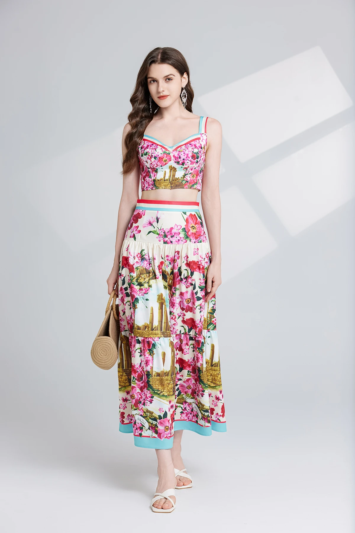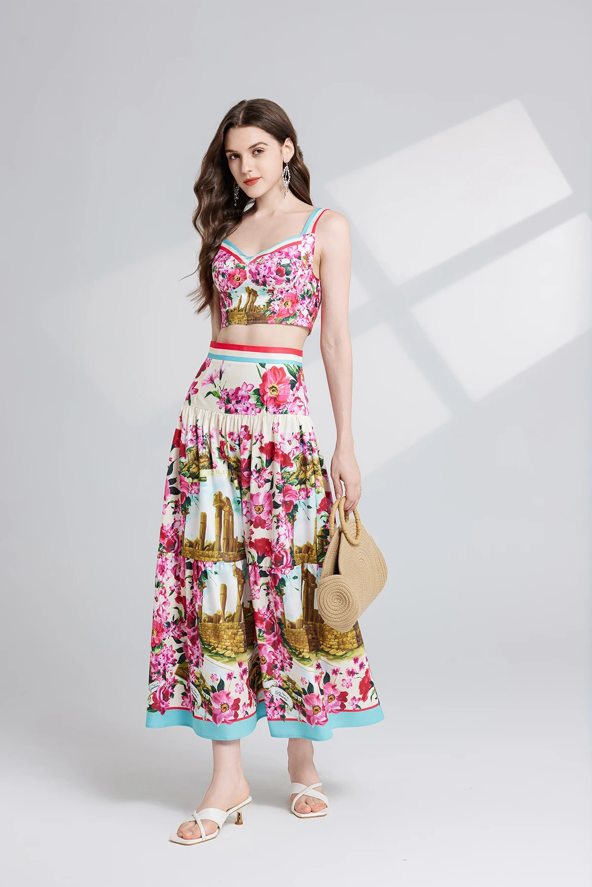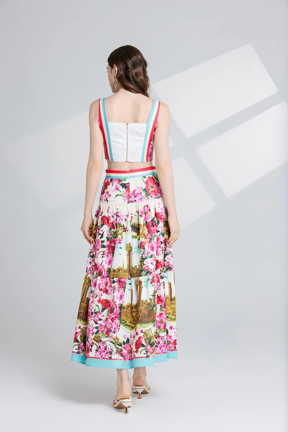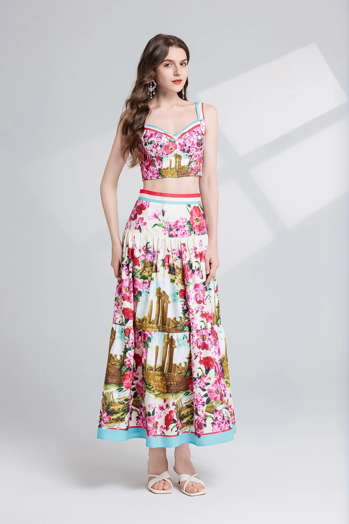 ZJYT Runway 2025 Summer Floral Print Sleeveless Top and Skirt Sets Two Pieces Womens Outfit Fashion Holiday Beach Suit Female